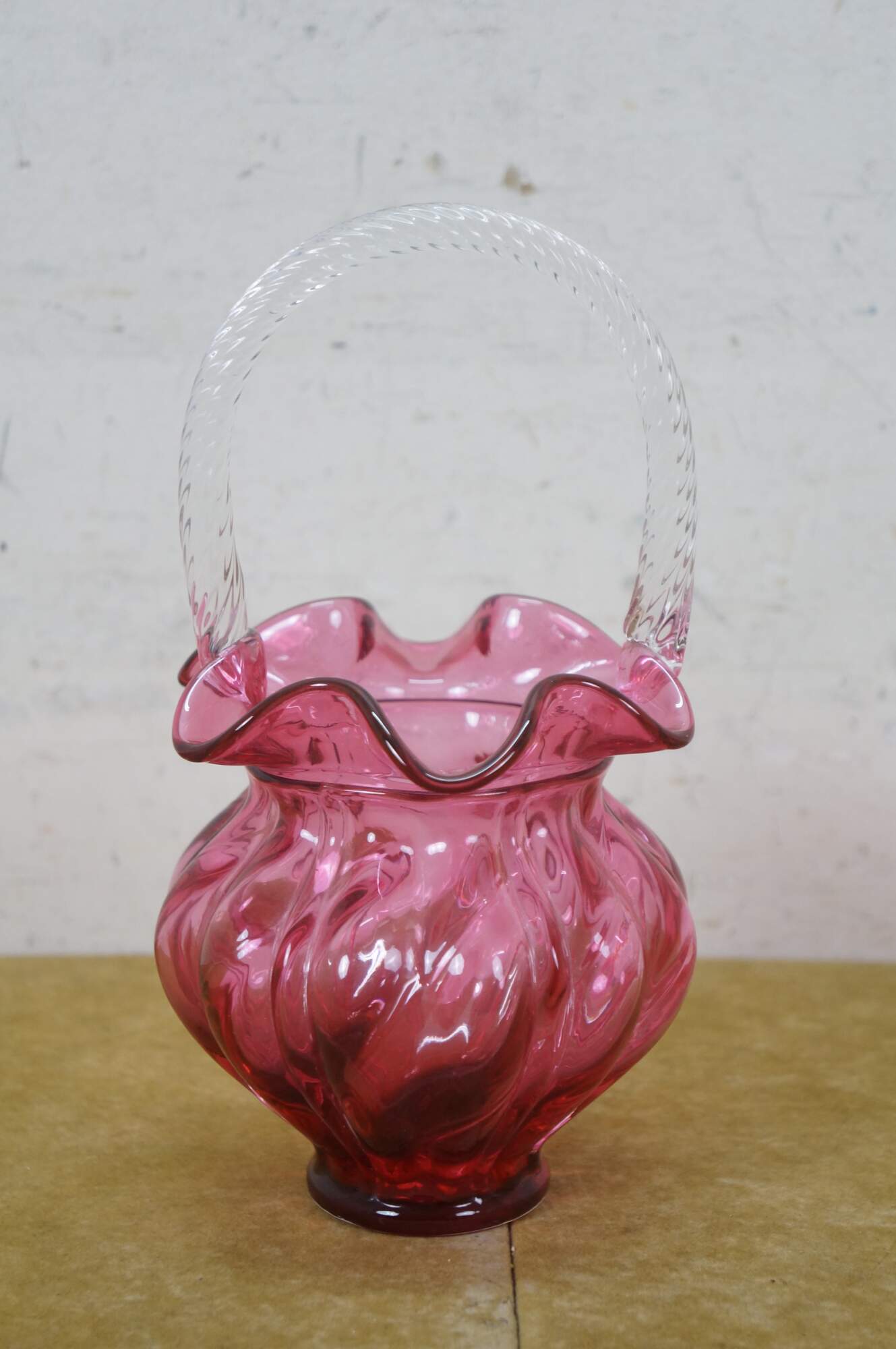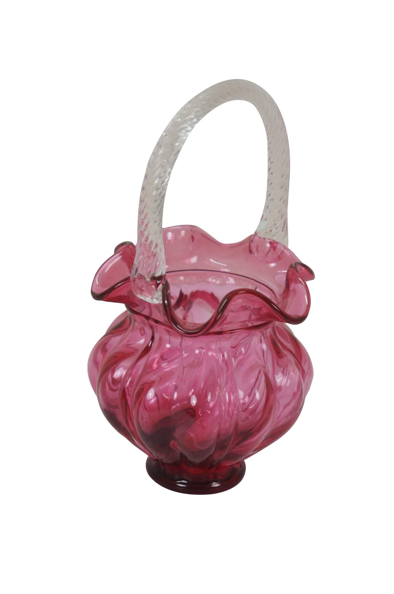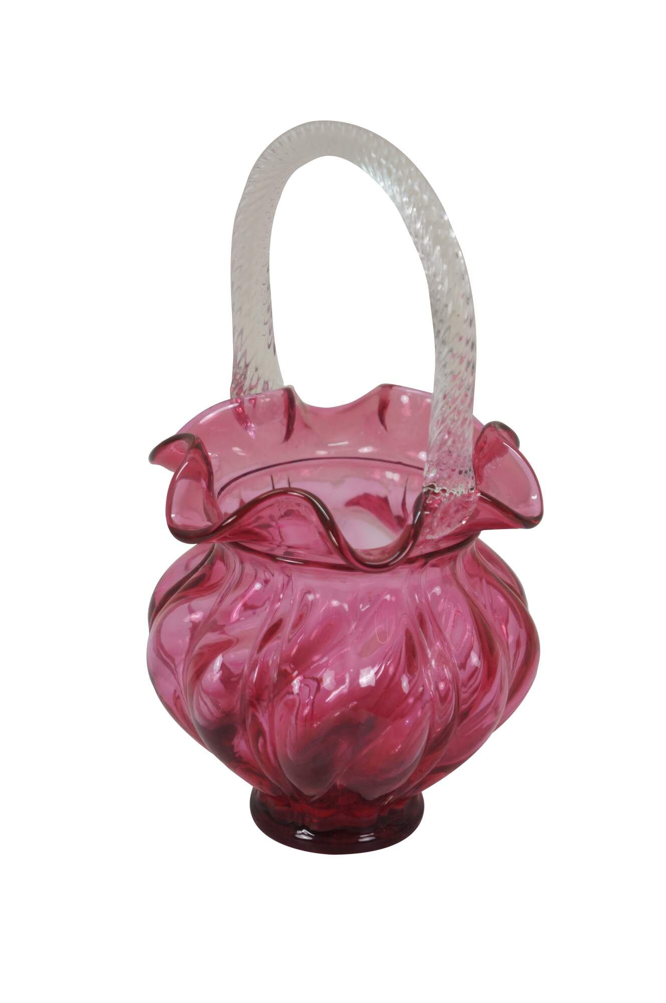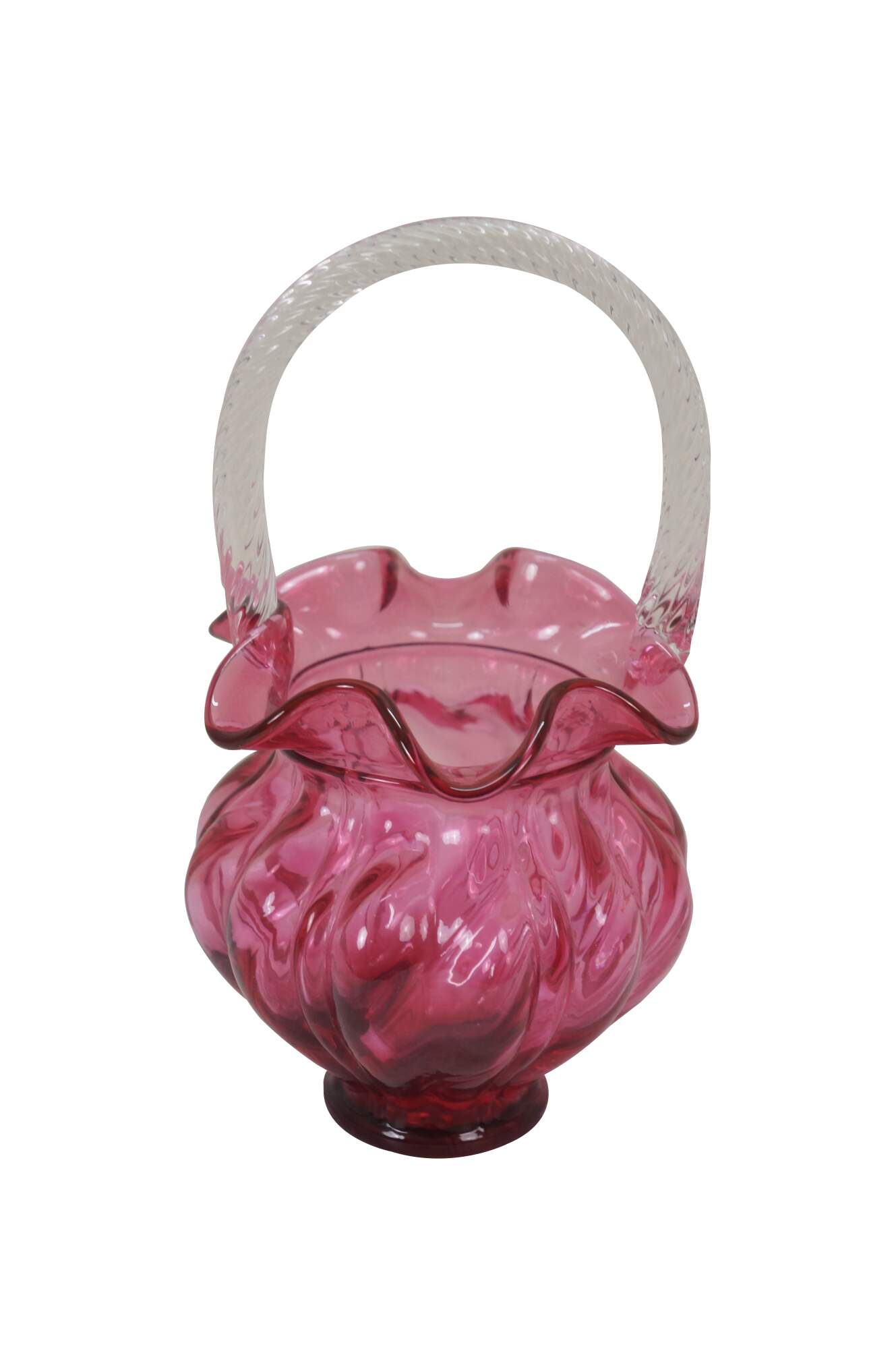 Vintage Fenton cranberry pink art glass Brides basket / vase / candy compote with clear swirled handle and ruffled bowl.