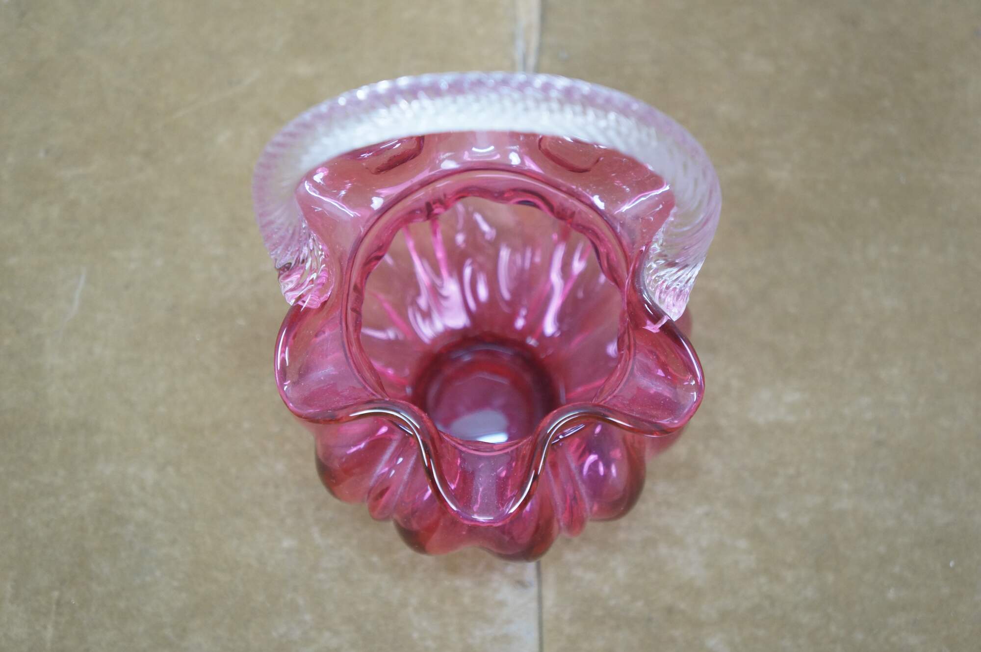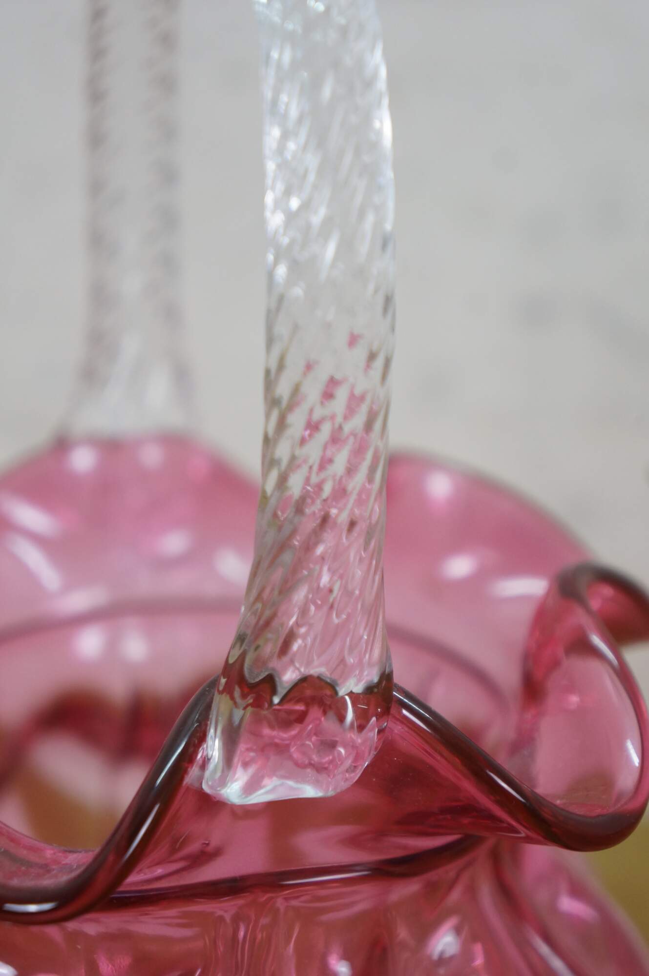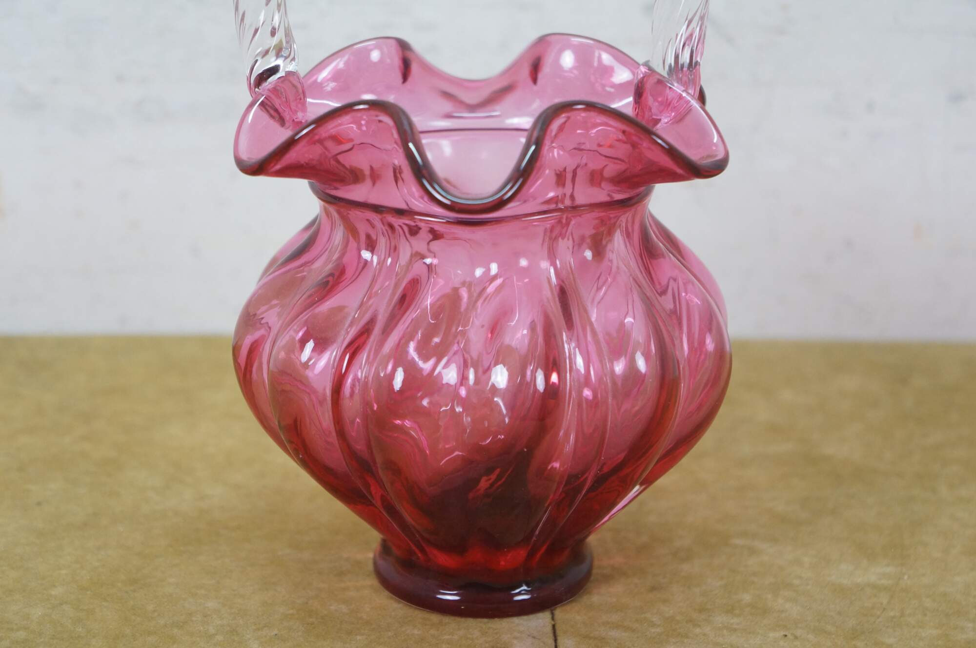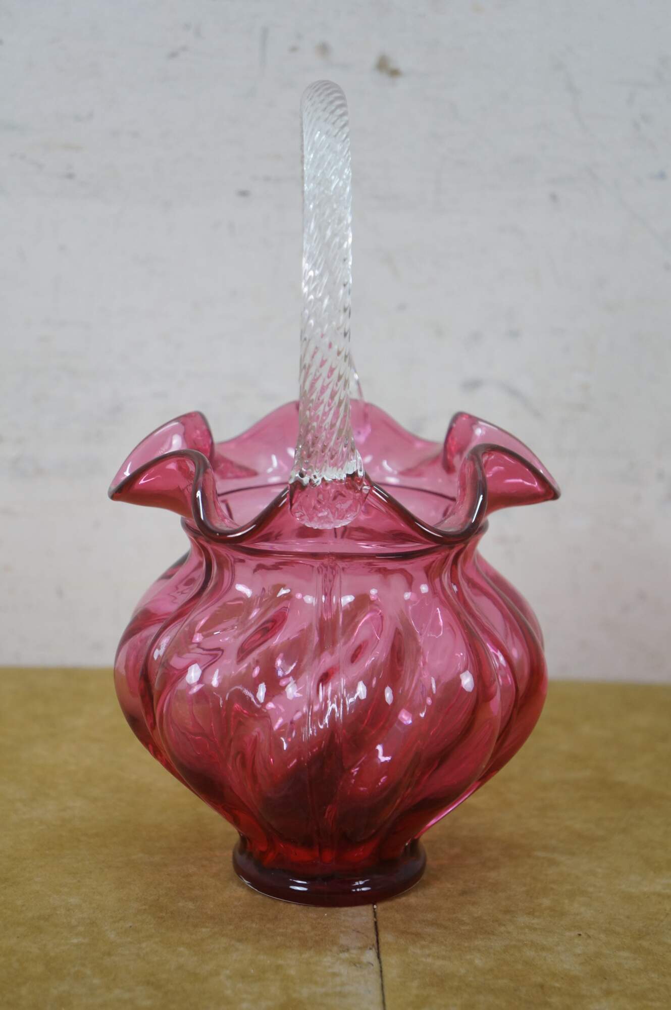 Vintage Fenton cranberry pink art glass Brides basket / vase / candy compote with clear swirled handle and ruffled bowl.