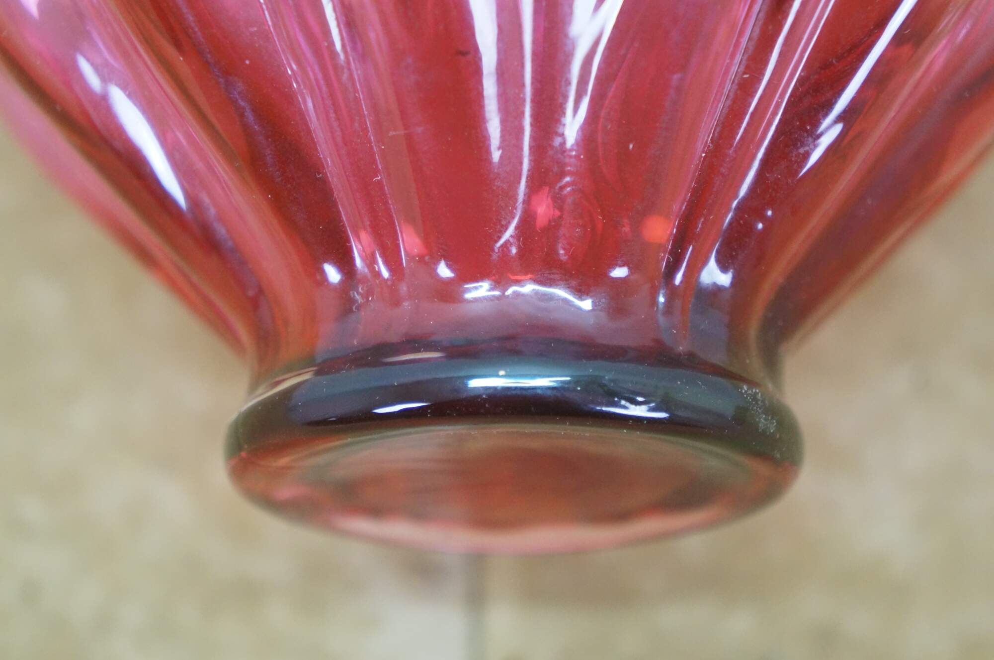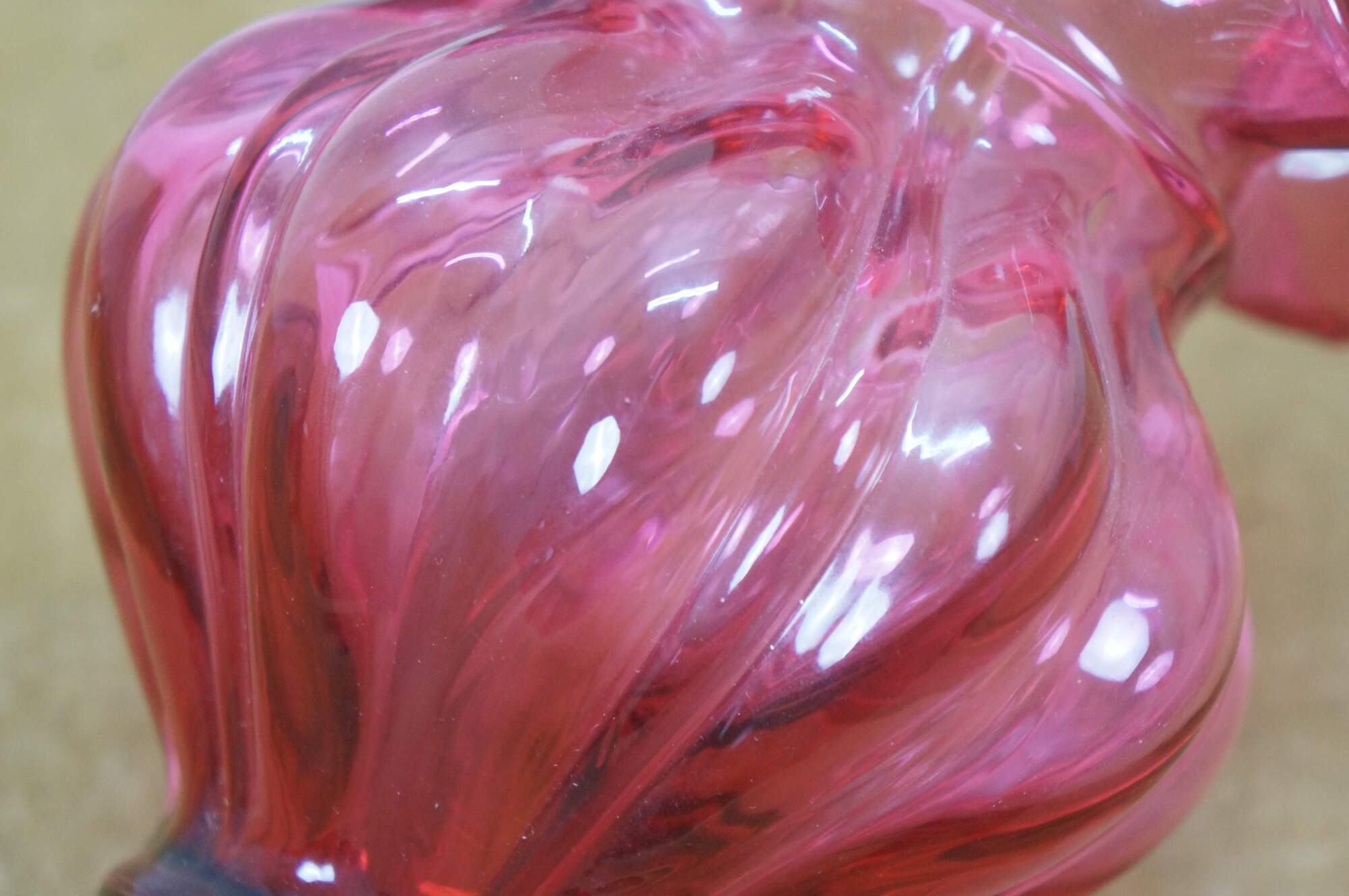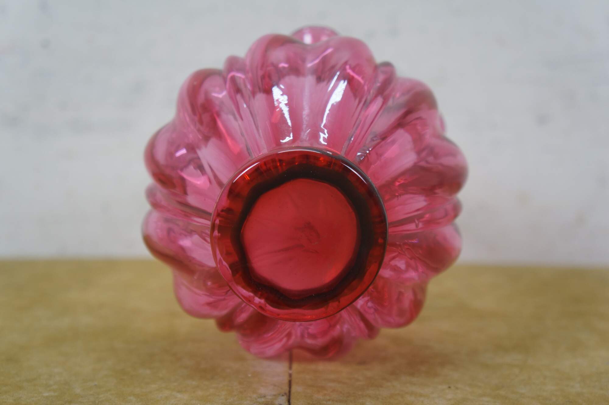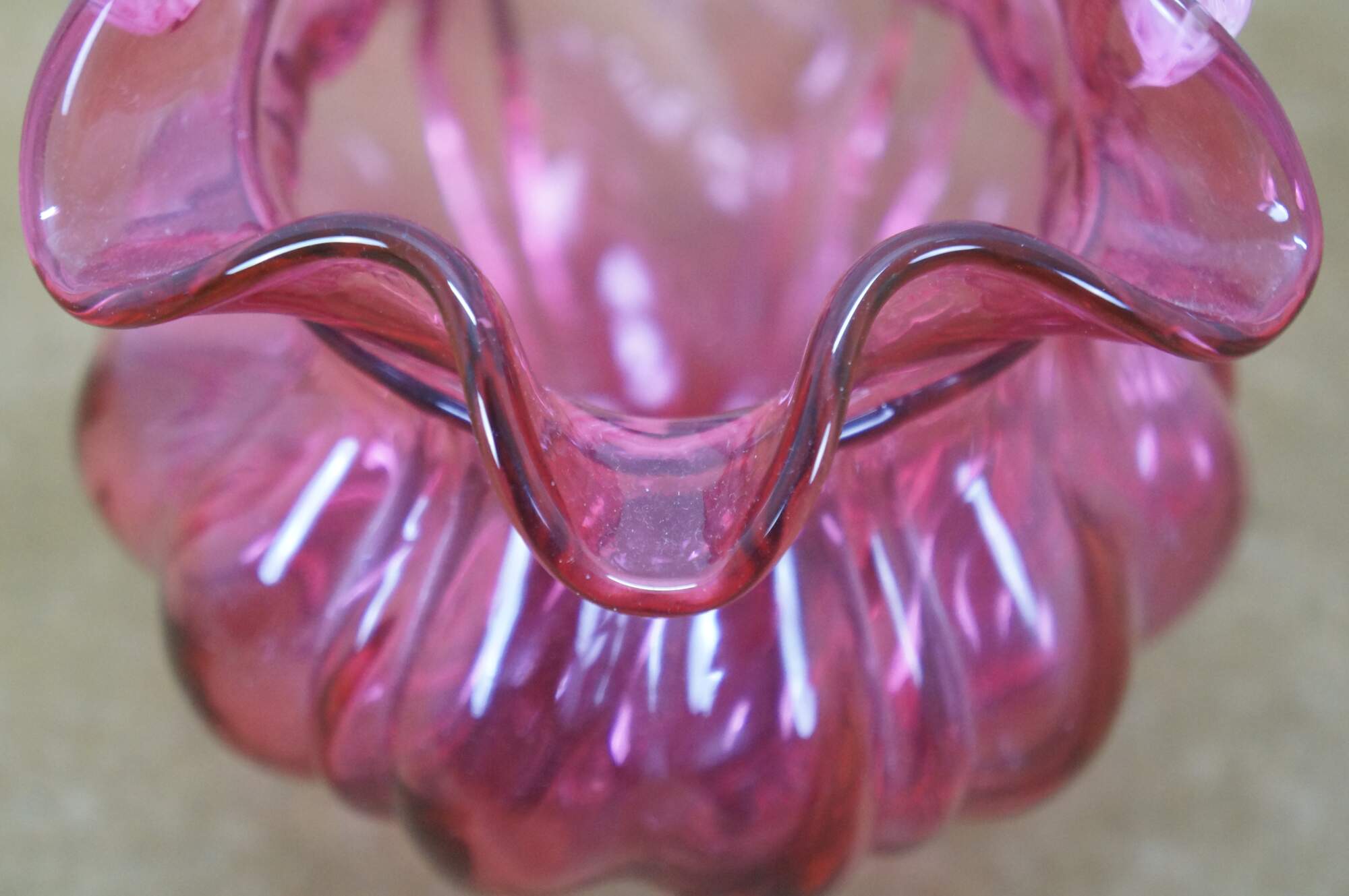Vintage Fenton cranberry pink art glass Brides basket / vase / candy compote with clear swirled handle and ruffled bowl.