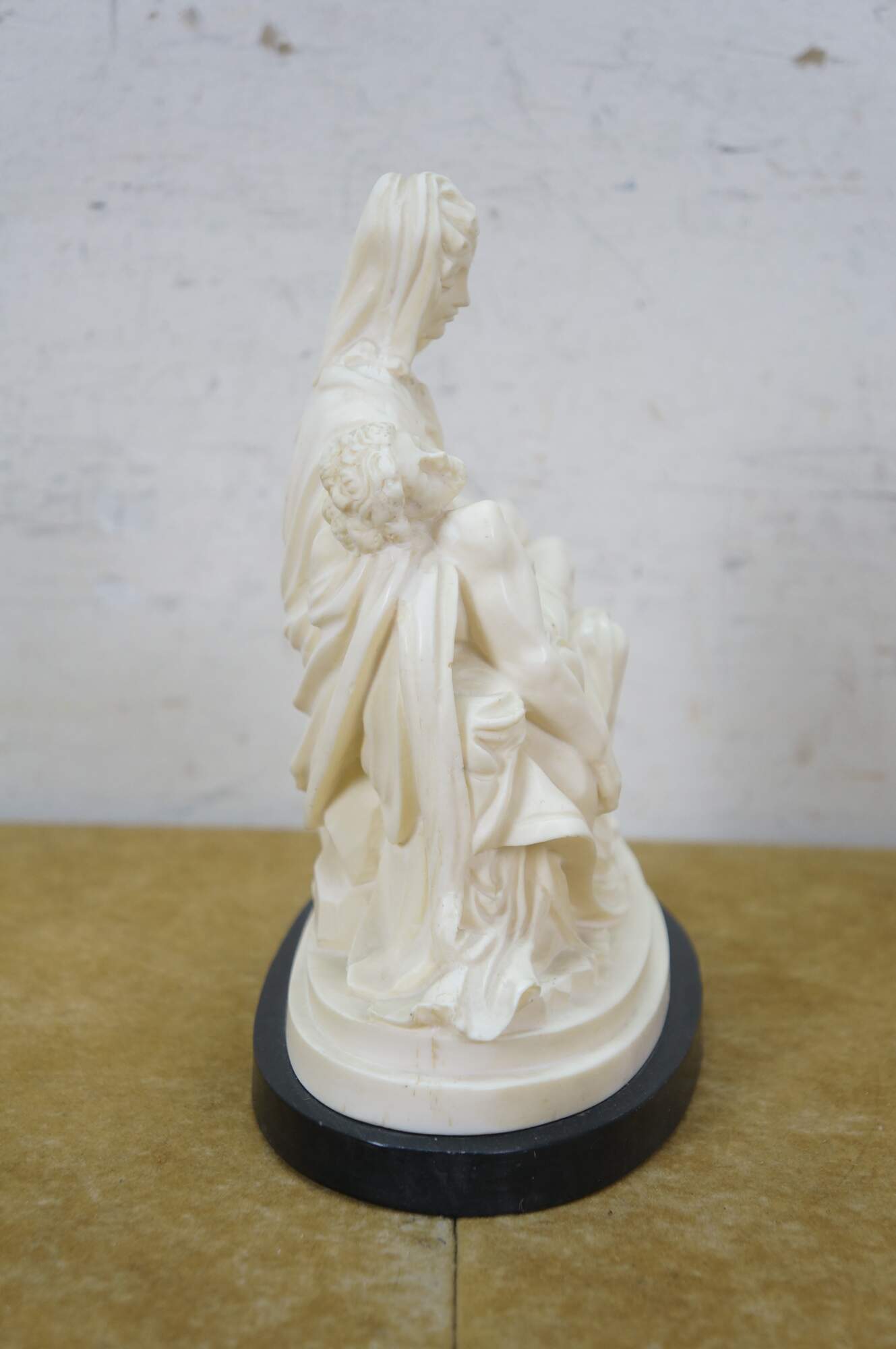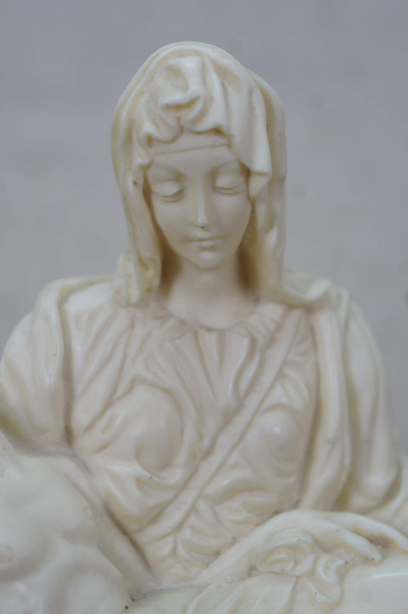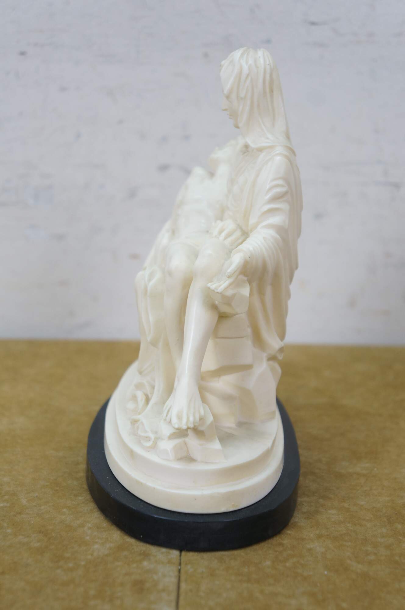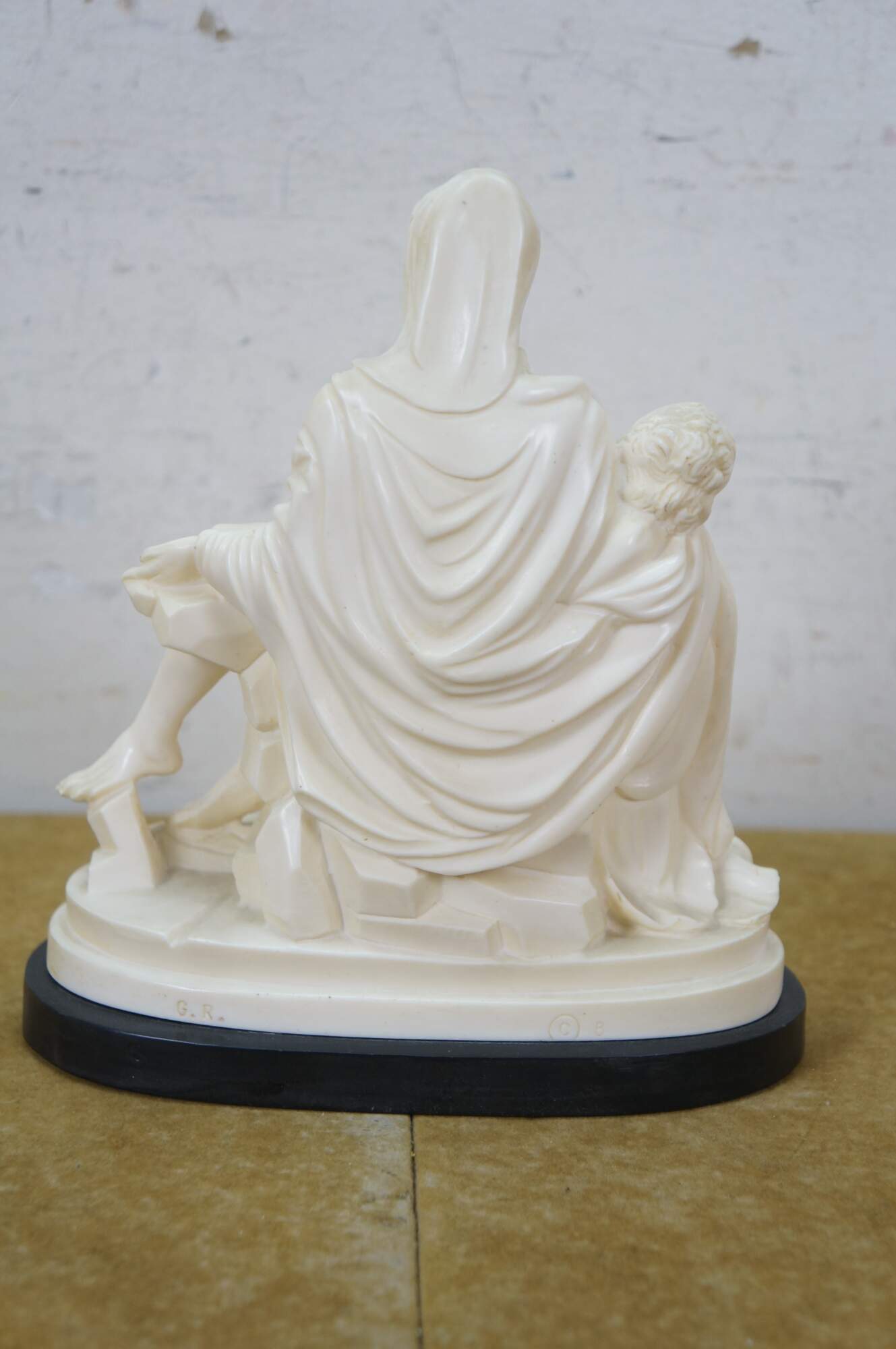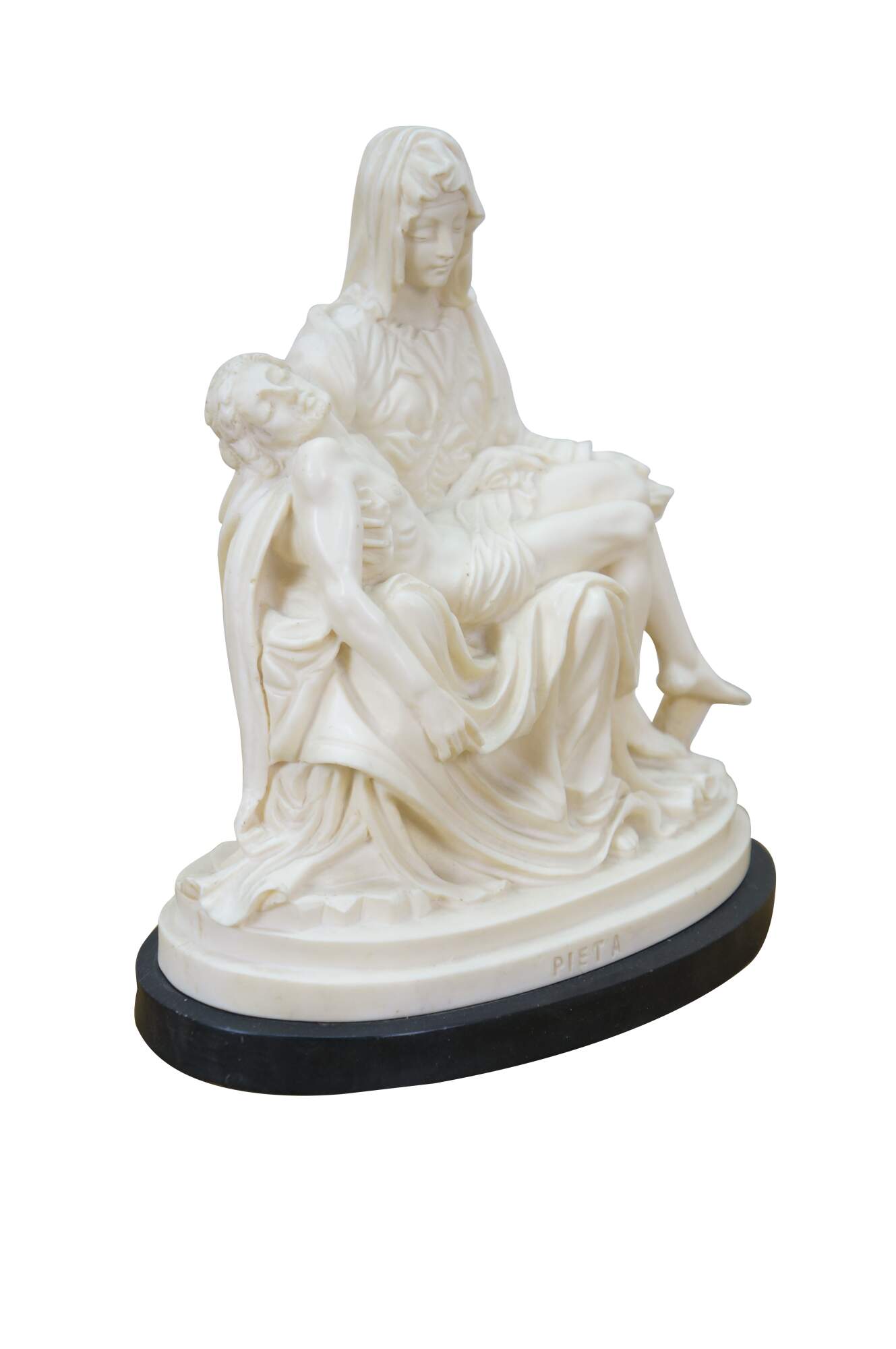 Vintage G Ruggeri sculpture after La Pieta by Michelangelo. Made of an ivory colored resin, featuring Mary holding Jesus. Stone base. Made in Italy.