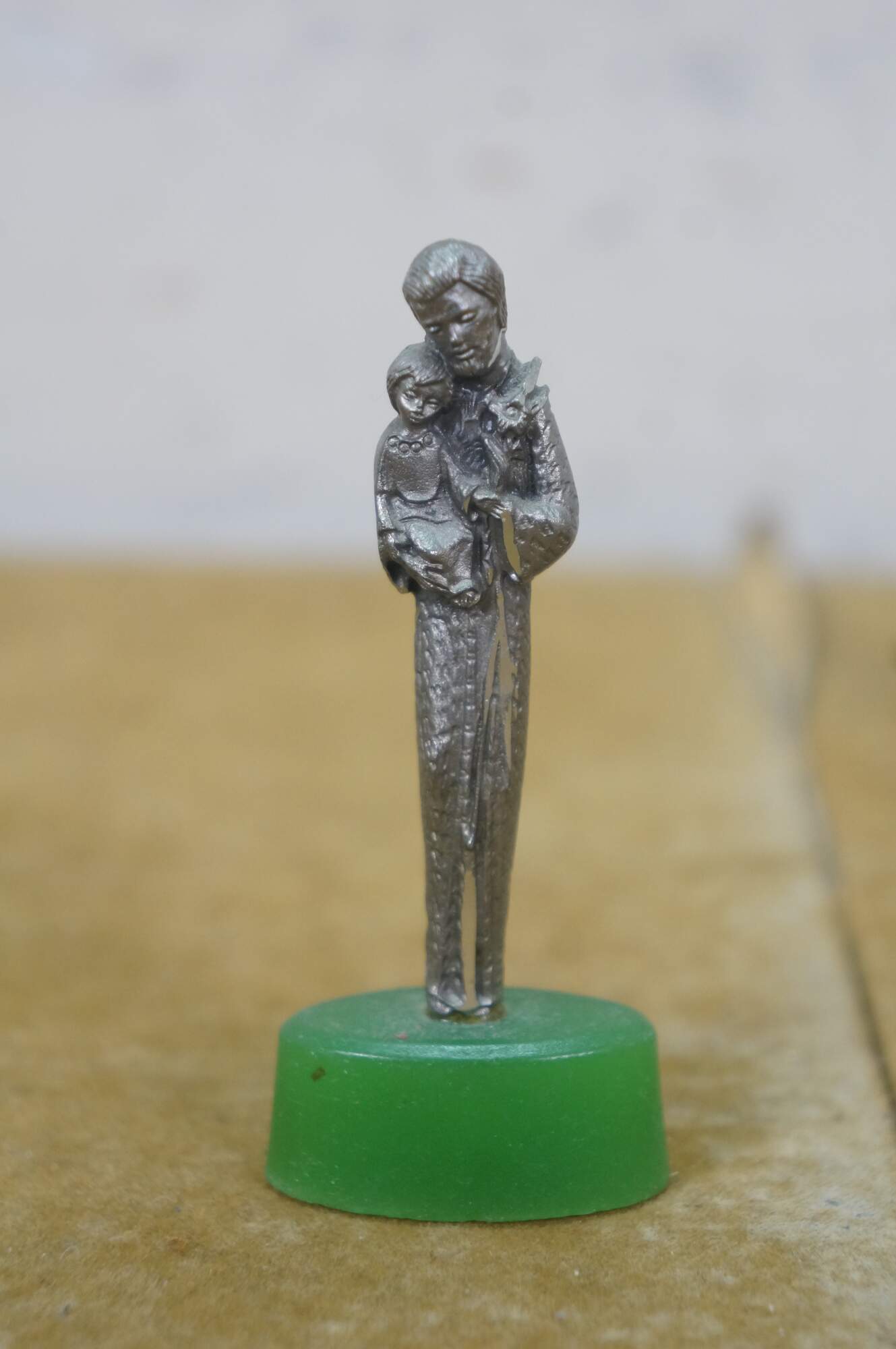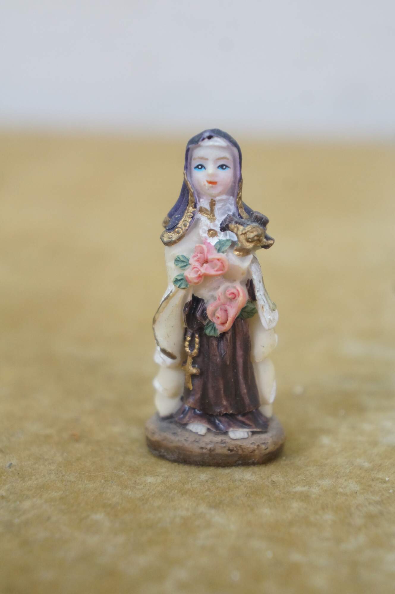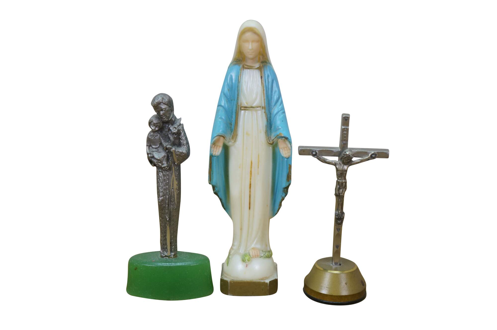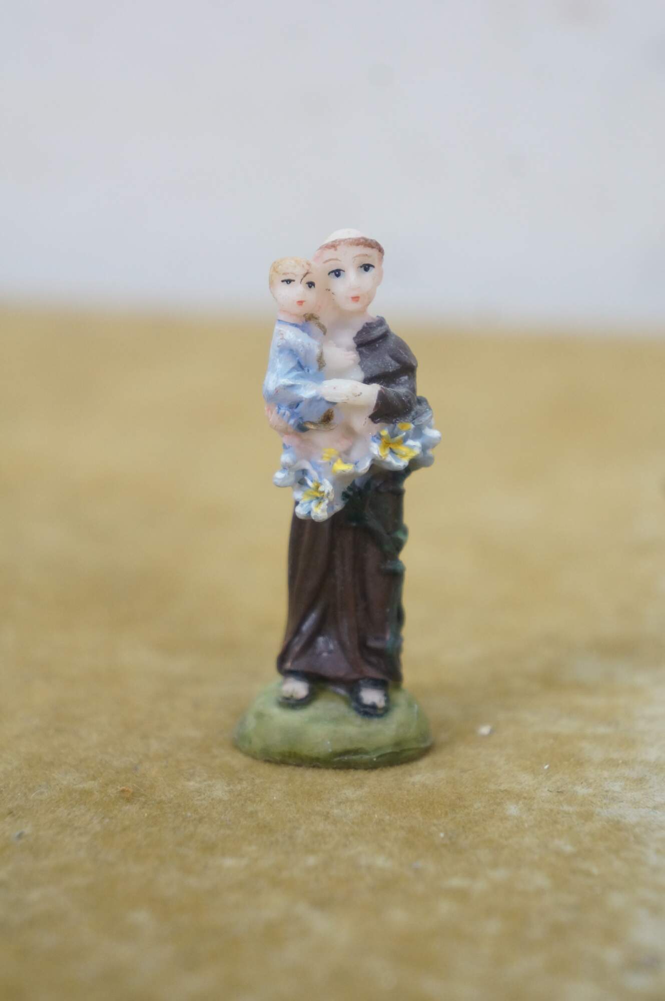 - St. Anthony of Padua figurine, a Catholic saint often depicted holding the Christ Child and lilies. St. Anthony is the patron saint of lost things and miracles. The lily symbolizes his purity, and the Christ Child represents a mystical experience he had during his life. The figurine shows him in a traditional Franciscan robe