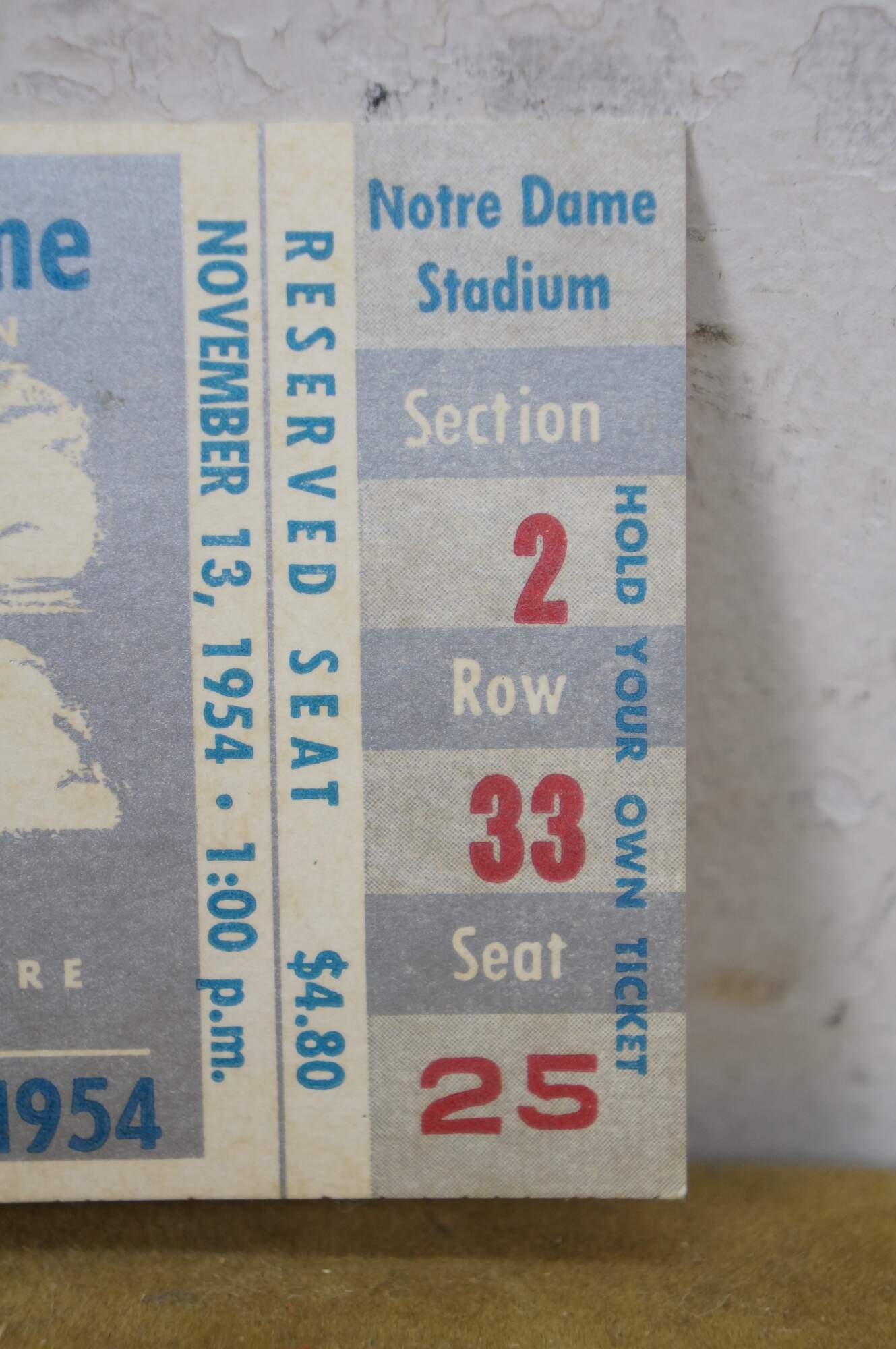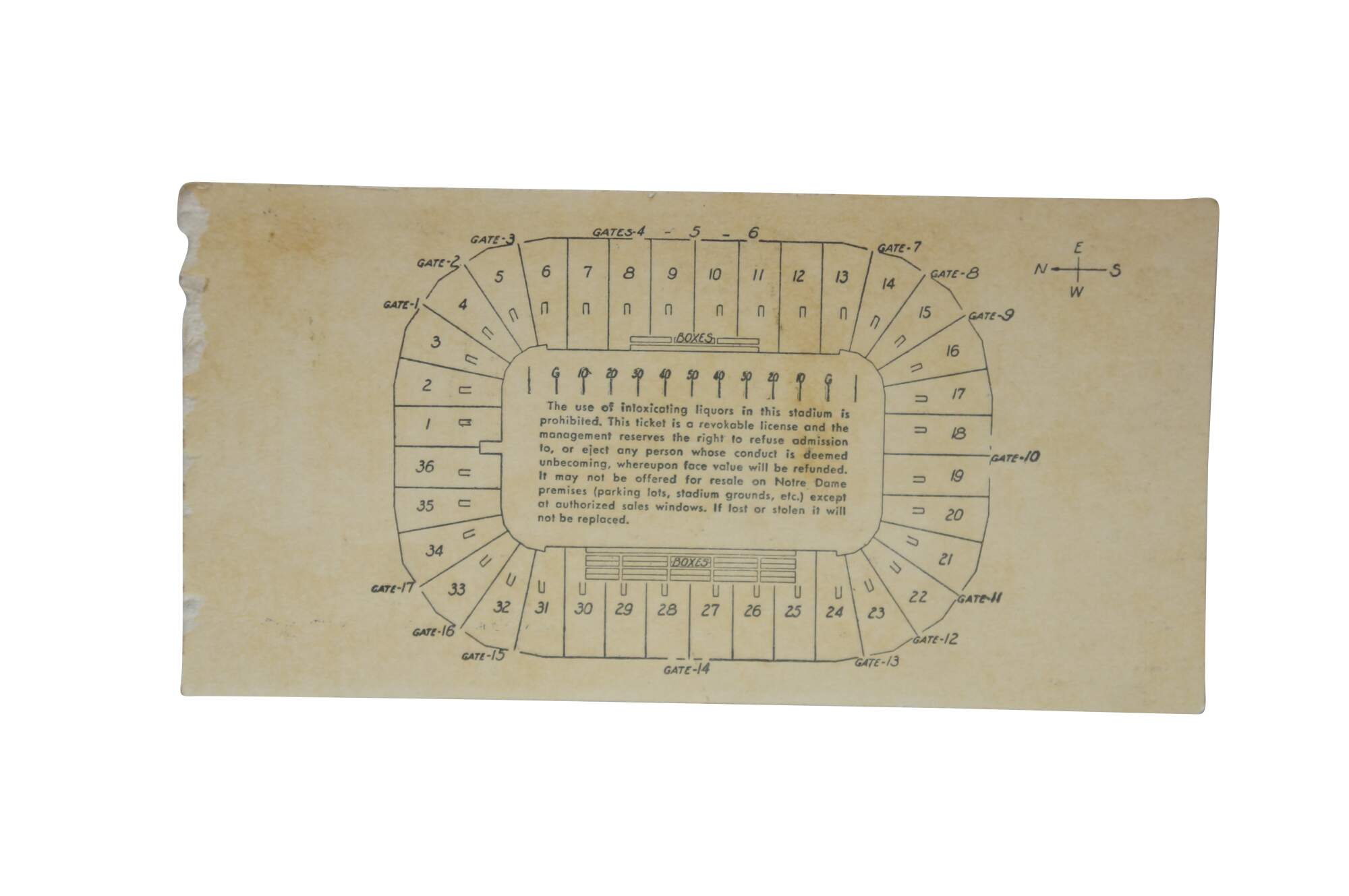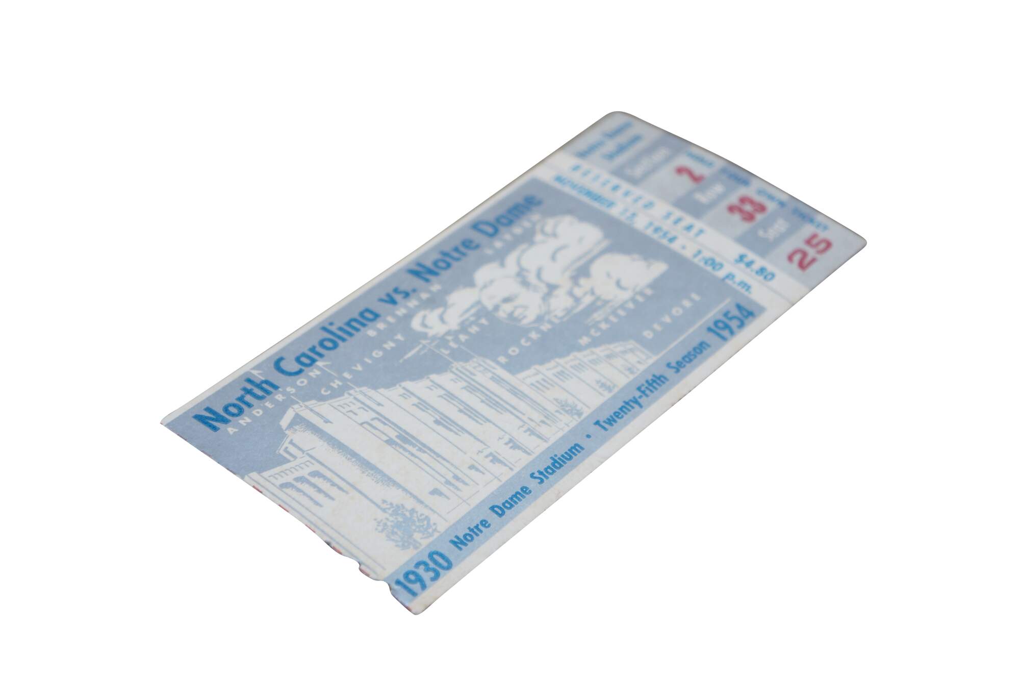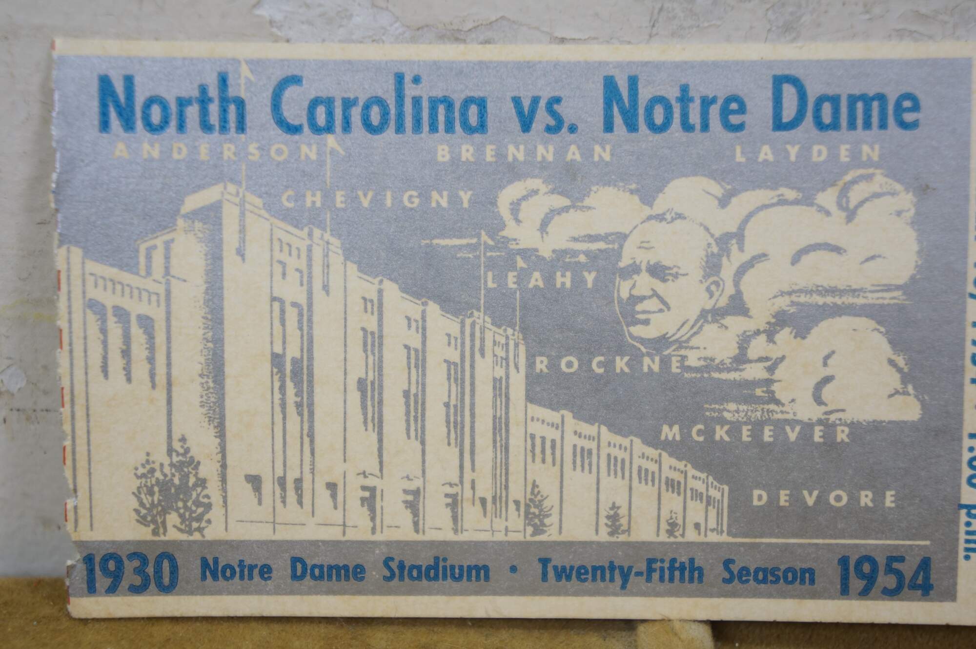 Mid-century 1954 North Carolina Tar Heels versus Notre Dame Fighting Irish football ticket stub.