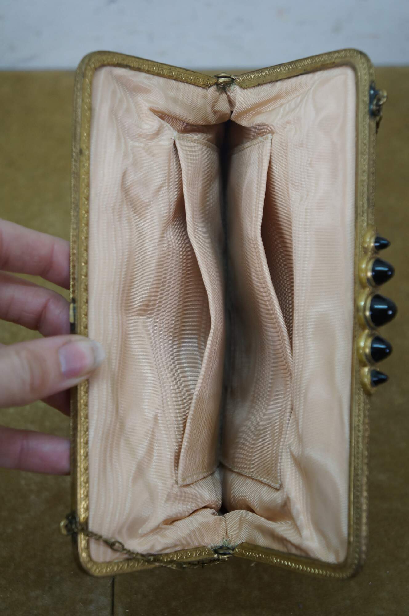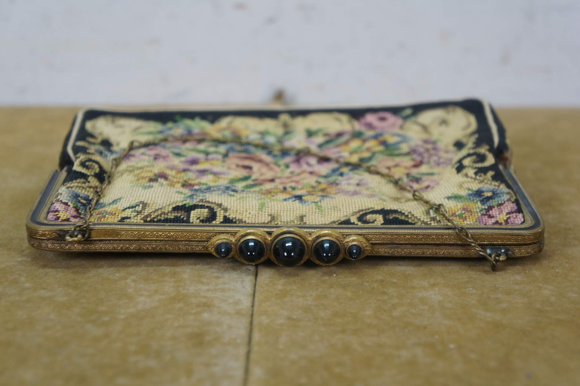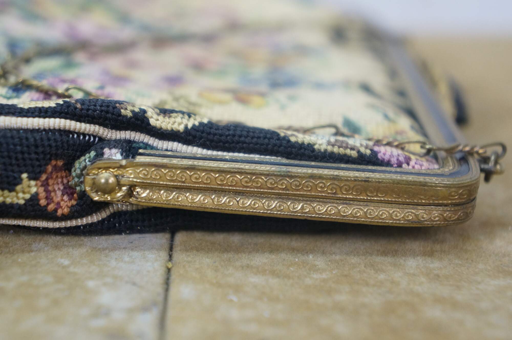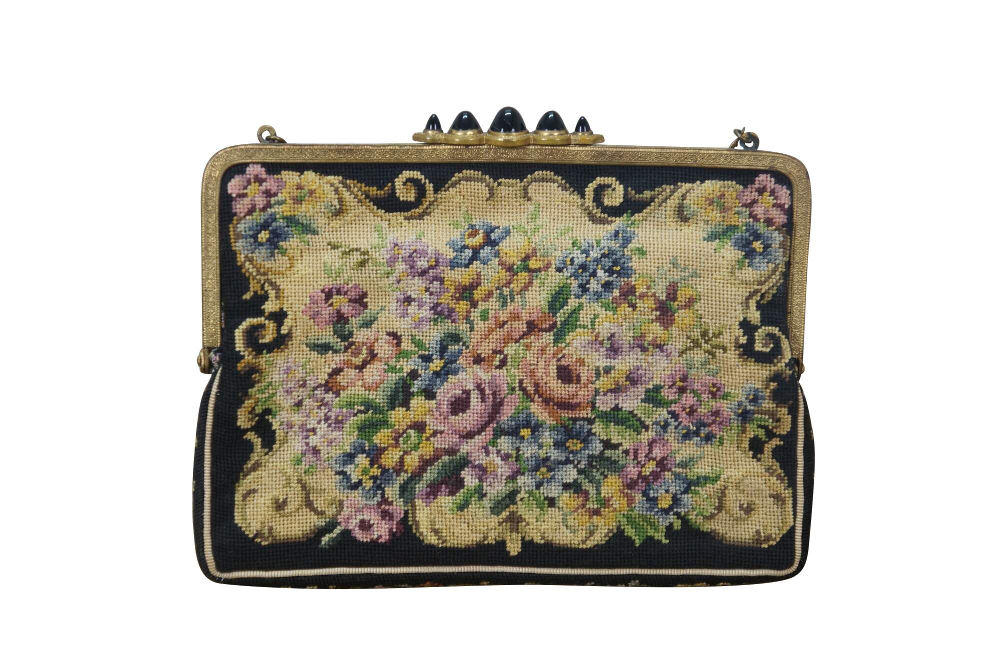 Mid century embroidered floral clutch purse evening bag with rhinestone clasp and wire mesh strap.