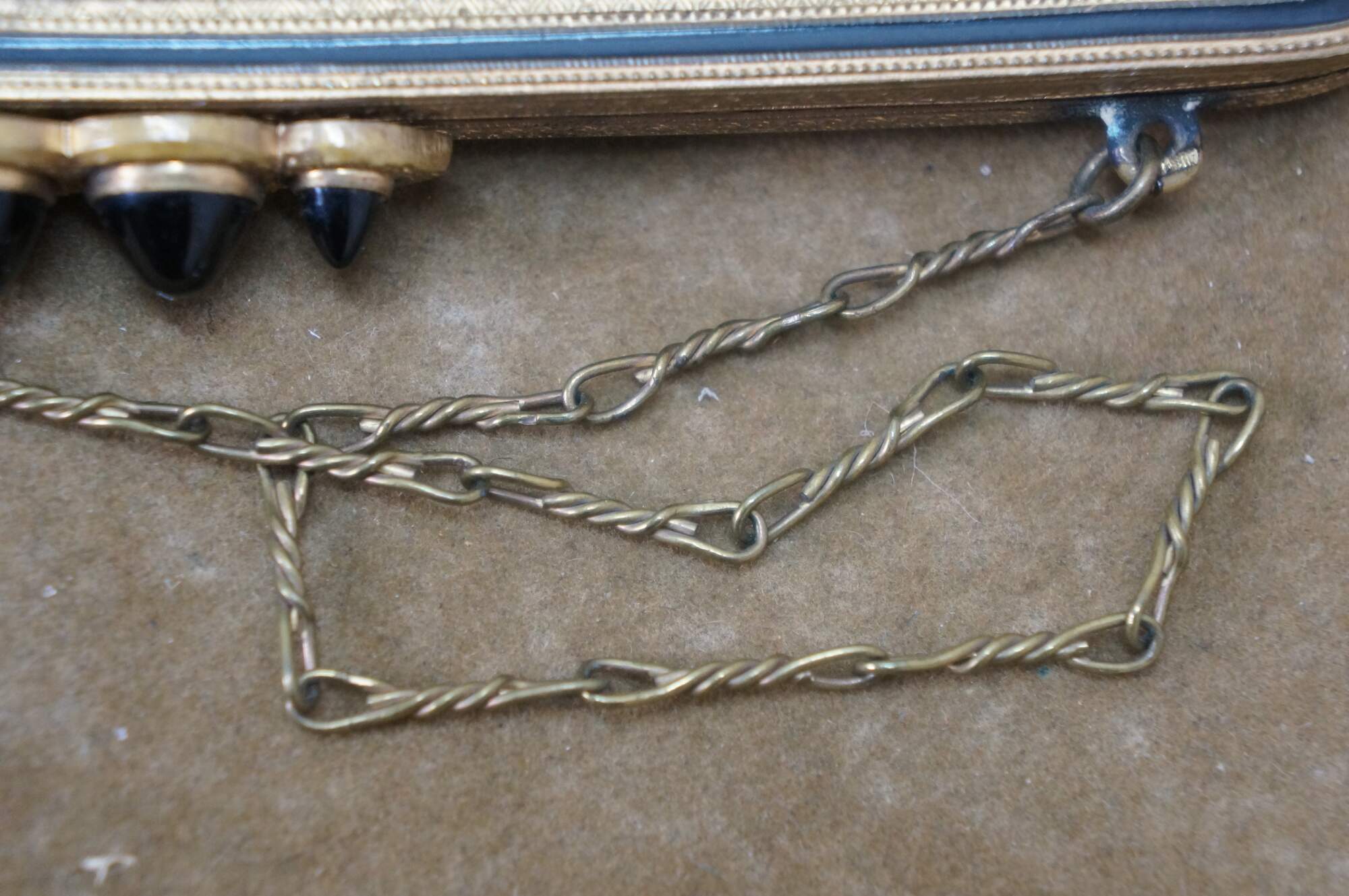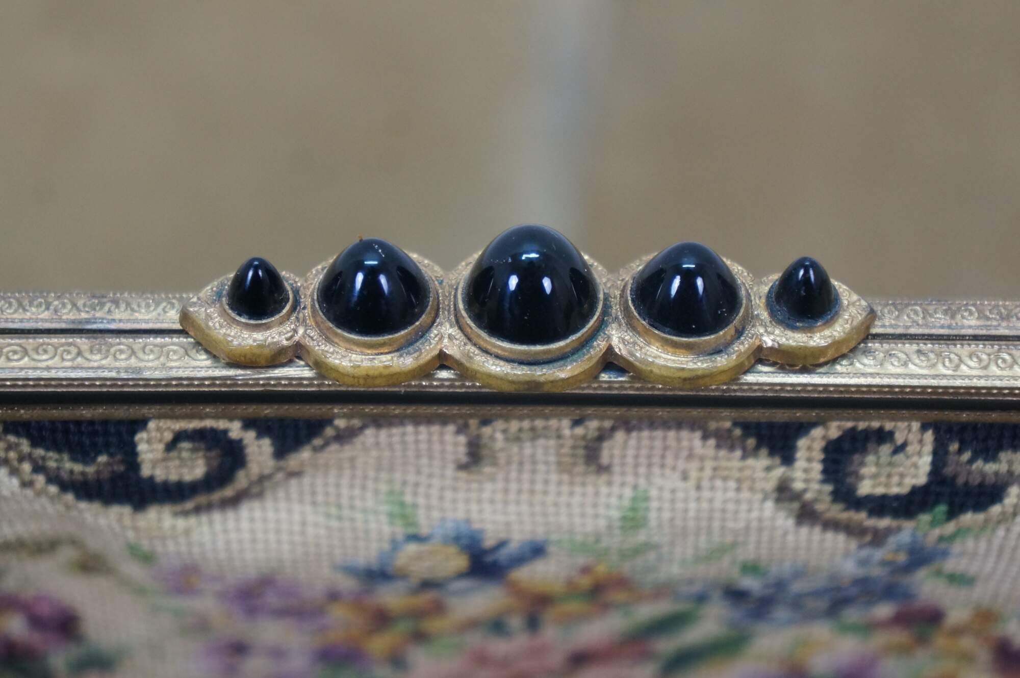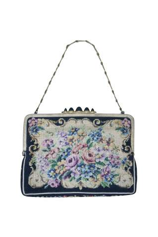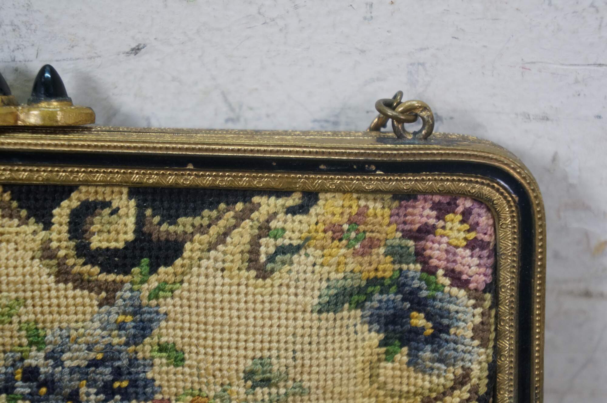 Mid century embroidered floral clutch purse evening bag with rhinestone clasp and wire mesh strap.