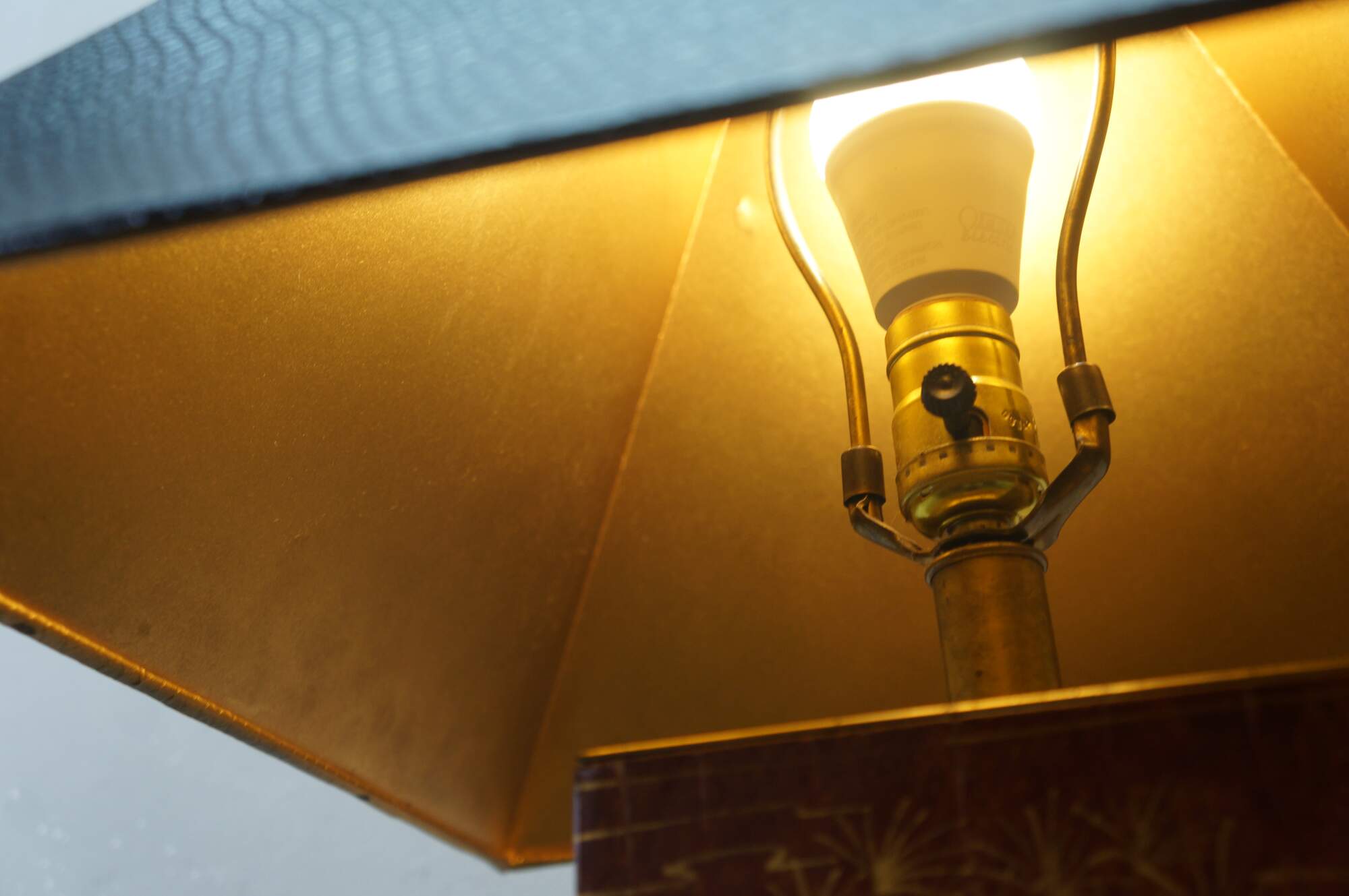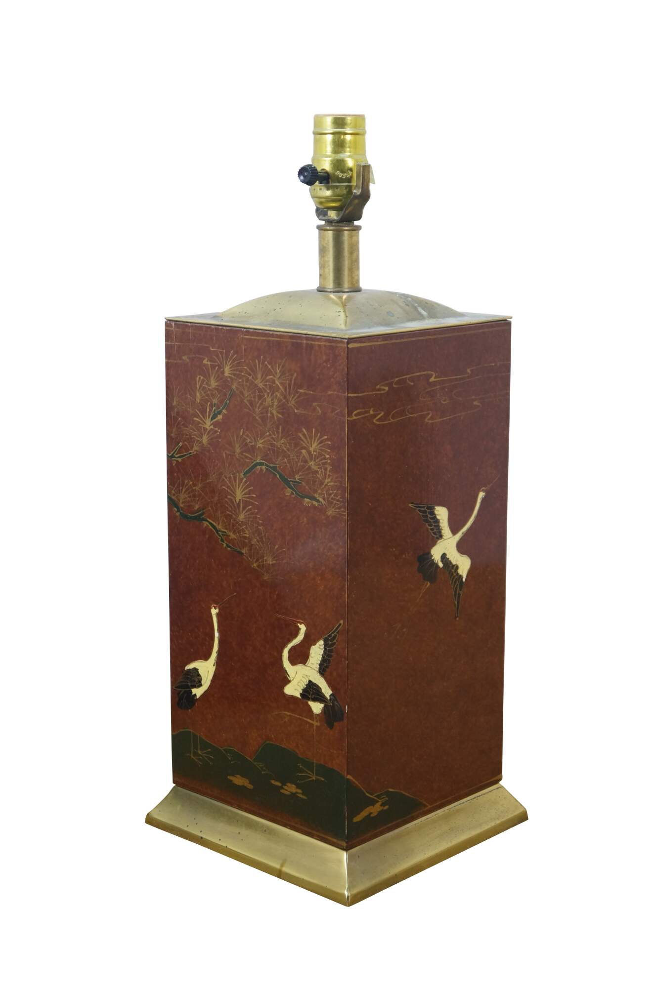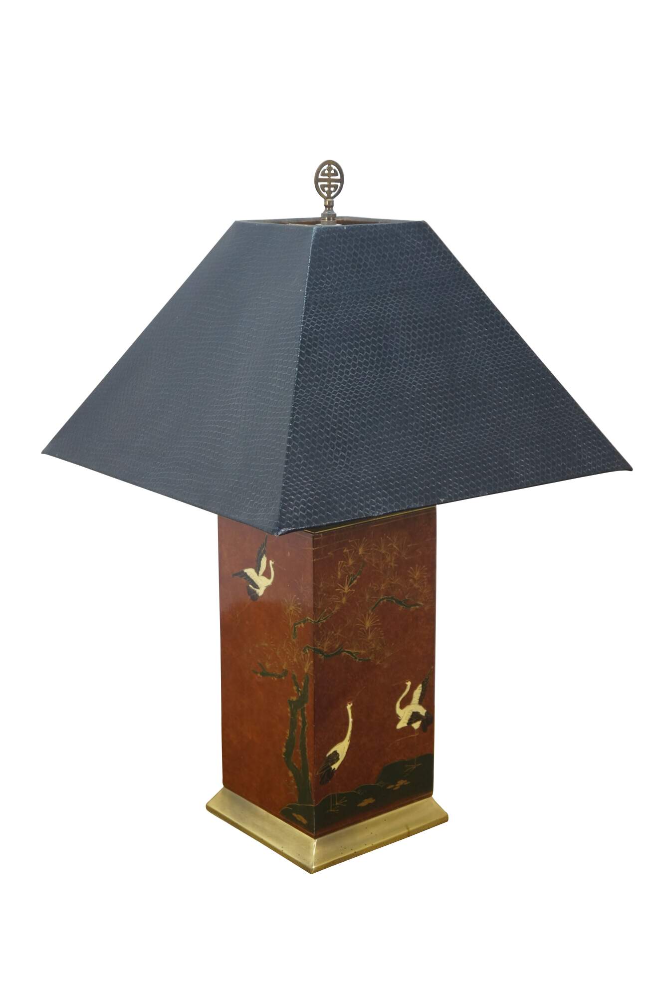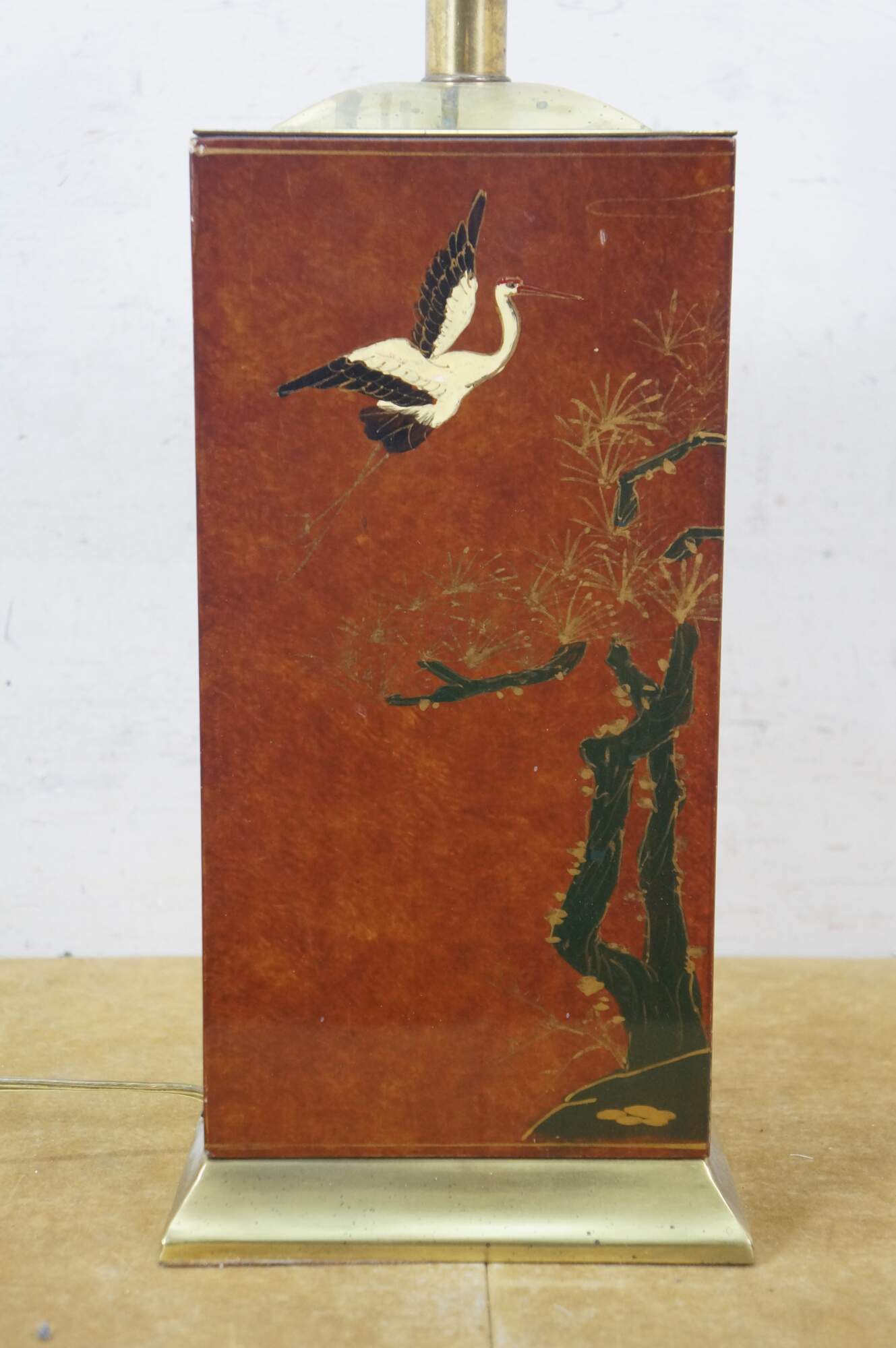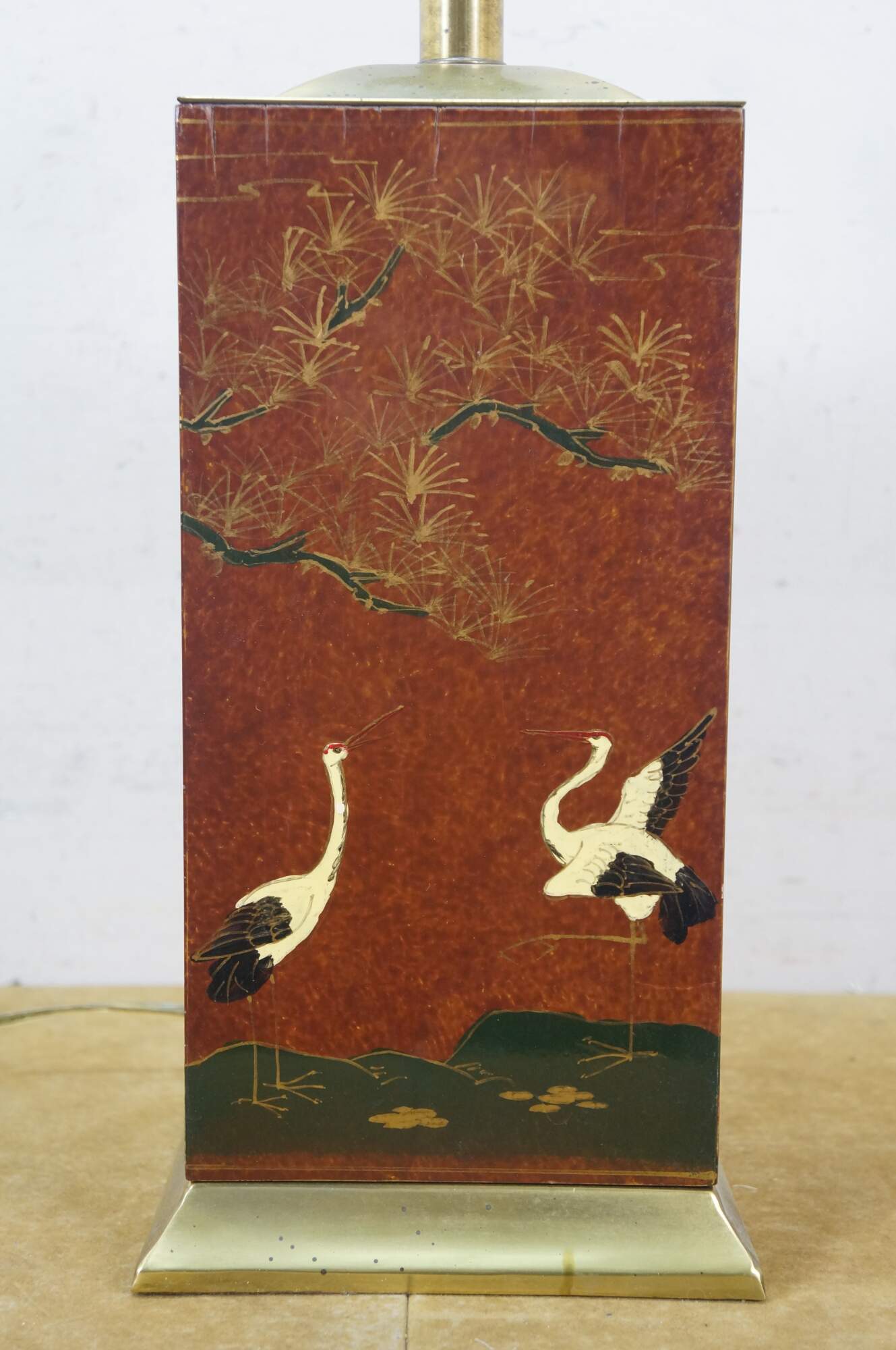 Beautiful vintage Chinese / Asian / Chinoiserie table lamp with a painted landscape scene of crane birds and gnarled pine trees with gilt details and brass base. Tooled leather shade and filigree medallion finial.