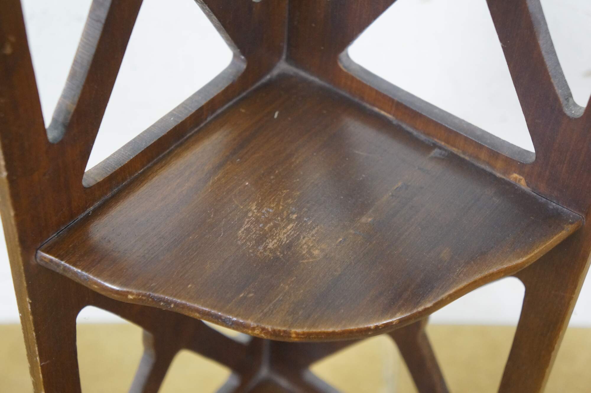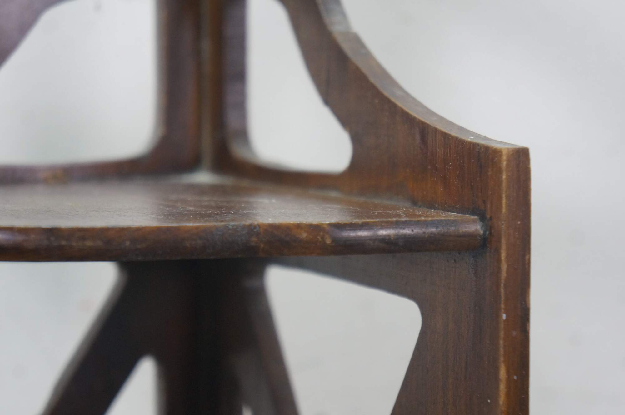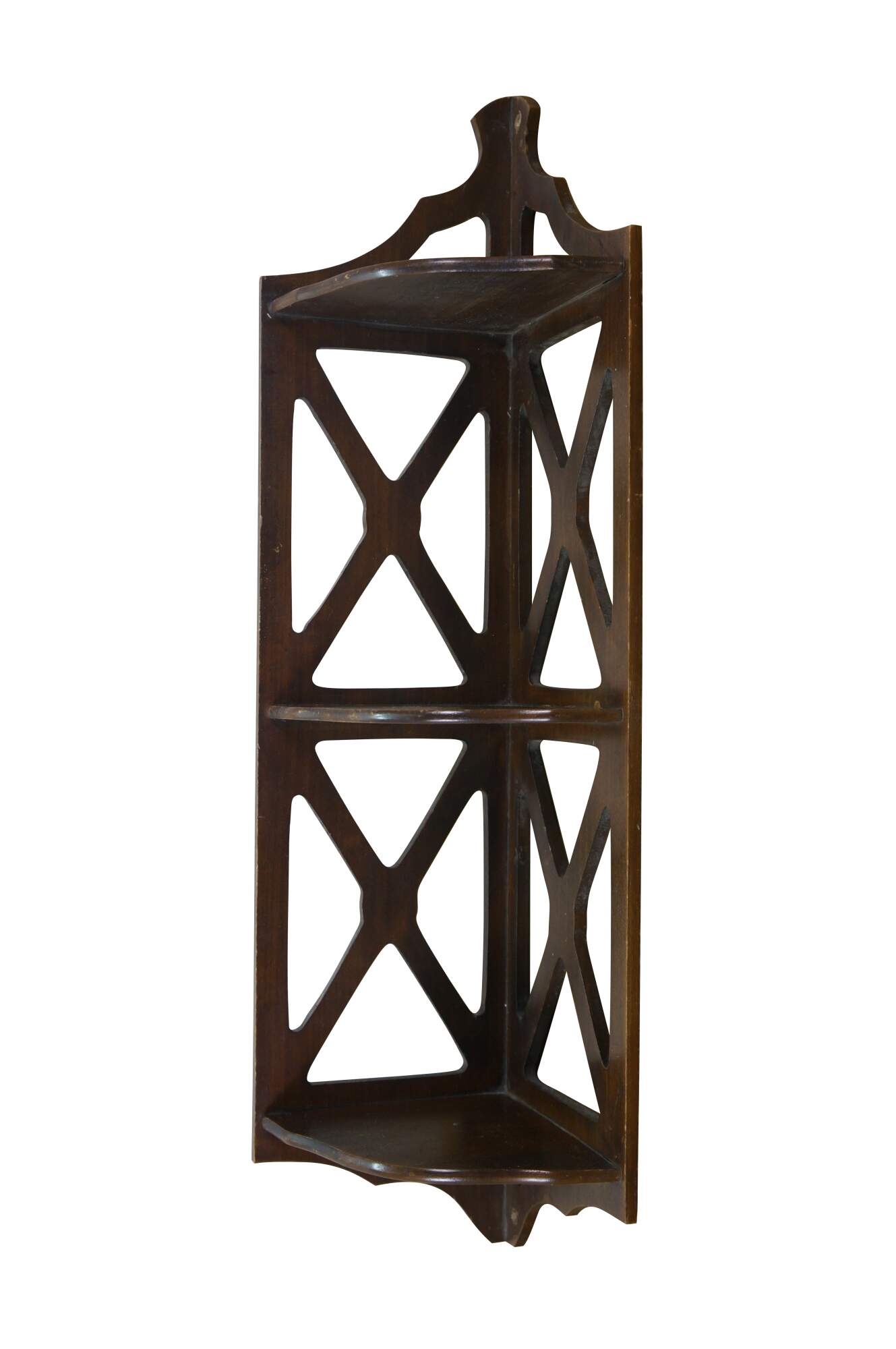 Vintage carved mahogany reticulated corner shelf featuring three tiers and fretwork accents.