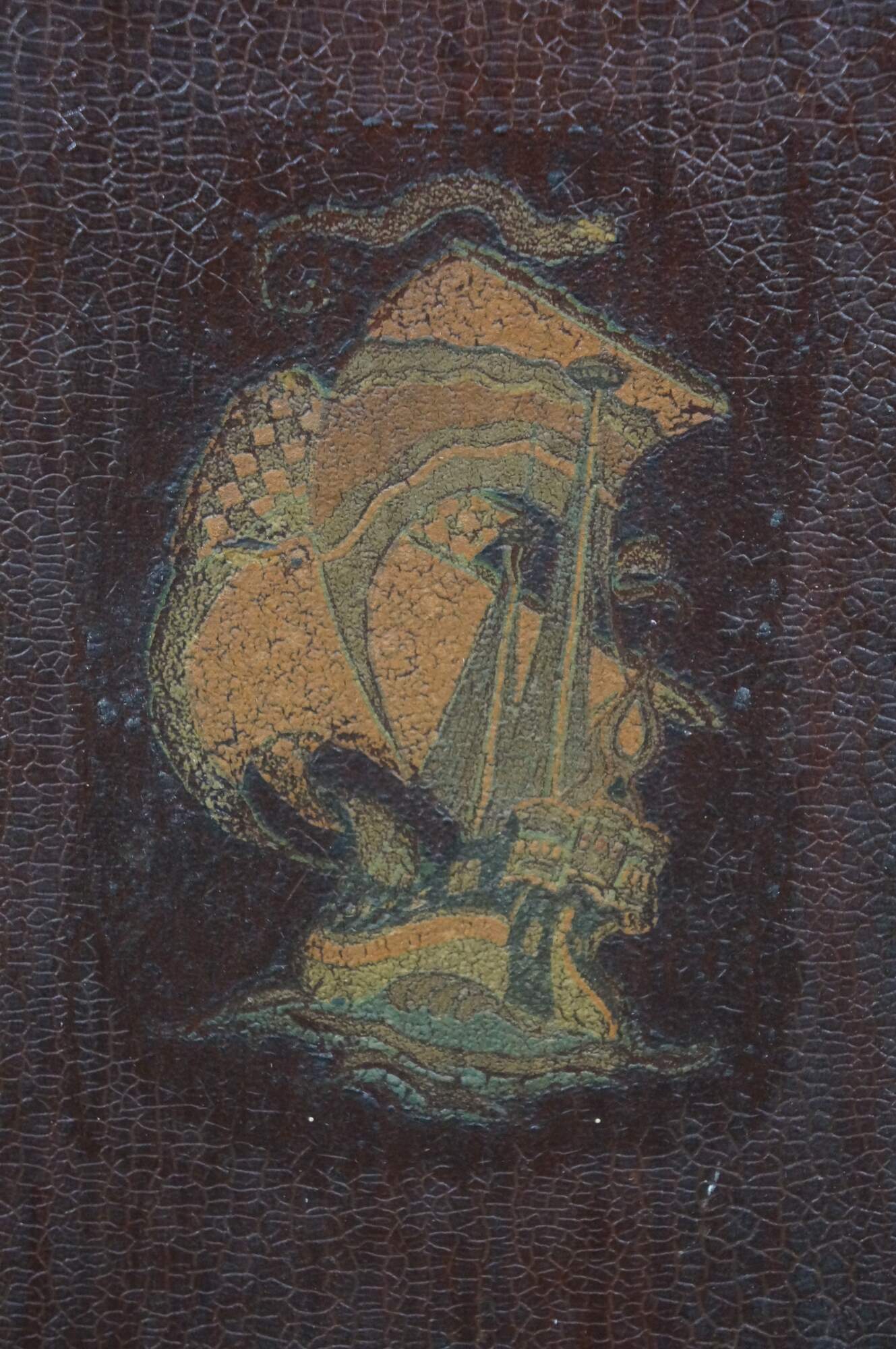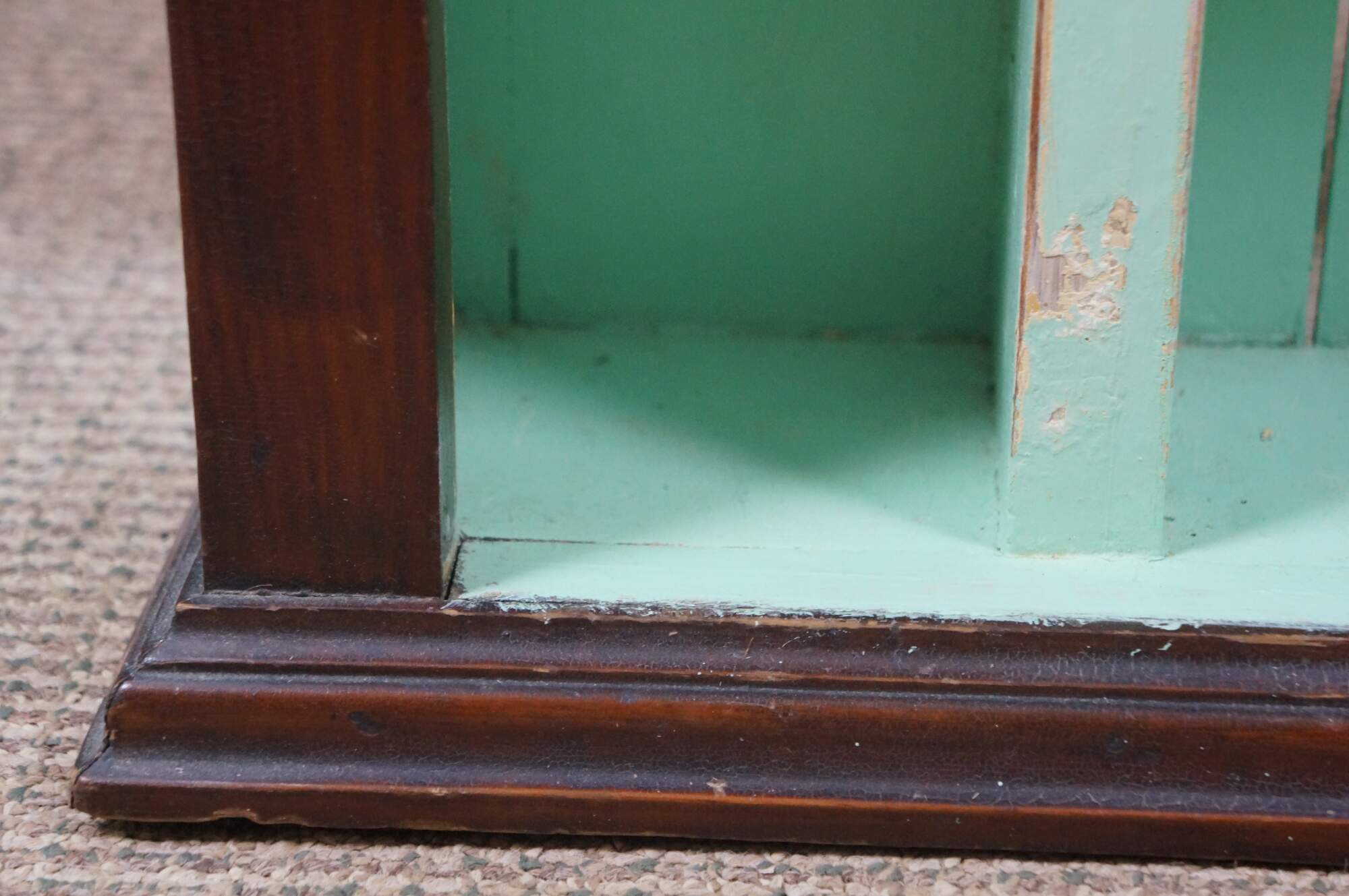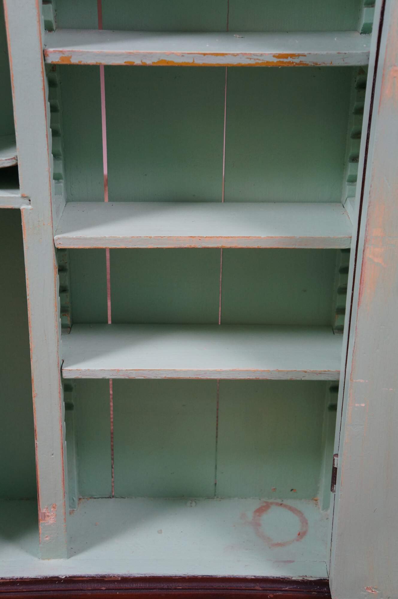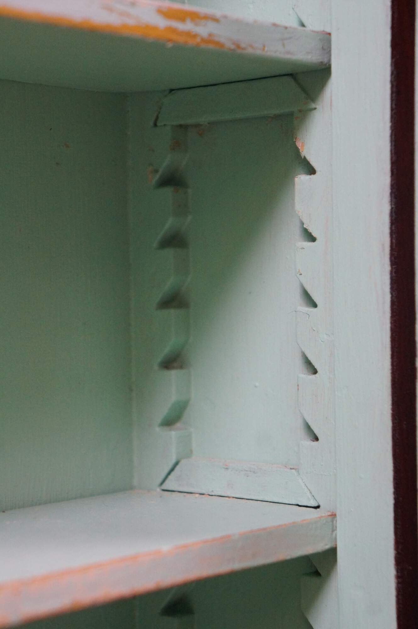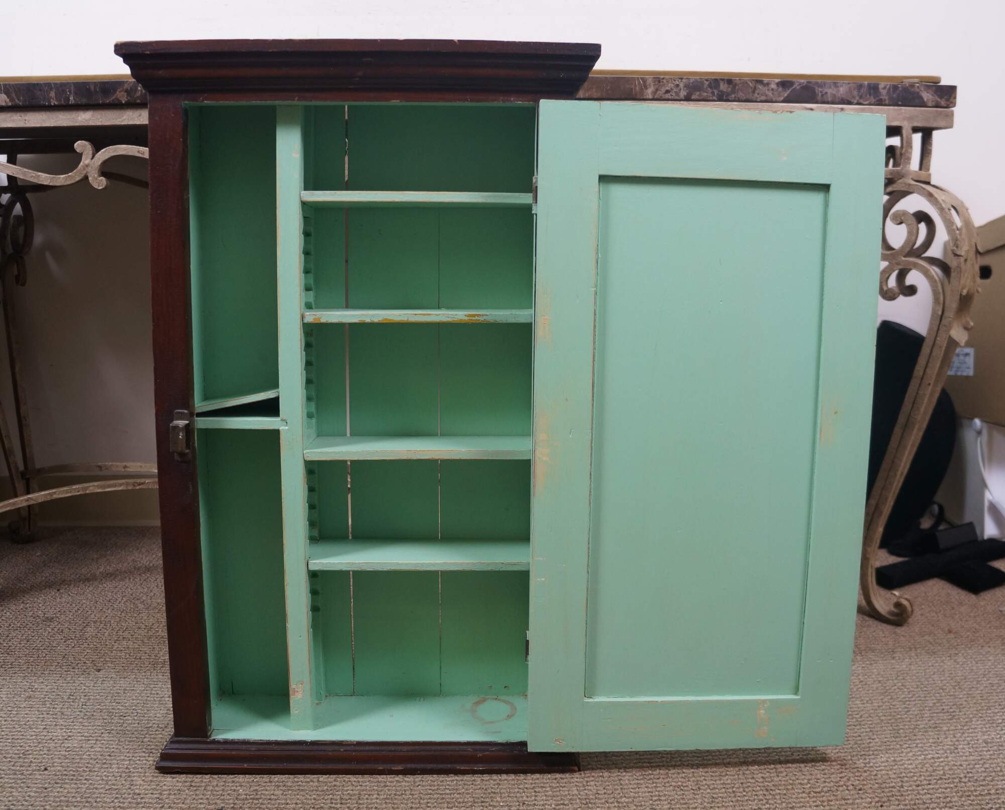 Antique Victorian oak country / farmhouse / apothecary style wall medicine / spice cabinet cupboard featuring teal blue painted interior with multiple shelves / cubbies, and lithograph of sailboat / ship