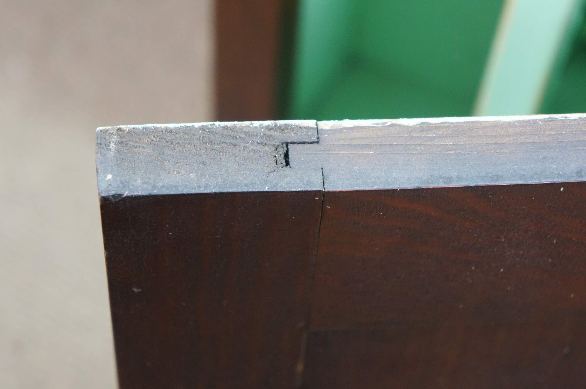 Alligatoring to finish; tarnish/oxidation to metal; scuffs/wear; gap at lower corner, splitting, finish loss.
