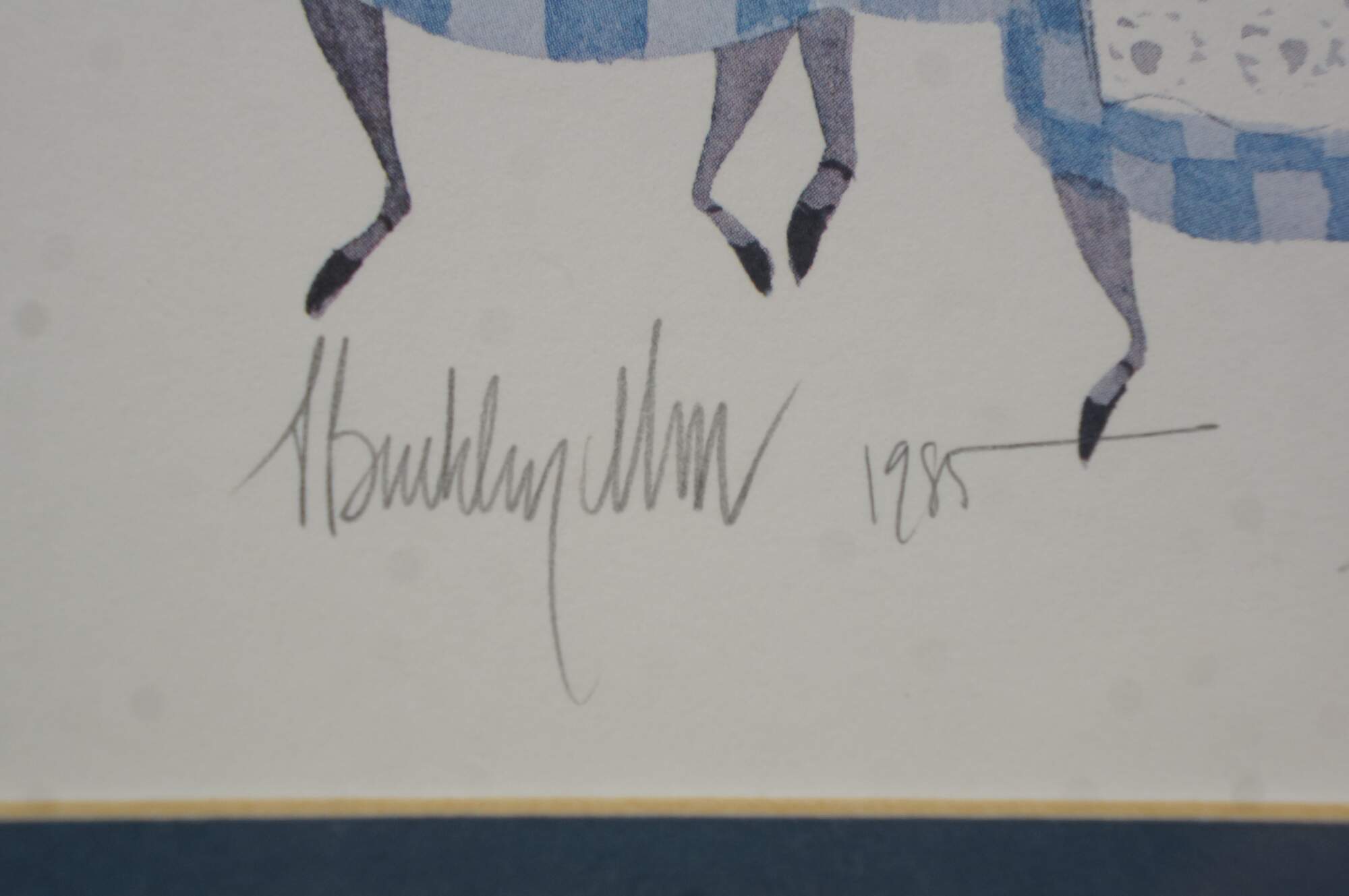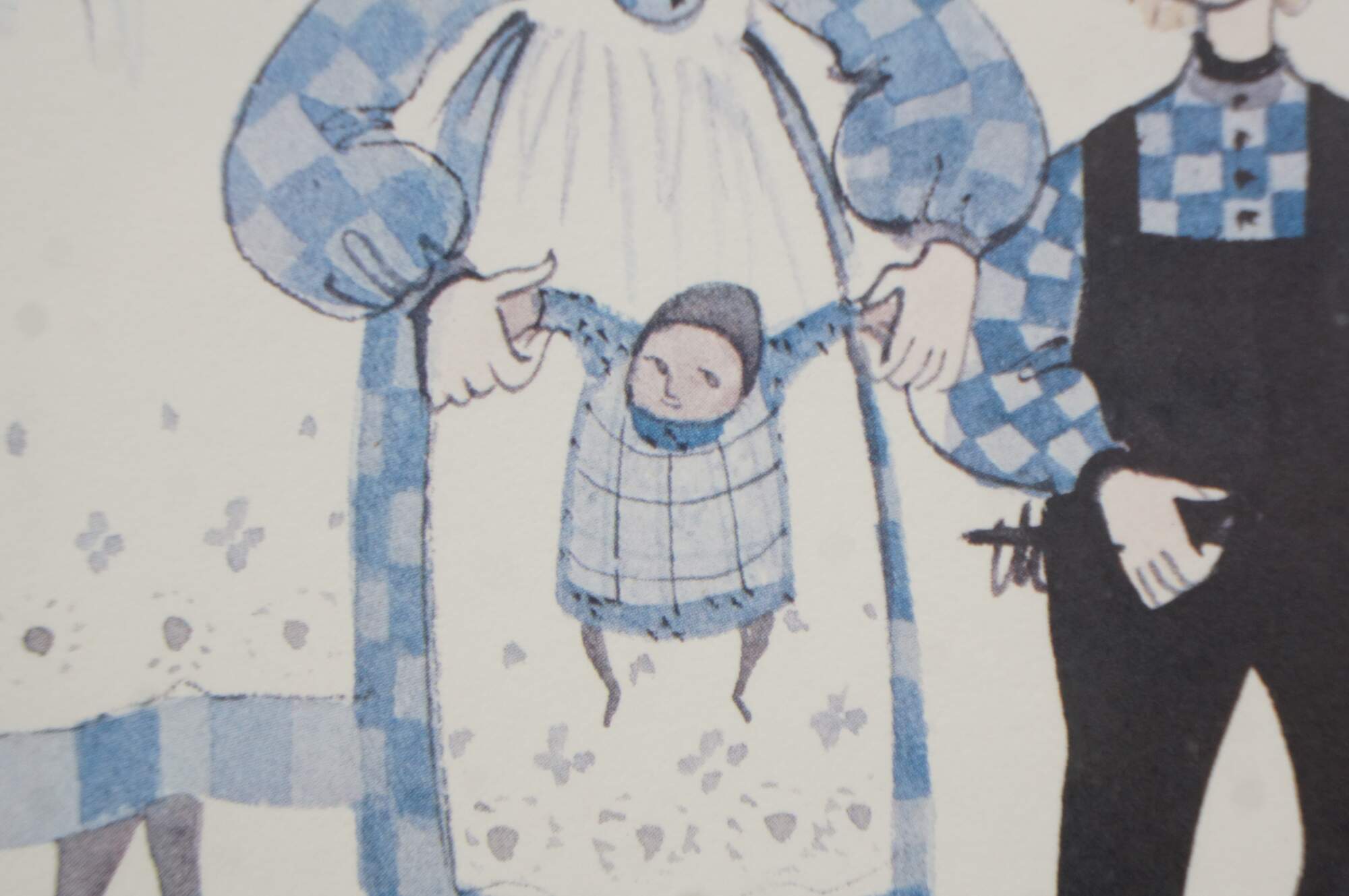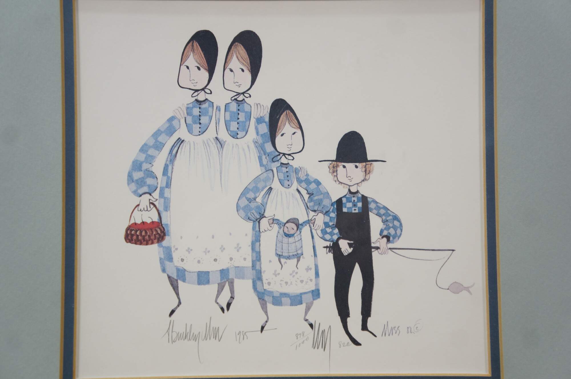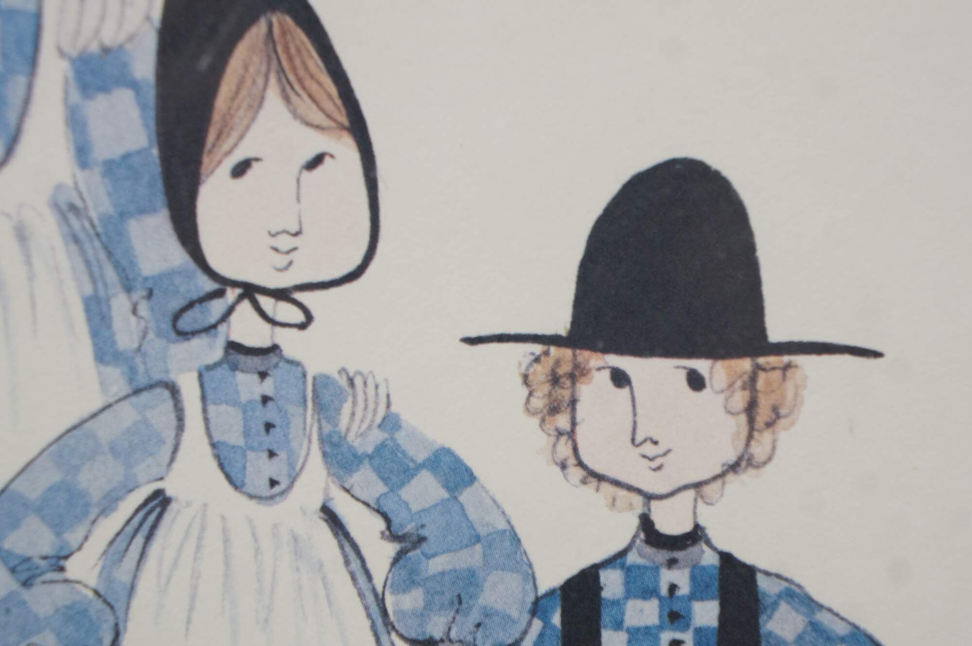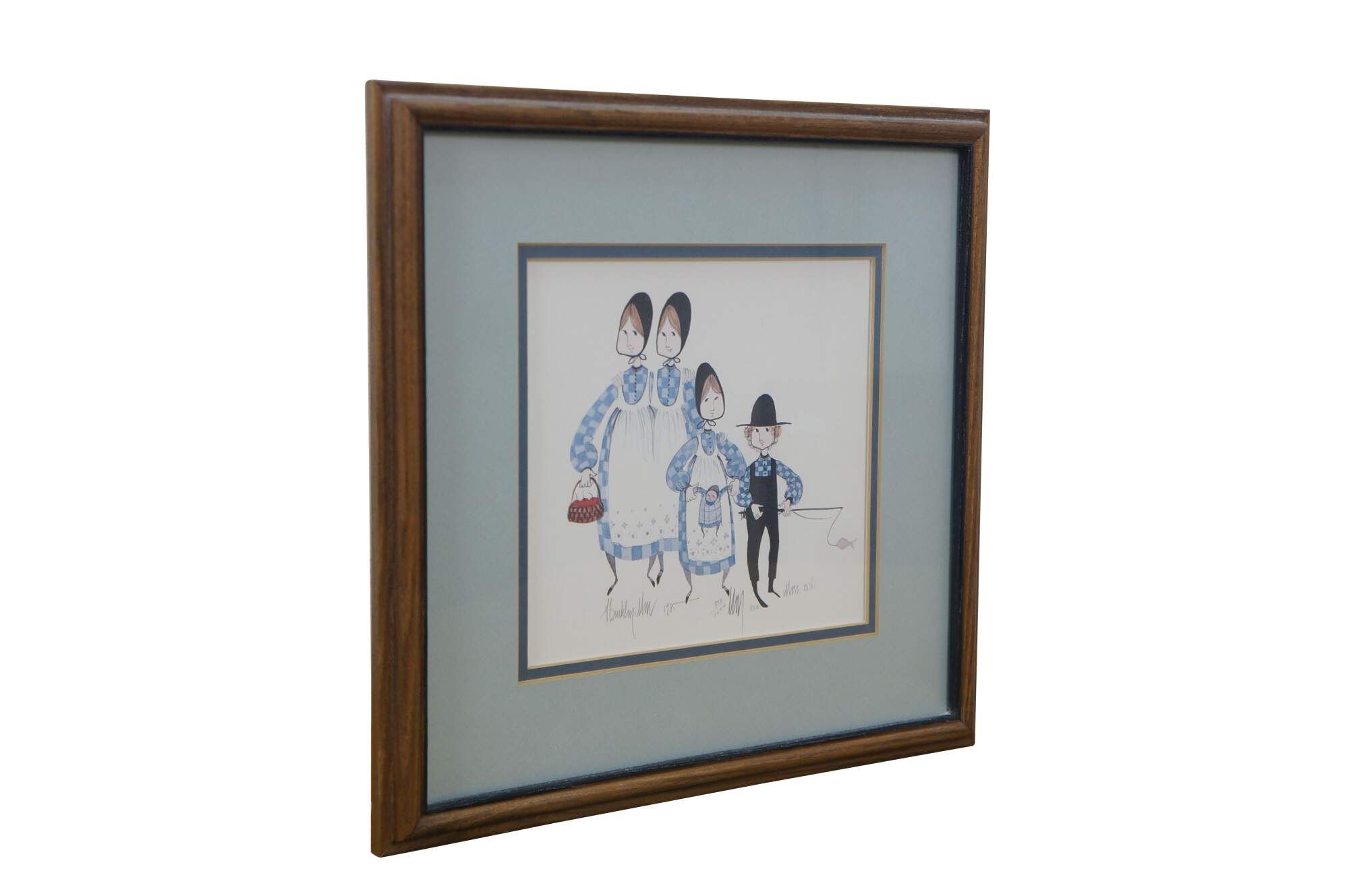 1982 / 1985 P. Buckley Moss My Sisters Amish family print featuring two sisters carrying a basket with apples and two children, one with baby doll and one with fishing pole.