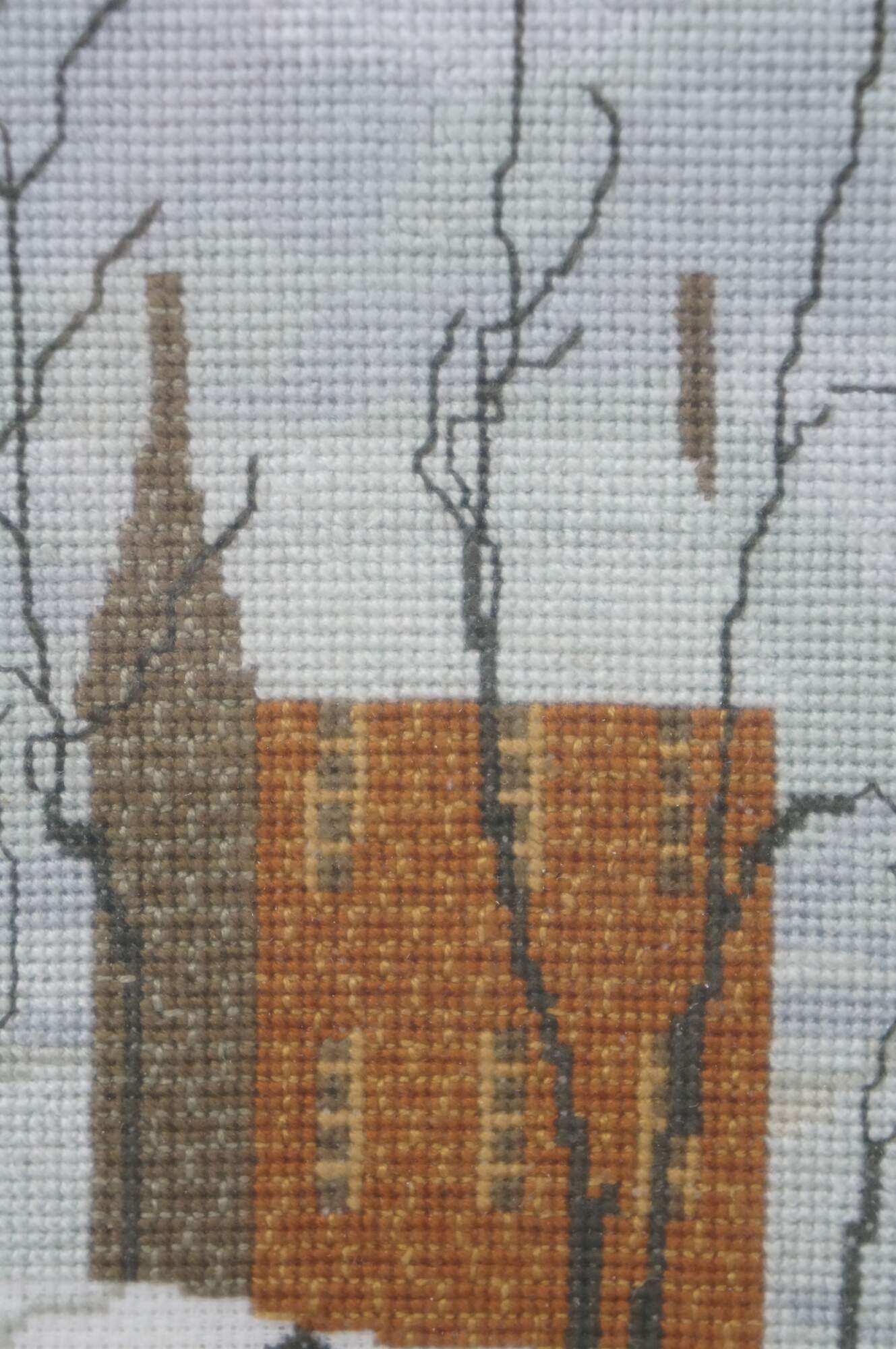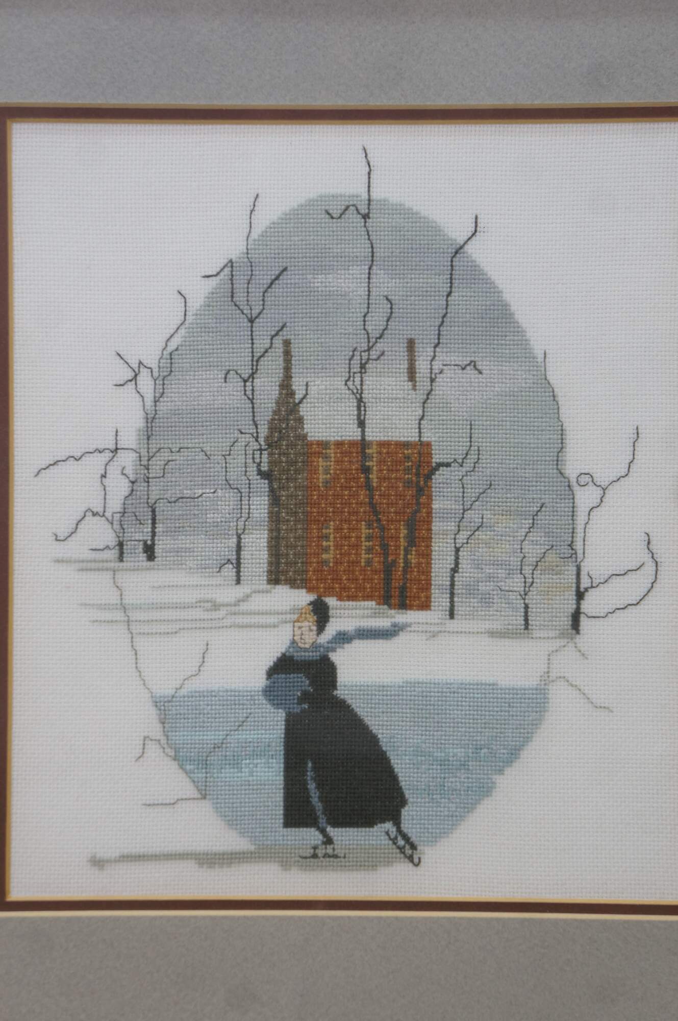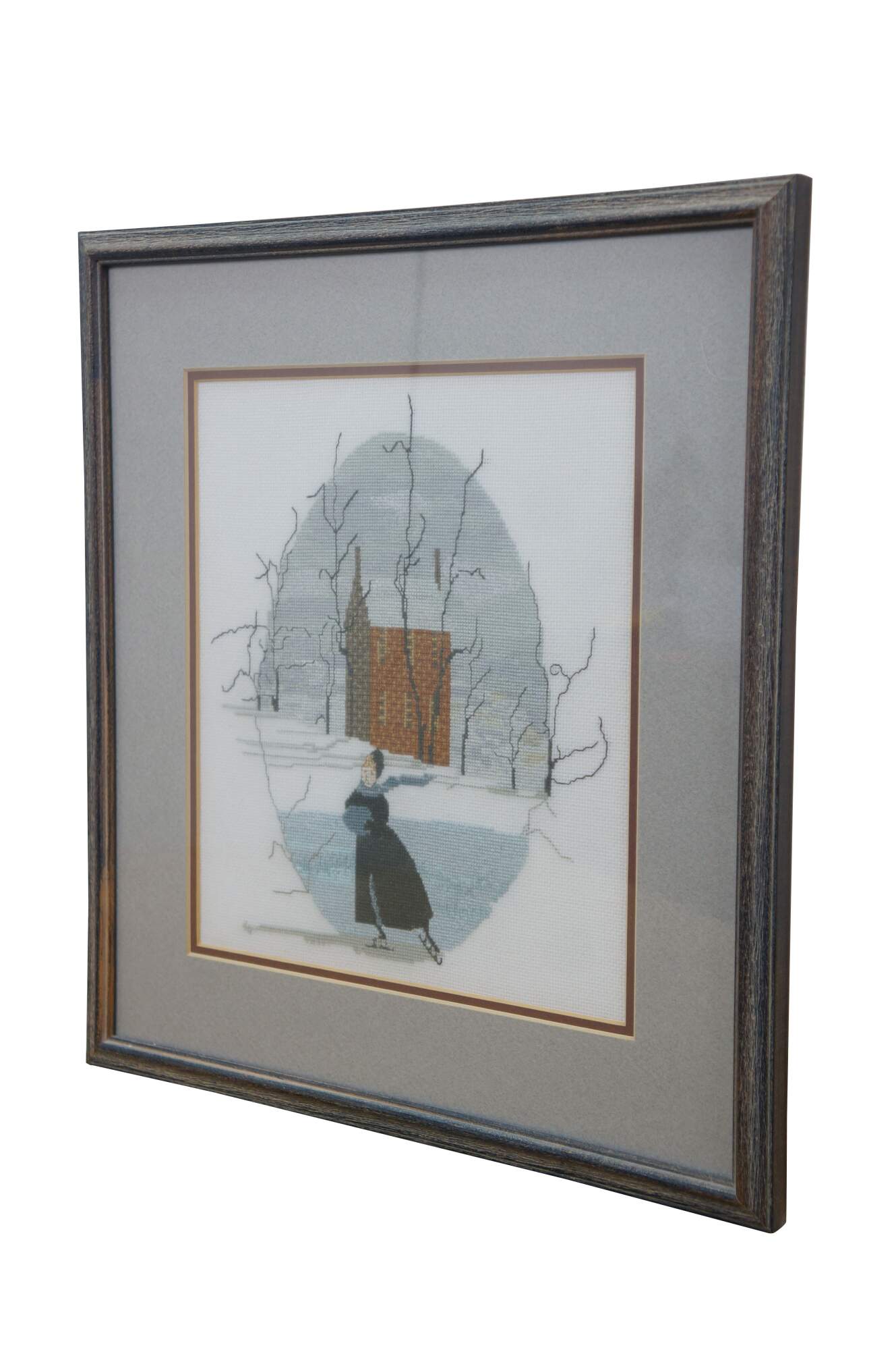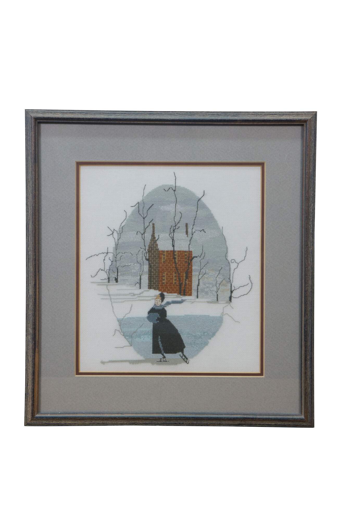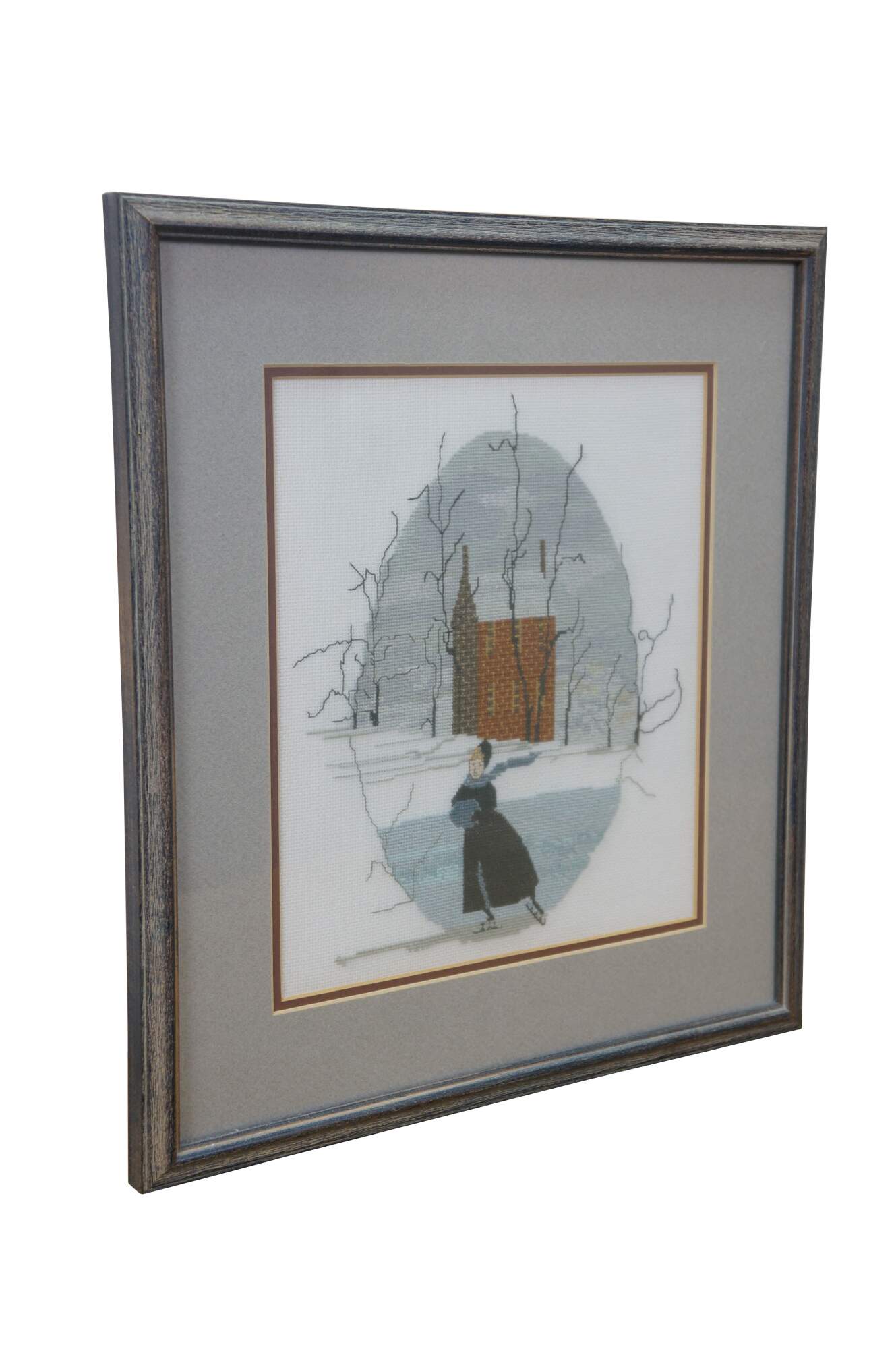 Finished and framed cross-stitch based on the P. Buckley Moss "Solitary Skater" pattern.