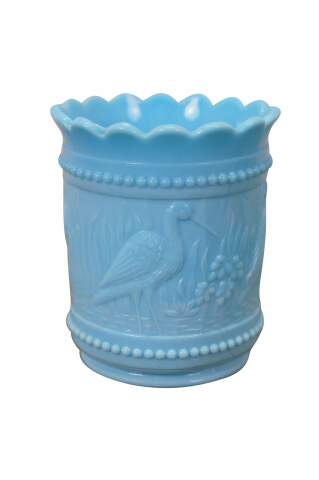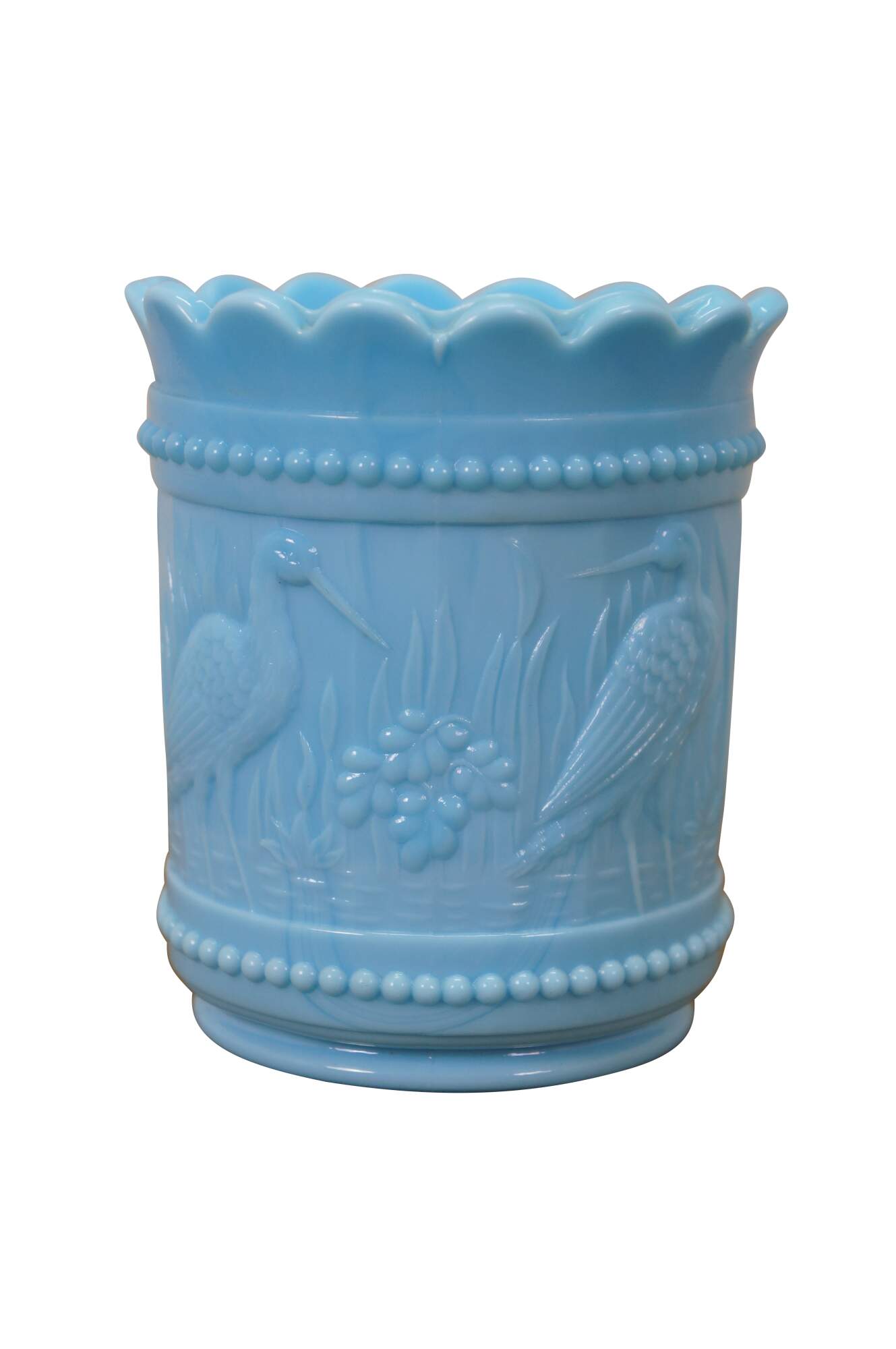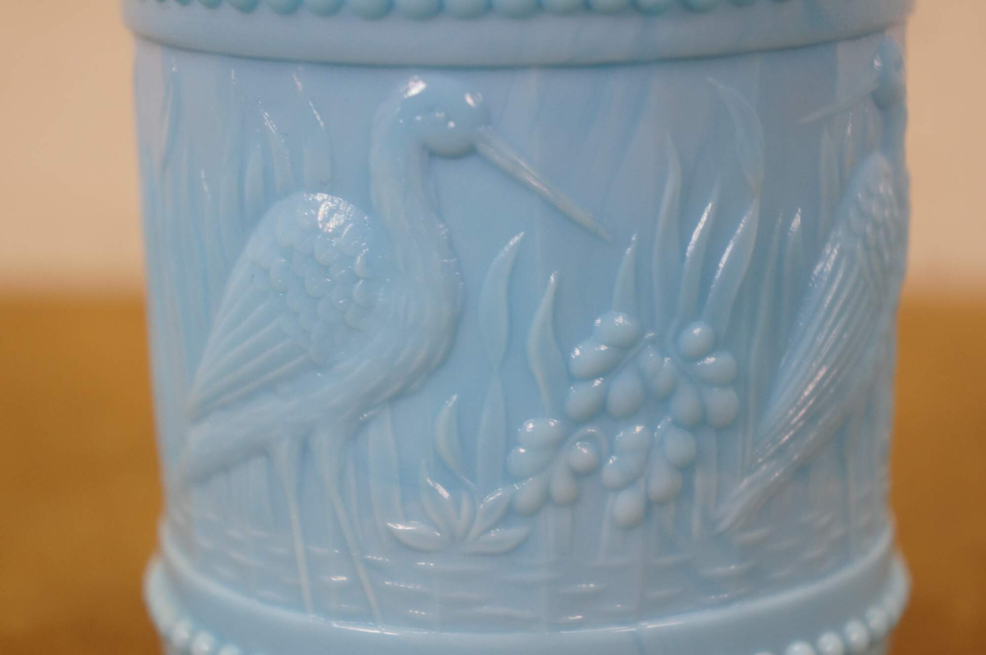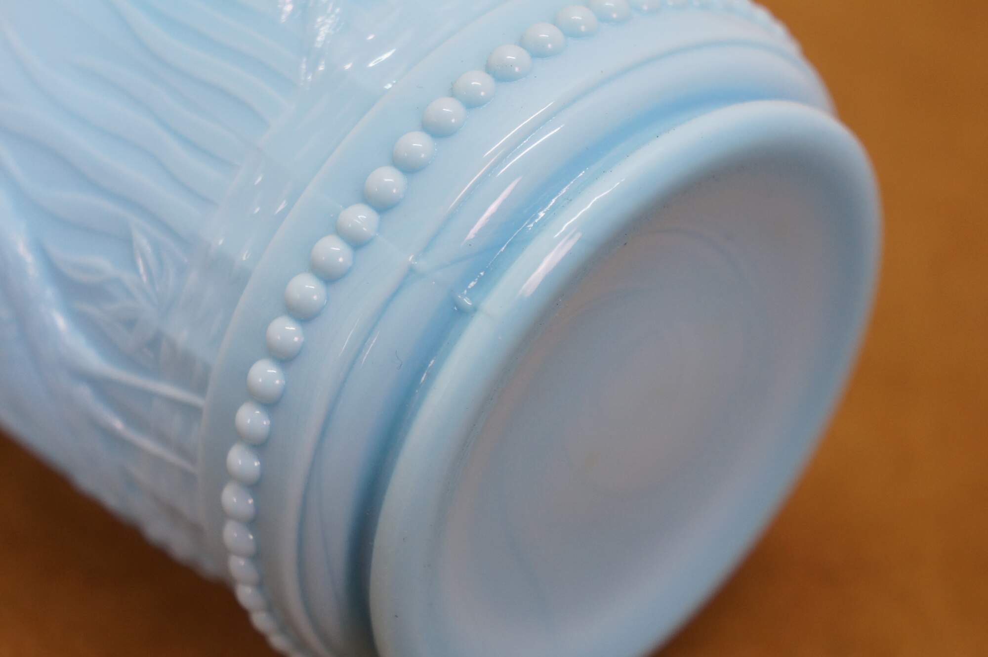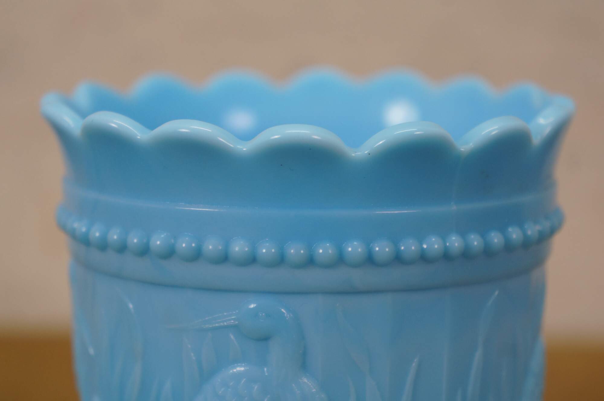 Antique LG Wright Stork in Rushes turquoise blue ruffled milk glass vase / canister jar / tumbler.