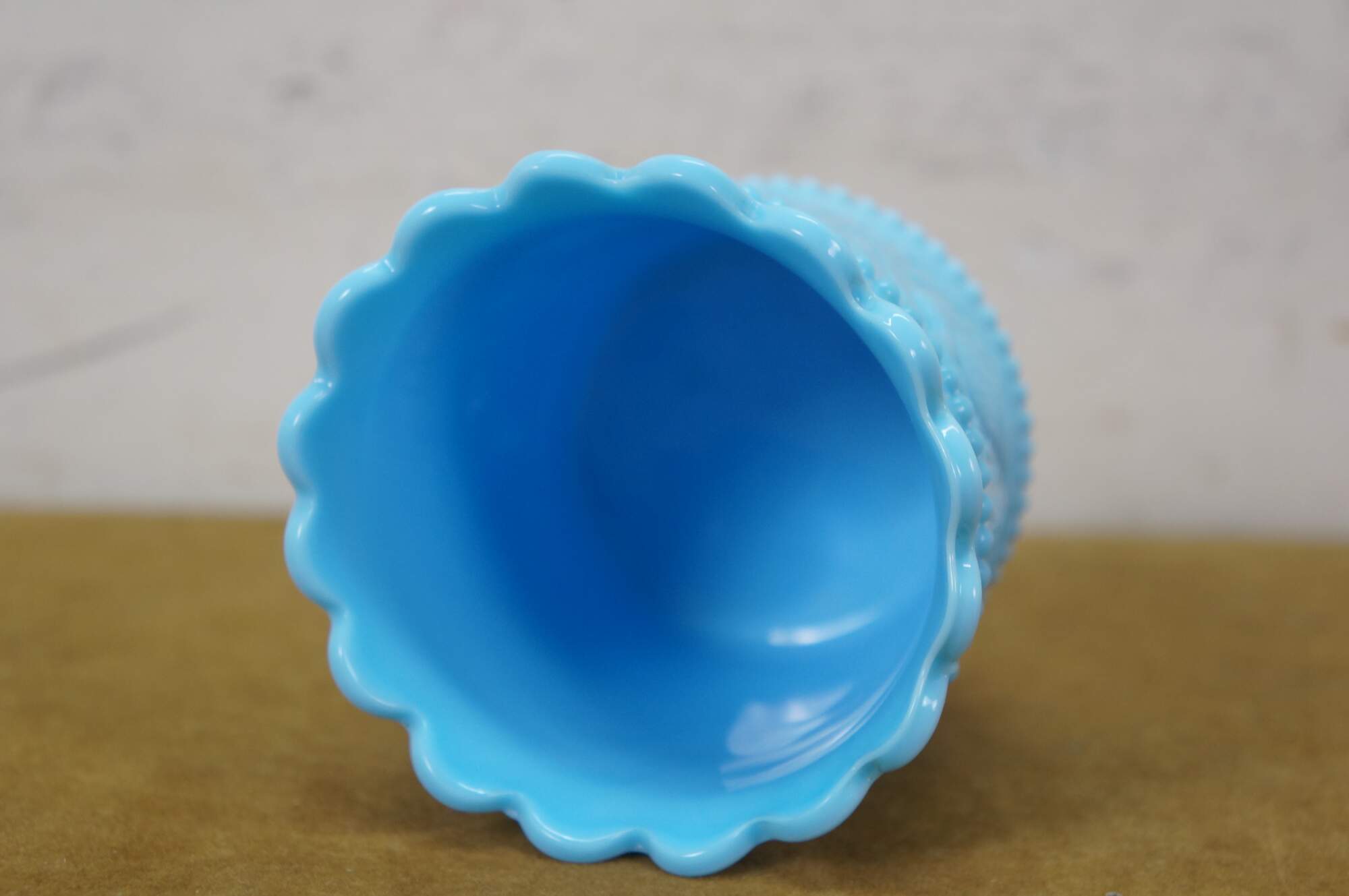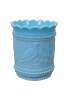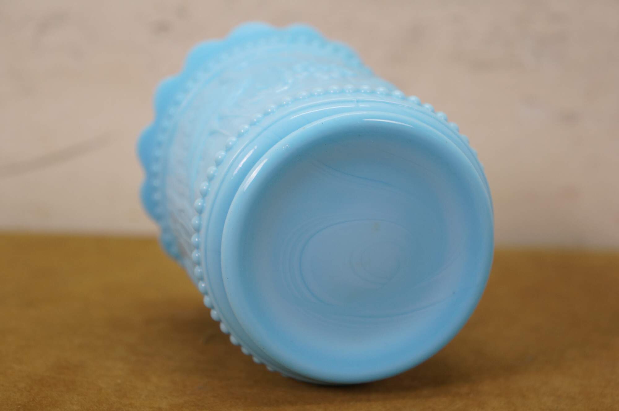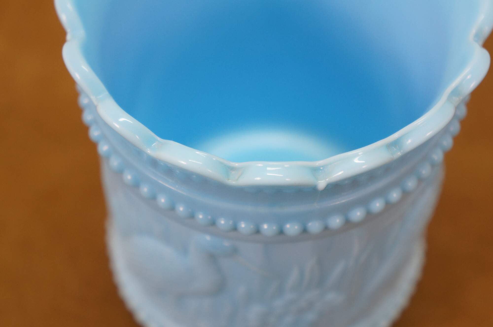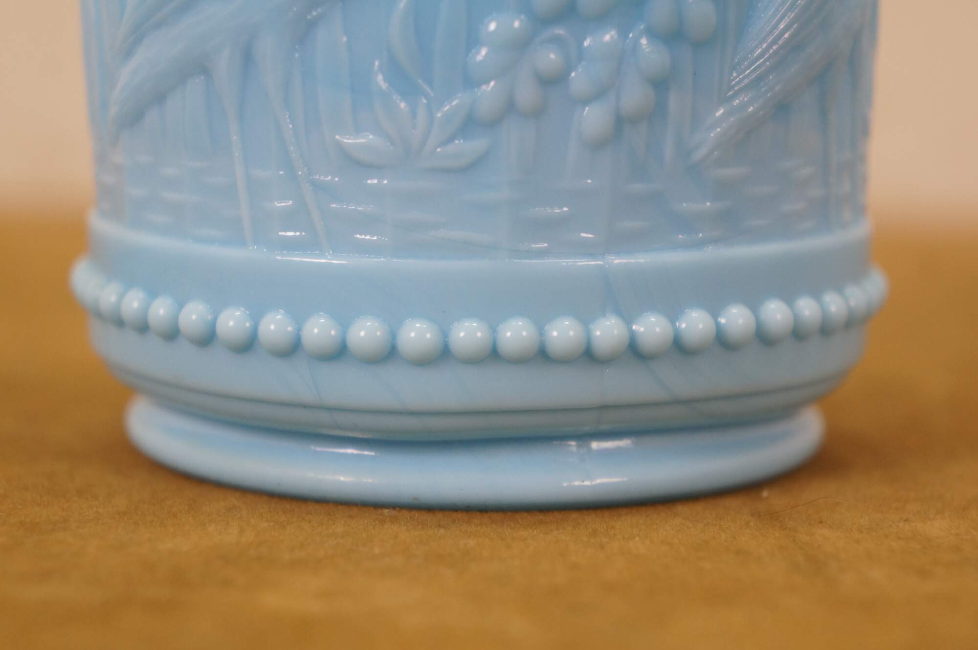 Antique LG Wright Stork in Rushes turquoise blue ruffled milk glass vase / canister jar / tumbler.