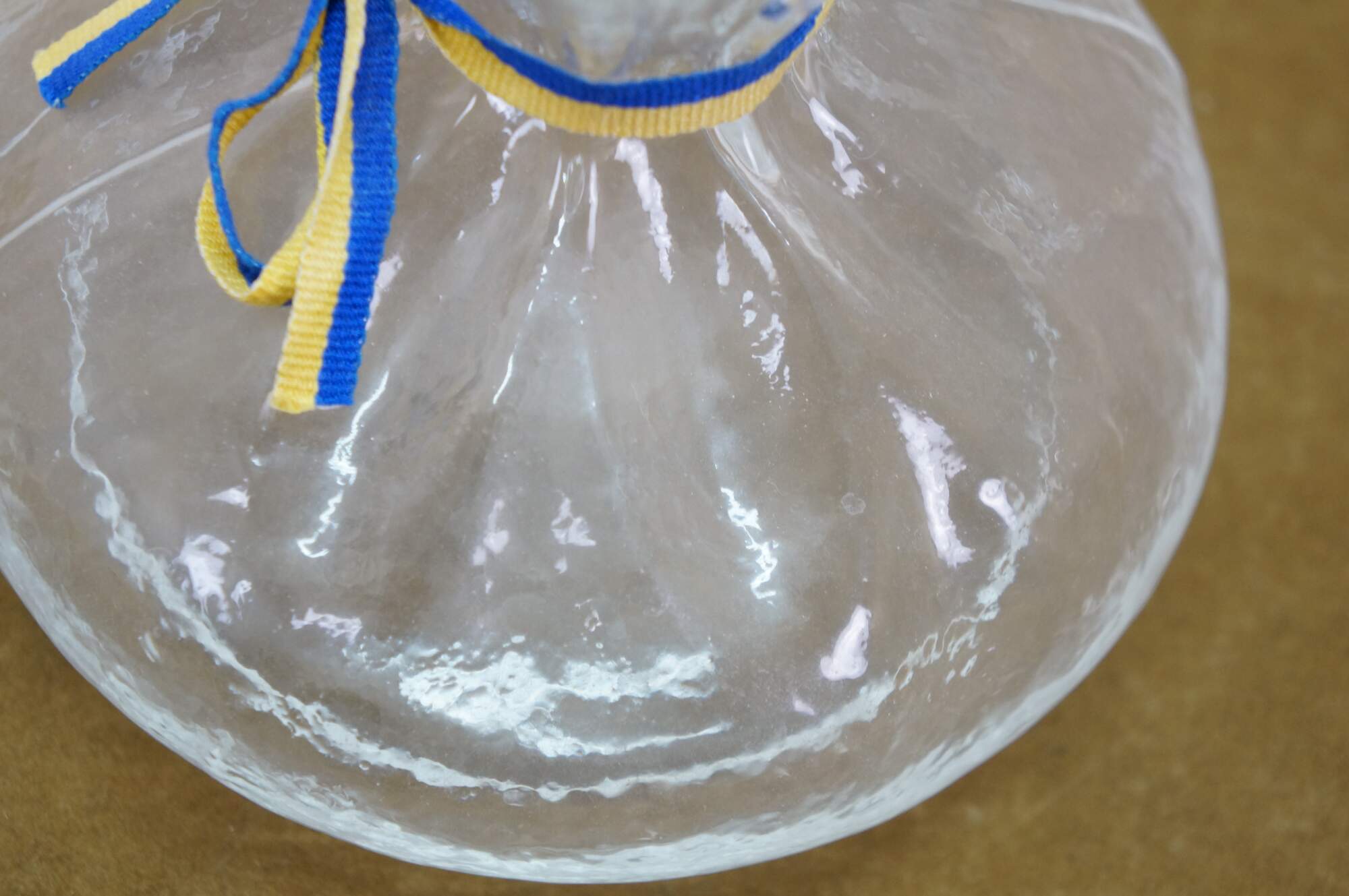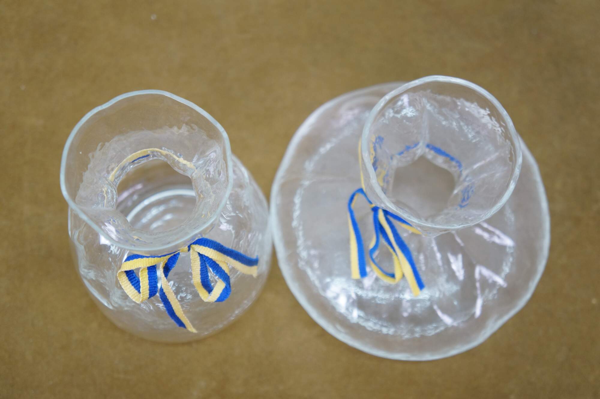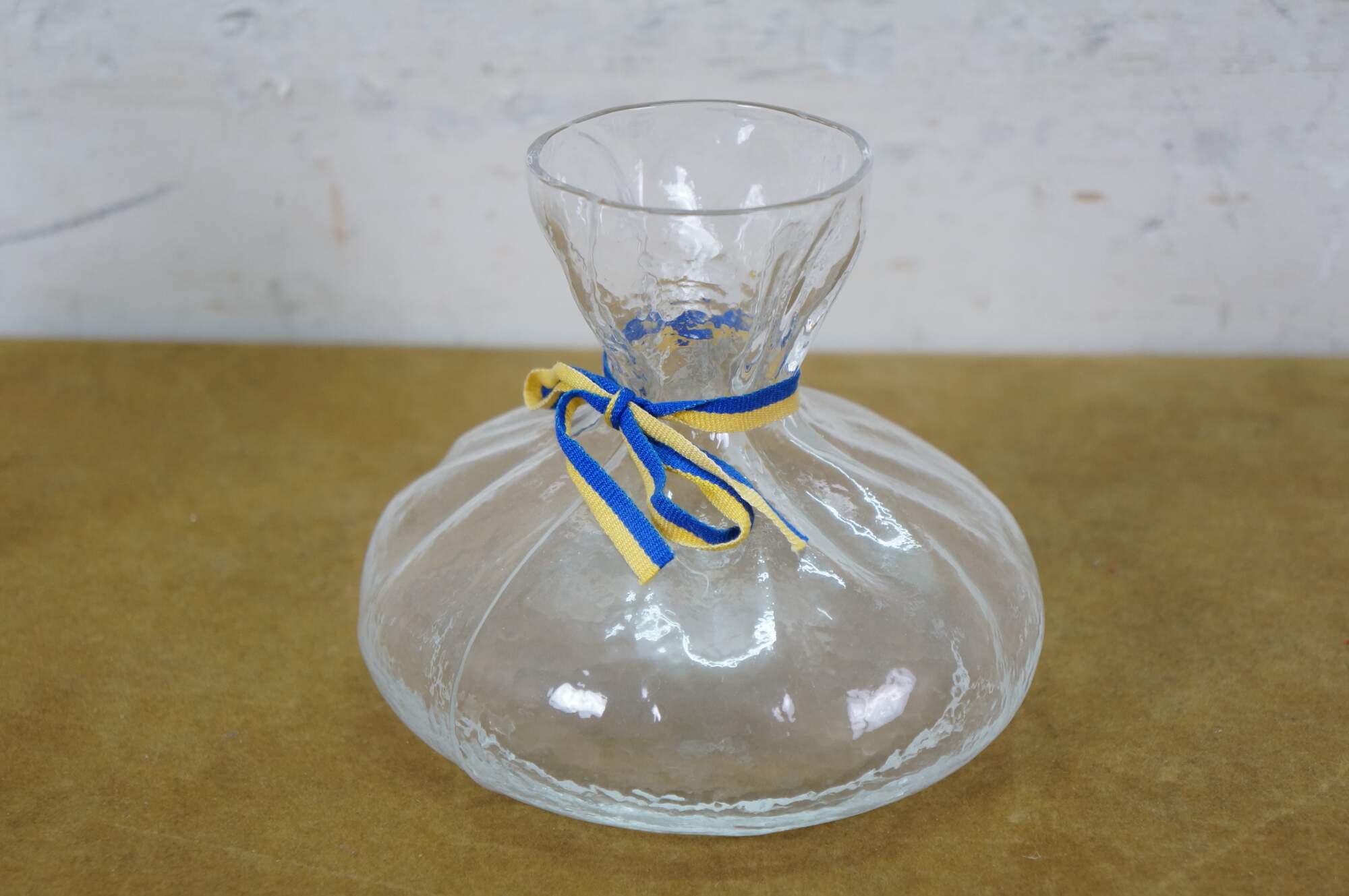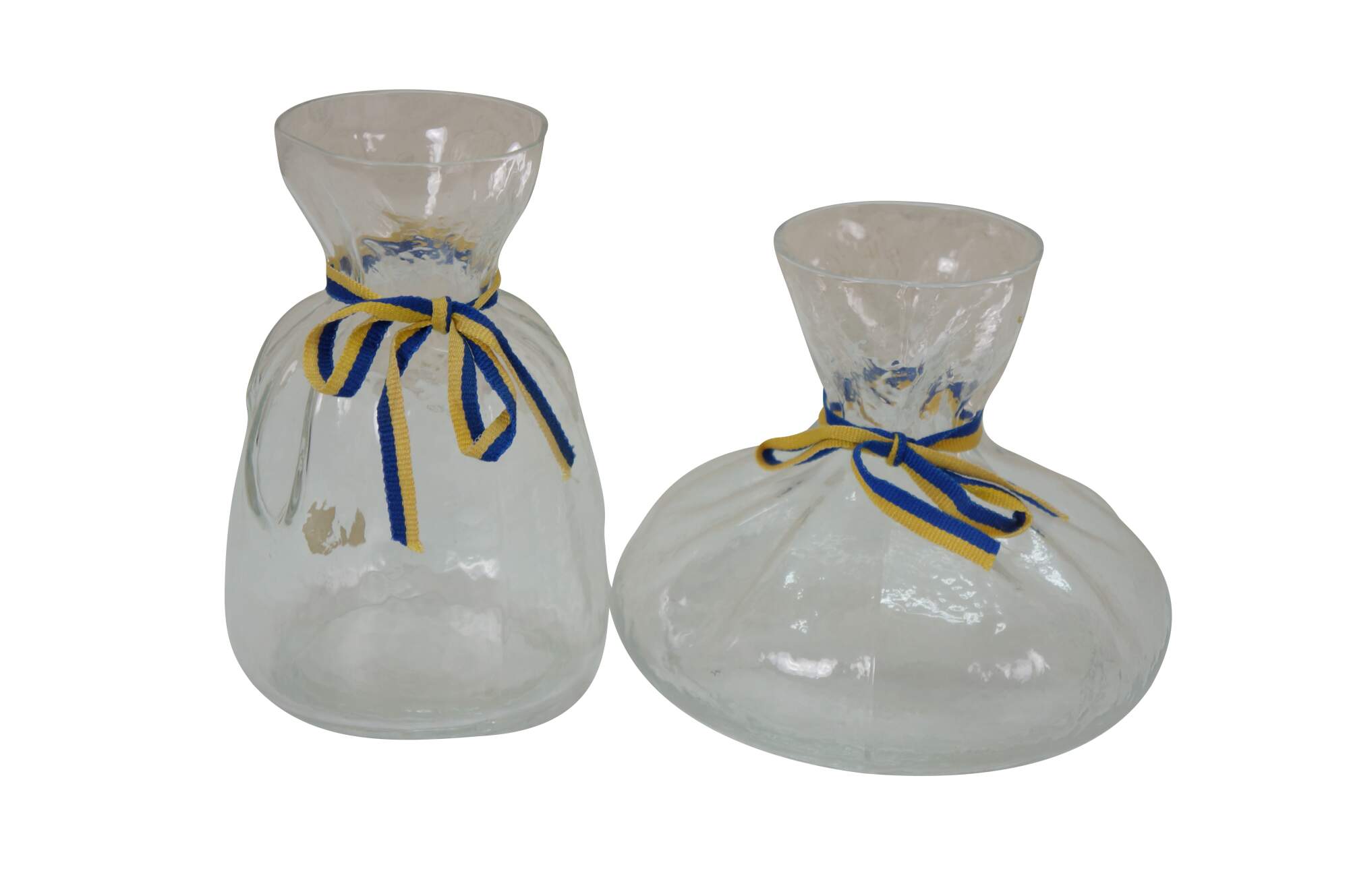 Two vintage Kosta Boda Sea of Sweden Blomknyte / Glasbruk Rune Strand cinch bag bud vases with ribbon.