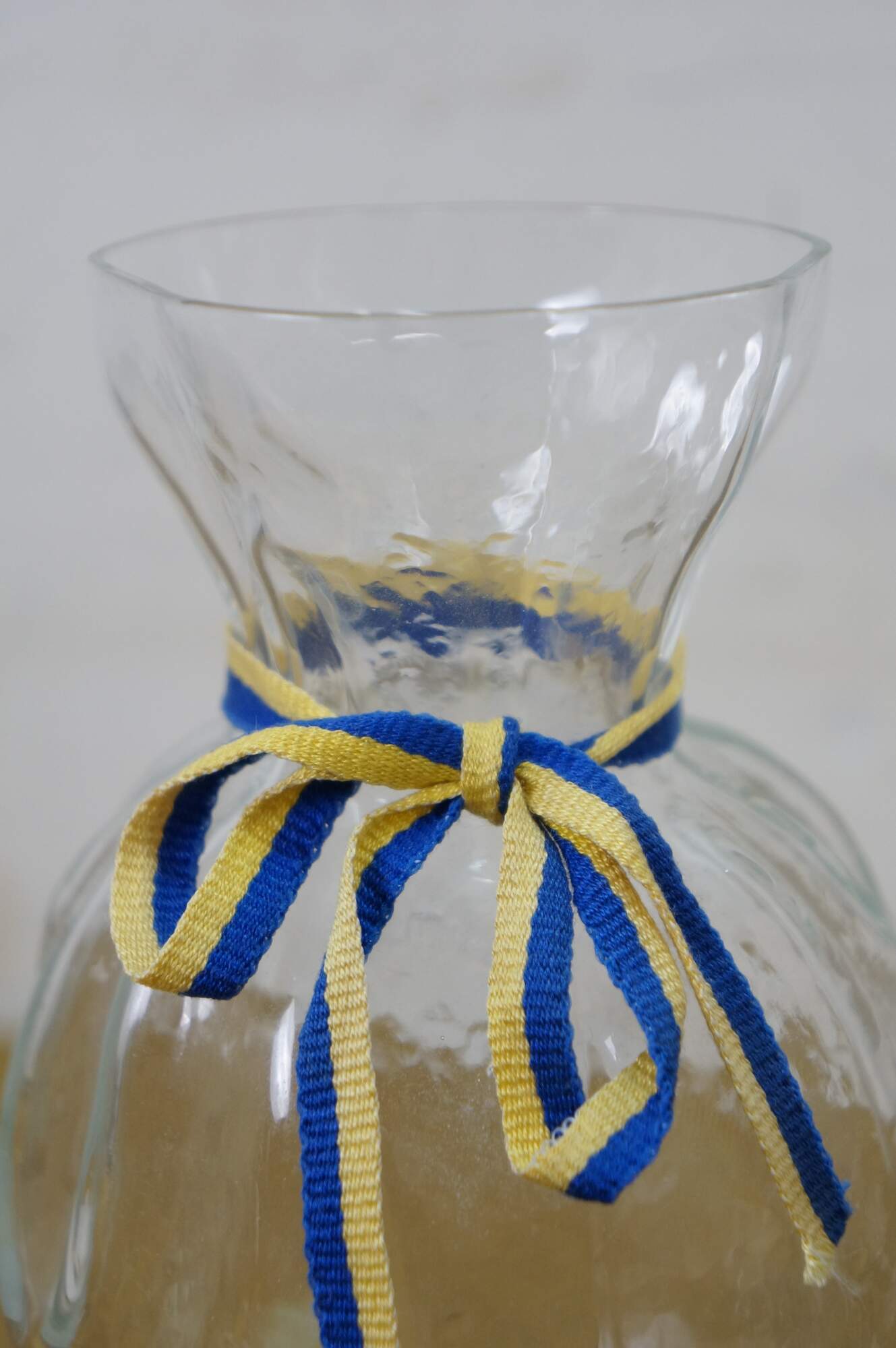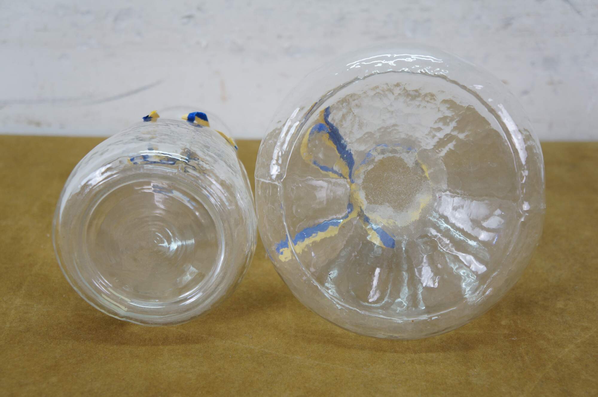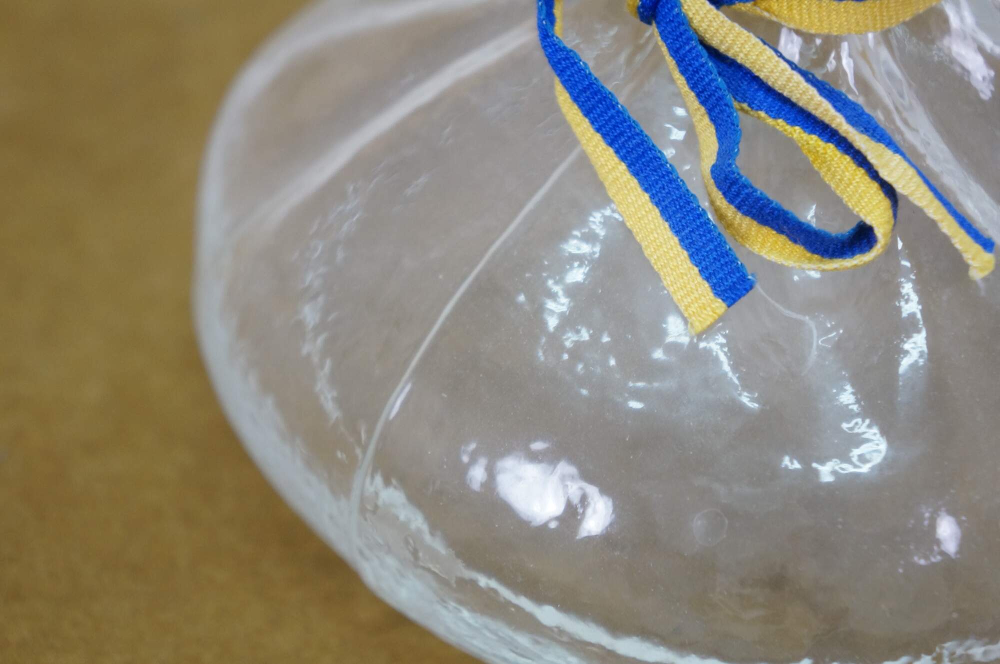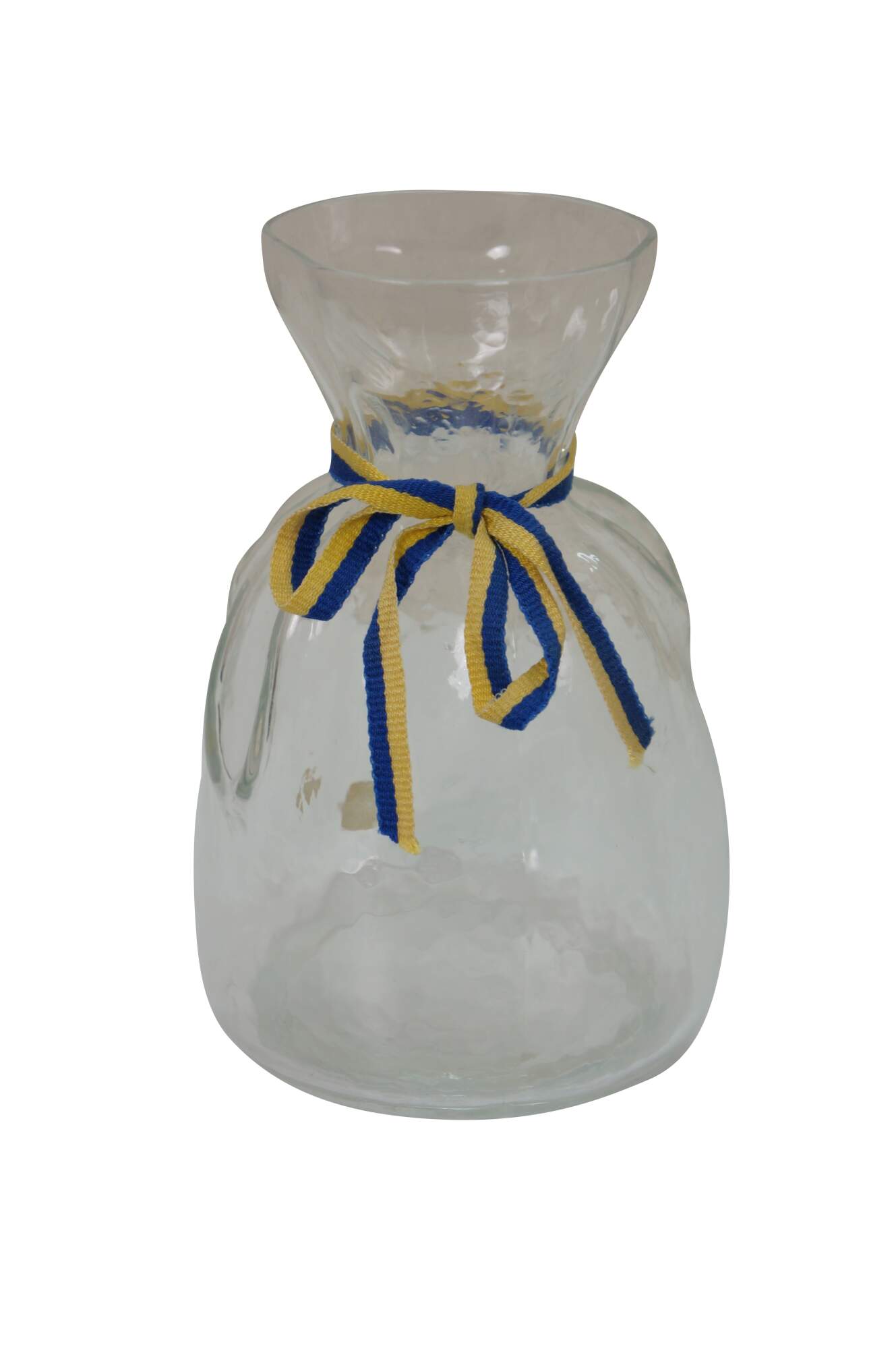 Two vintage Kosta Boda Sea of Sweden Blomknyte / Glasbruk Rune Strand cinch bag bud vases with ribbon.