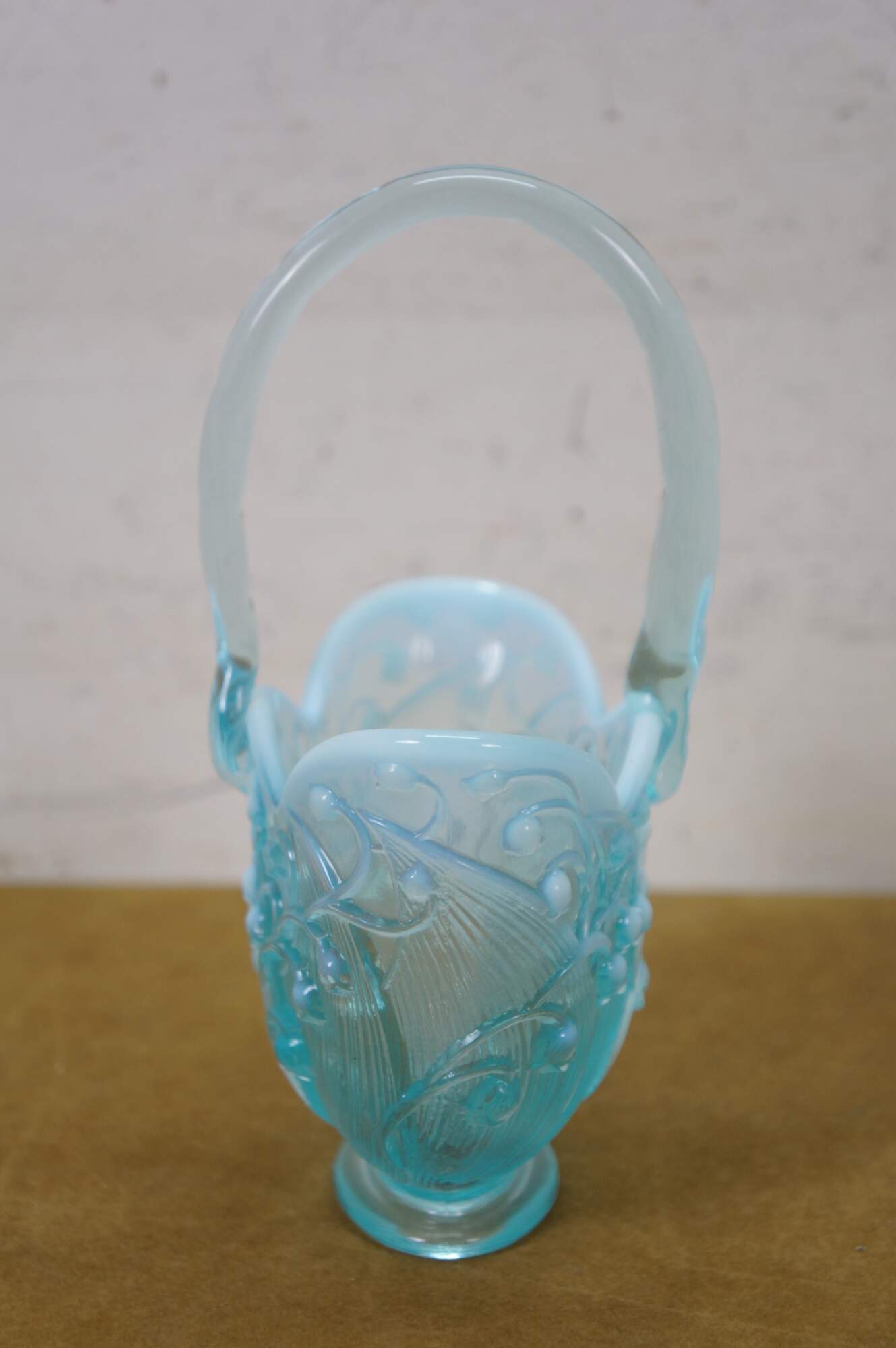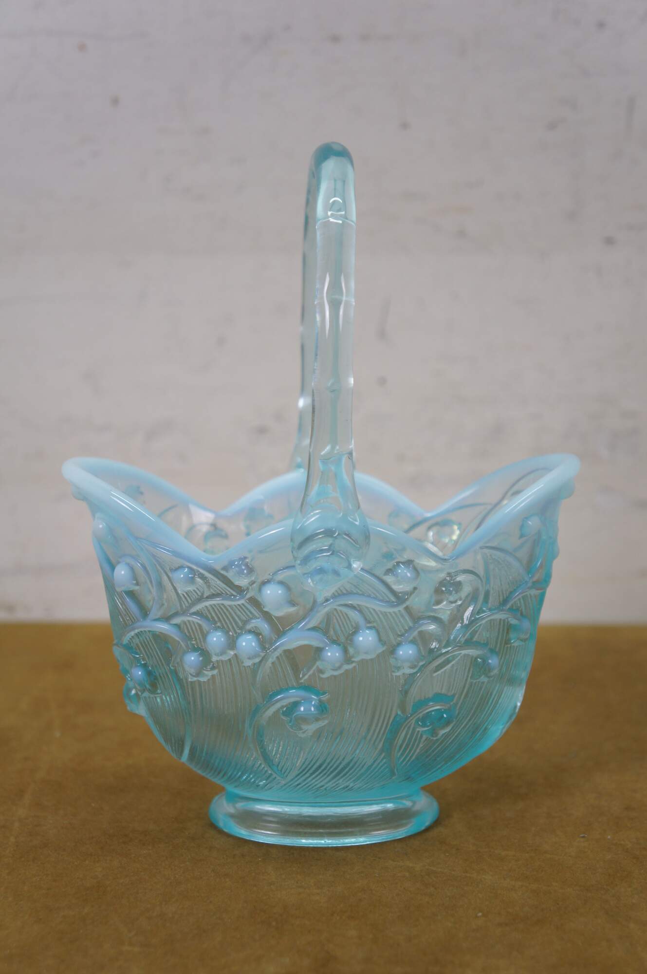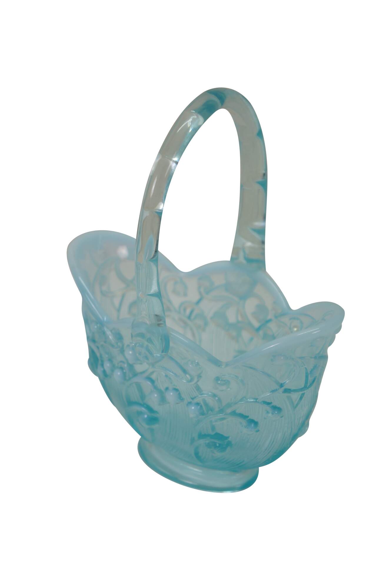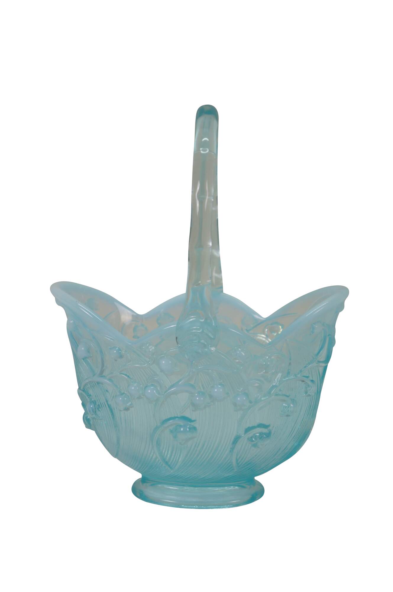 Vintage Fenton aqua blue opalescent Lily of the Valley compote basket bowl.