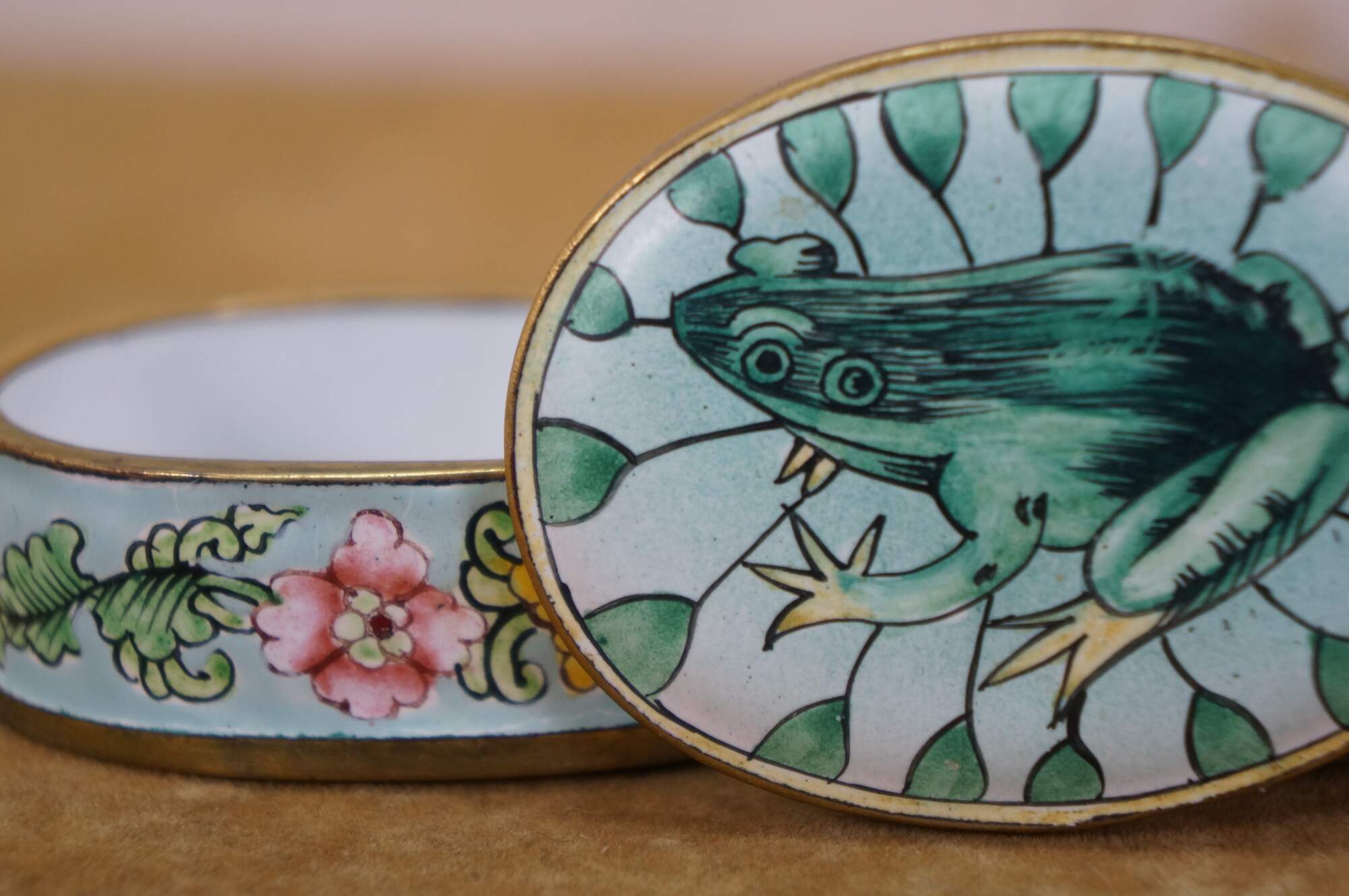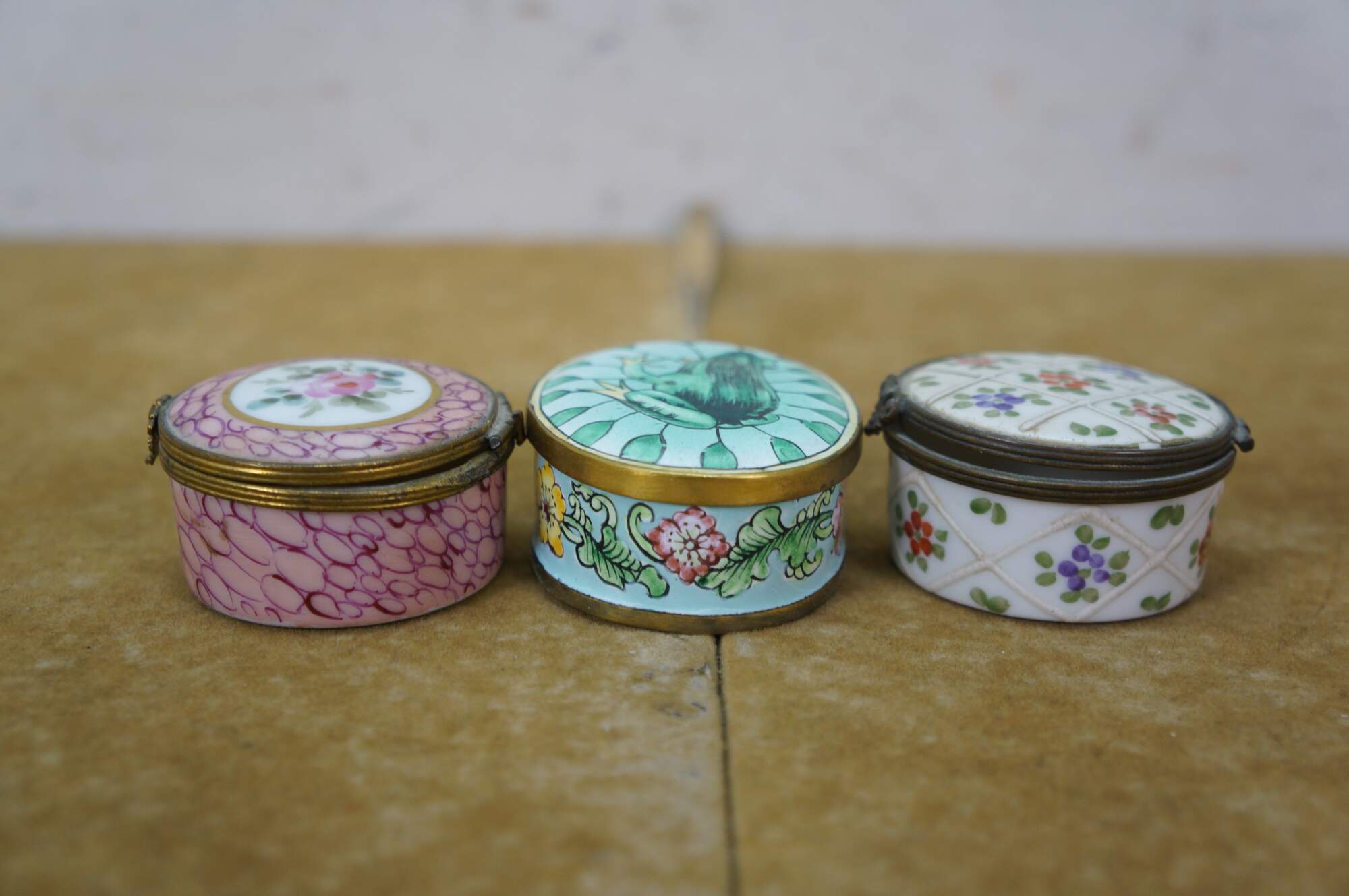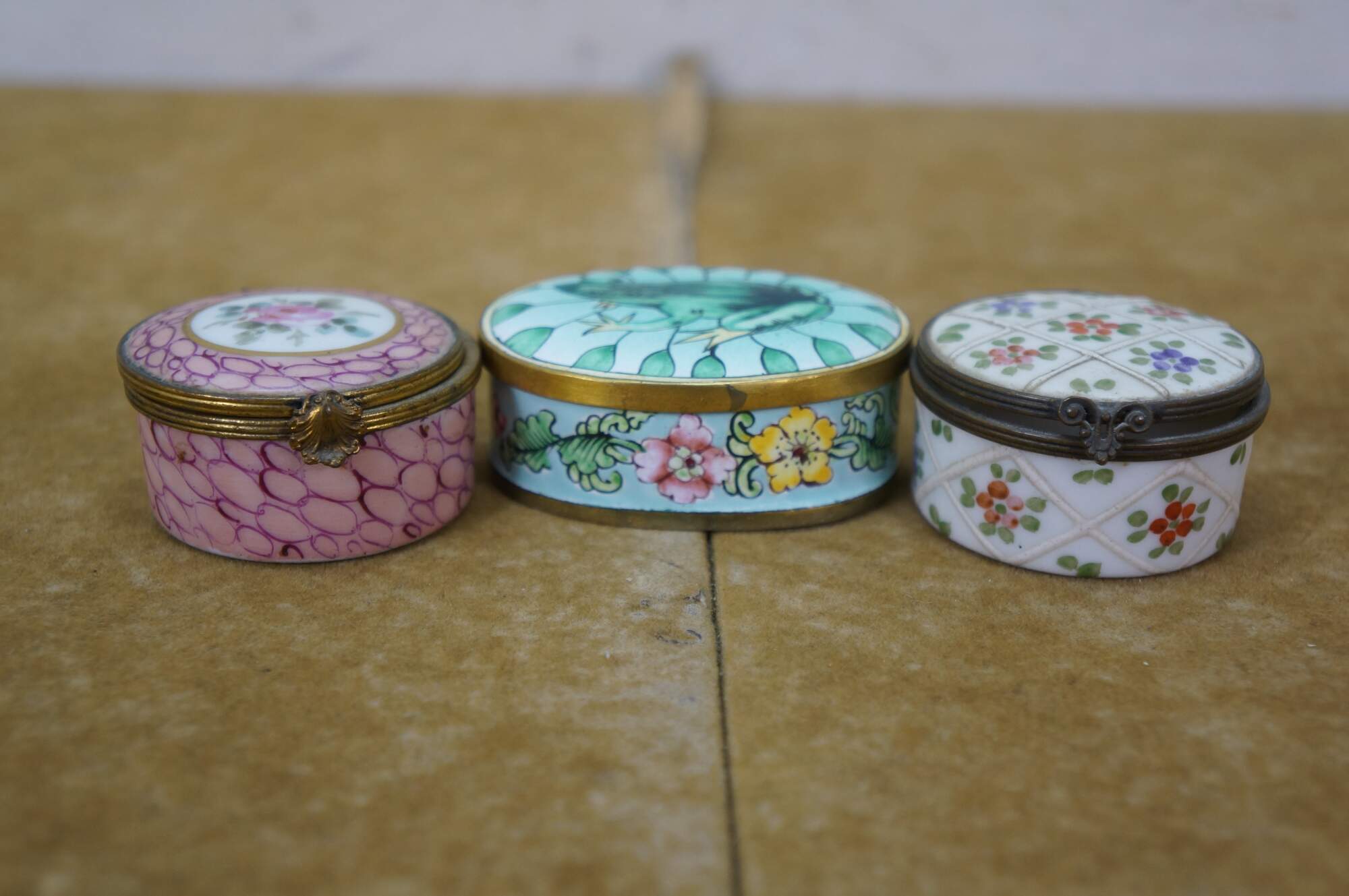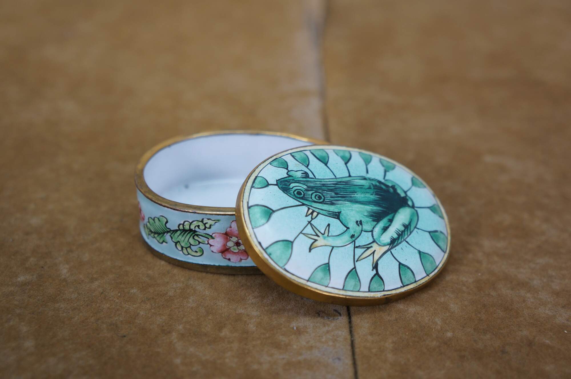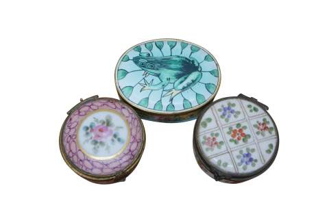 Vintage and antique enameled trinket boxes, including two floral made in France, and one frog on a lily pad design.