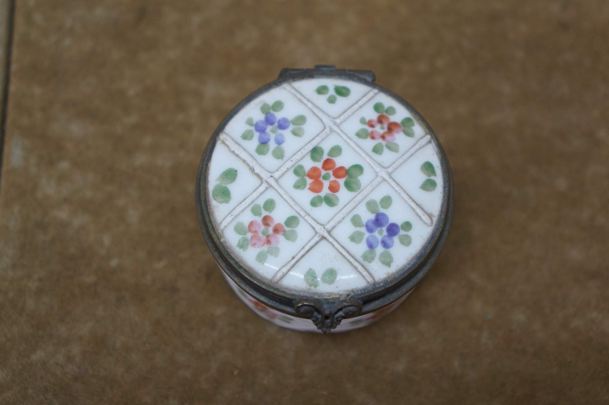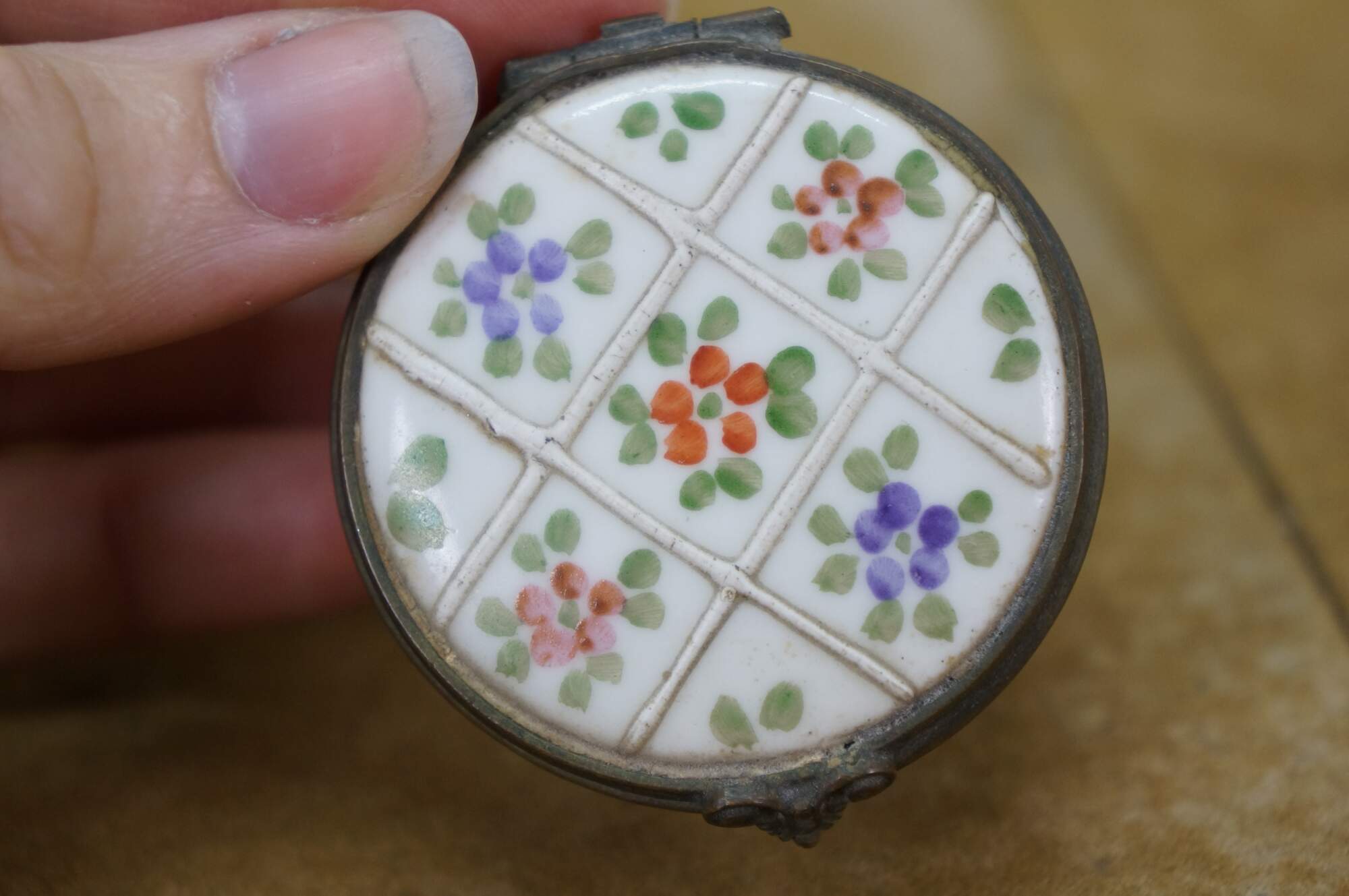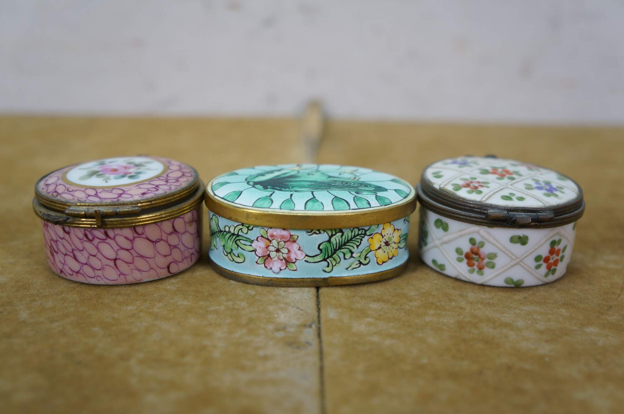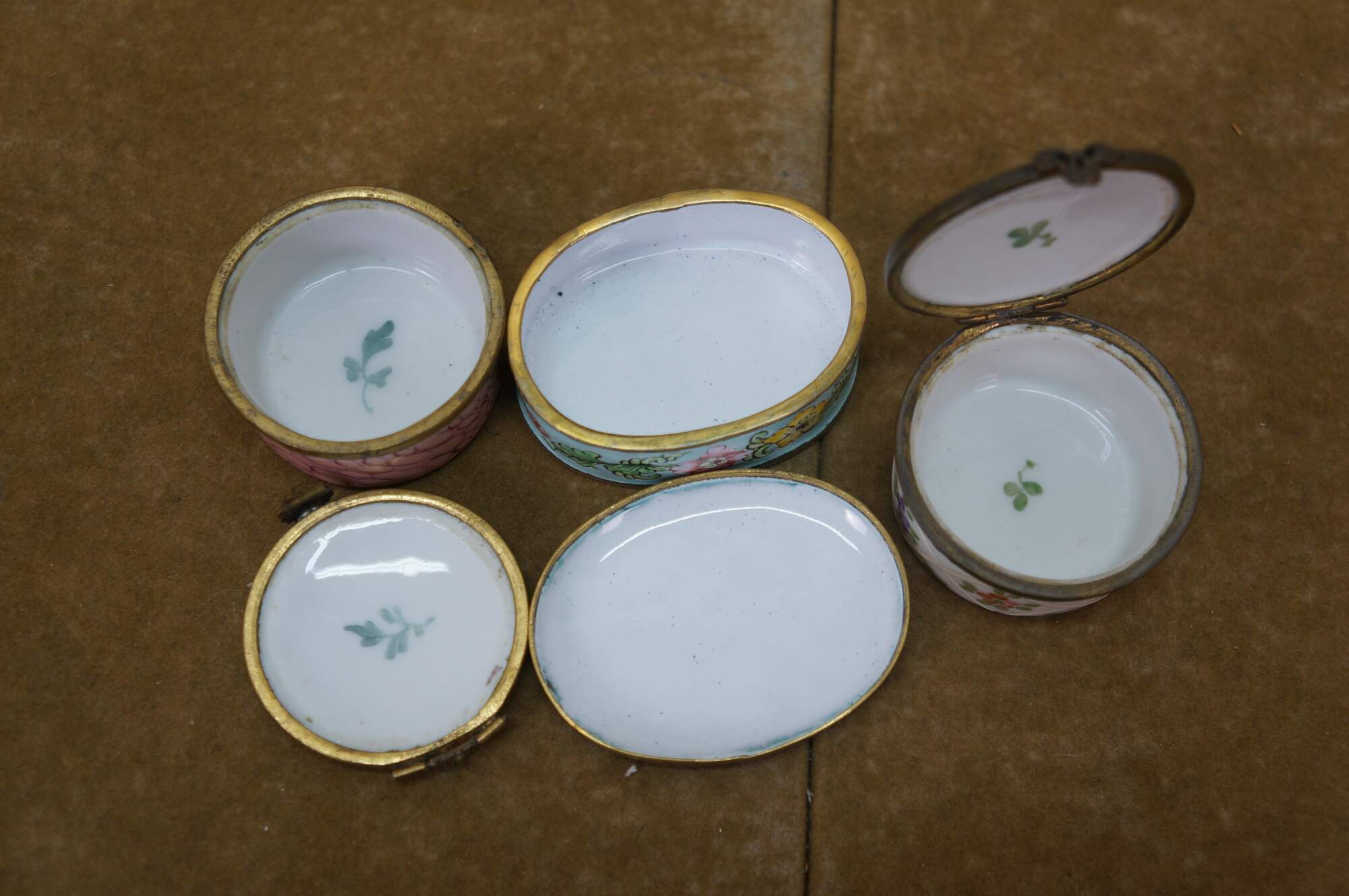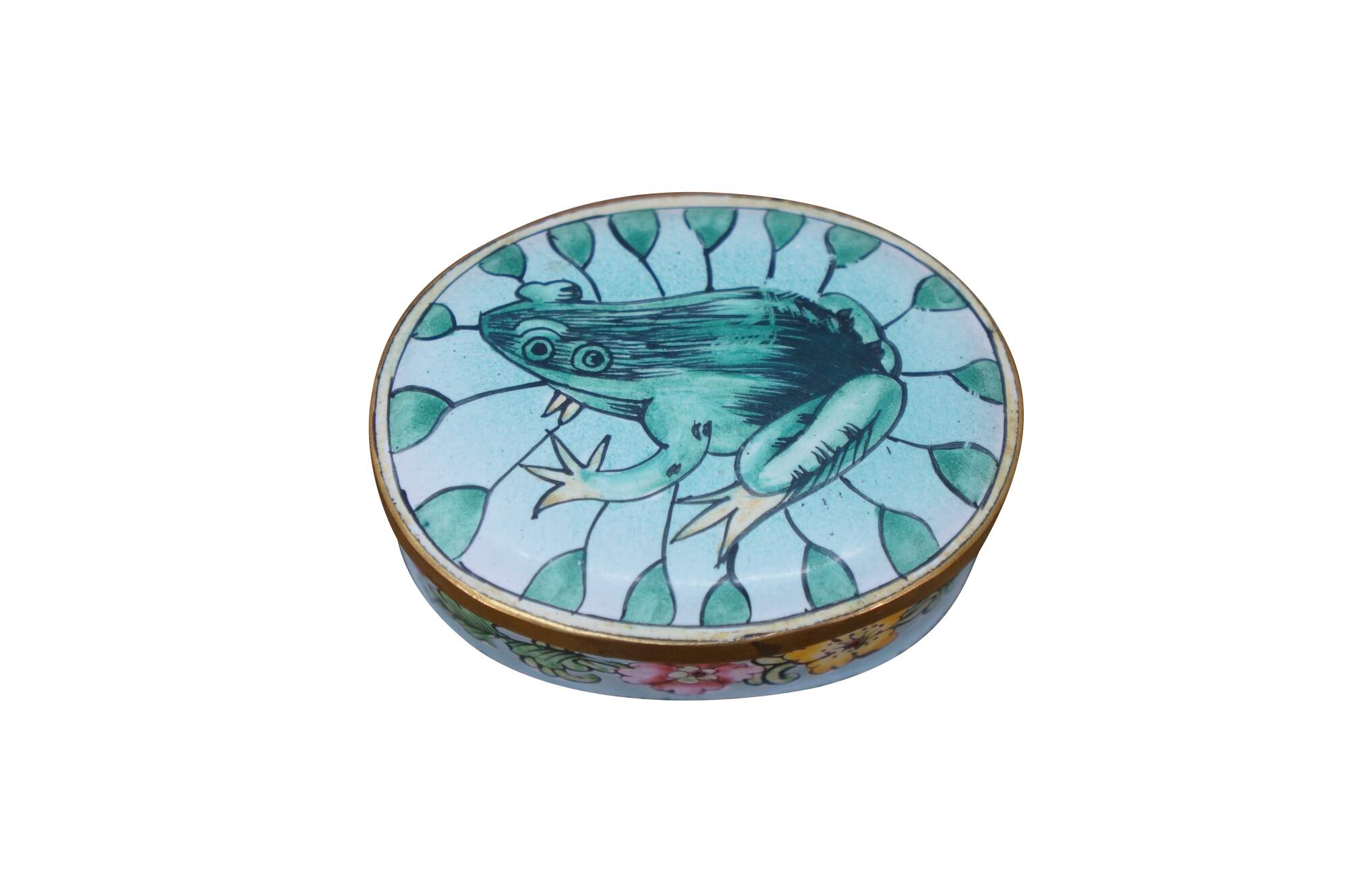 Vintage and antique enameled trinket boxes, including two floral made in France, and one frog on a lily pad design.