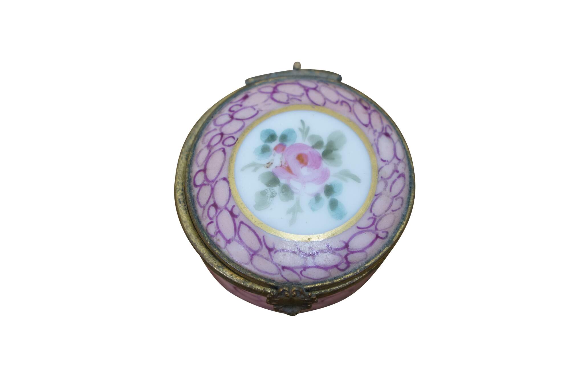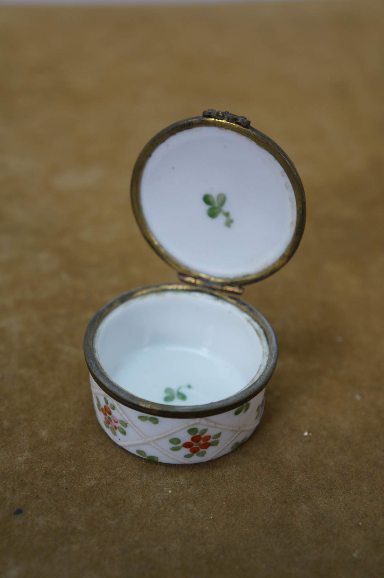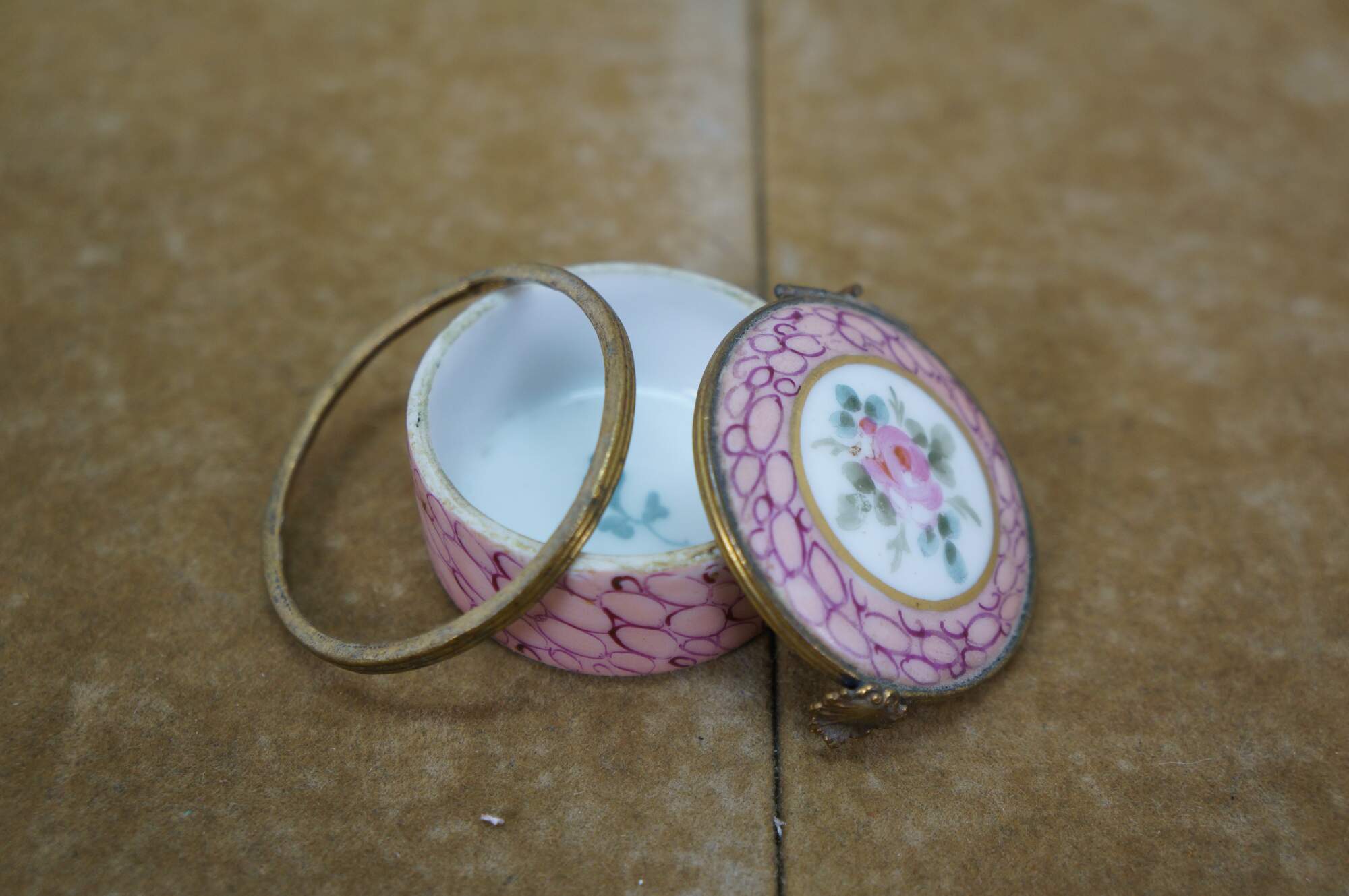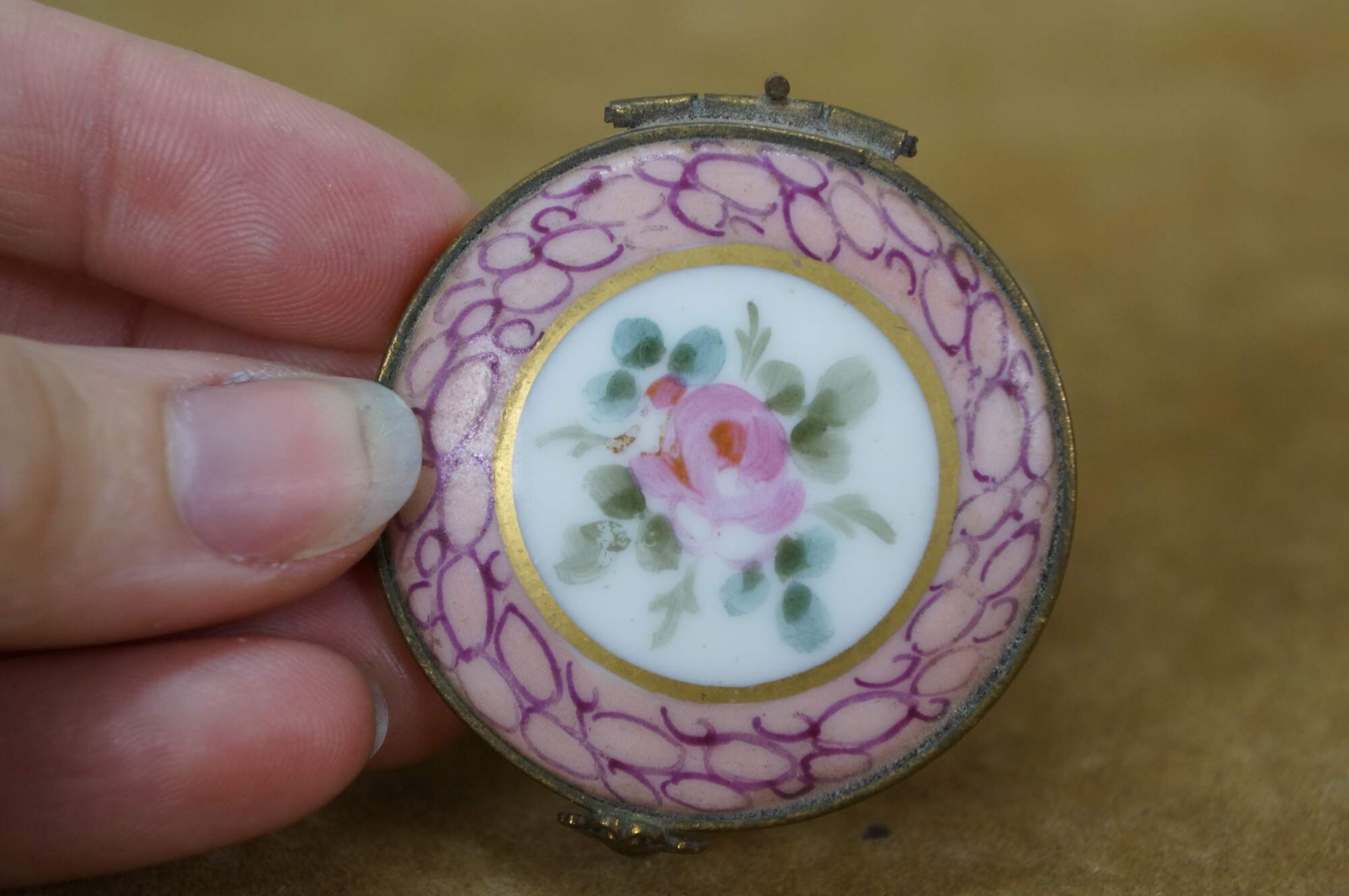 Vintage and antique enameled trinket boxes, including two floral made in France, and one frog on a lily pad design.