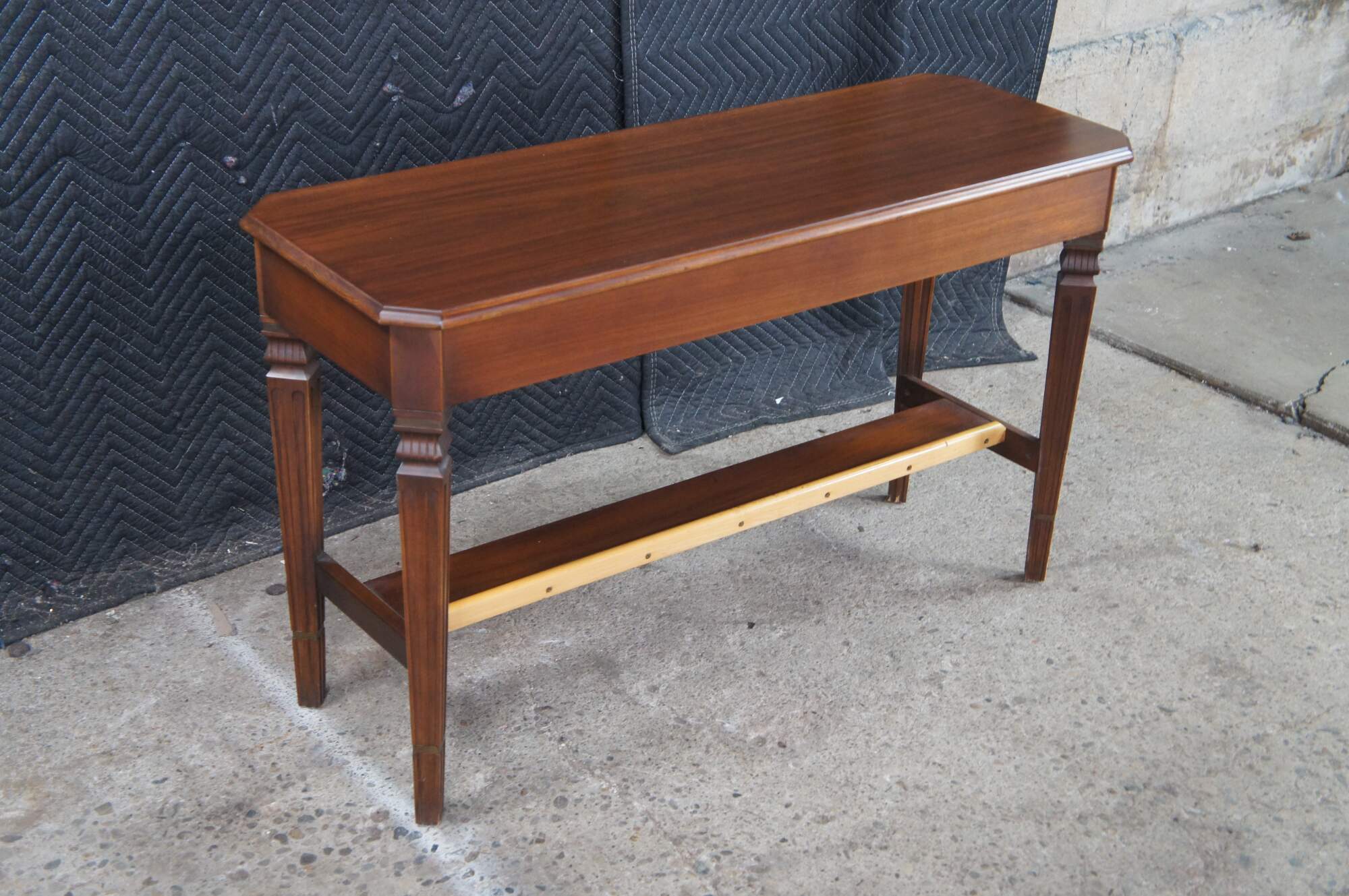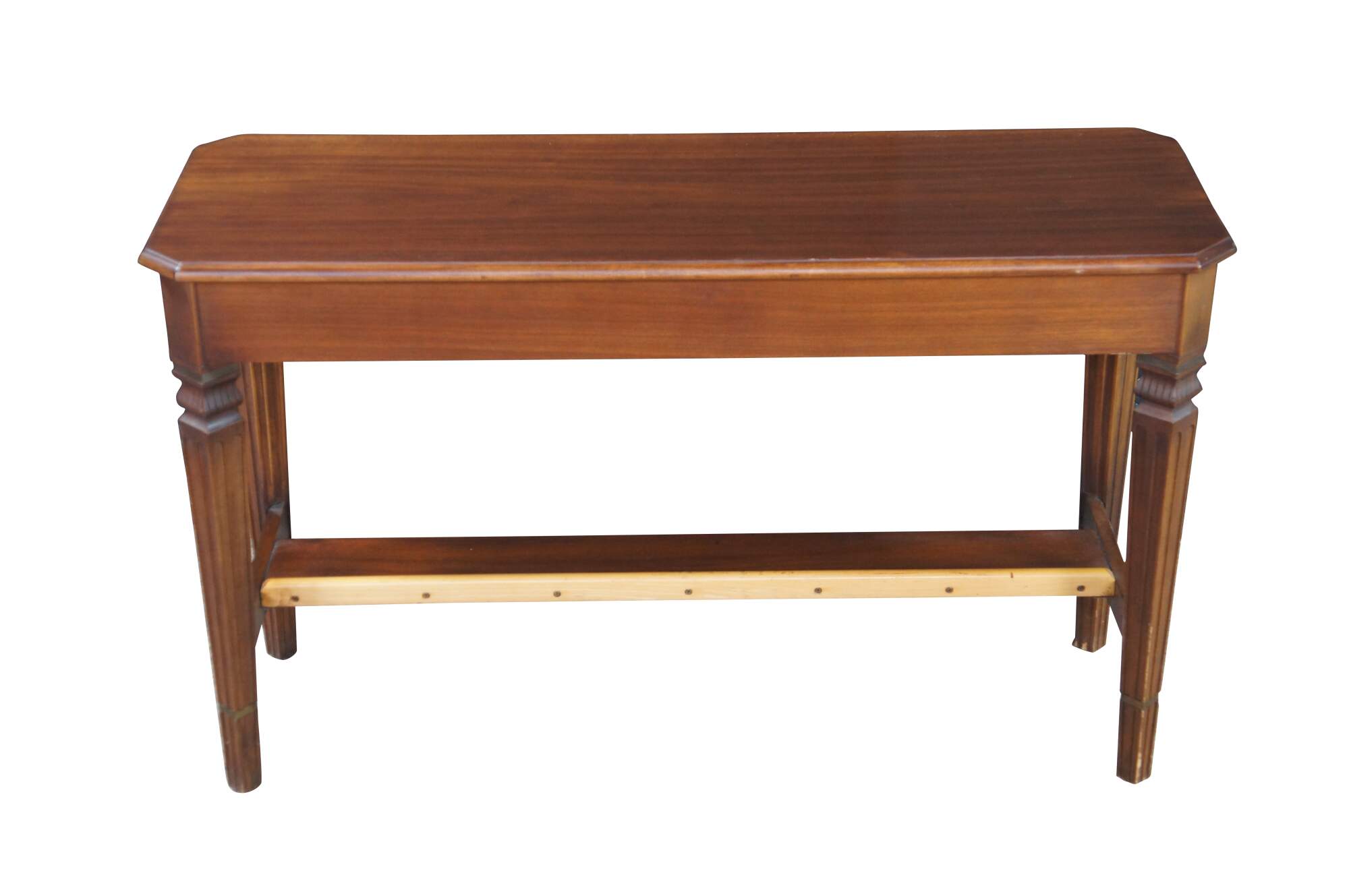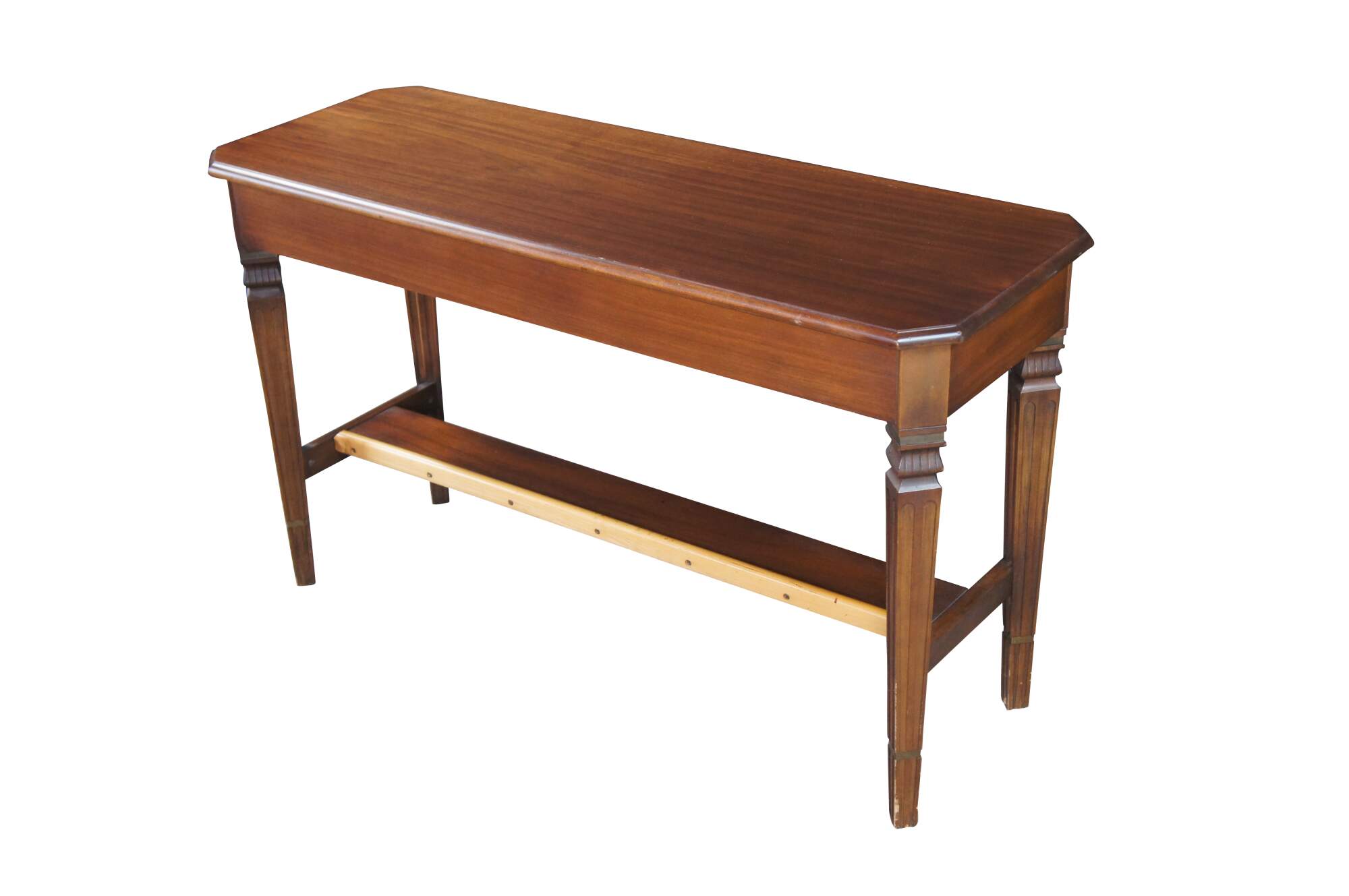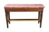 Mid 20th Century Italian Provincial Piano / Organ Bench. Features a rectangular form made from walnut with canted corners. Upper lid lifts via hinge for sheet music and accessory storage. The bench is supported by square tapered fluted legs connected by a trestle support. Trestle support has an added trim along the front for your feet to rest while sitting. Includes a pink tufted cushion.