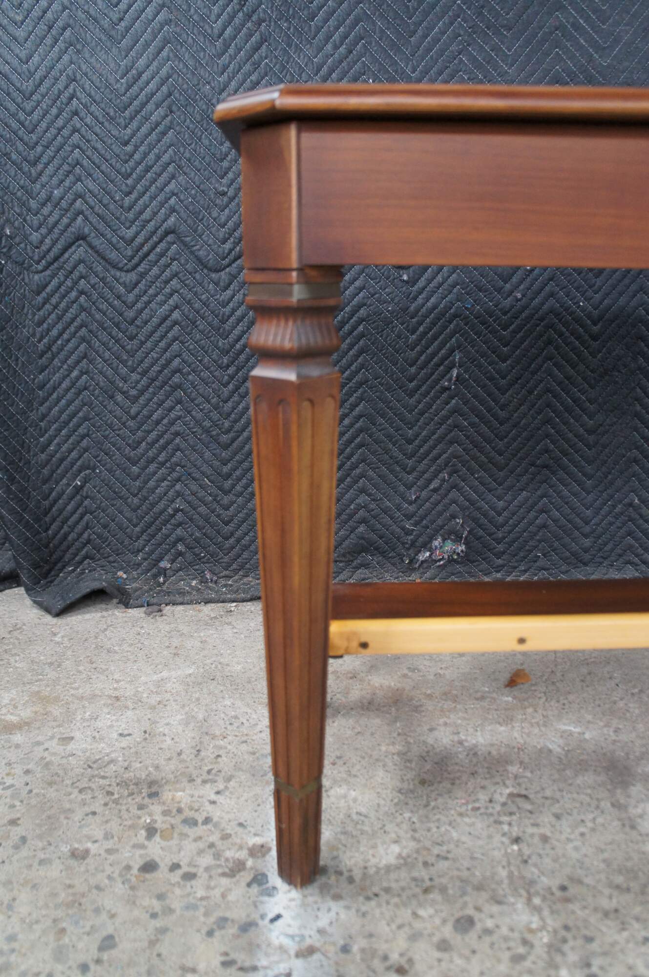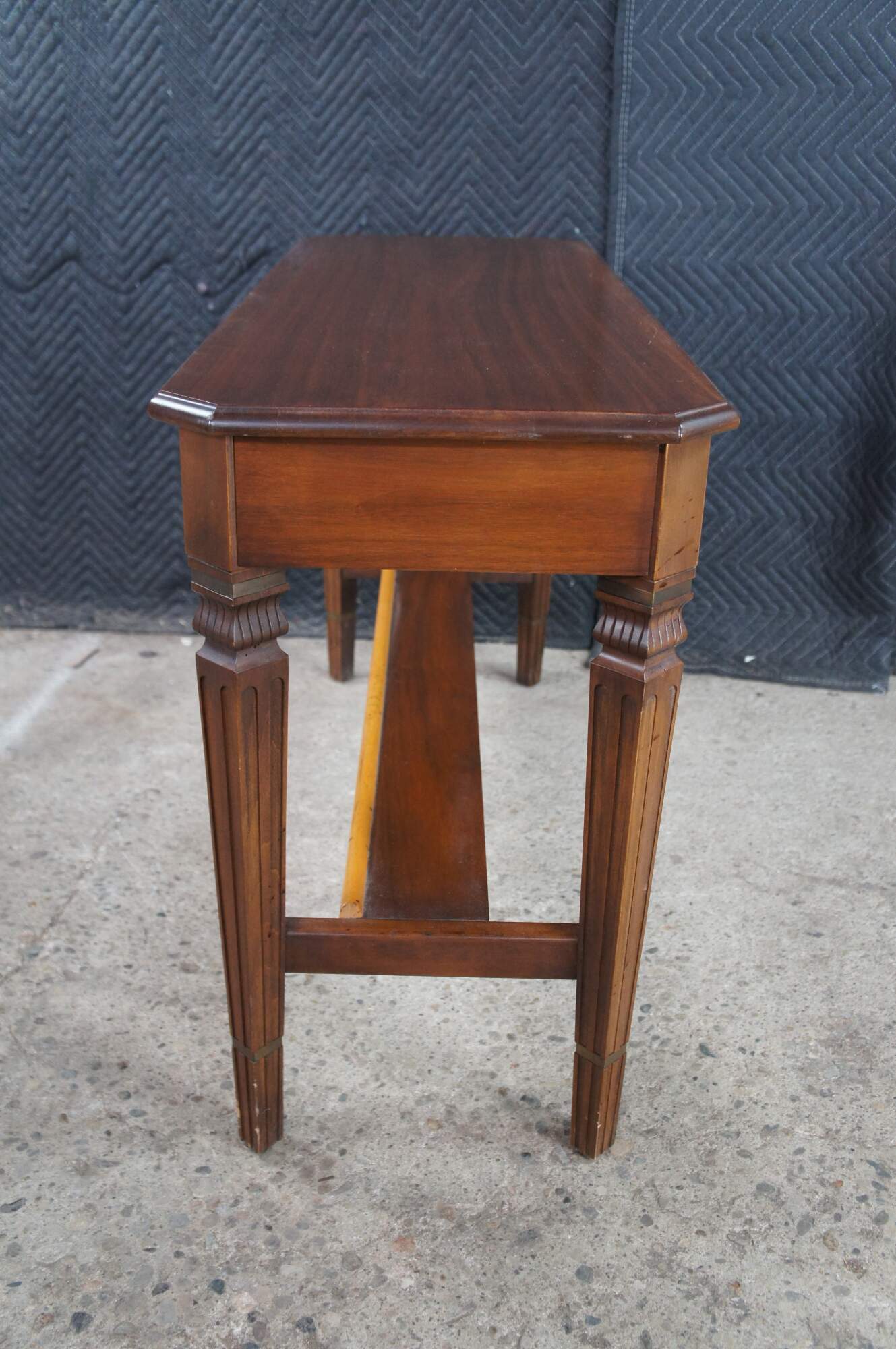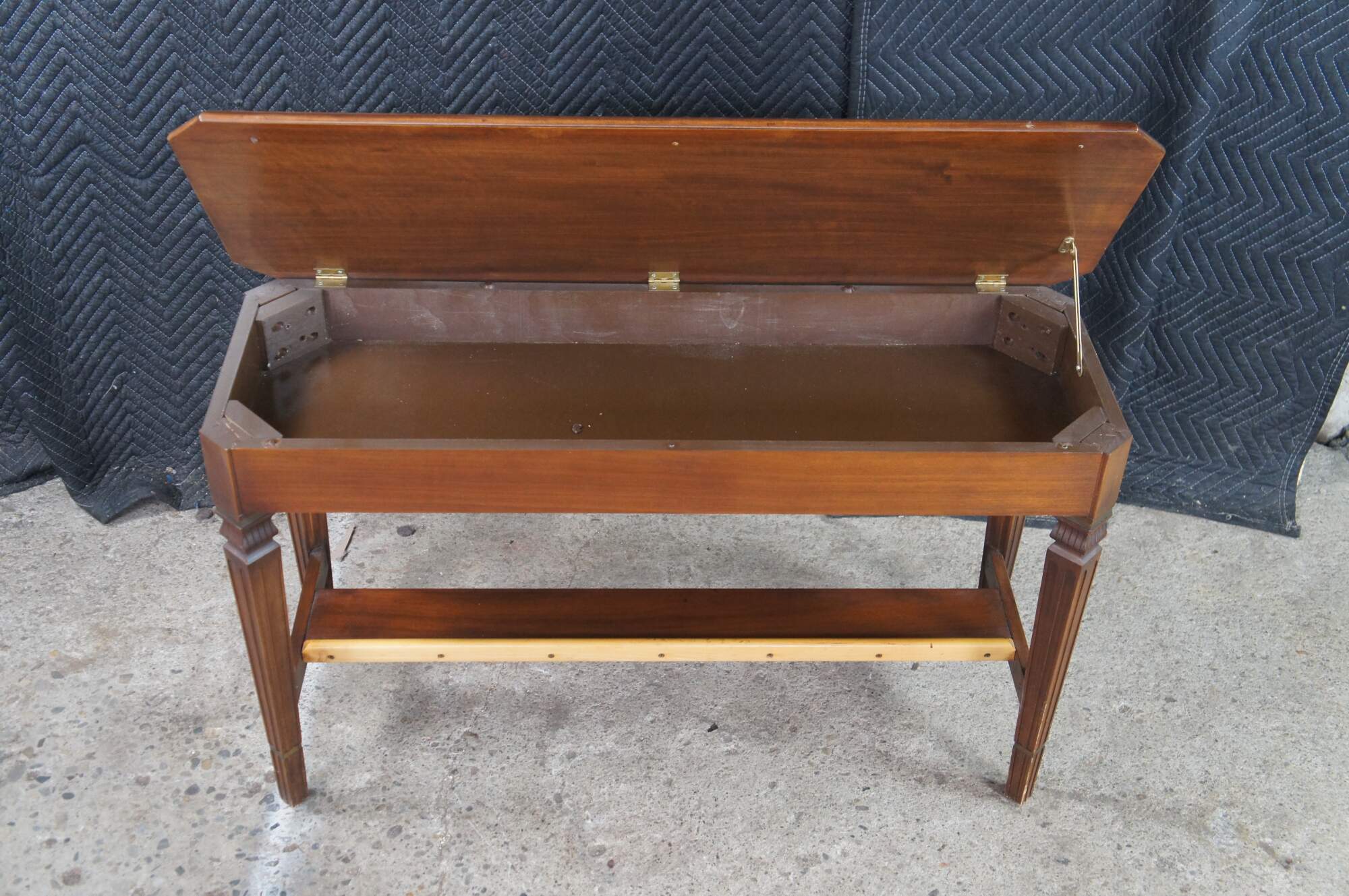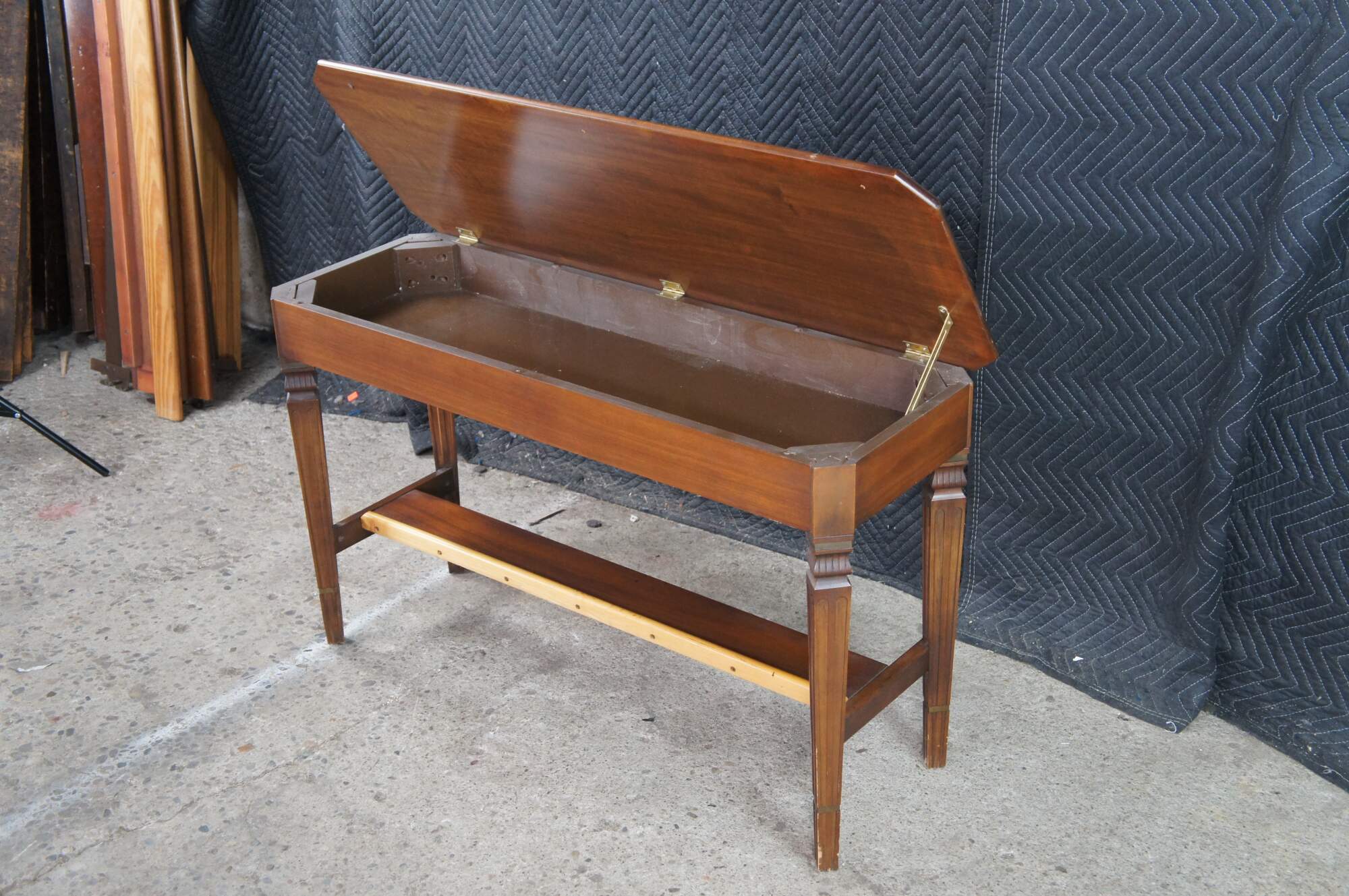 Mid 20th Century Italian Provincial Piano / Organ Bench. Features a rectangular form made from walnut with canted corners. Upper lid lifts via hinge for sheet music and accessory storage. The bench is supported by square tapered fluted legs connected by a trestle support. Trestle support has an added trim along the front for your feet to rest while sitting. Includes a pink tufted cushion.