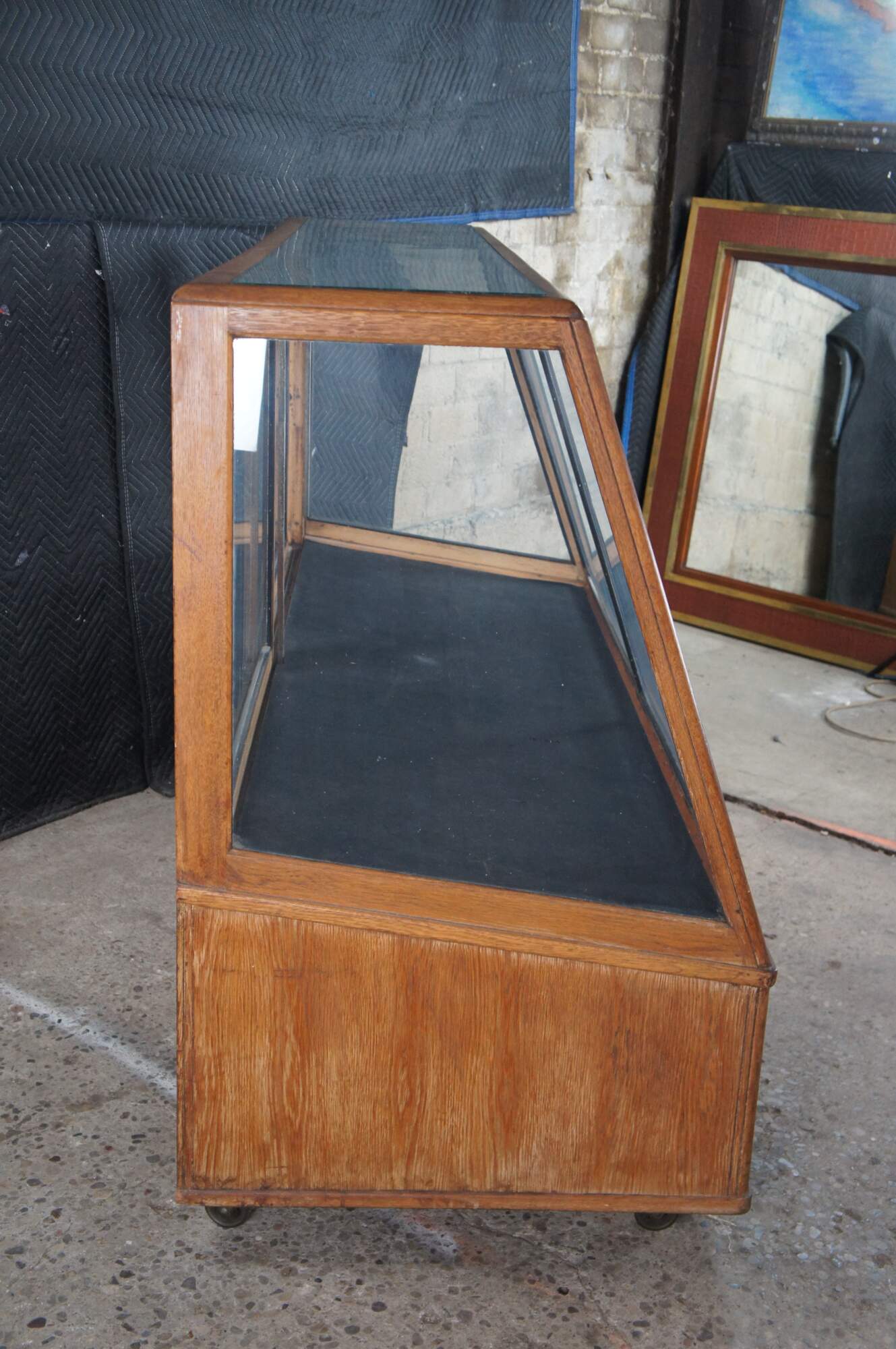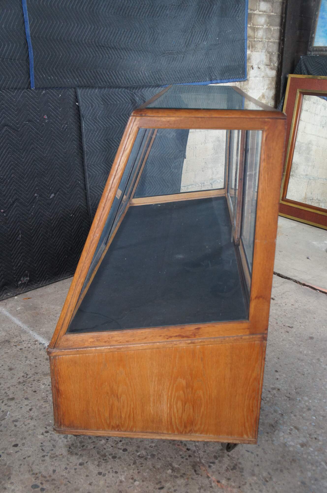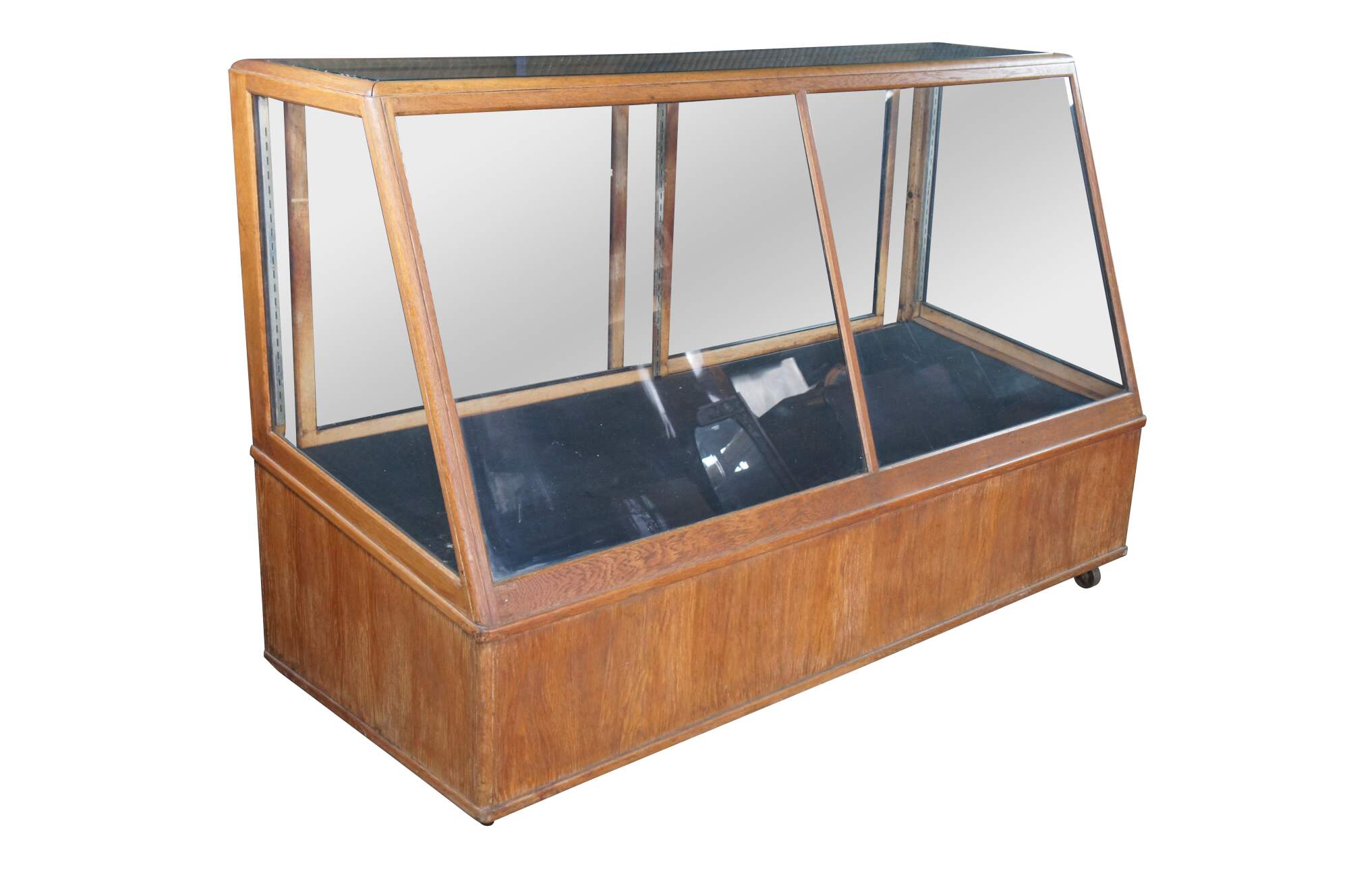An antique general storage showcase made by the Columbus Showcase Company of Columbus Ohio. Features a large rectangular frame made from oak and glass with slant front and rear sliding doors. Metal inserts along the inside allow for the addition of glass shelves. Backside features understorage The cabinet is on wheels for ease of movement.