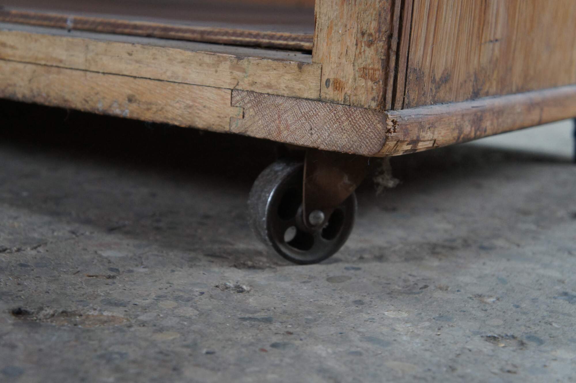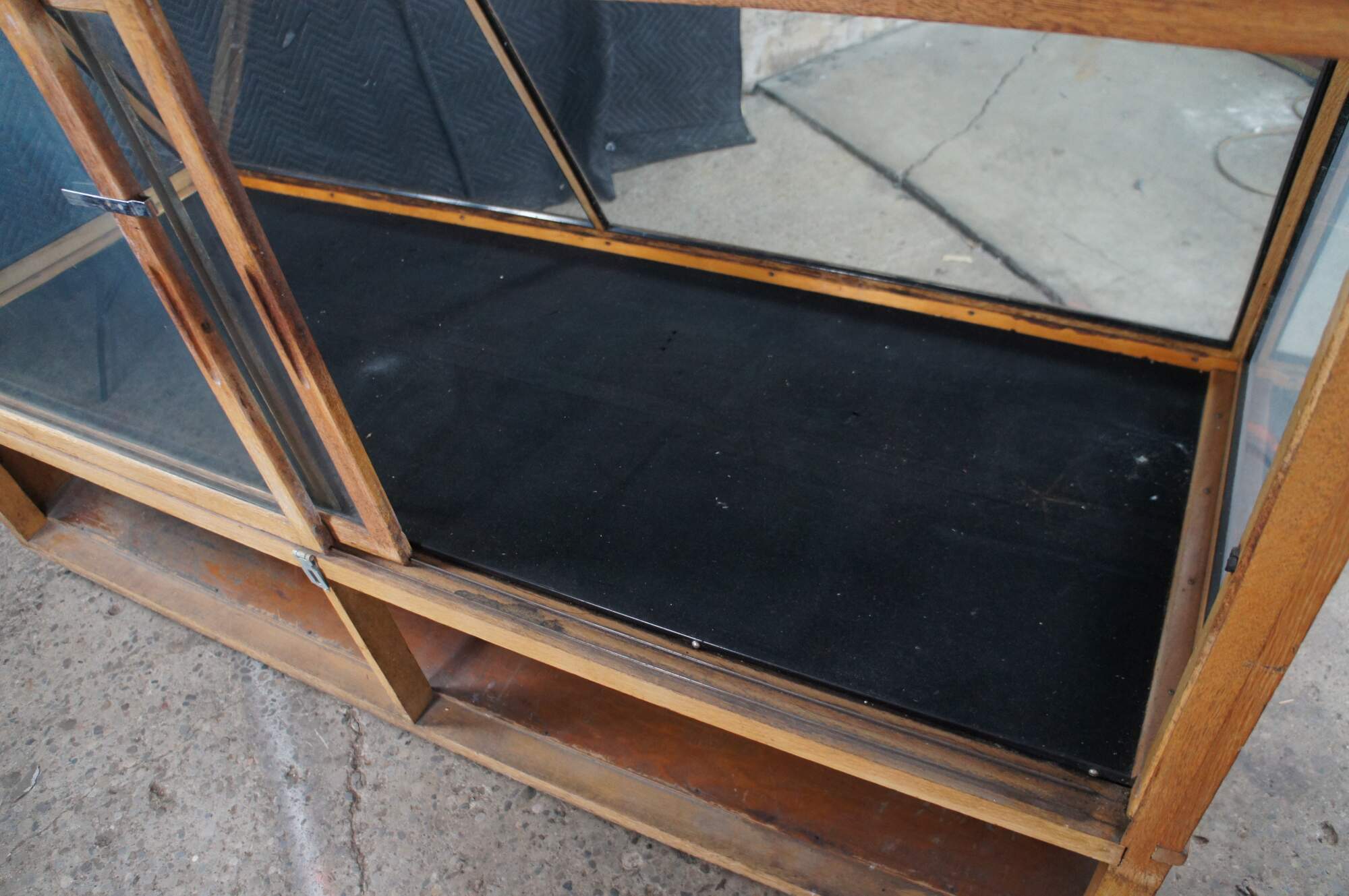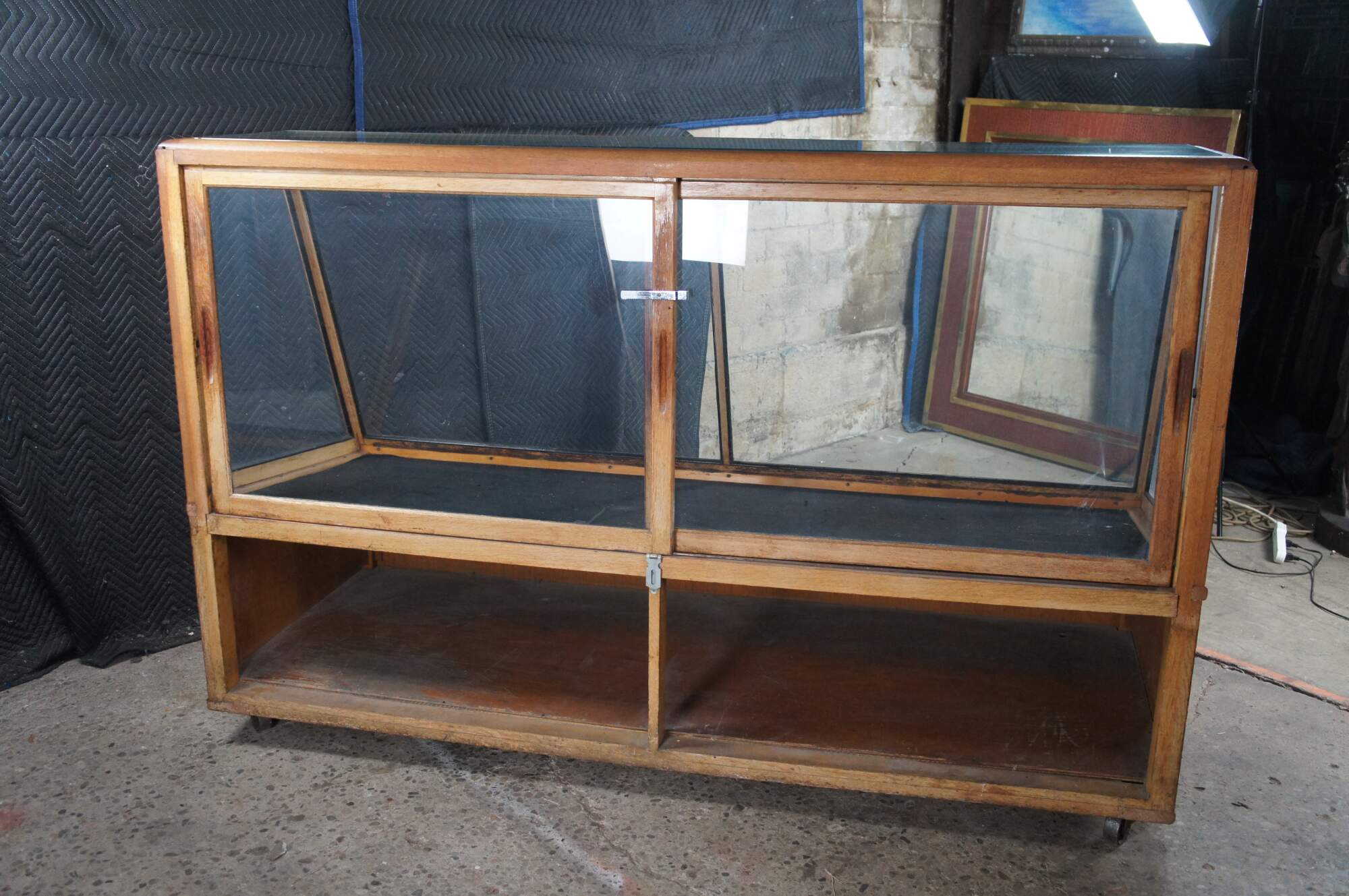An antique general storage showcase made by the Columbus Showcase Company of Columbus Ohio. Features a large rectangular frame made from oak and glass with slant front and rear sliding doors. Metal inserts along the inside allow for the addition of glass shelves. Backside features understorage The cabinet is on wheels for ease of movement.