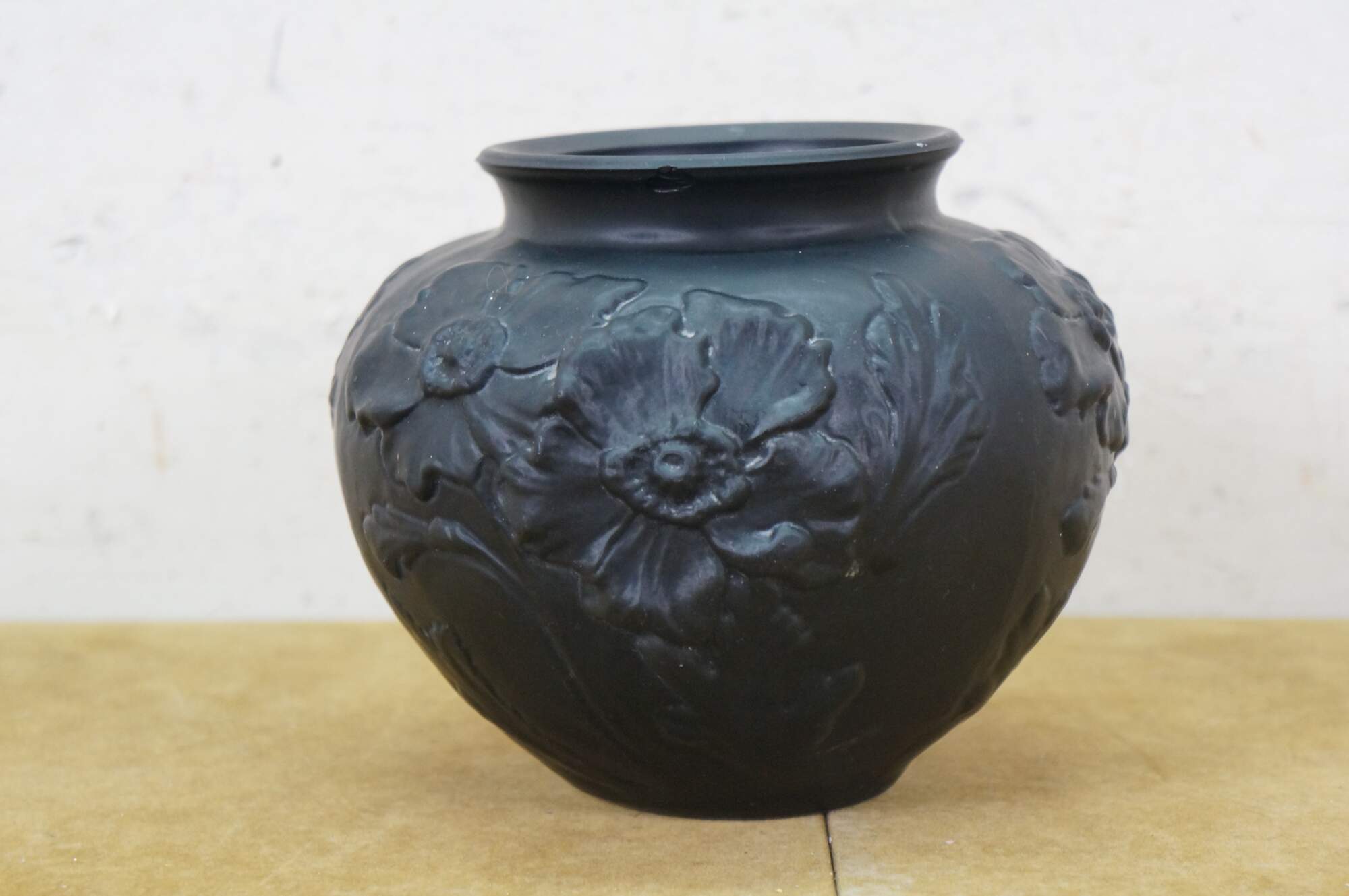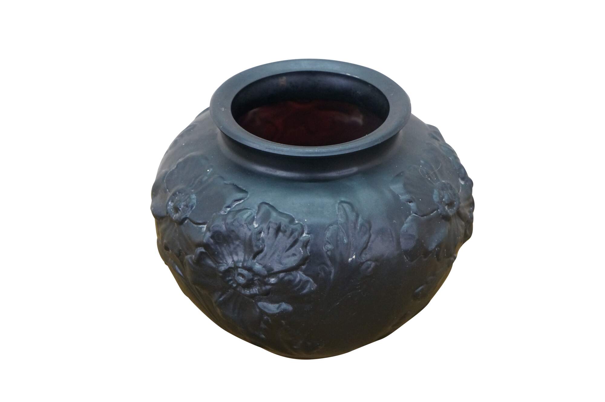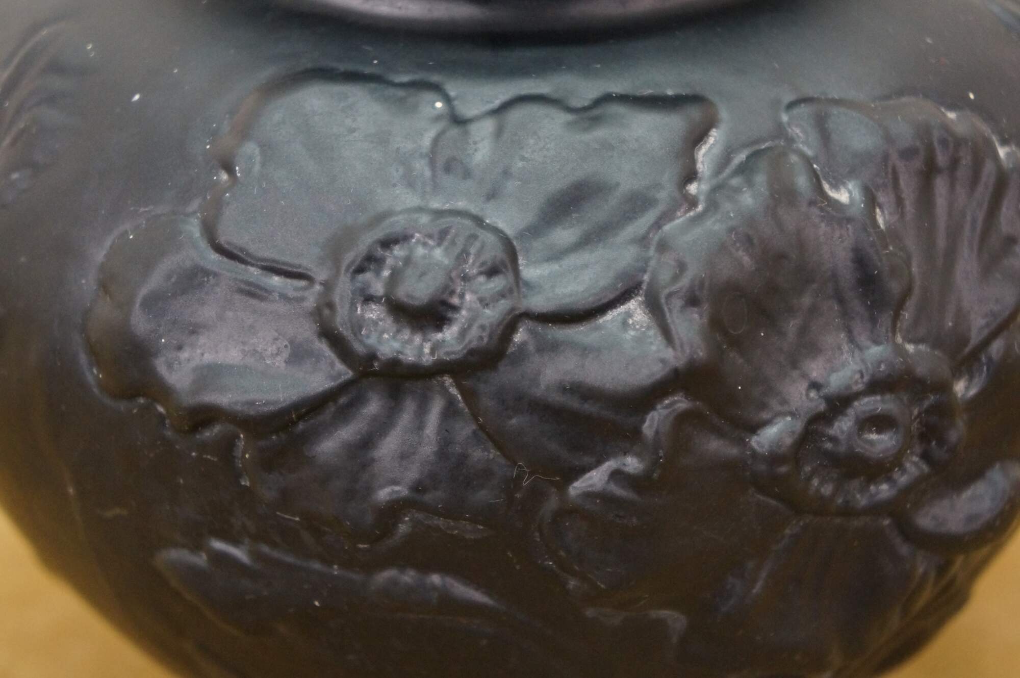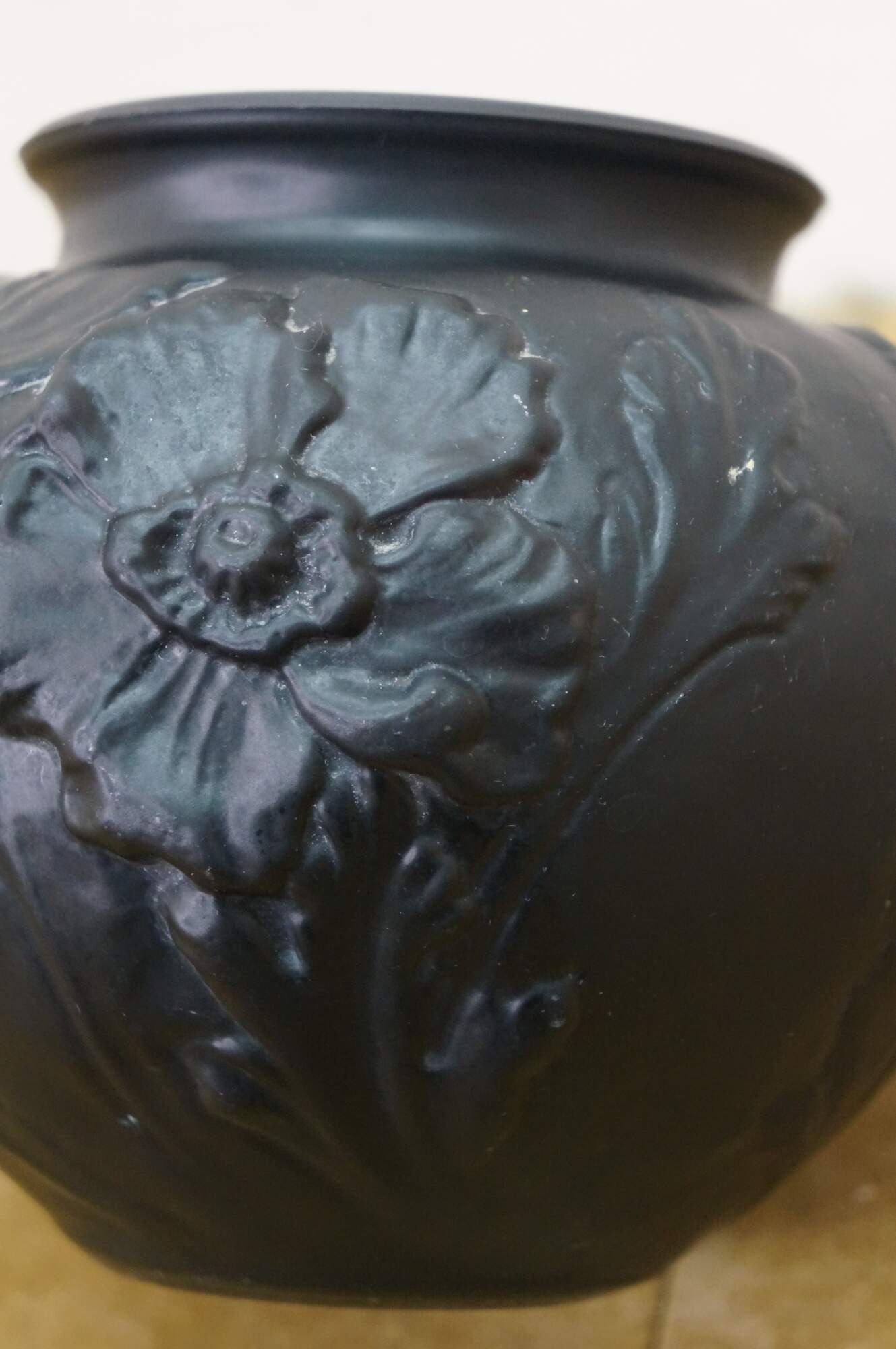 Antique Art Nouveau Tiffin black amethyst satin glass vase featuring an embossed poppy / poppies motif, circa 1930s. Black amethyst glass appears black in normal light but reveals a deep purple hue when held up to a strong light source.