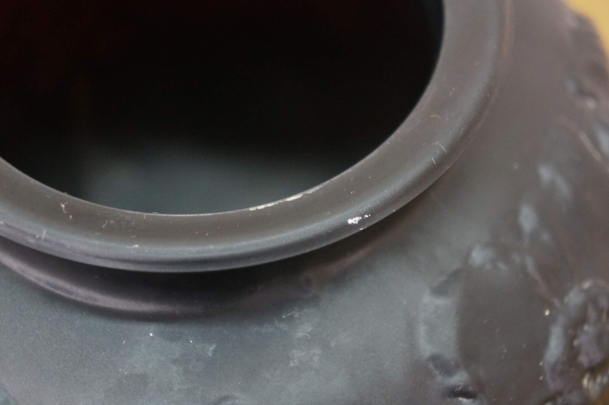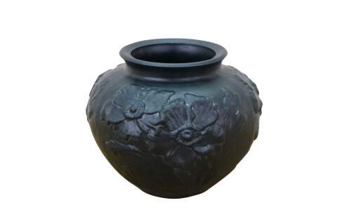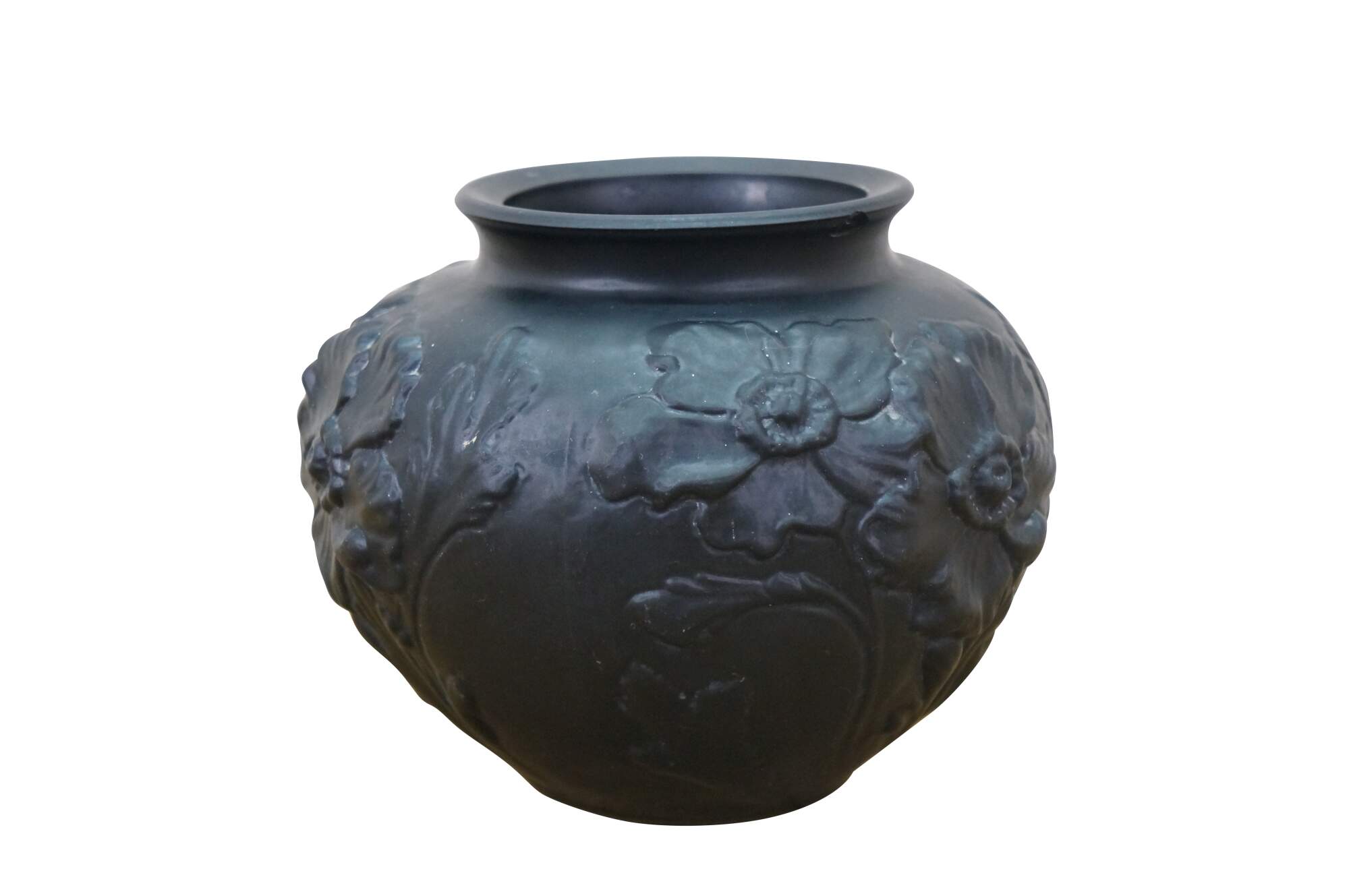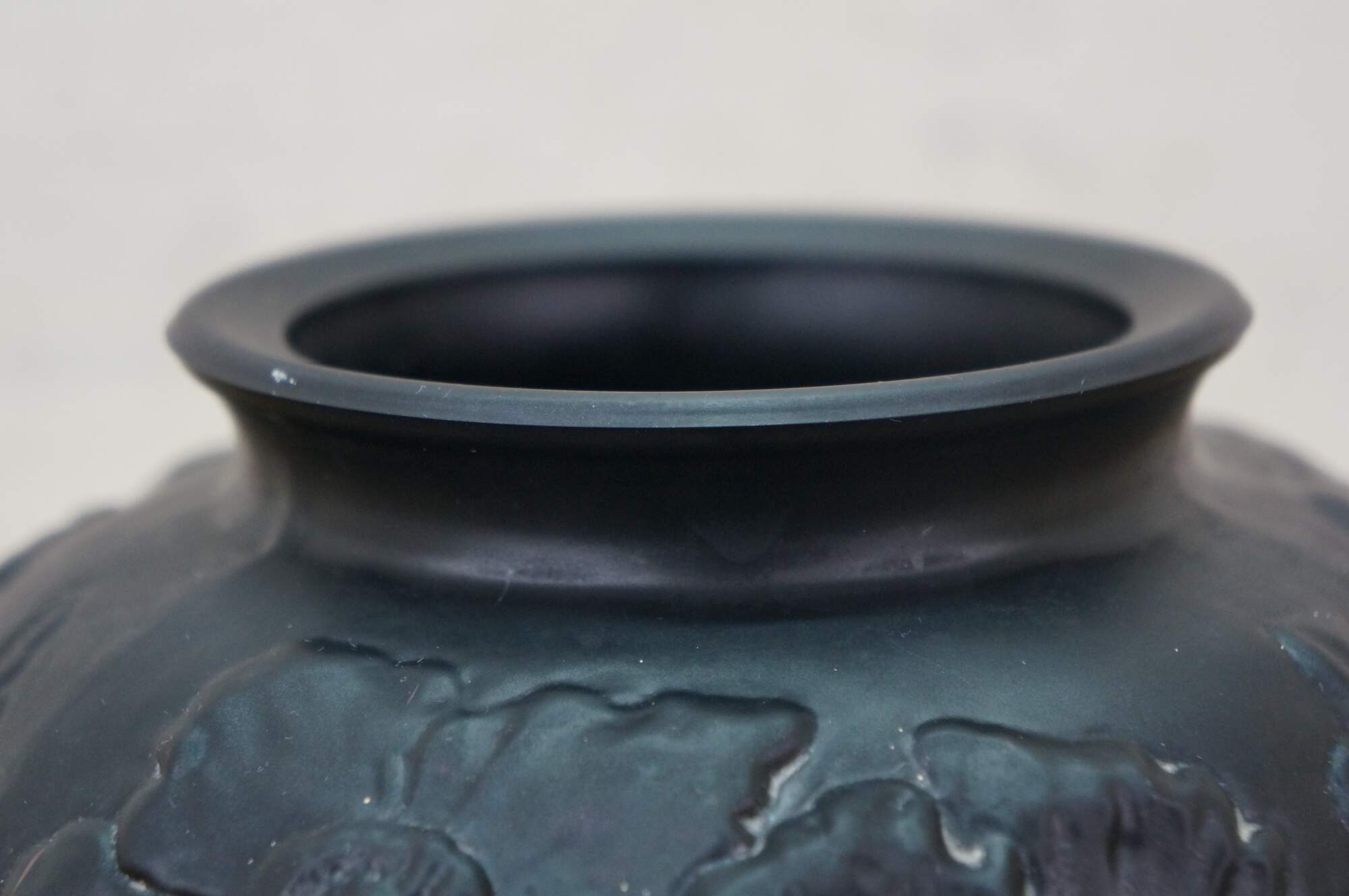 Antique Art Nouveau Tiffin black amethyst satin glass vase featuring an embossed poppy / poppies motif, circa 1930s. Black amethyst glass appears black in normal light but reveals a deep purple hue when held up to a strong light source.