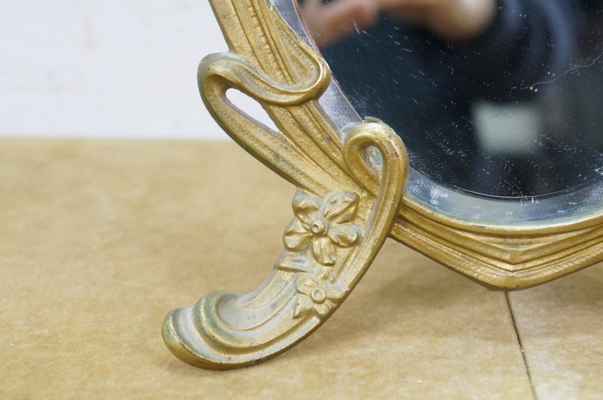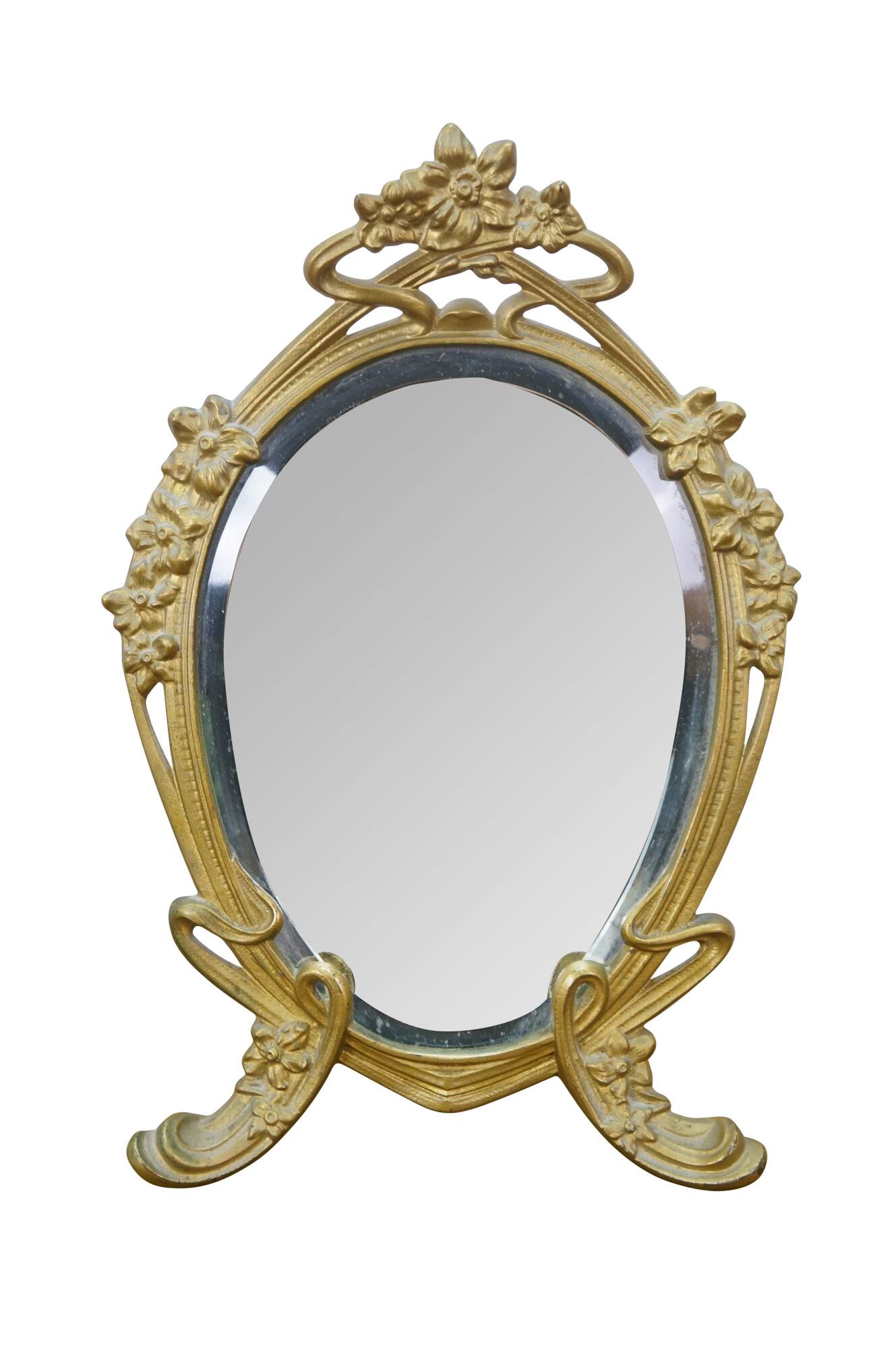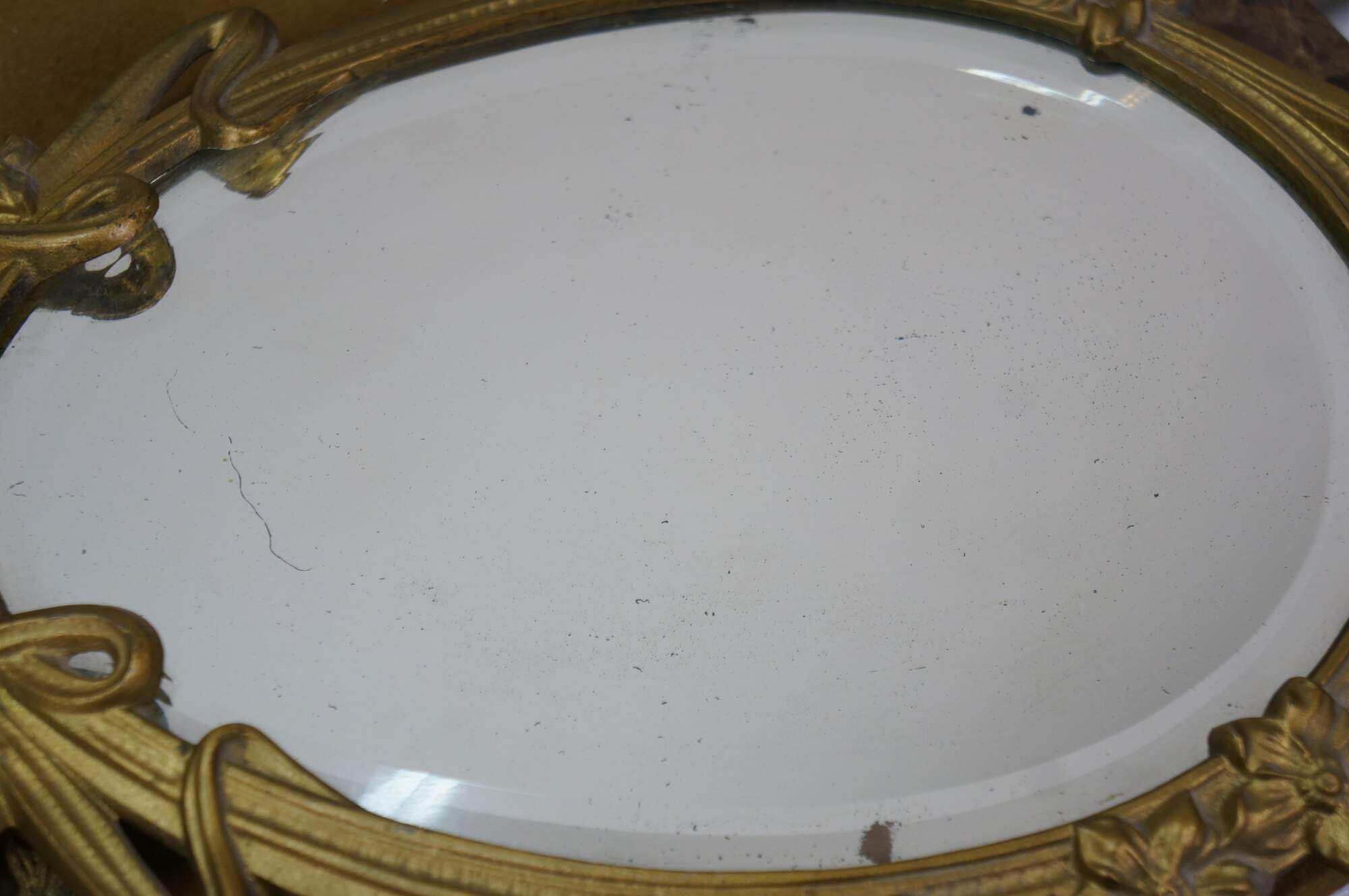 Antique Victorian Art Nouveau reticulated floral gilt brass beveled vanity mirror,
