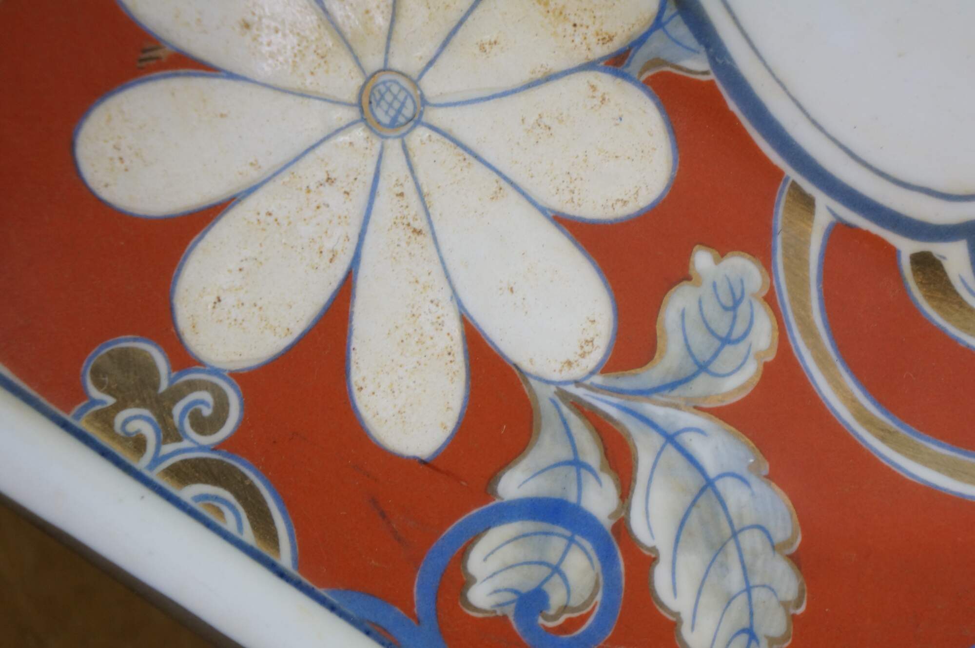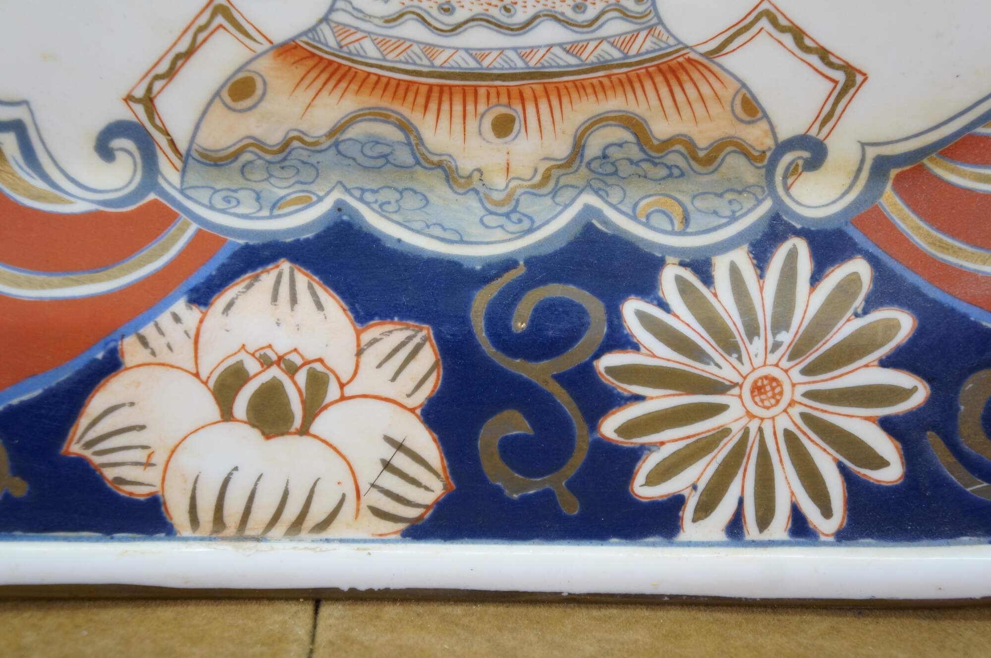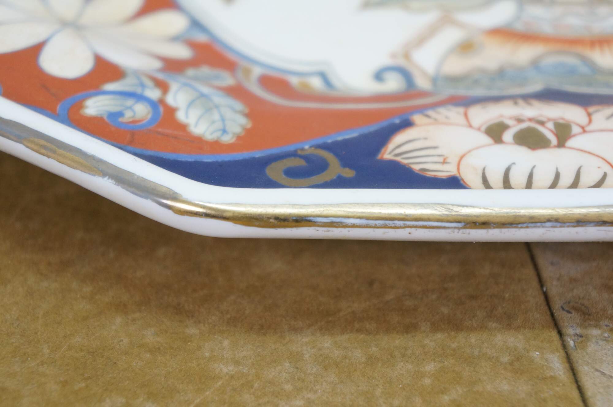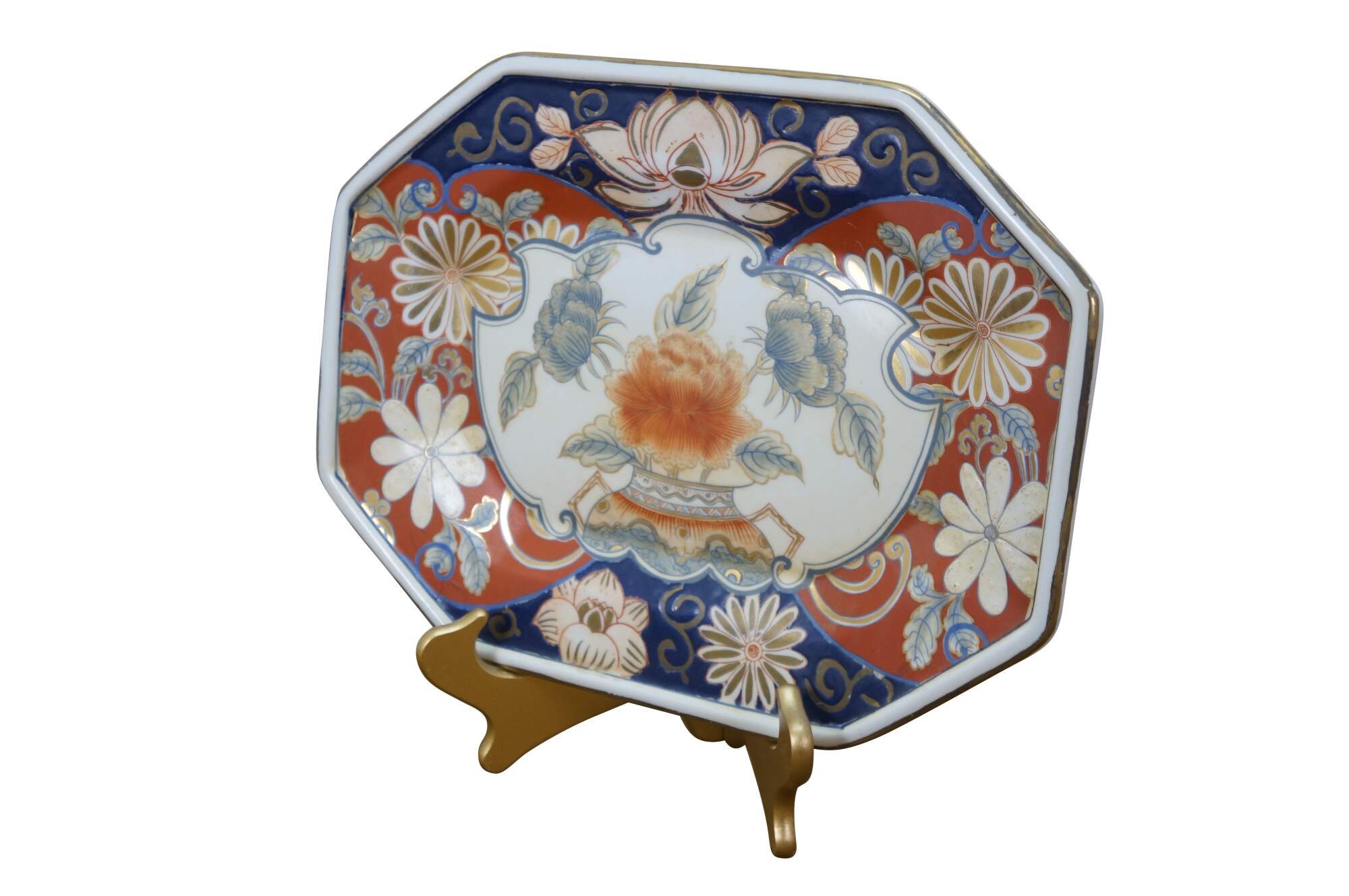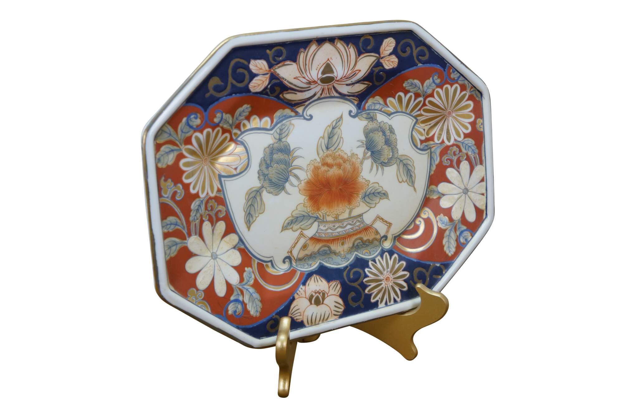 Antique Japanese Imari porcelain octagonal floral Chrysanthemums plate or serving dish featuring traditional bright colors, including a rich underglaze blue and overglaze red-orange, accented with gold gilt.
