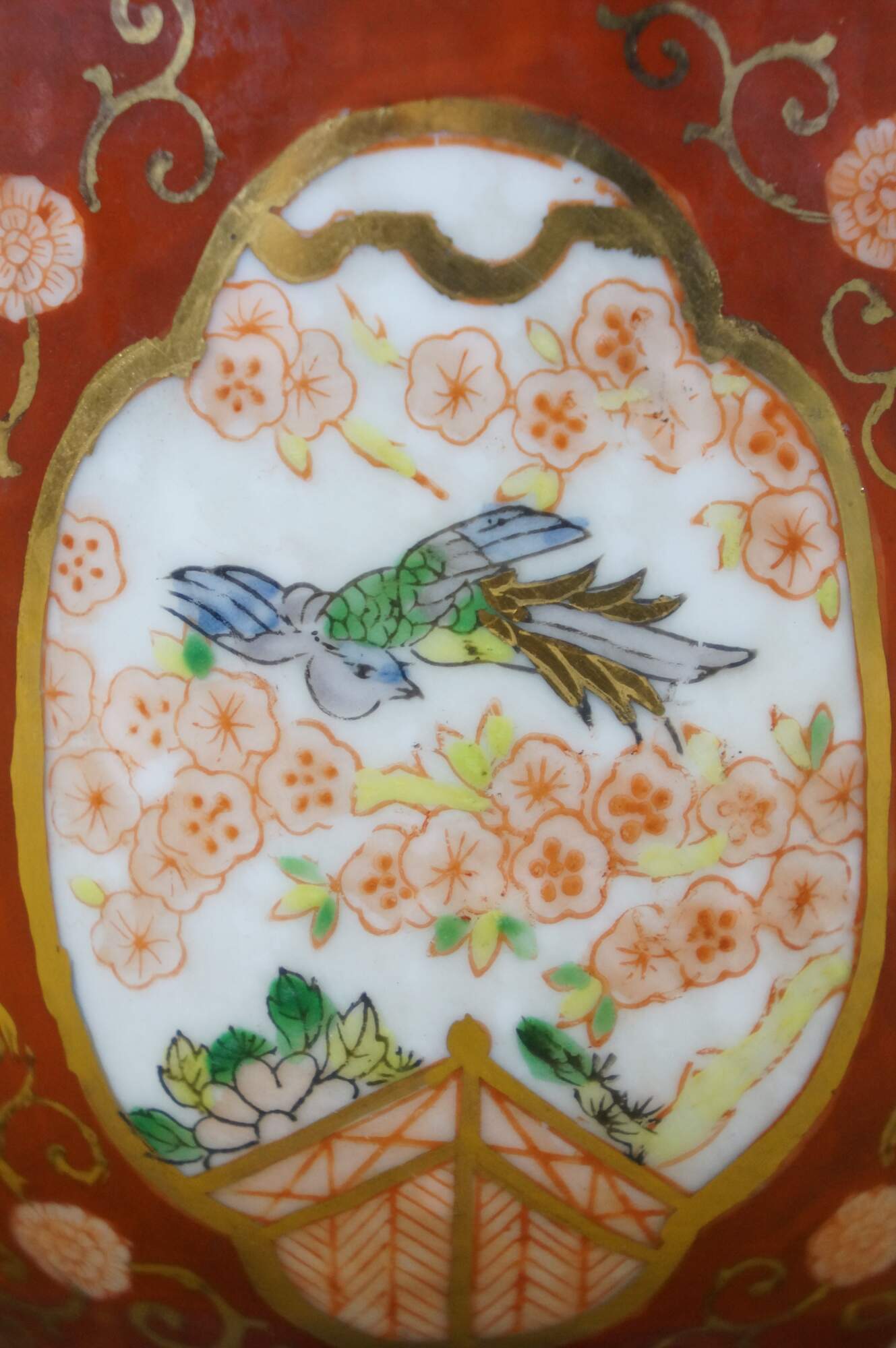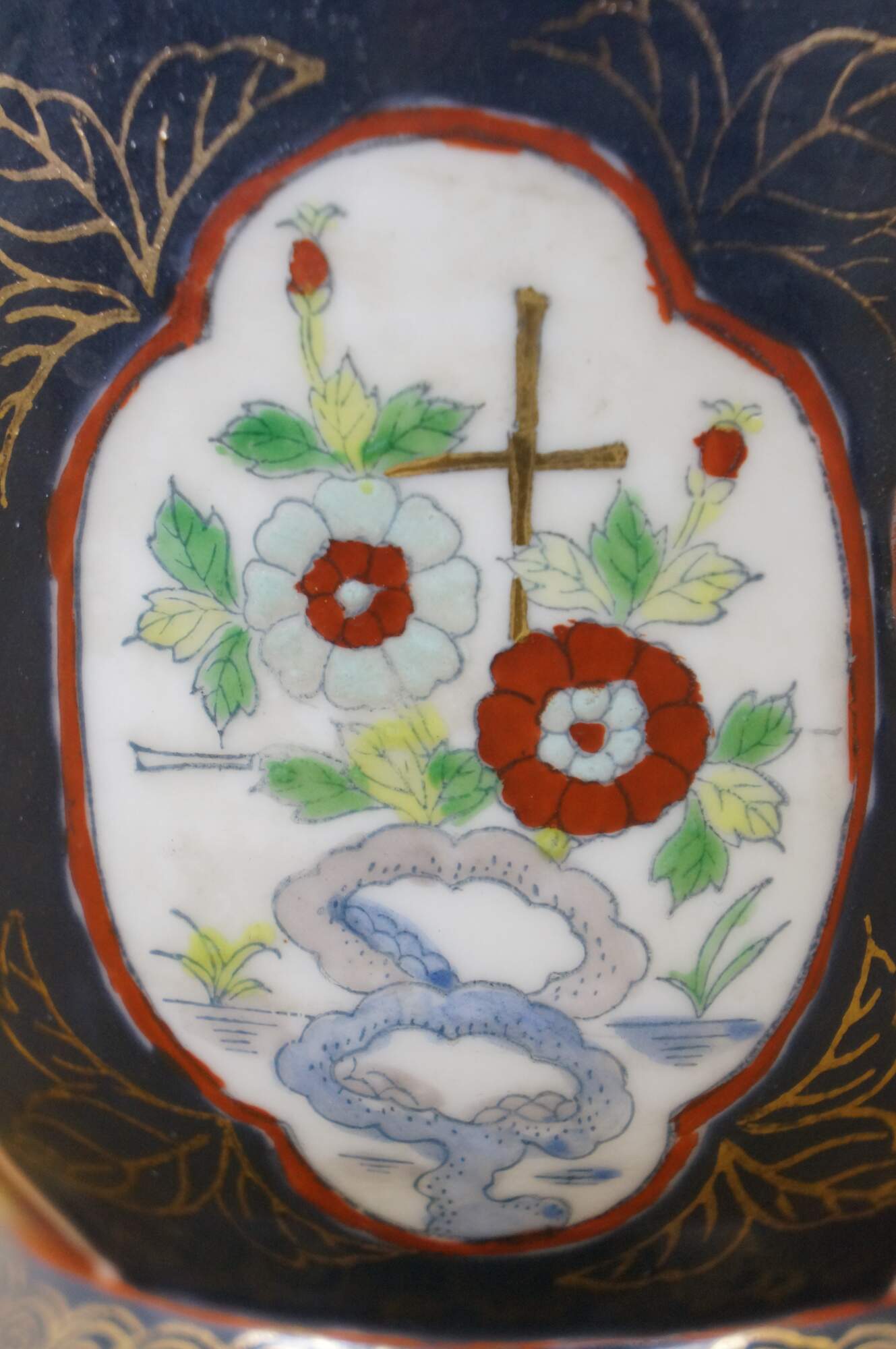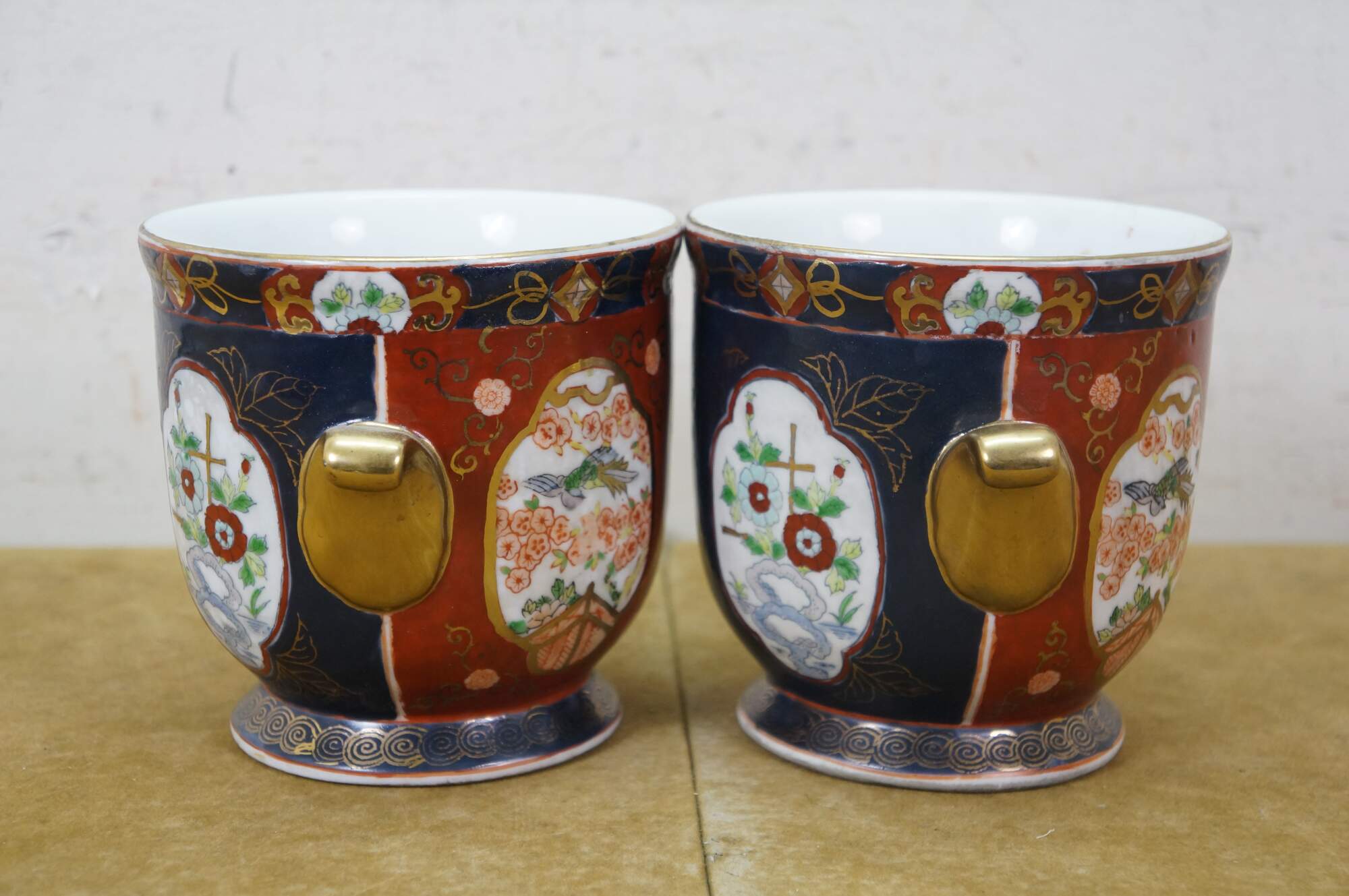 Pair of vintage Japanese hand-painted Gold Imari style porcelain cachepots / urns / planters. They feature the classic Imari palette of cobalt blue, rust red, and gold accent handles. The design includes panels with floral and bird motifs.