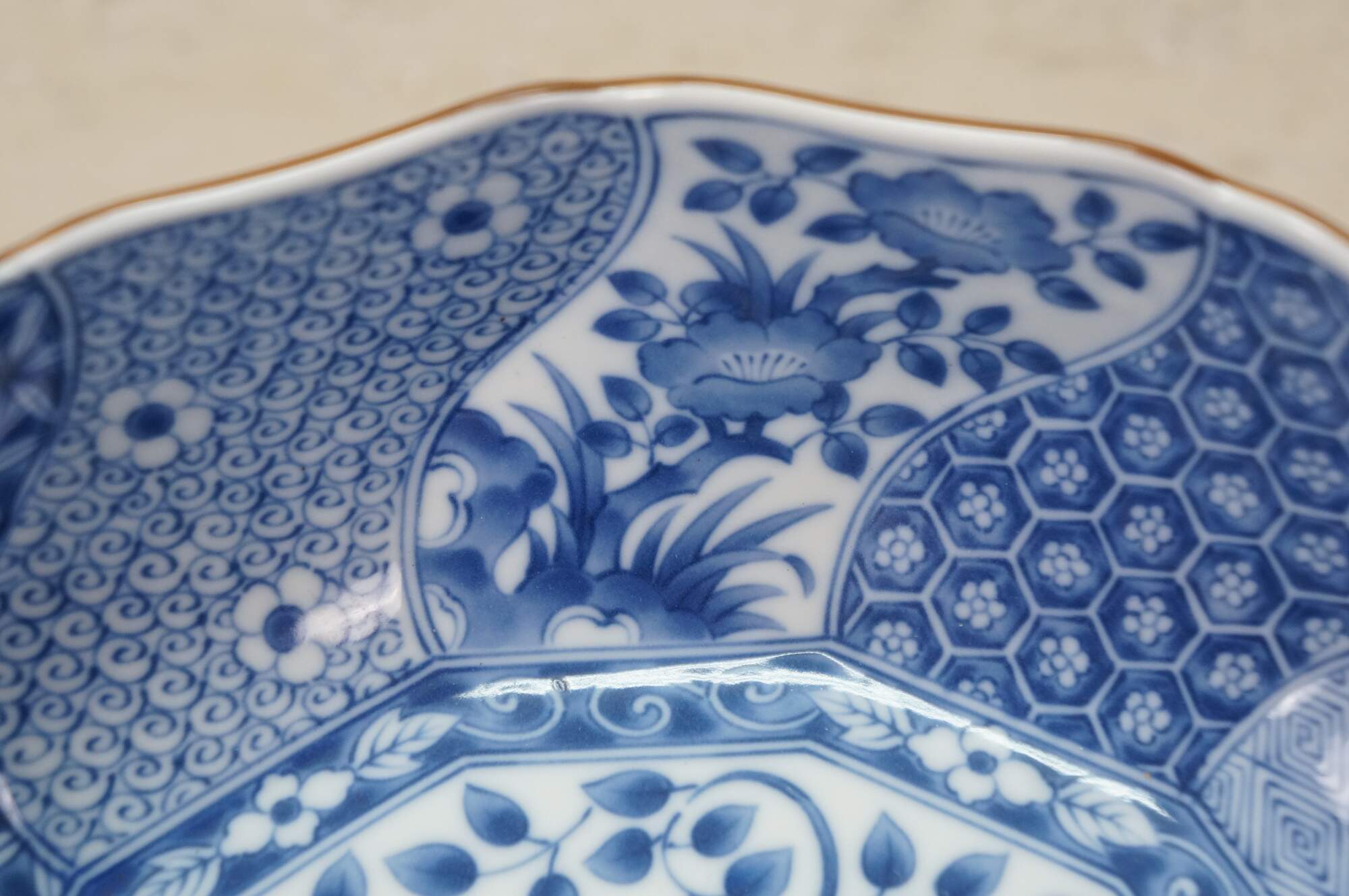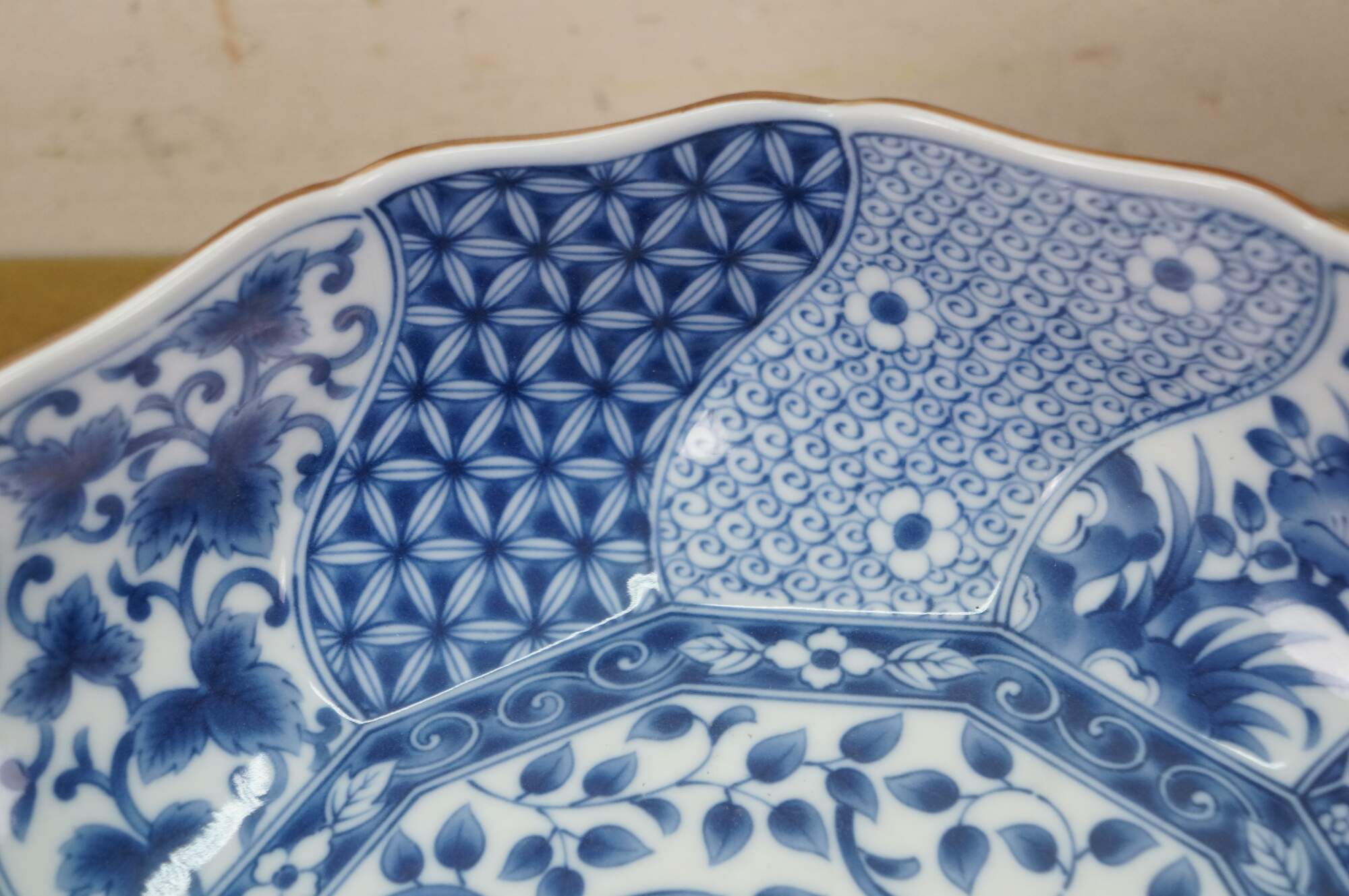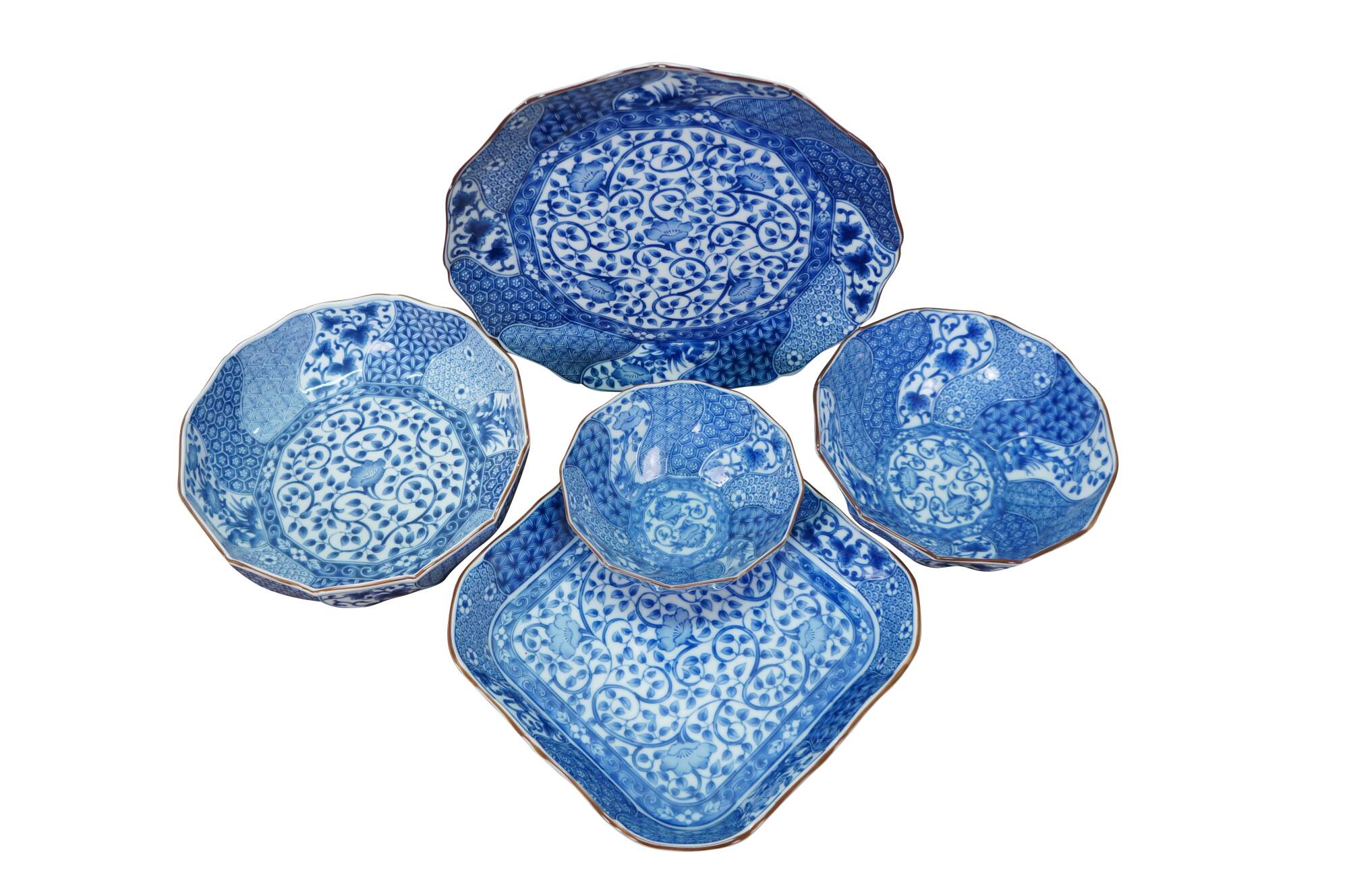 Vintage Japanese Minoyaki Nejiri Shouzui porcelain serving pieces featuring a distinctive blue and white arabesque (Sometsuke) pattern with wavy rim. Includes three bowls, a large centerpiece plate / platter, and square casserole dish.