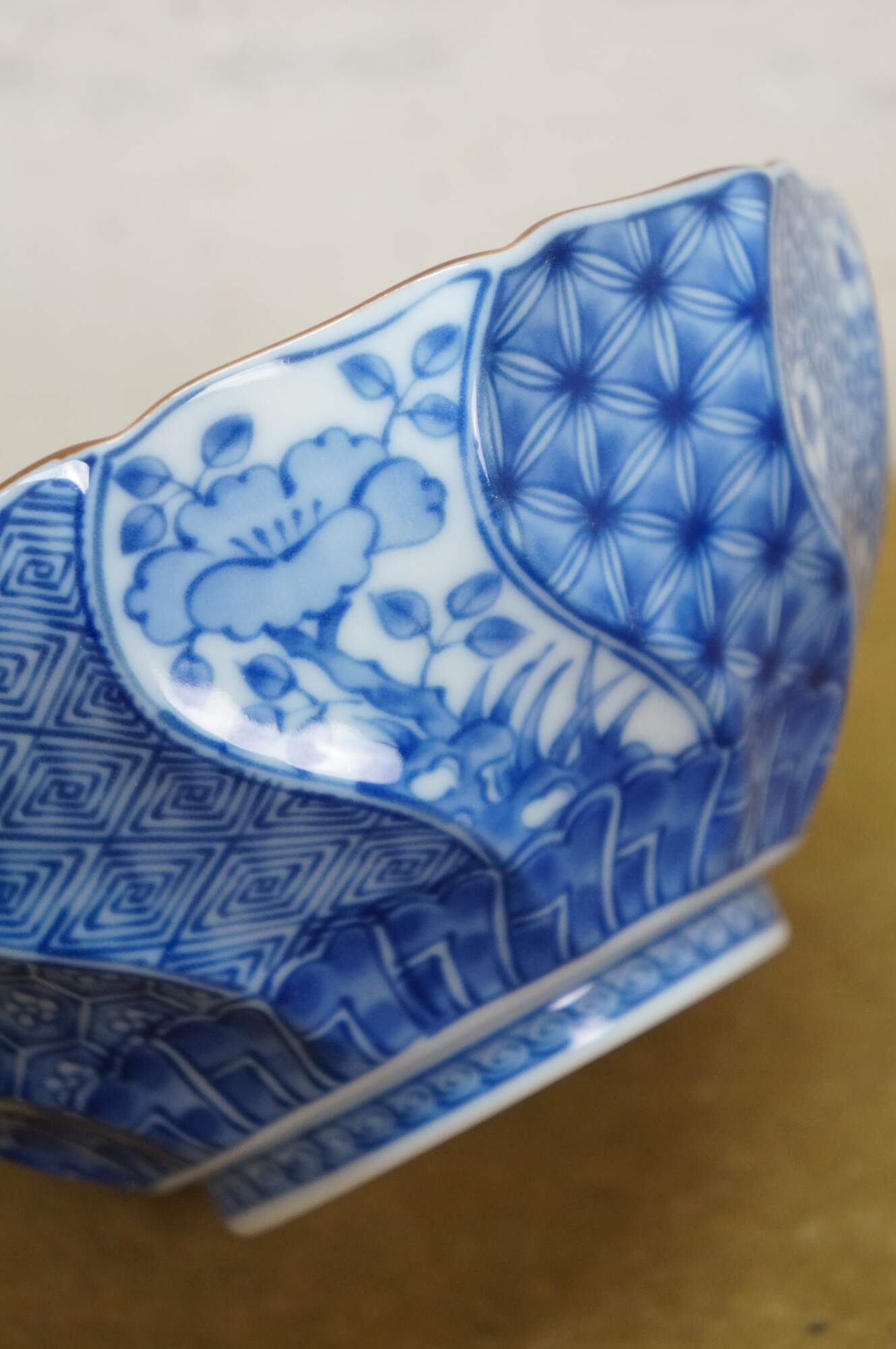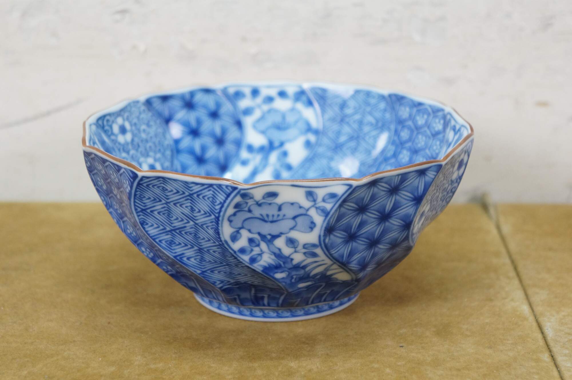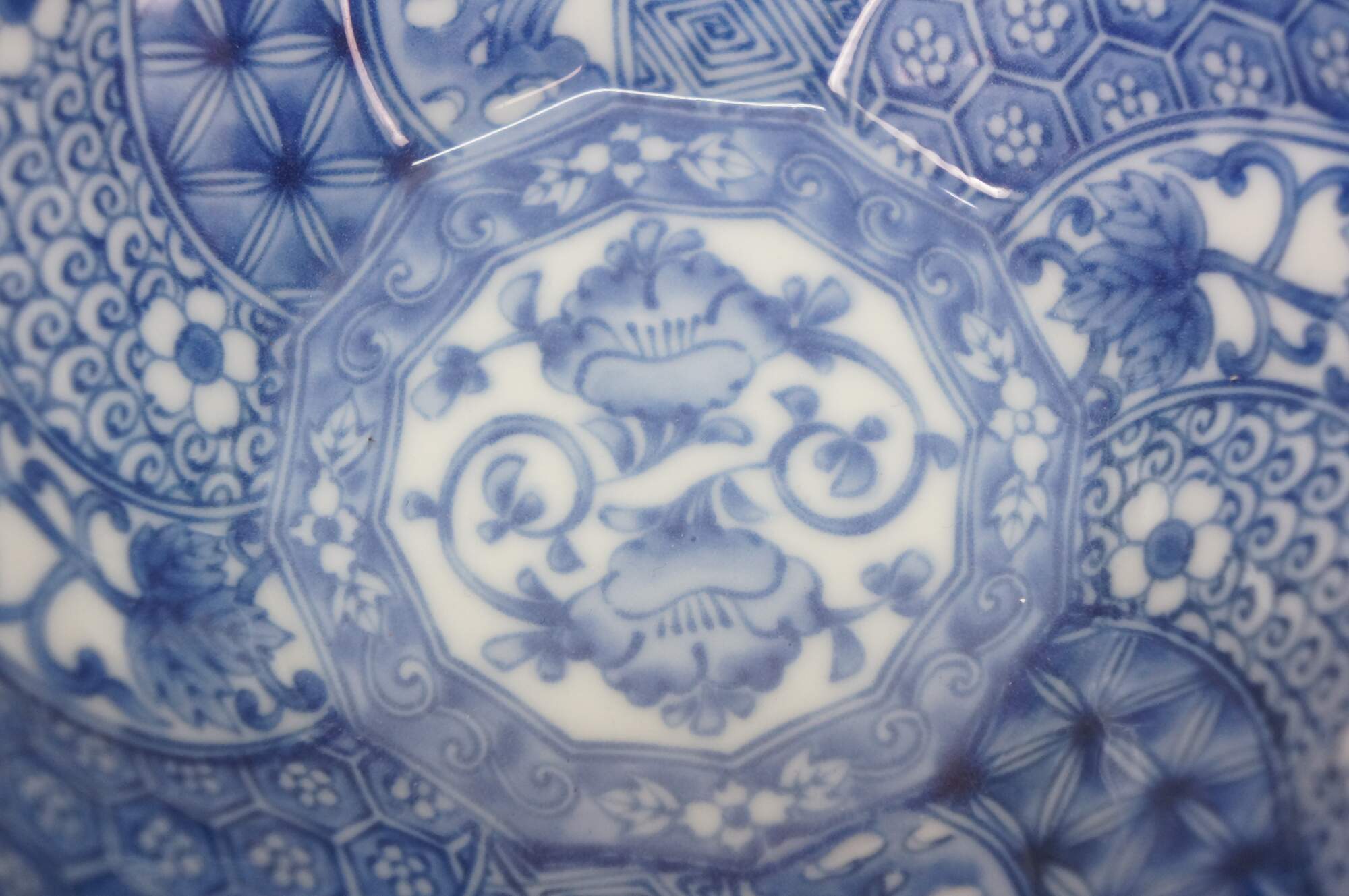 Vintage Japanese Minoyaki Nejiri Shouzui porcelain serving pieces featuring a distinctive blue and white arabesque (Sometsuke) pattern with wavy rim. Includes three bowls, a large centerpiece plate / platter, and square casserole dish.