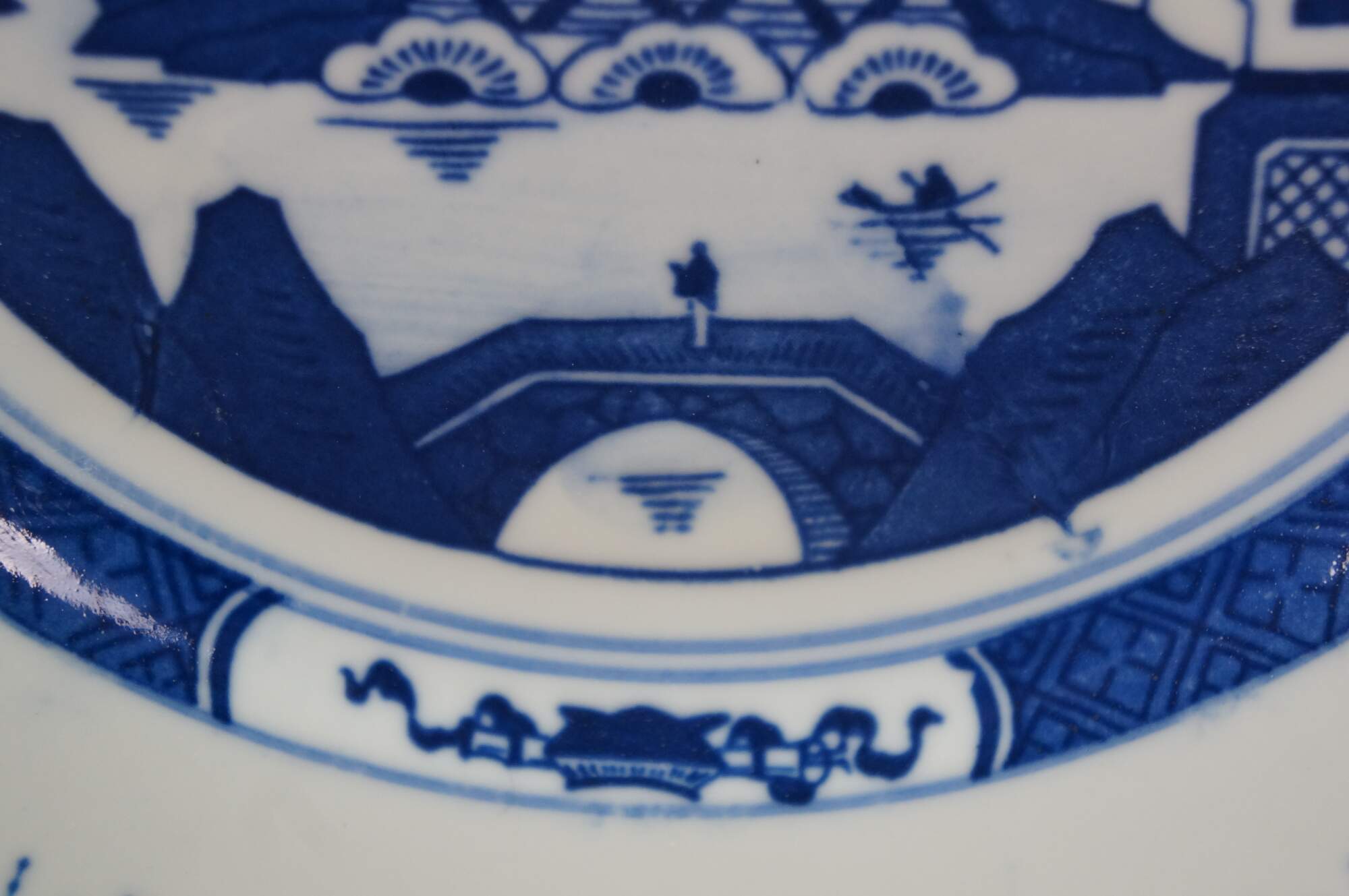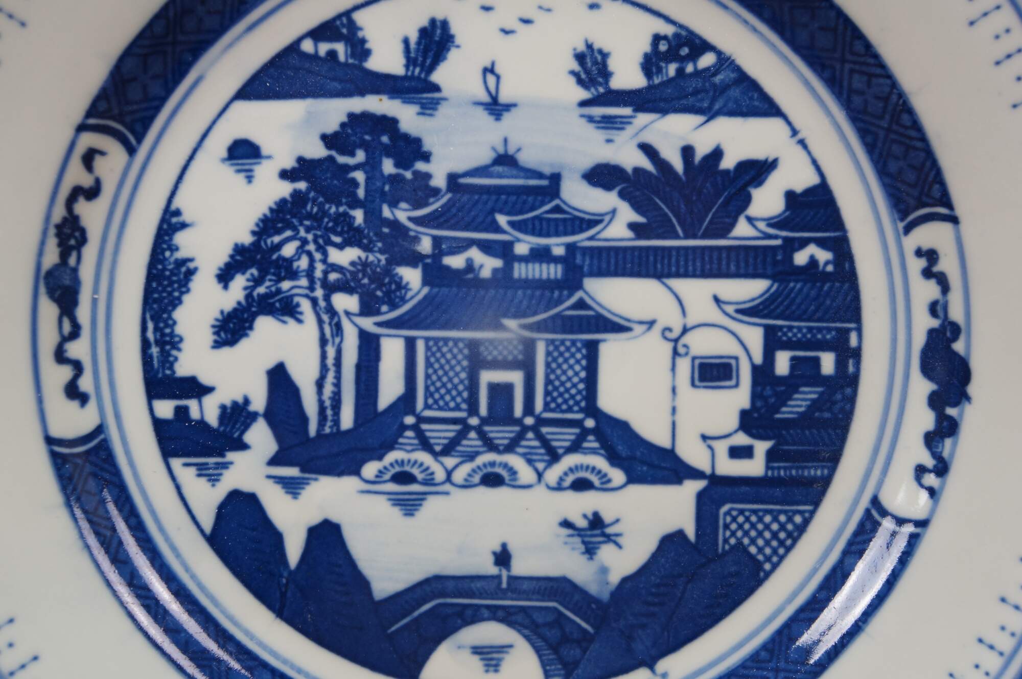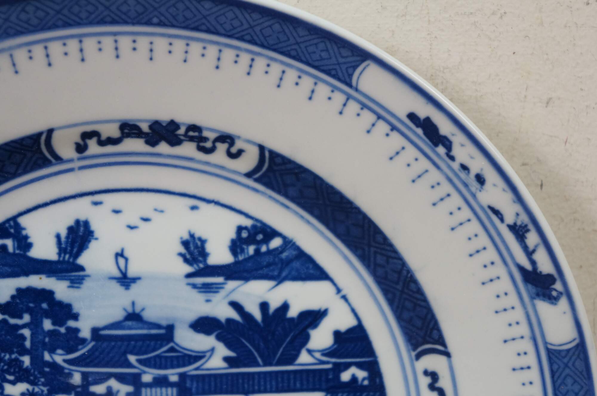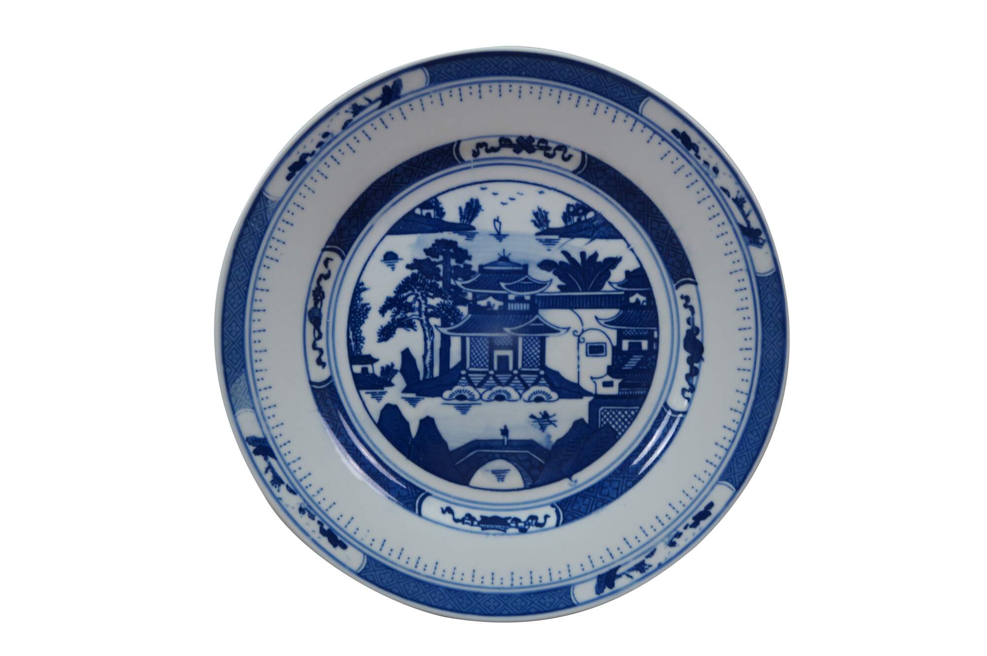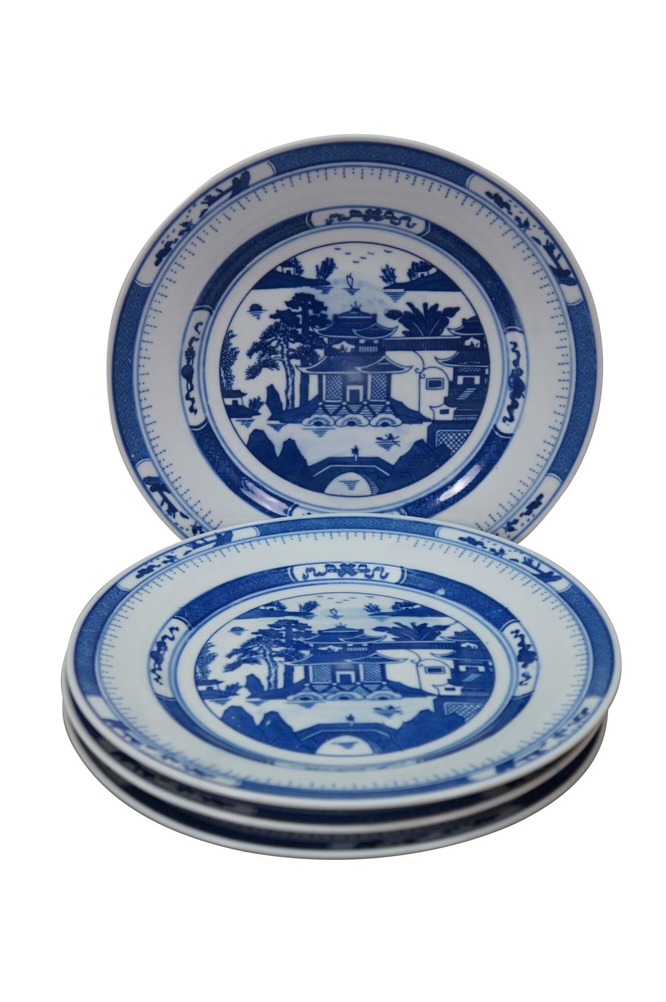 Vintage Chinese Canton Chinoiserie blue & white porcelain plates, featuring traditional harbor scenes with pagodas, figures, boats, and willow trees.