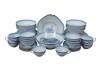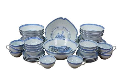 Vintage 55 piece collection of vintage Chinese blue and white rice grain porcelain dinnerware featuring the Rice Flower pattern by Jingdezhen Tienshan. The porcelain features tiny, translucent rice eye openings created by cut-outs that fill with glaze during firing, producing a glowing effect when held to the light.