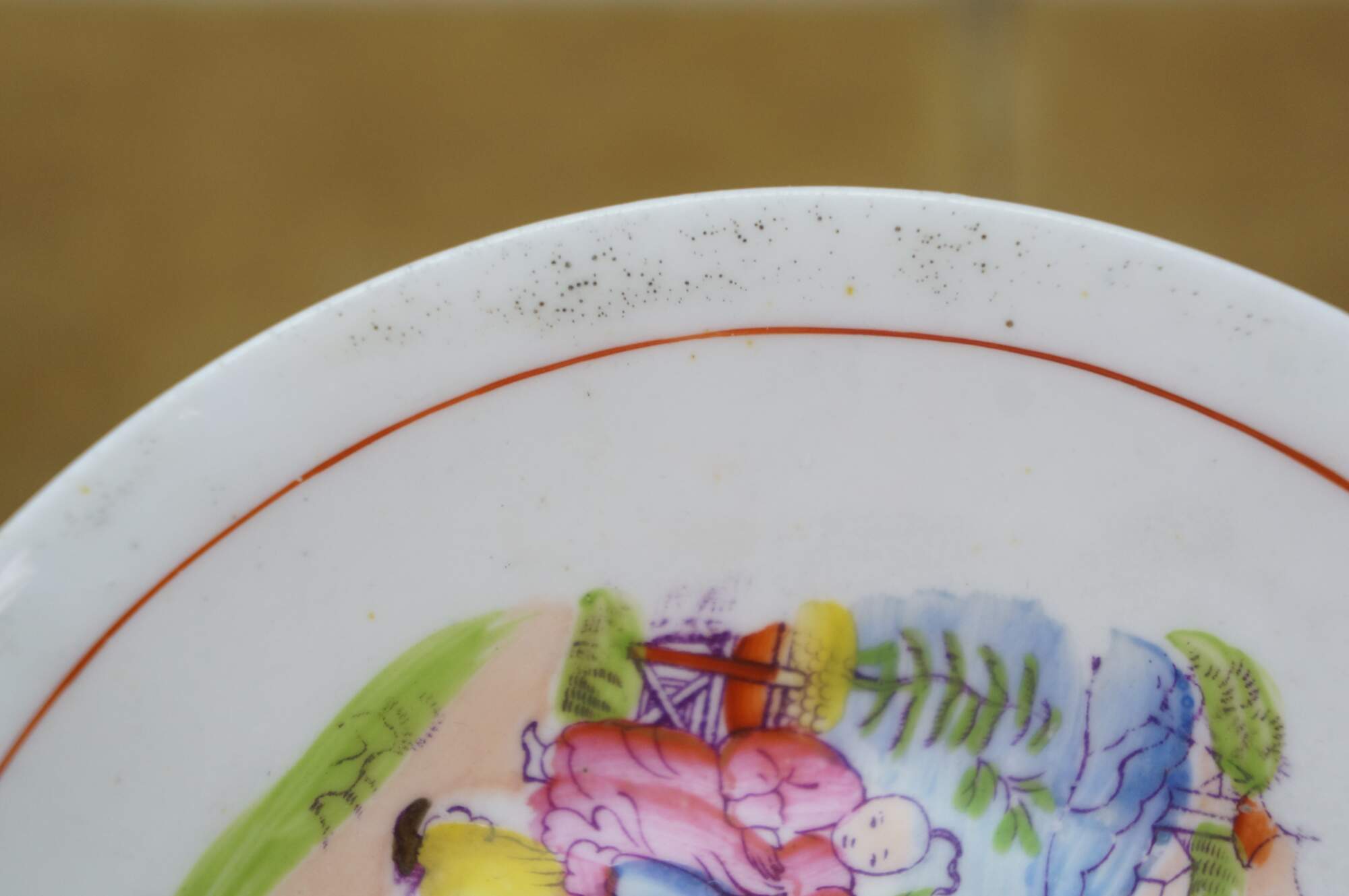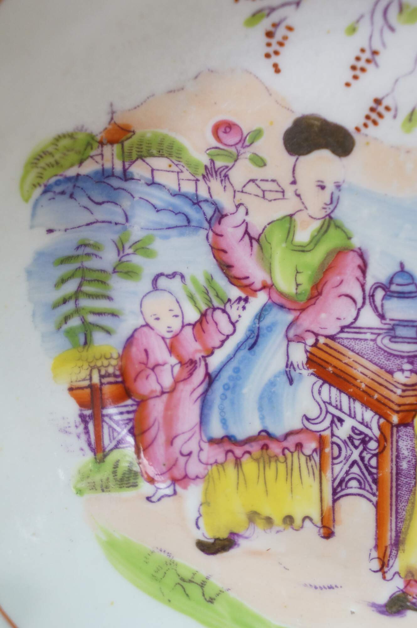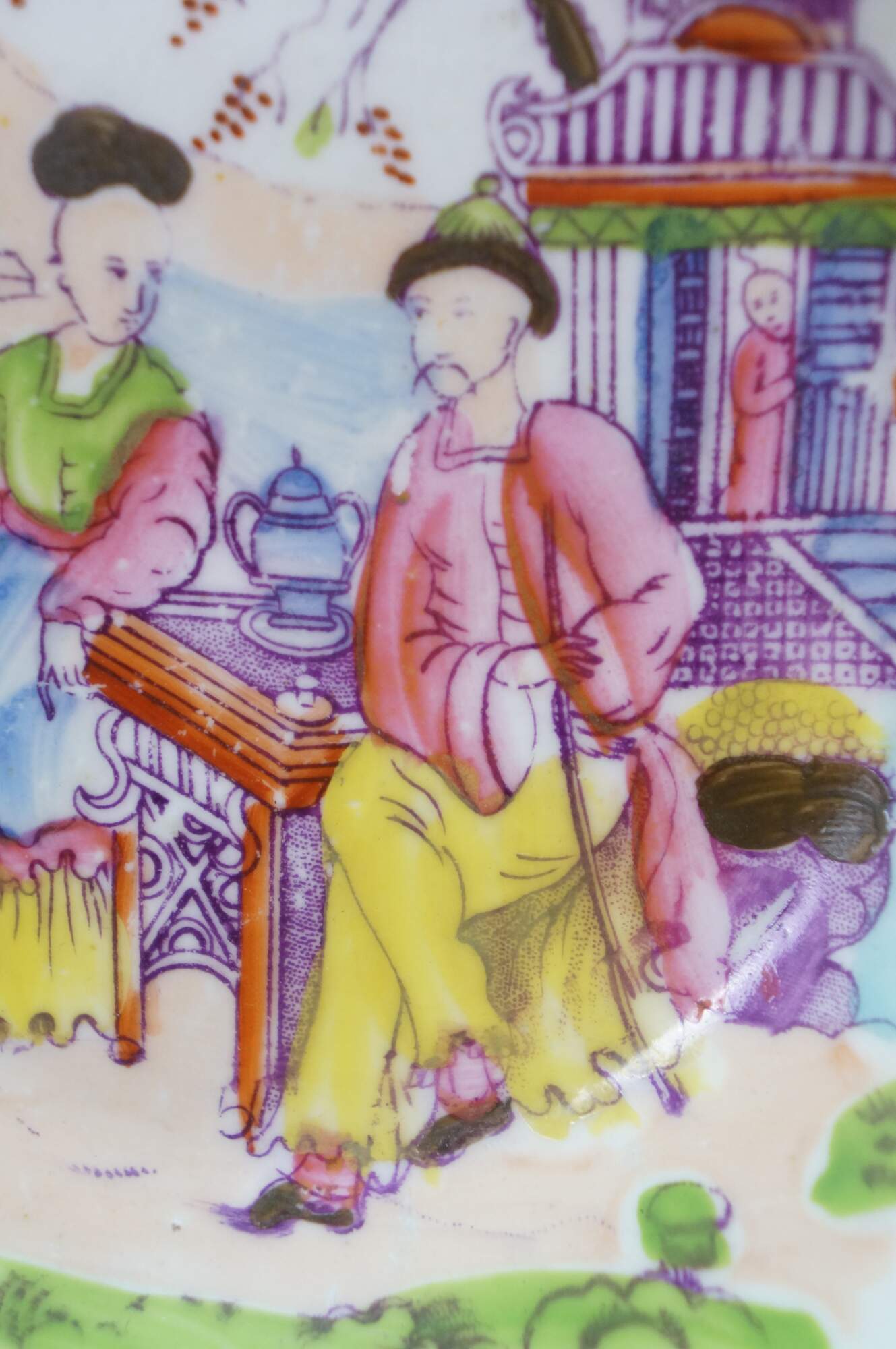 Antique Chinese export porcelain bowl featuring a hand-painted Famille Rose Mandarin Chinoiserie scene with two figures having tea in the garden, with Pagoda in the distance.