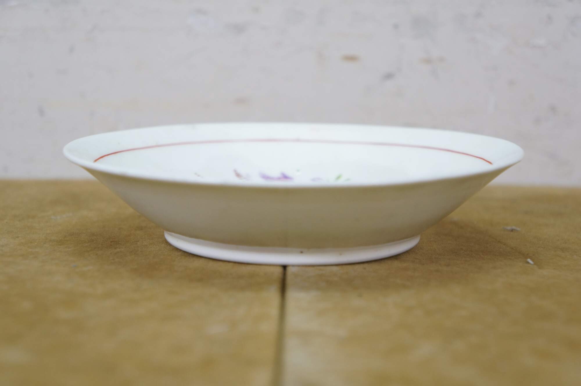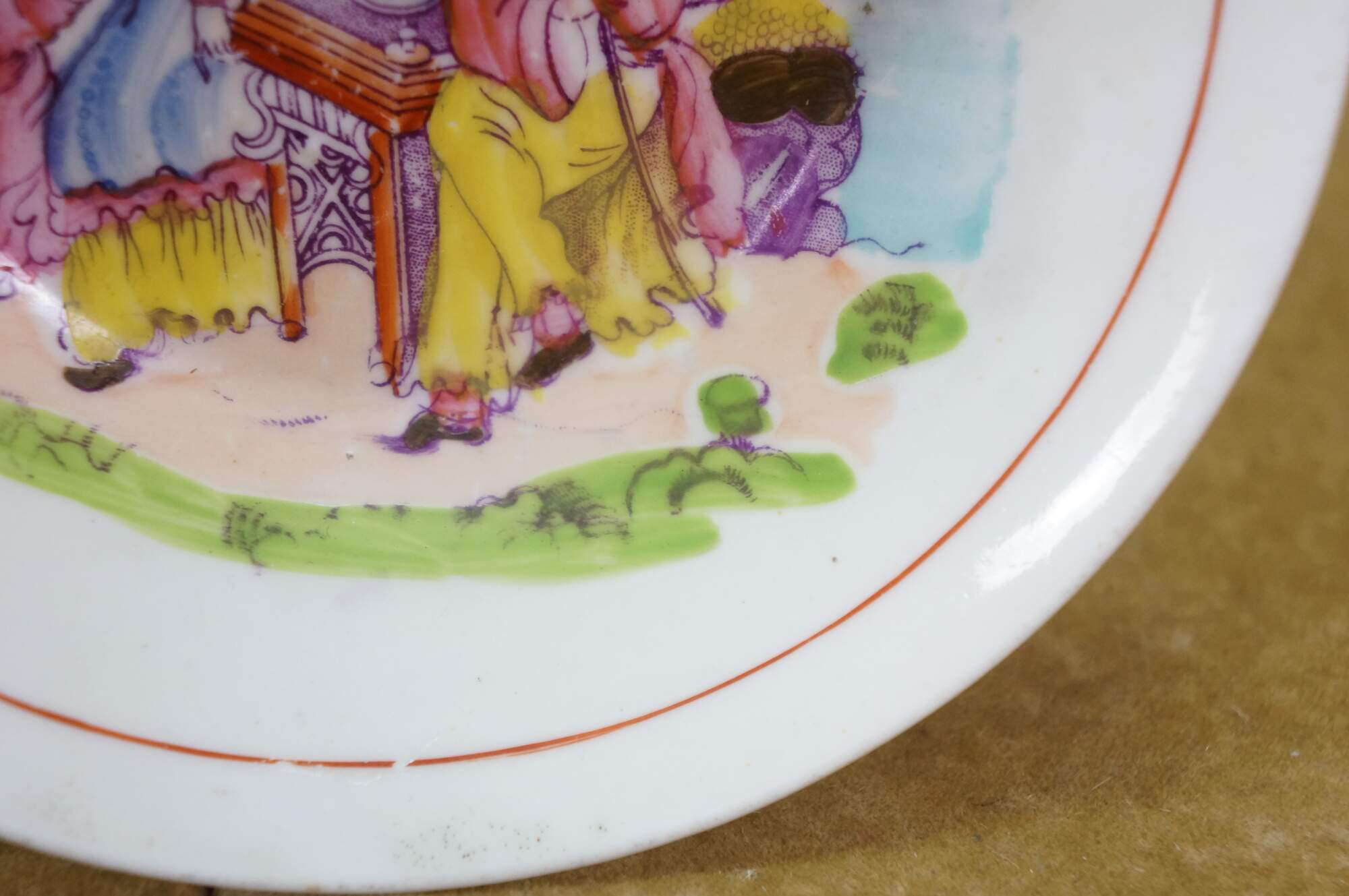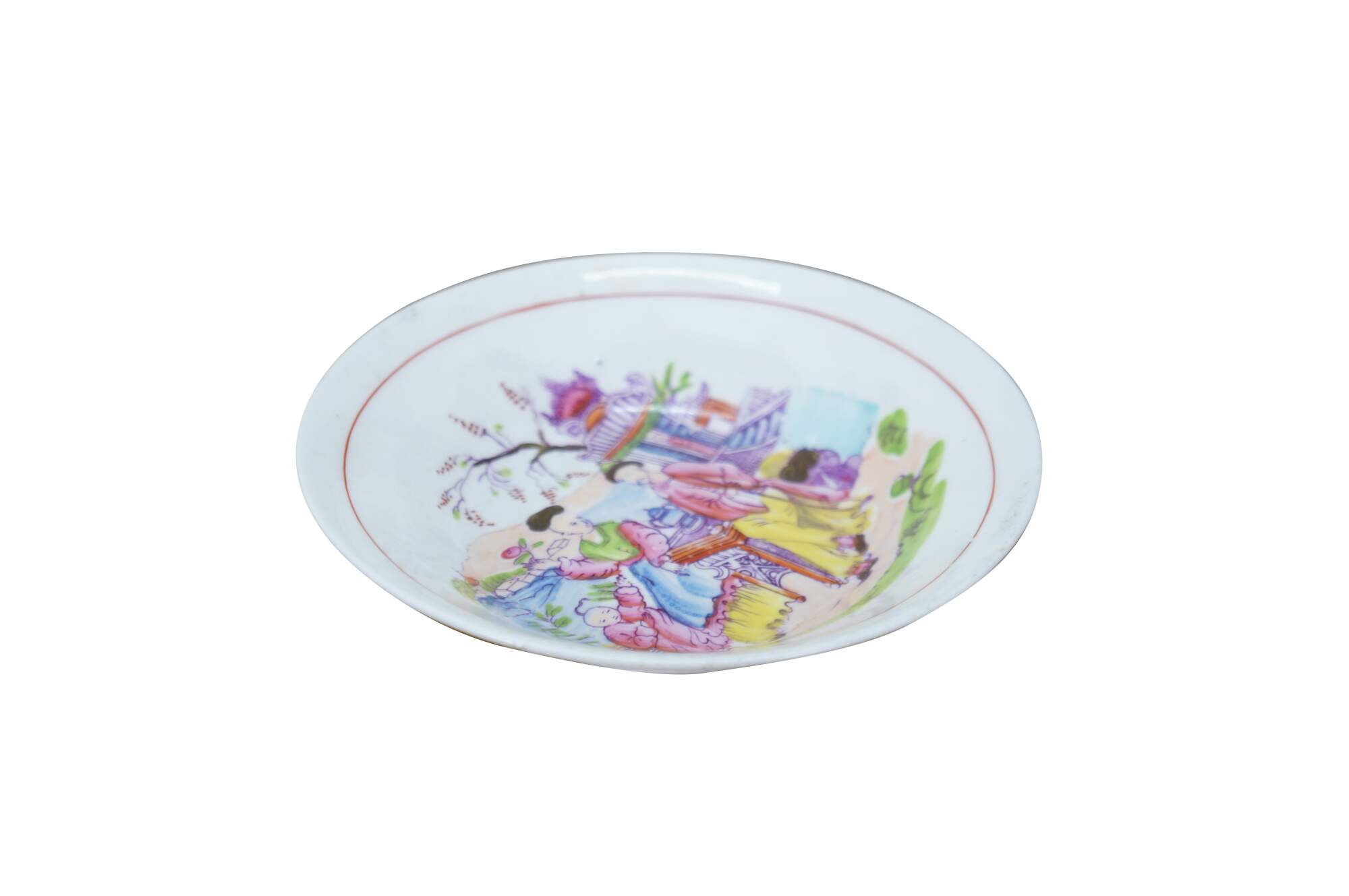 Antique Chinese export porcelain bowl featuring a hand-painted Famille Rose Mandarin Chinoiserie scene with two figures having tea in the garden, with Pagoda in the distance.
