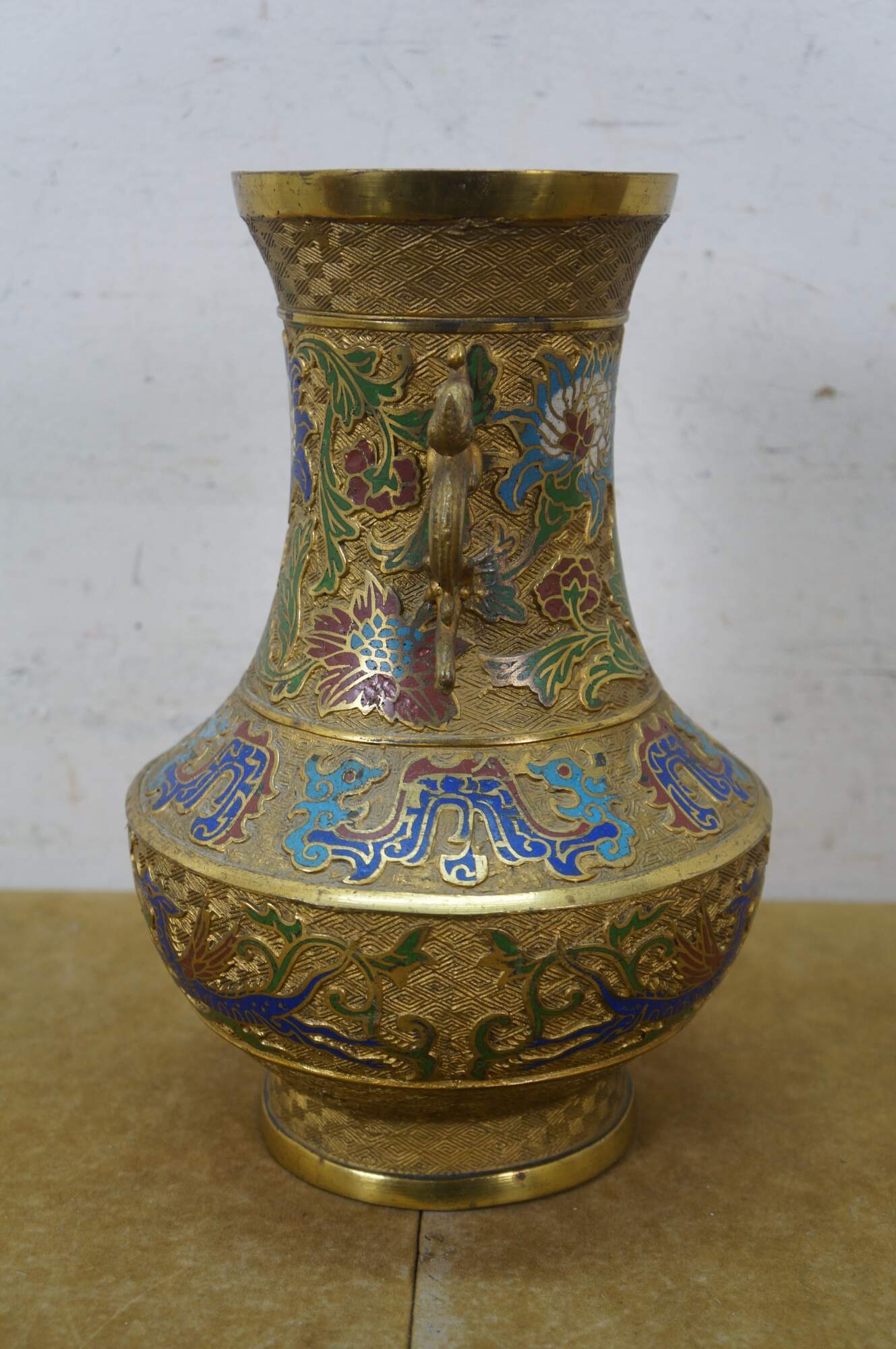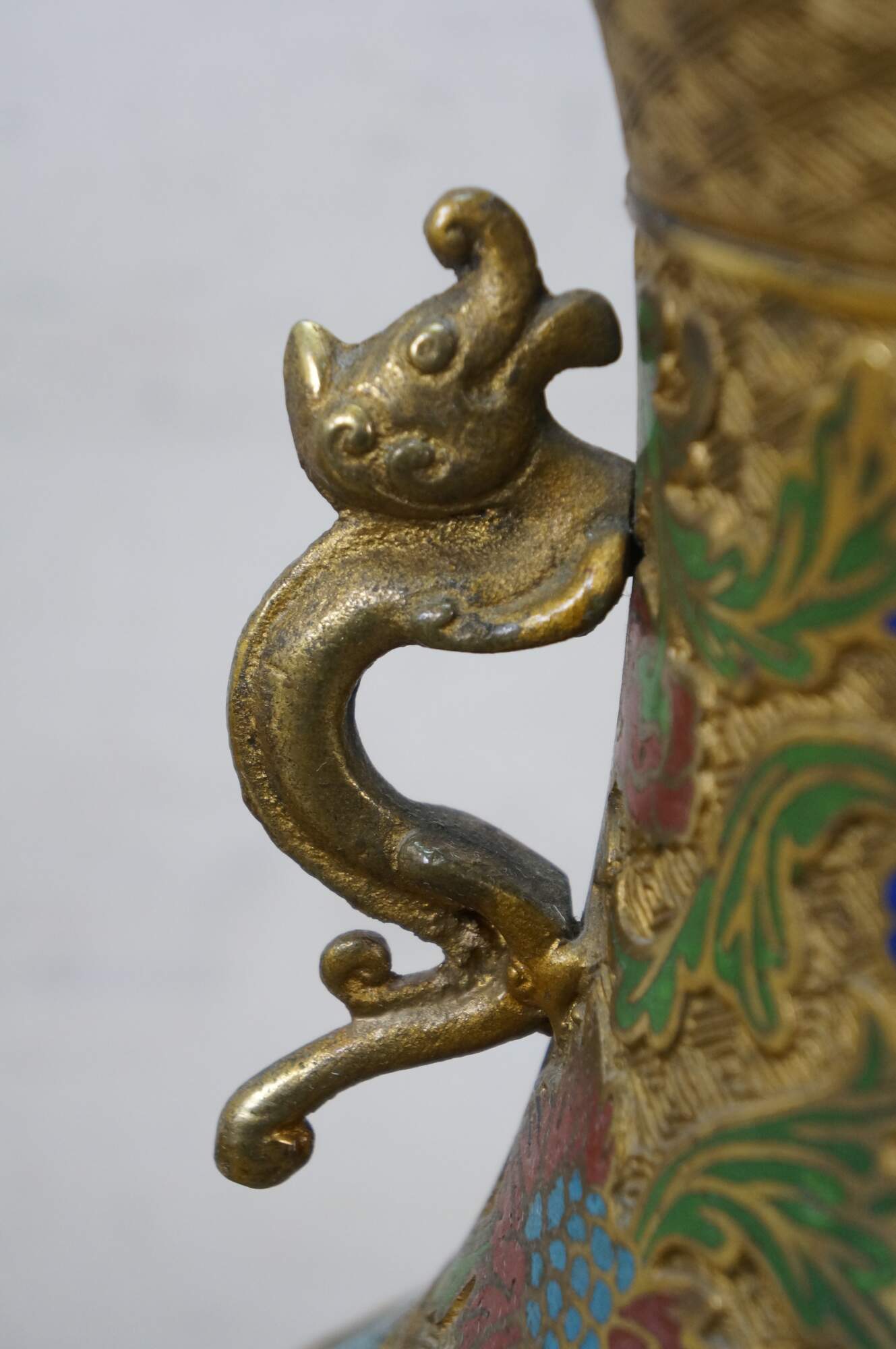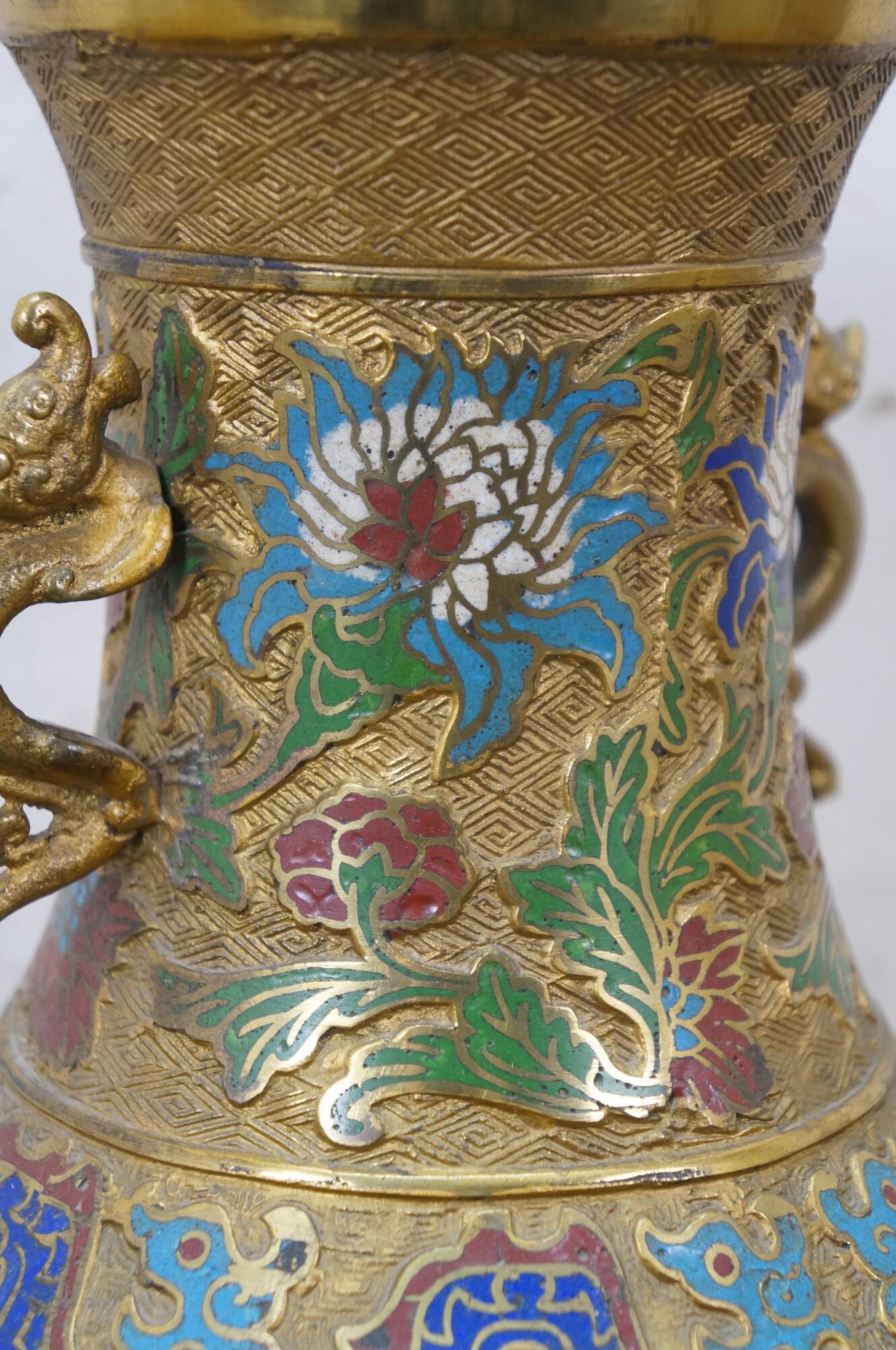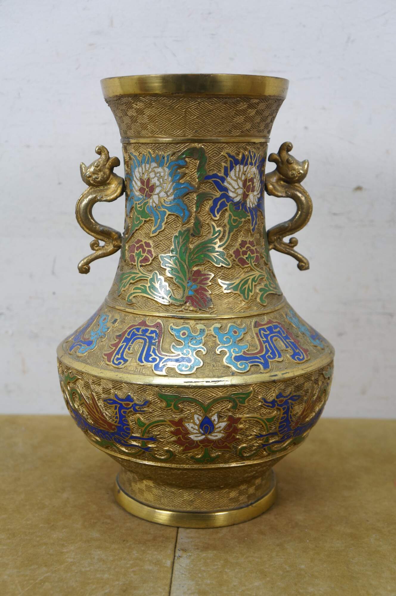 Exquisite antique Japanese bronze champlevé and cloisonné enamel vase with dragon handles. It features decorative patterns of lotus and chrysanthemum flowers, vines, and dragons. Made in Japan.