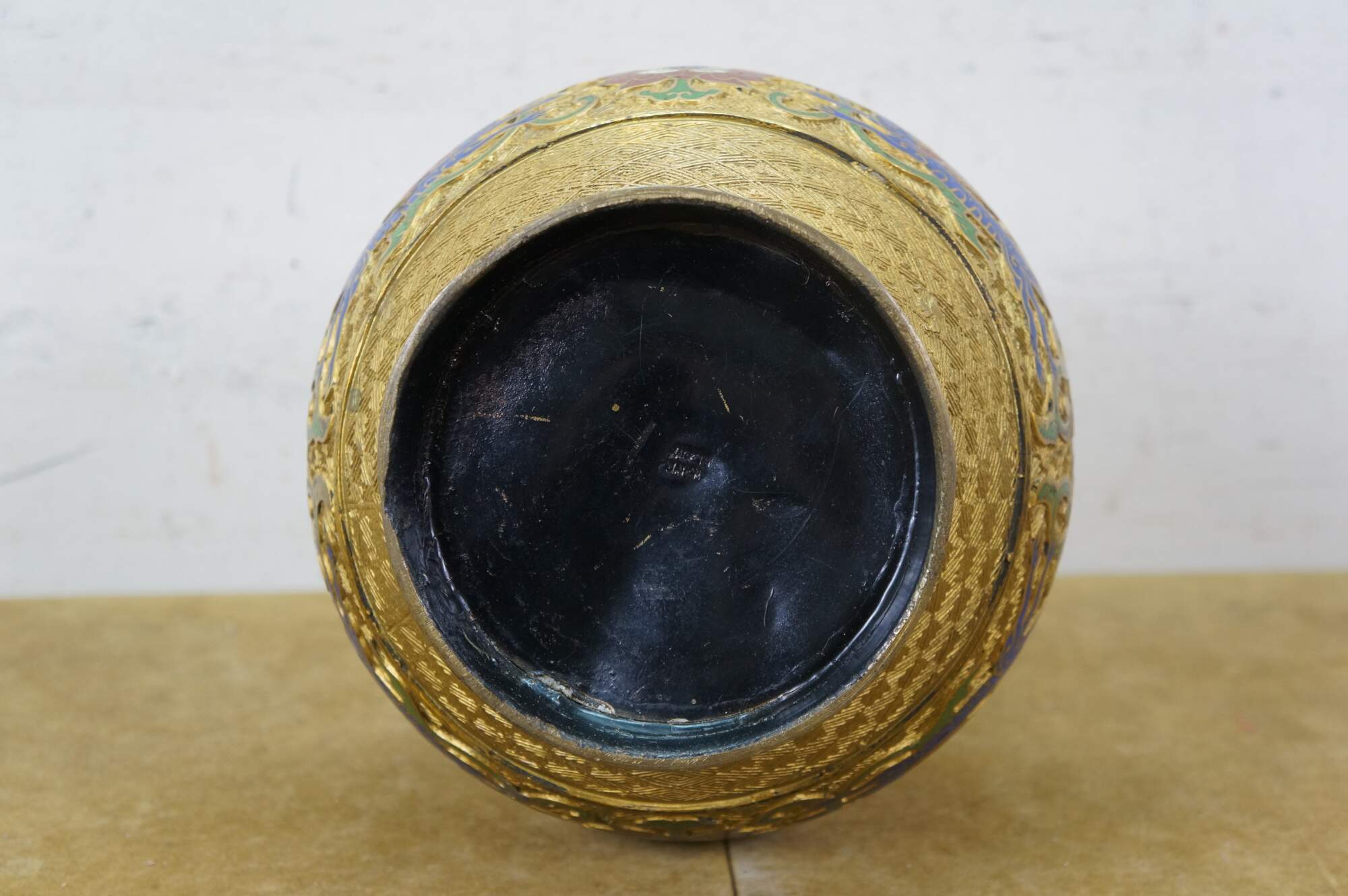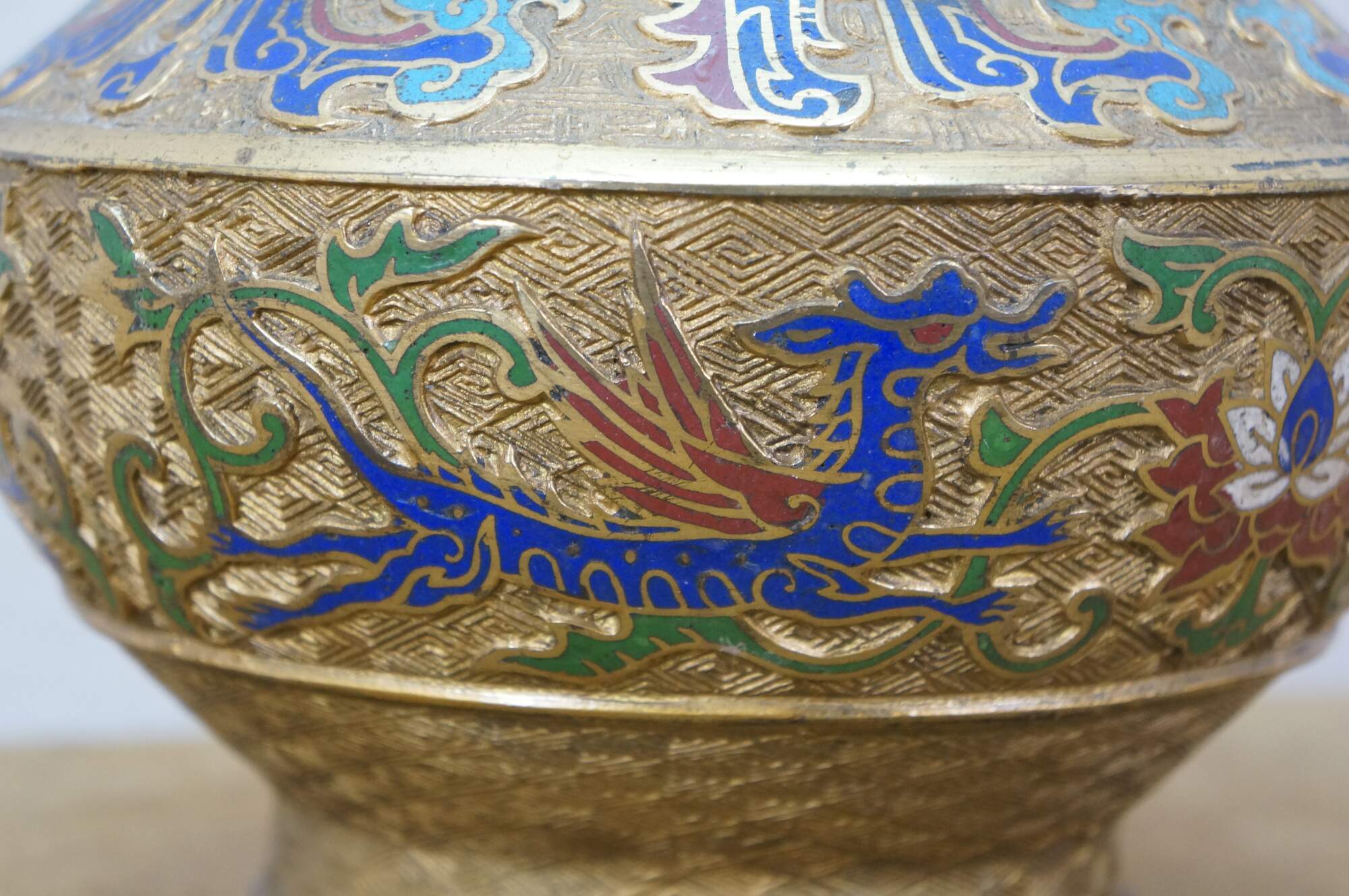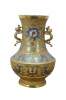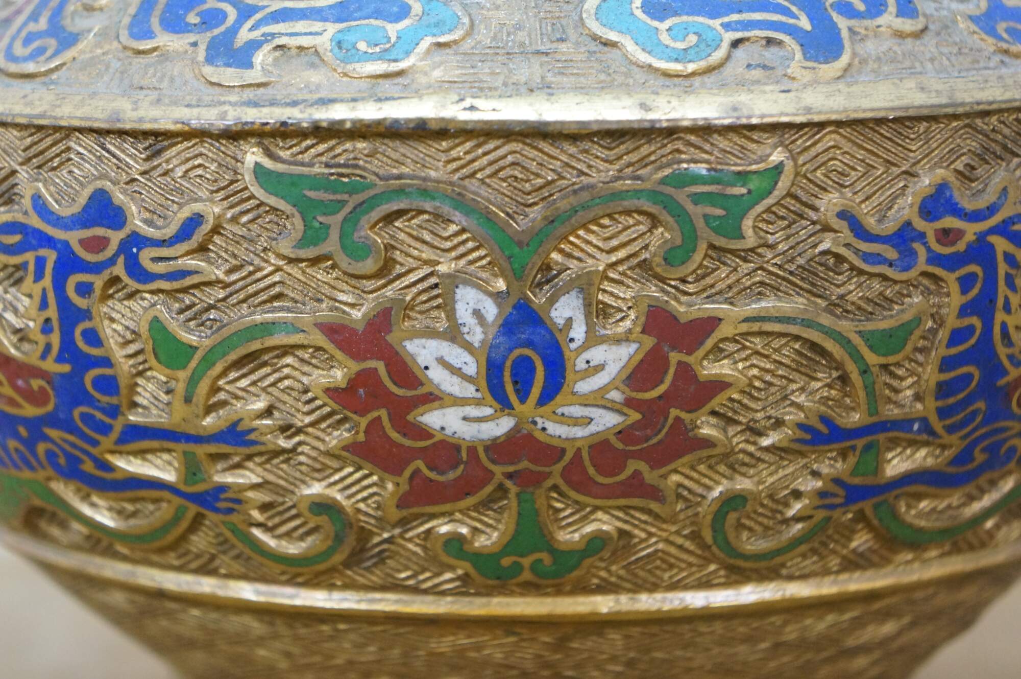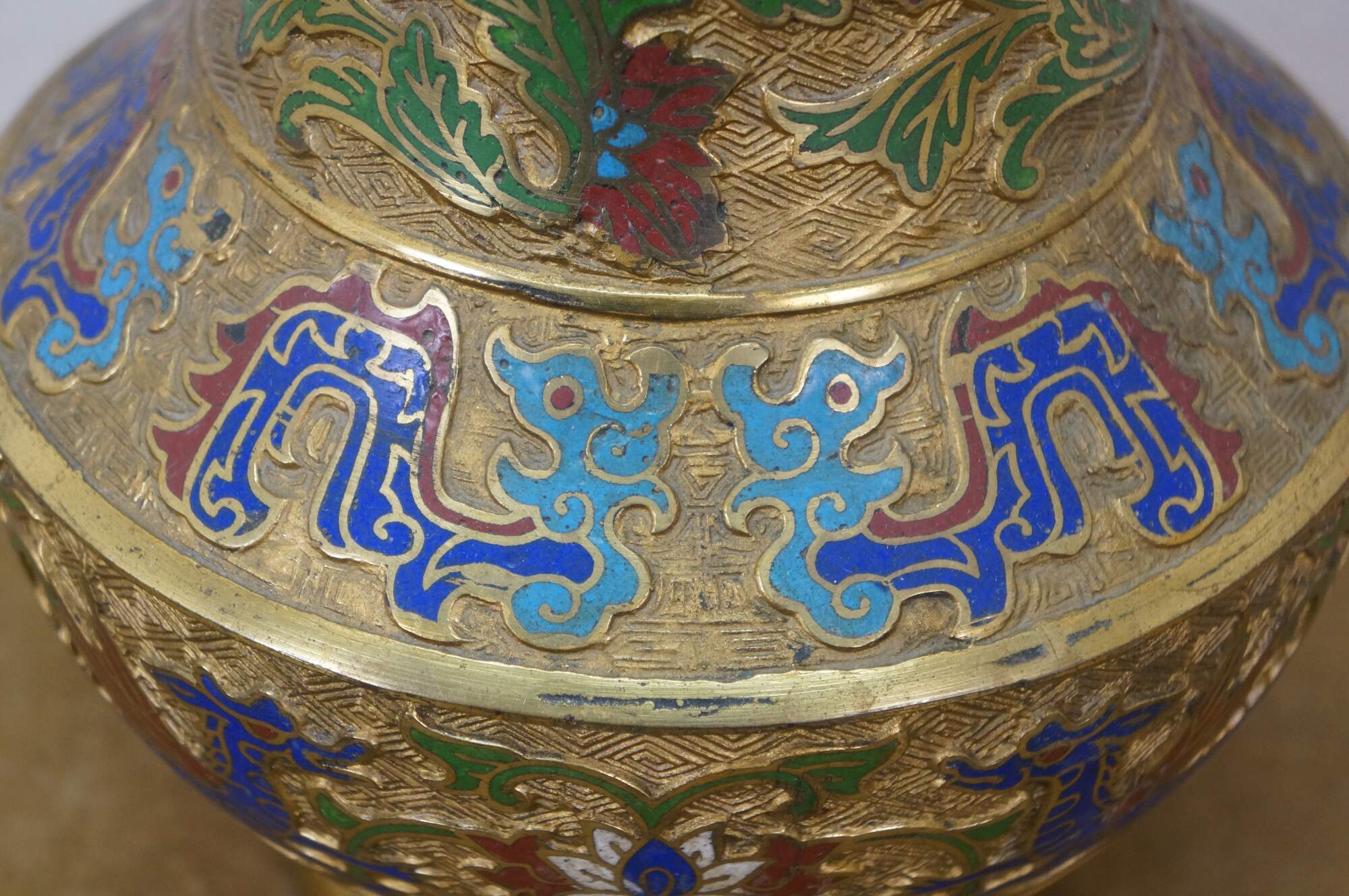 Exquisite antique Japanese bronze champlevé and cloisonné enamel vase with dragon handles. It features decorative patterns of lotus and chrysanthemum flowers, vines, and dragons. Made in Japan.