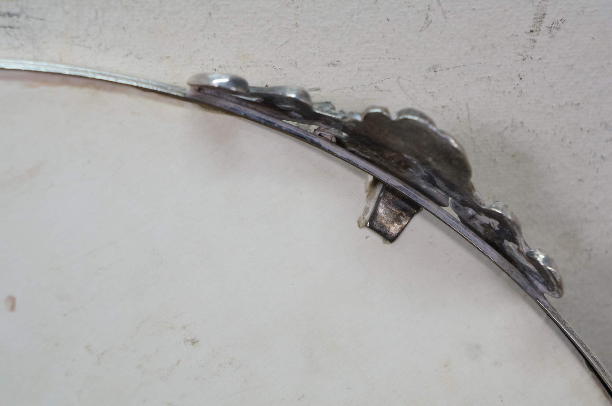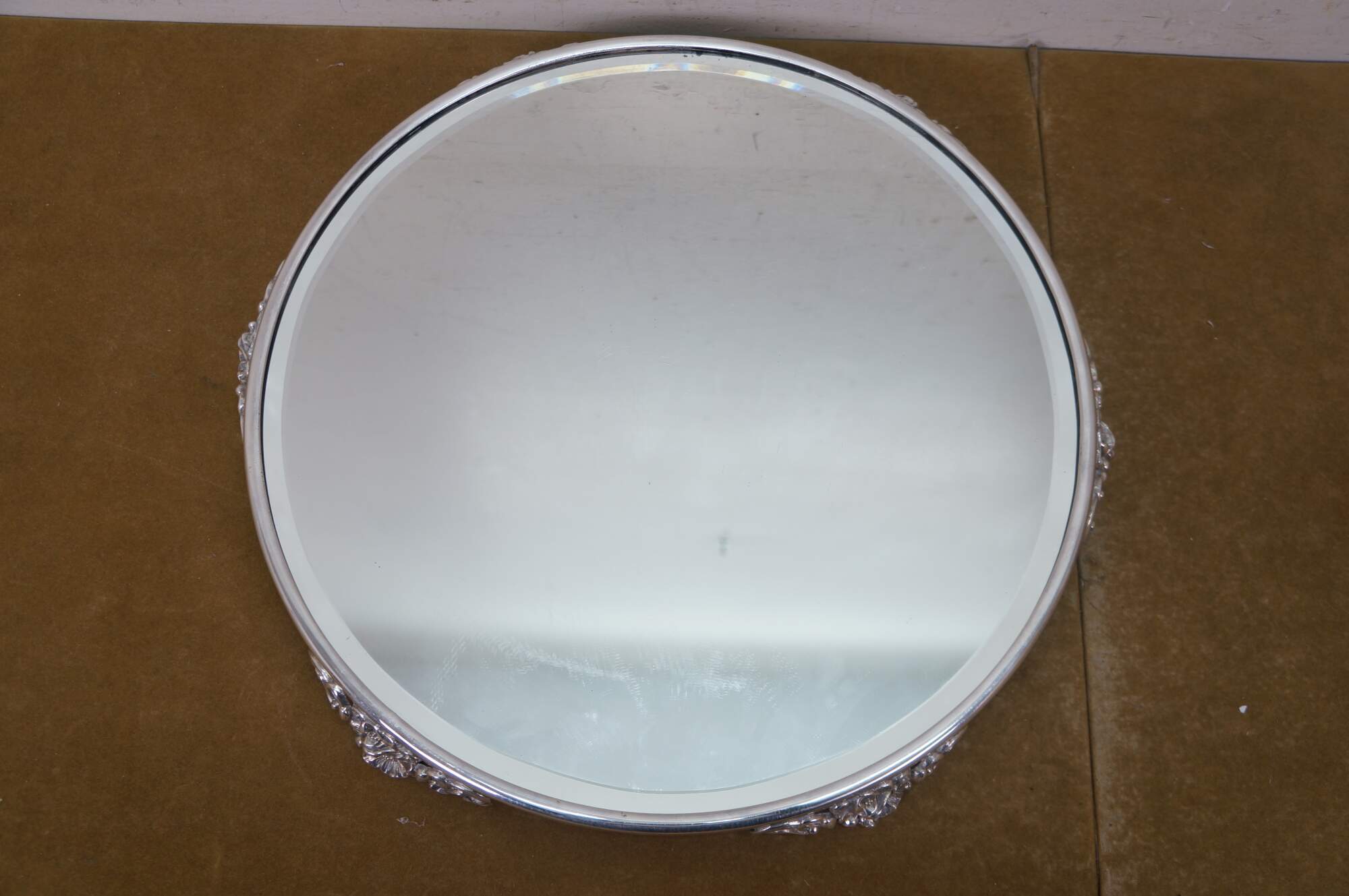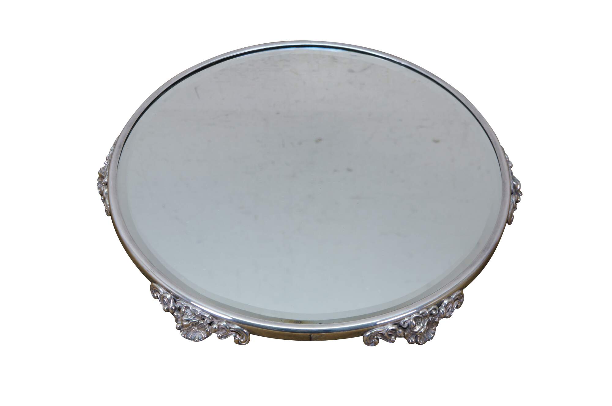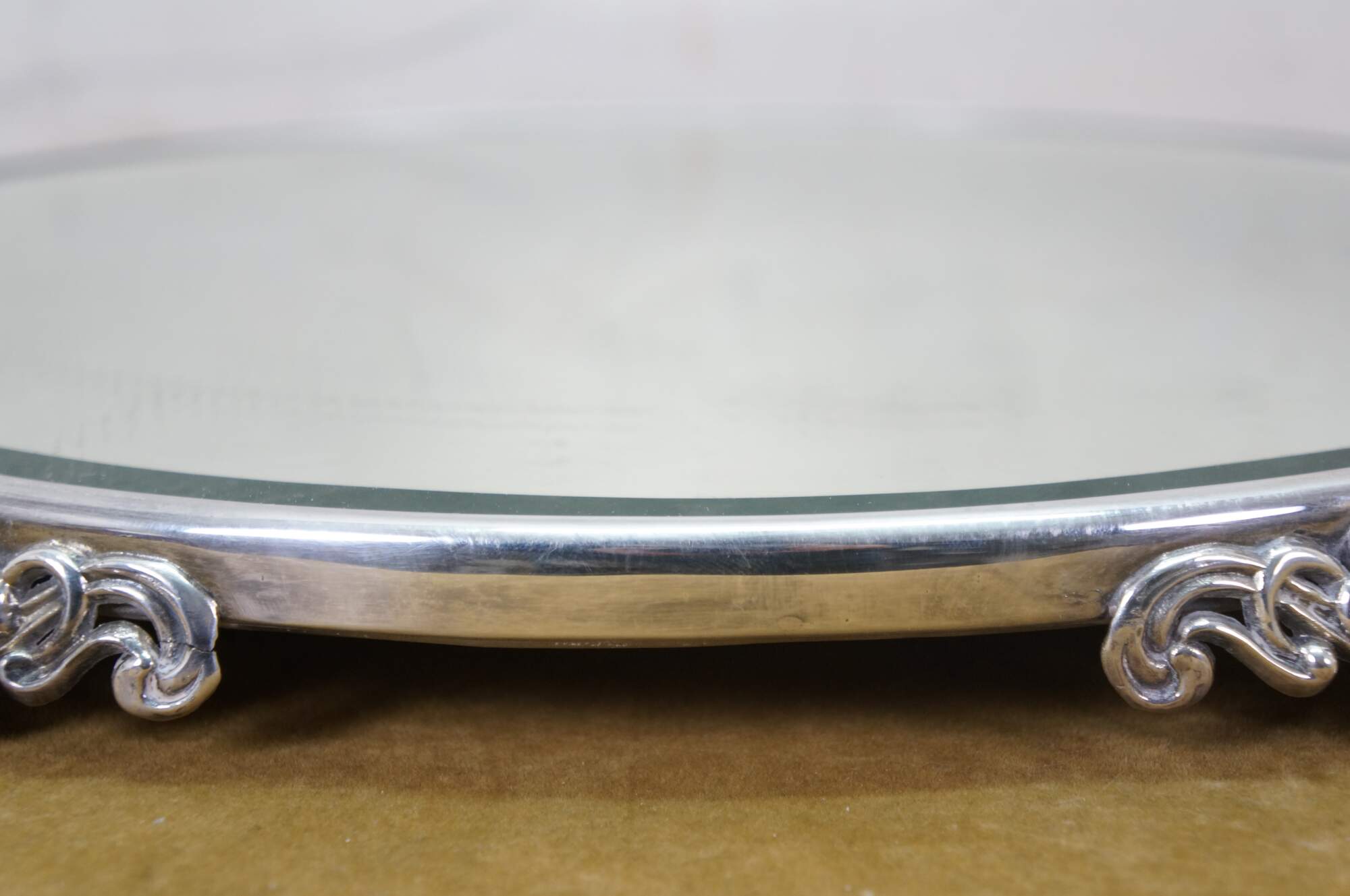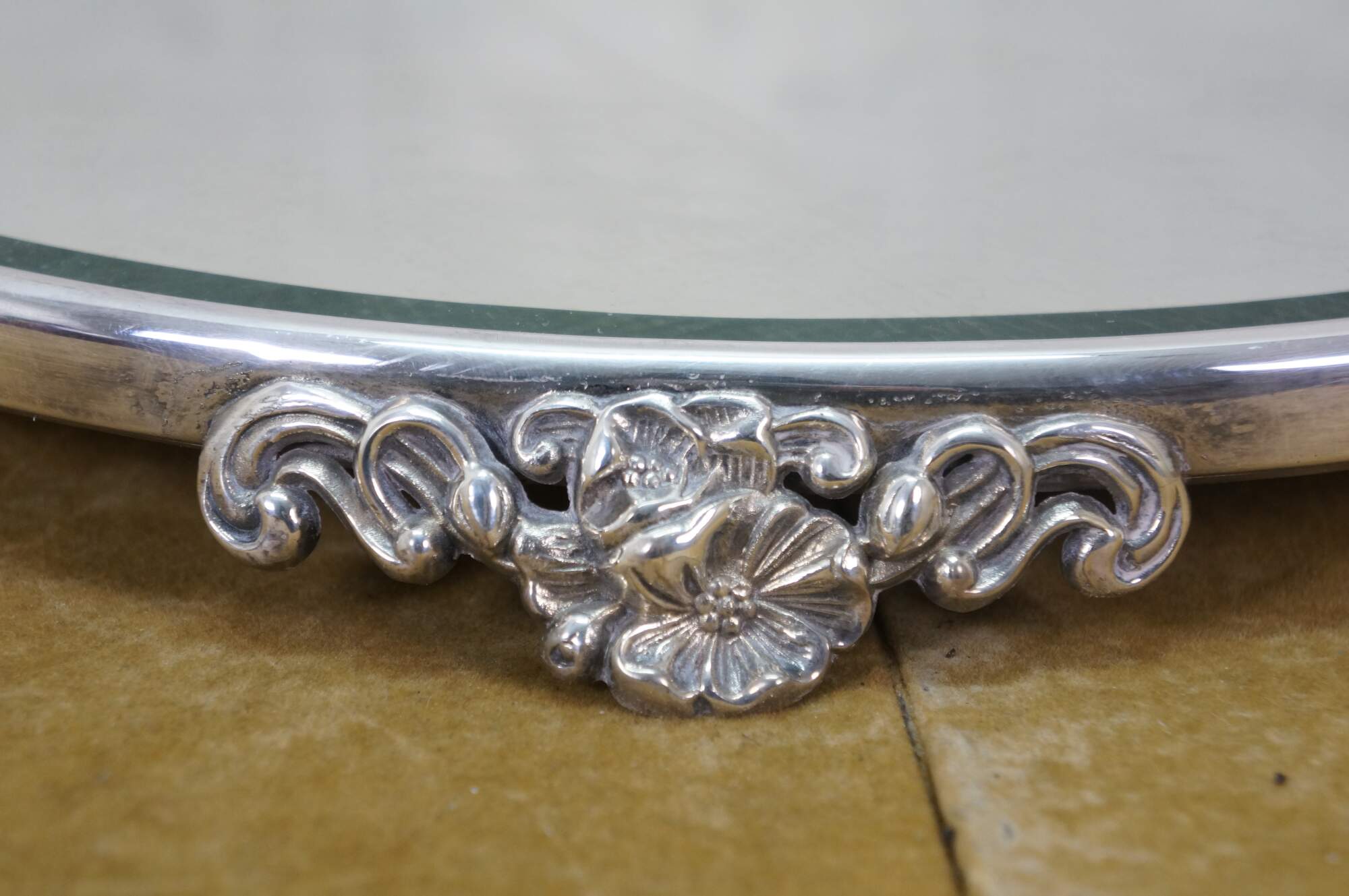 Antique Victorian silver-plated beveled mirrored plateau / centerpiece bar / dresser / vanity tray with ornate Art Nouveau floral scrolled feet.
