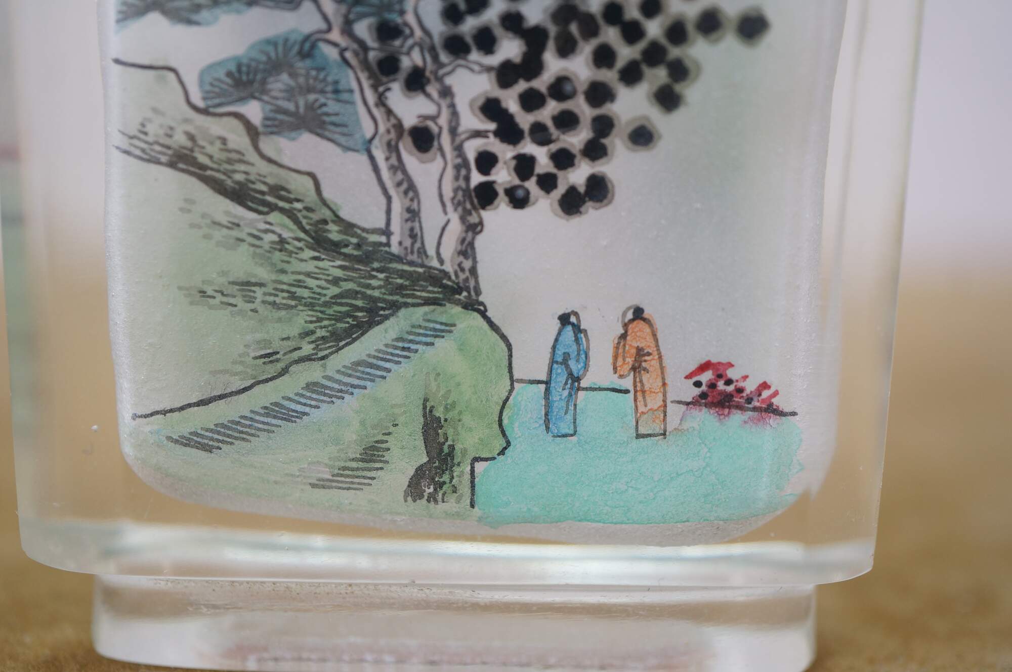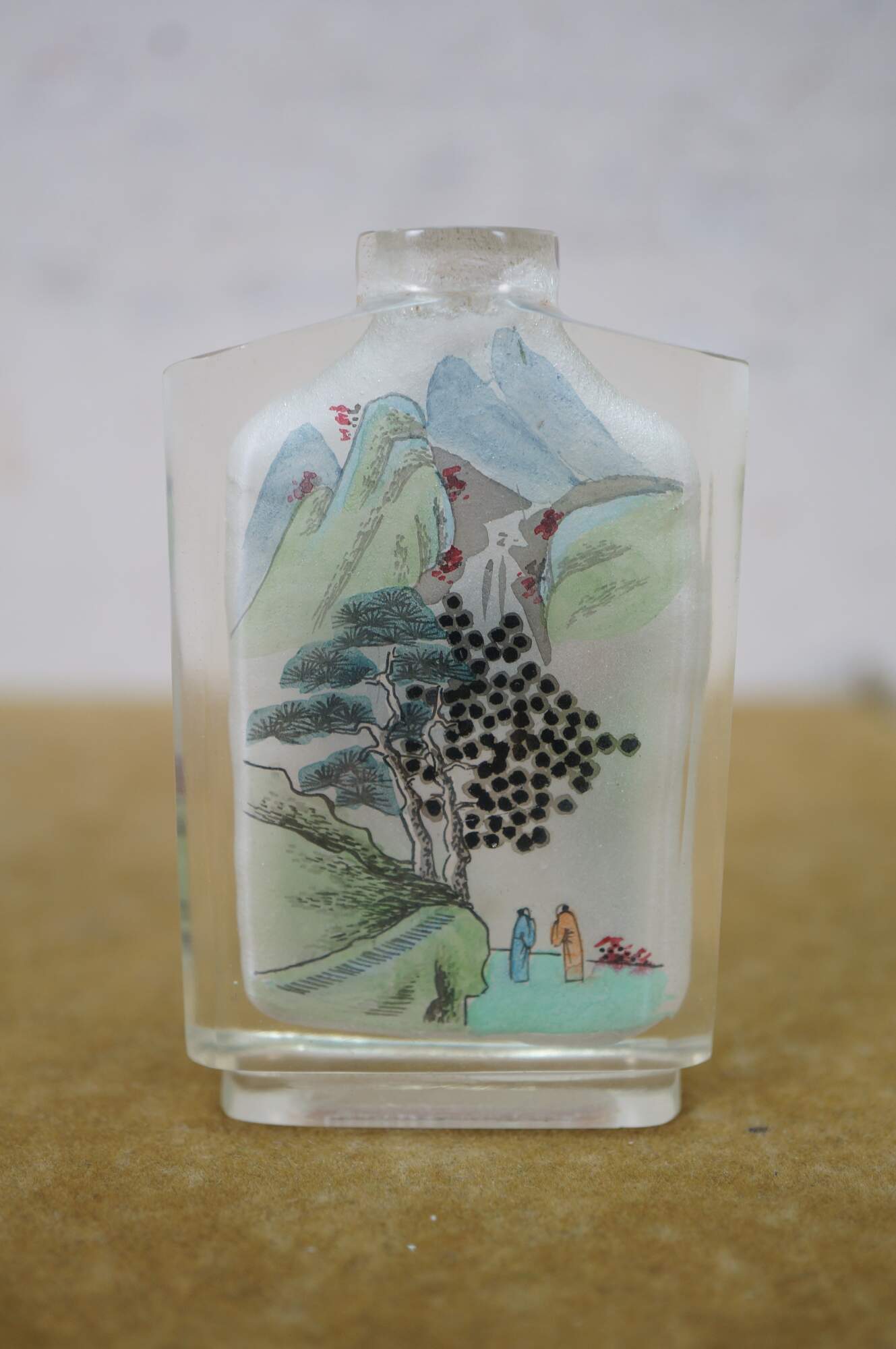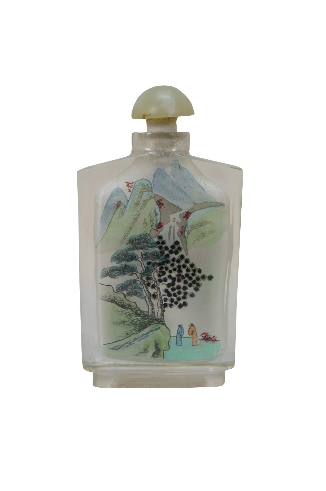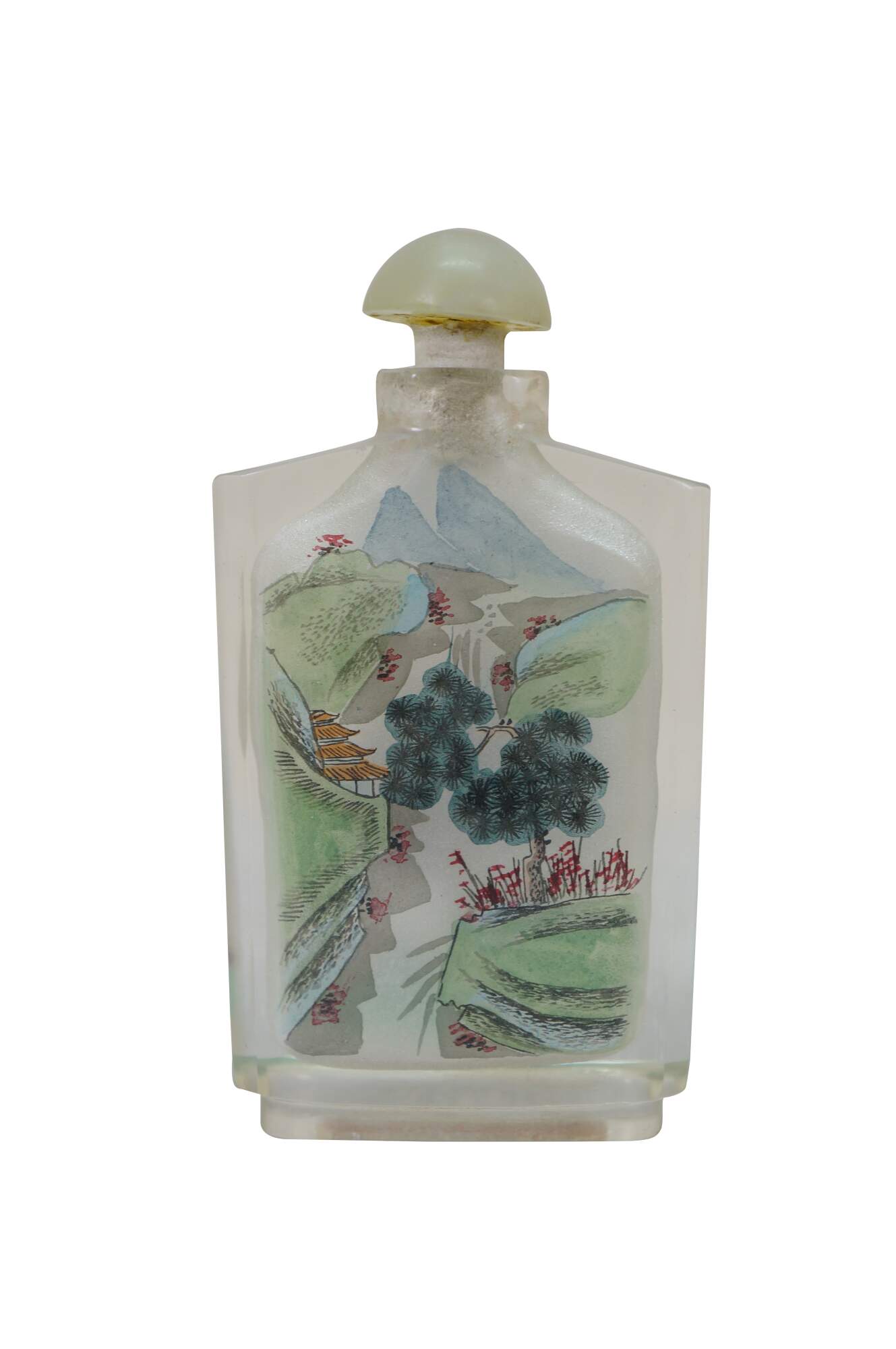 Antique Chinese reverse-painted glass snuff bottle featuring a landscape scene with mountains, Pagoda and figures under a tree.