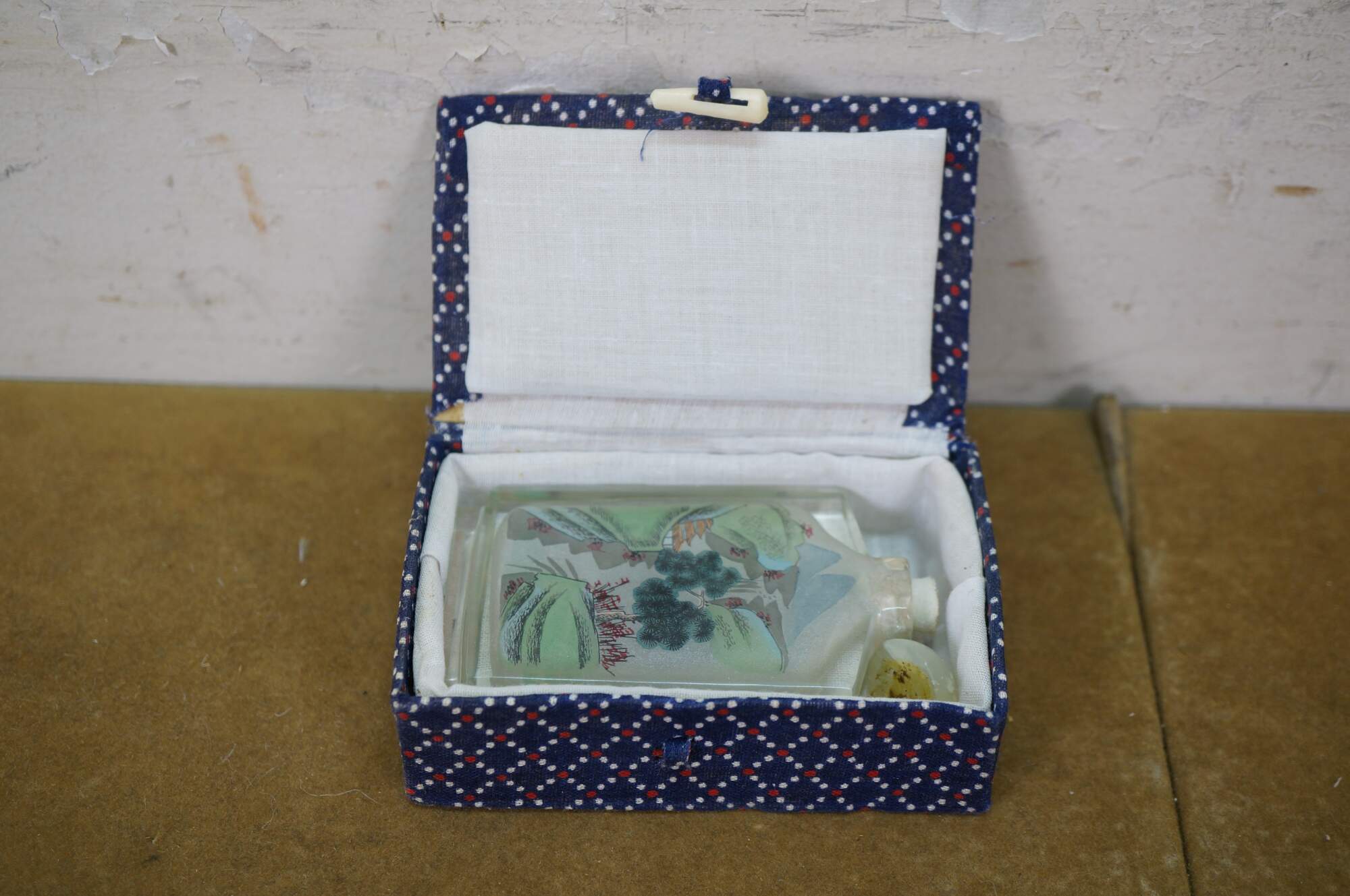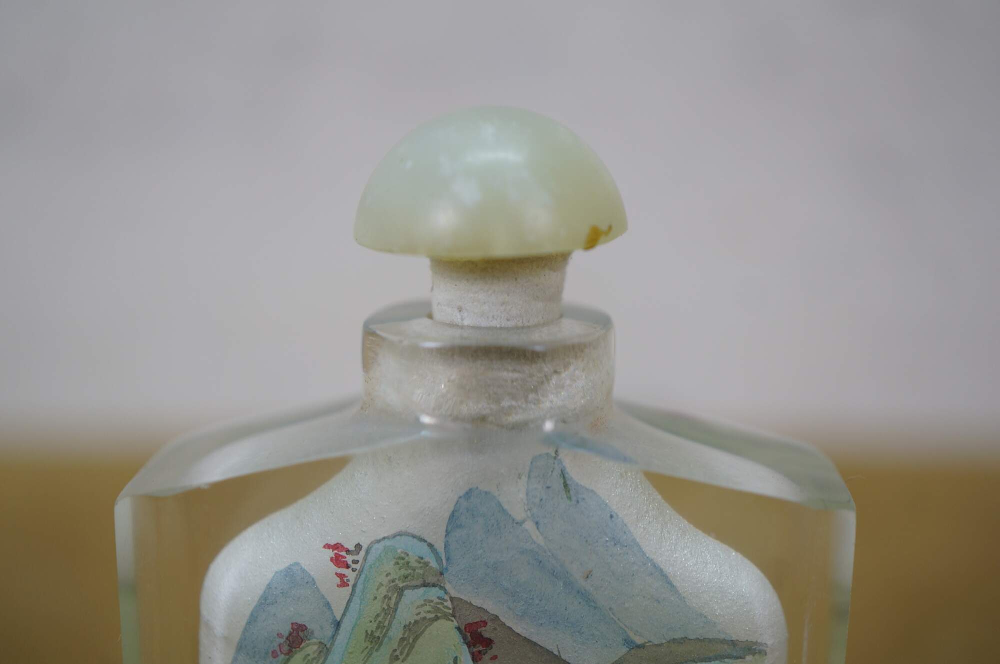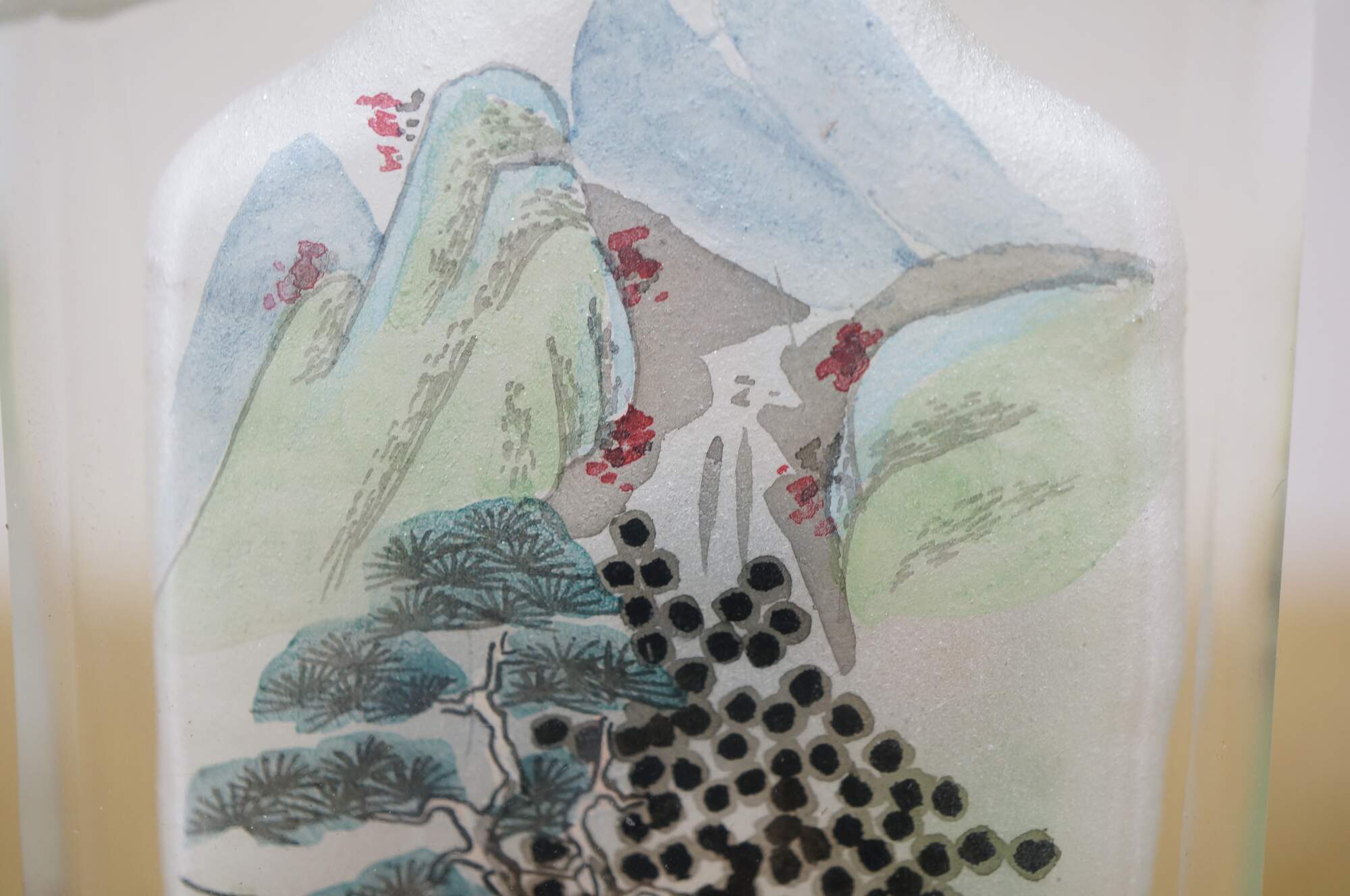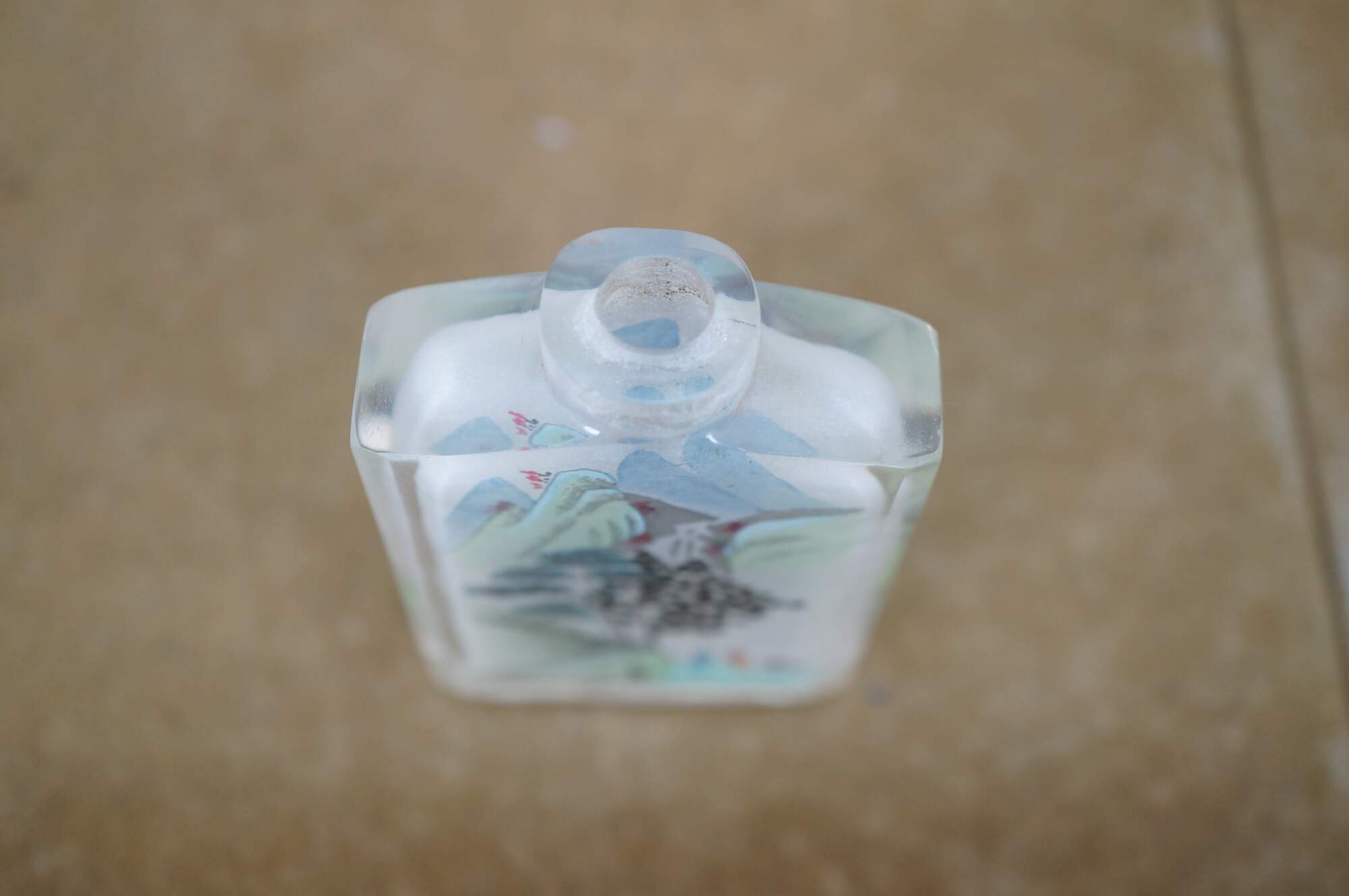 Antique Chinese reverse-painted glass snuff bottle featuring a landscape scene with mountains, Pagoda and figures under a tree.