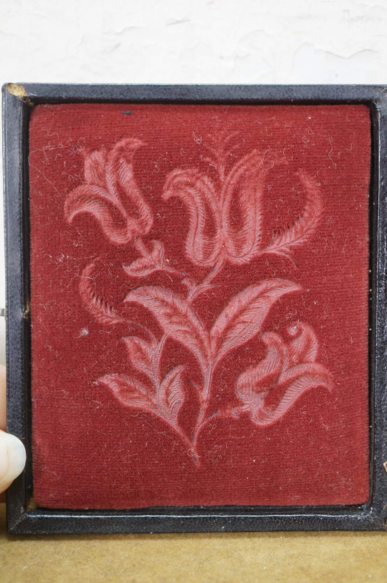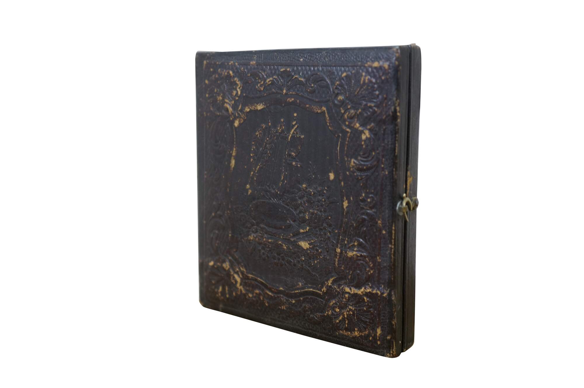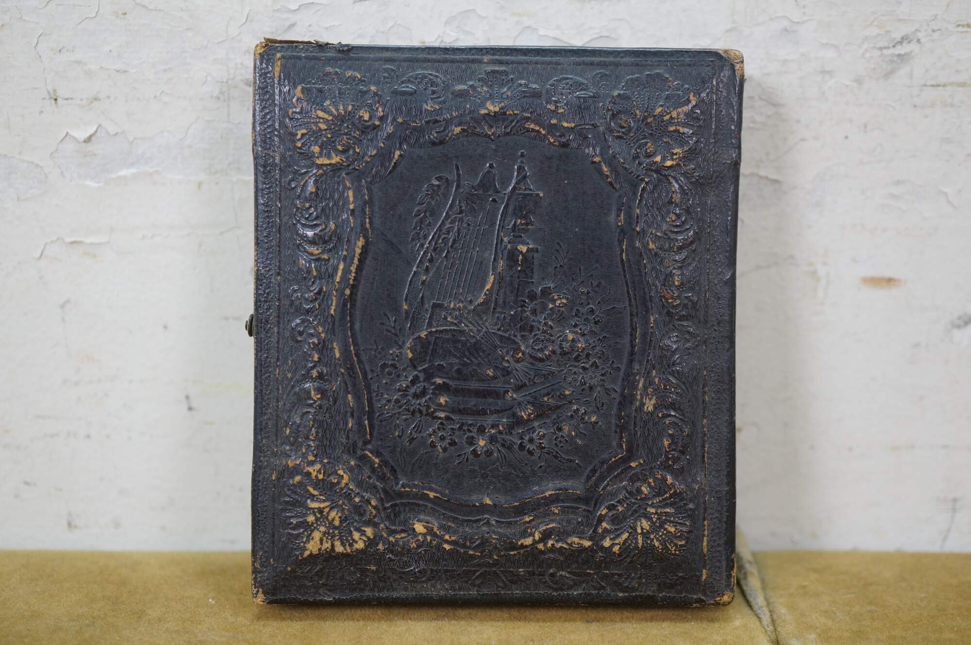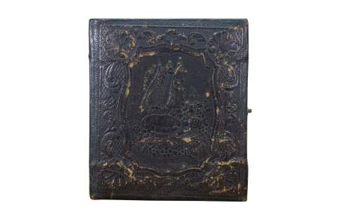 Antique, mid-1800s daguerreotype case, made of leather or gutta-percha, designed to hold an early photograph. The case features an ornate, embossed harp design on the cover. Daguerreotypes were the first commercially practical photographic process, popular from 1839 into the early 1860s. The cases were designed to protect the delicate image, which was made on a silver-coated copper plate.