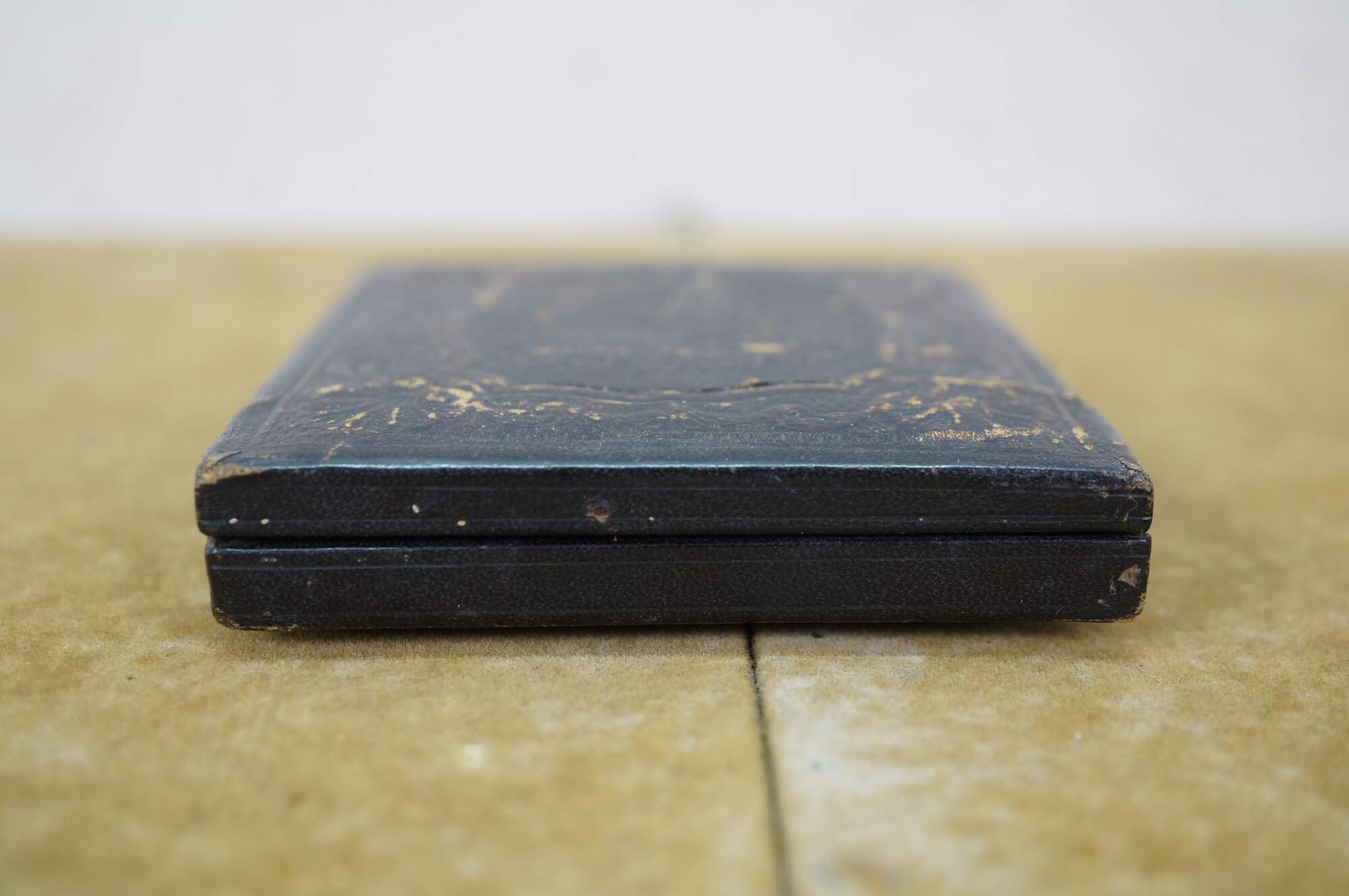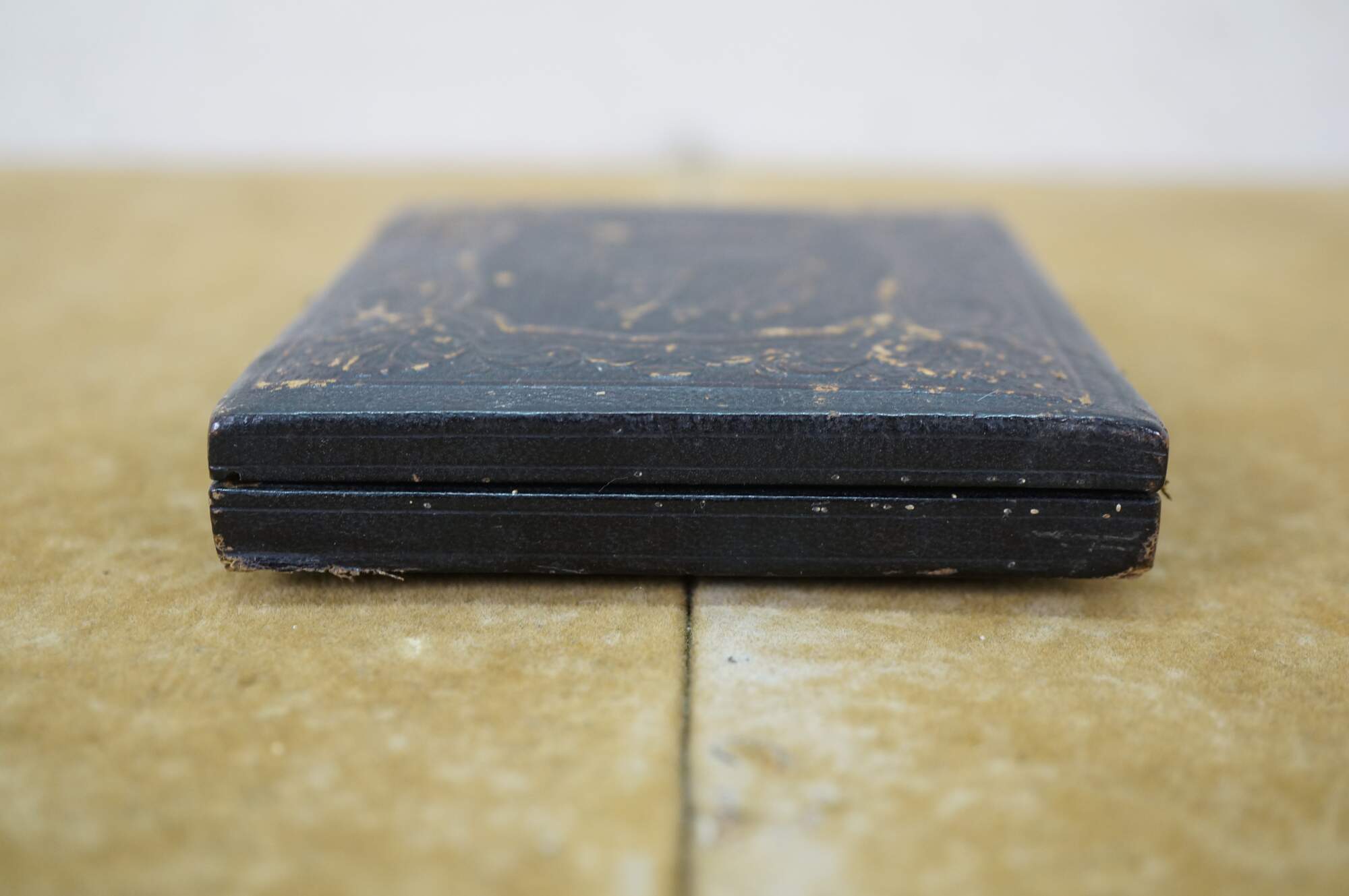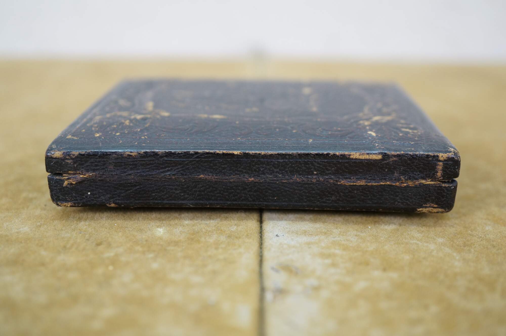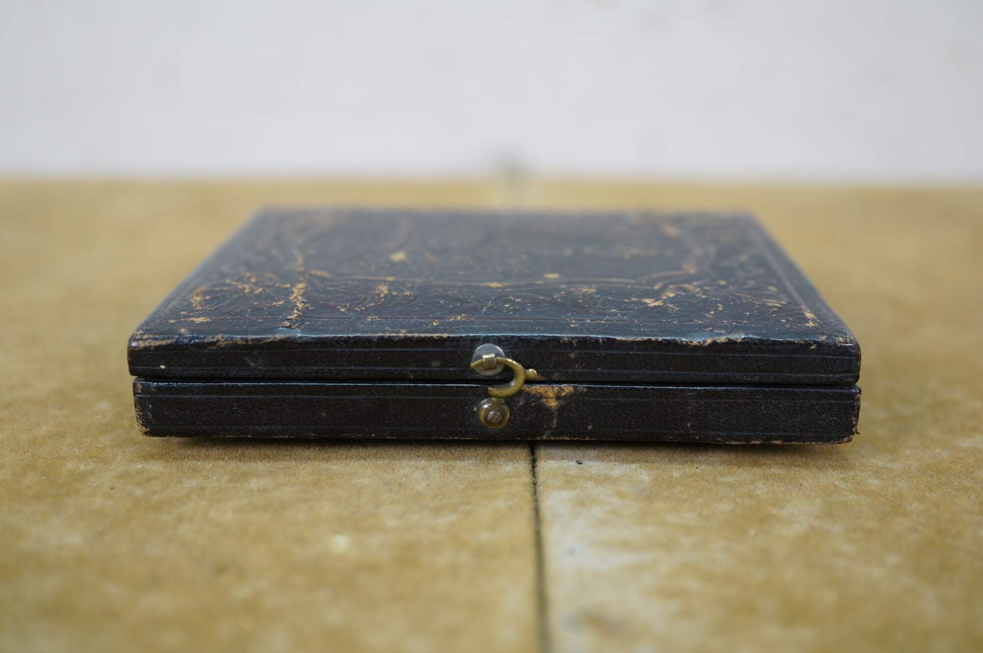 Antique, mid-1800s daguerreotype case, made of leather or gutta-percha, designed to hold an early photograph. The case features an ornate, embossed harp design on the cover. Daguerreotypes were the first commercially practical photographic process, popular from 1839 into the early 1860s. The cases were designed to protect the delicate image, which was made on a silver-coated copper plate.