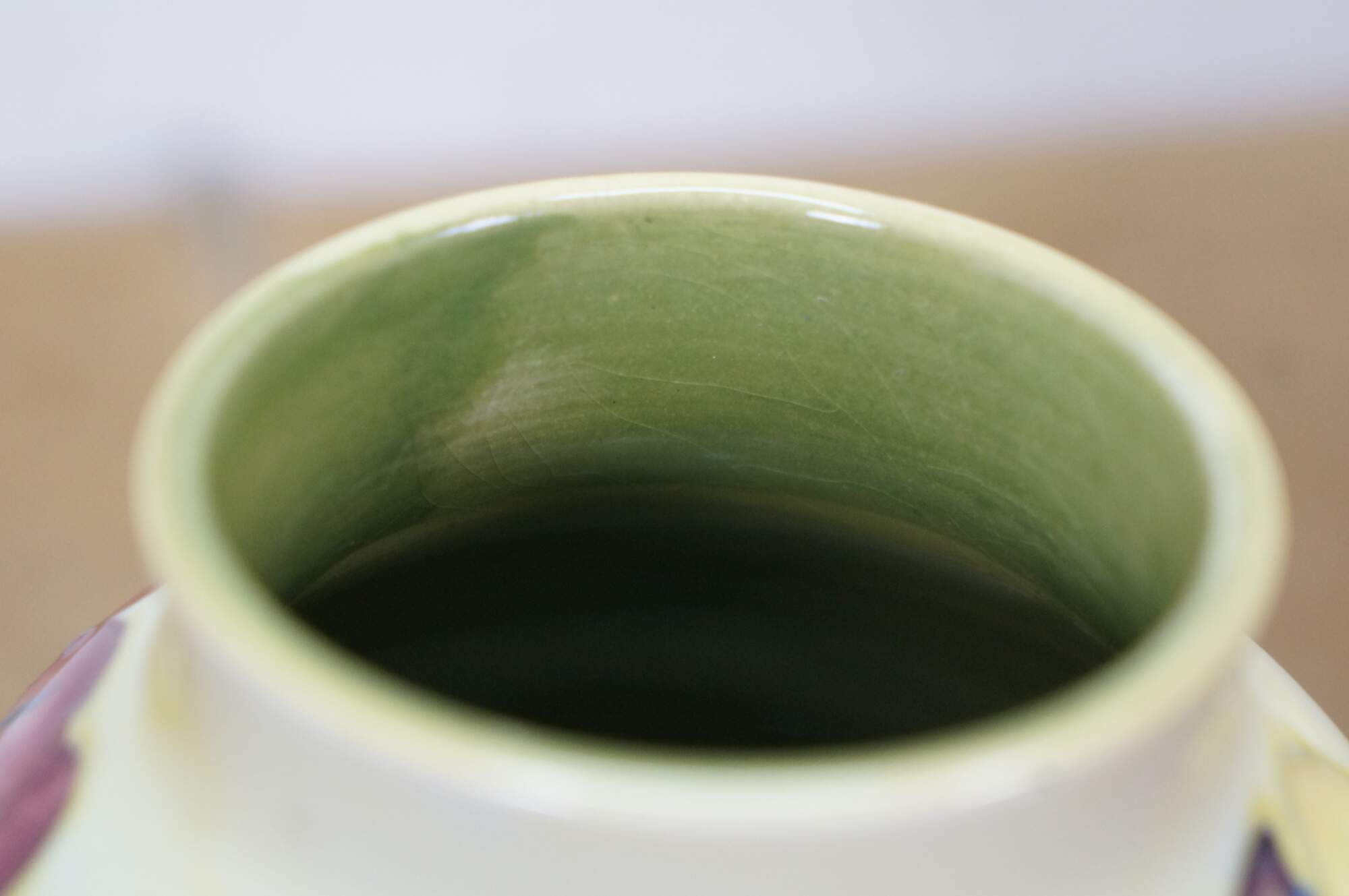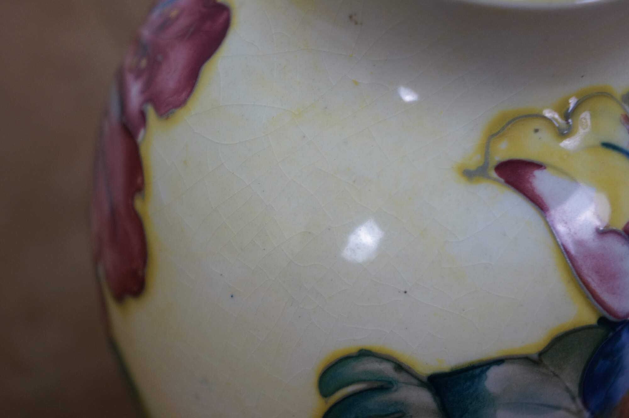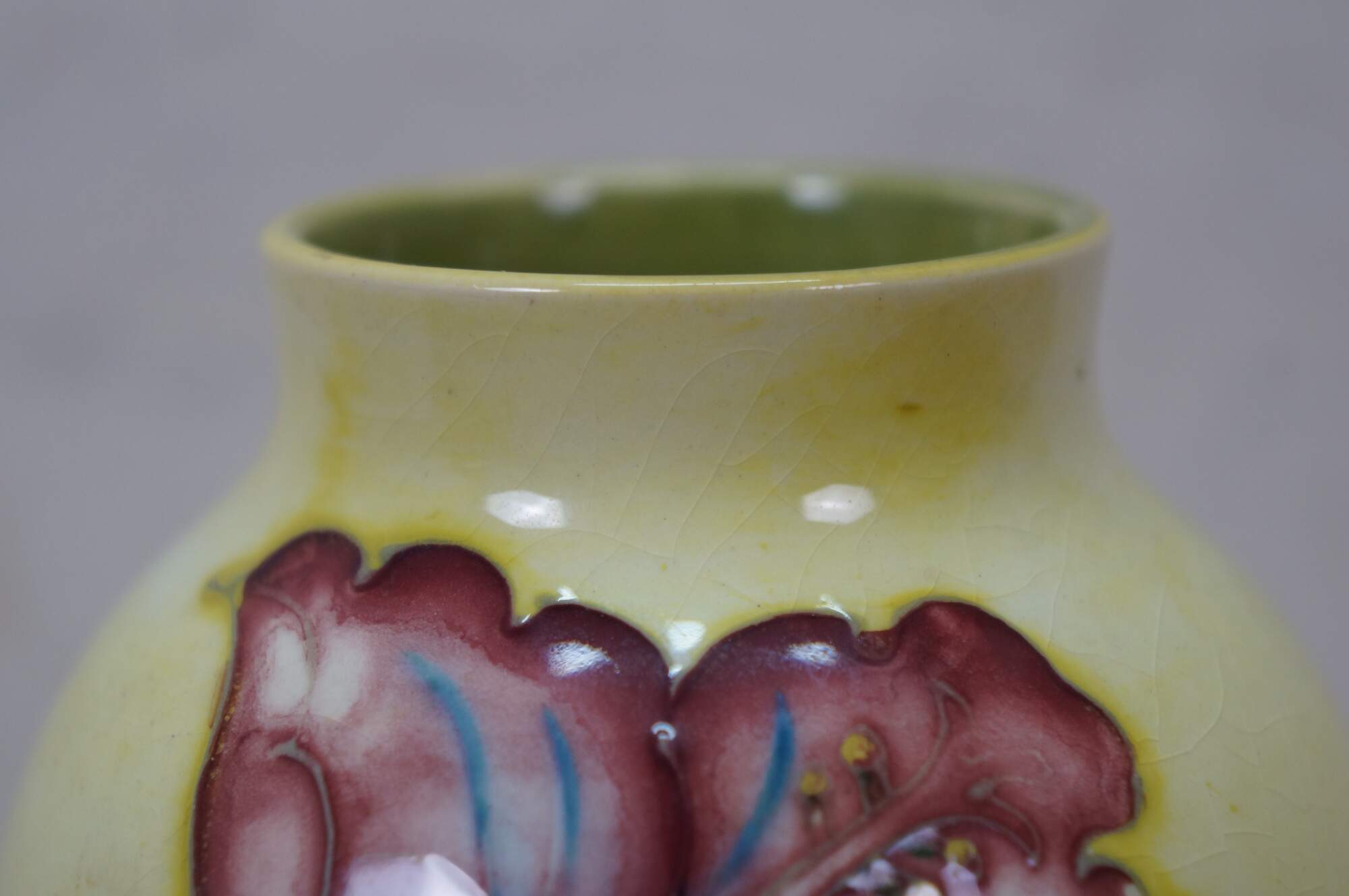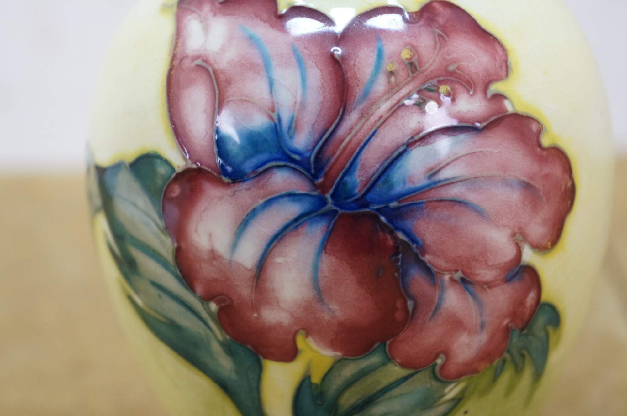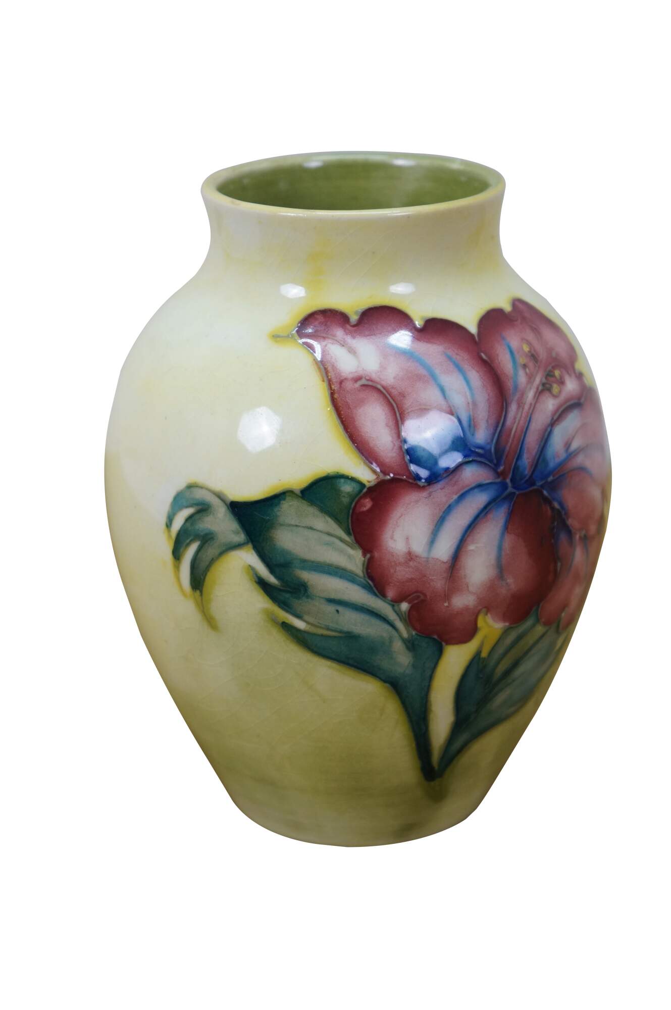 Mid Century Moorcroft pottery vase in the Hibiscus pattern. The vase features large blue and yellow hibiscus flowers with green leaves on a cream-yellow-colored ground. It was produced by the British pottery company Moorcroft between 1947 and 1953. The pattern was designed by Walter Moorcroft and crafted in Stoke-on-Trent, England.