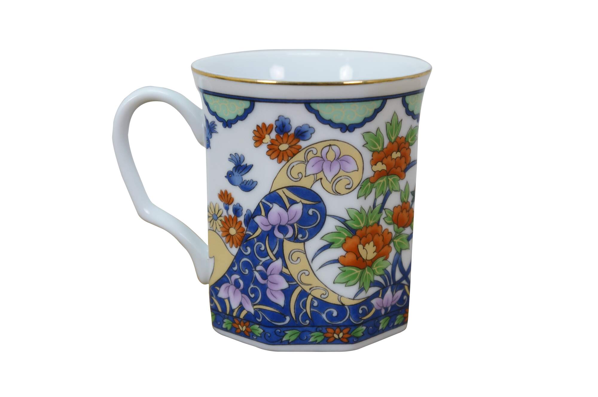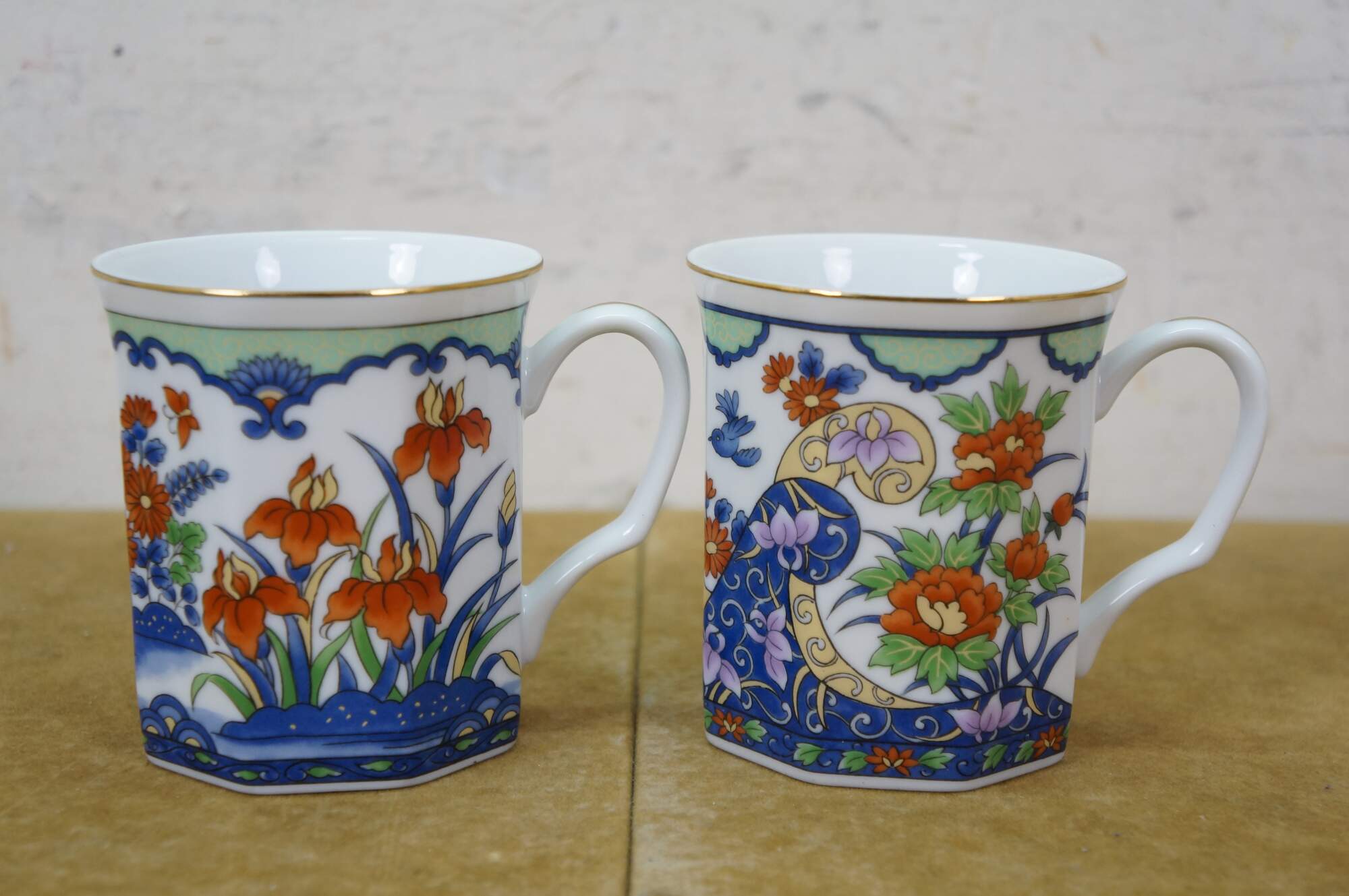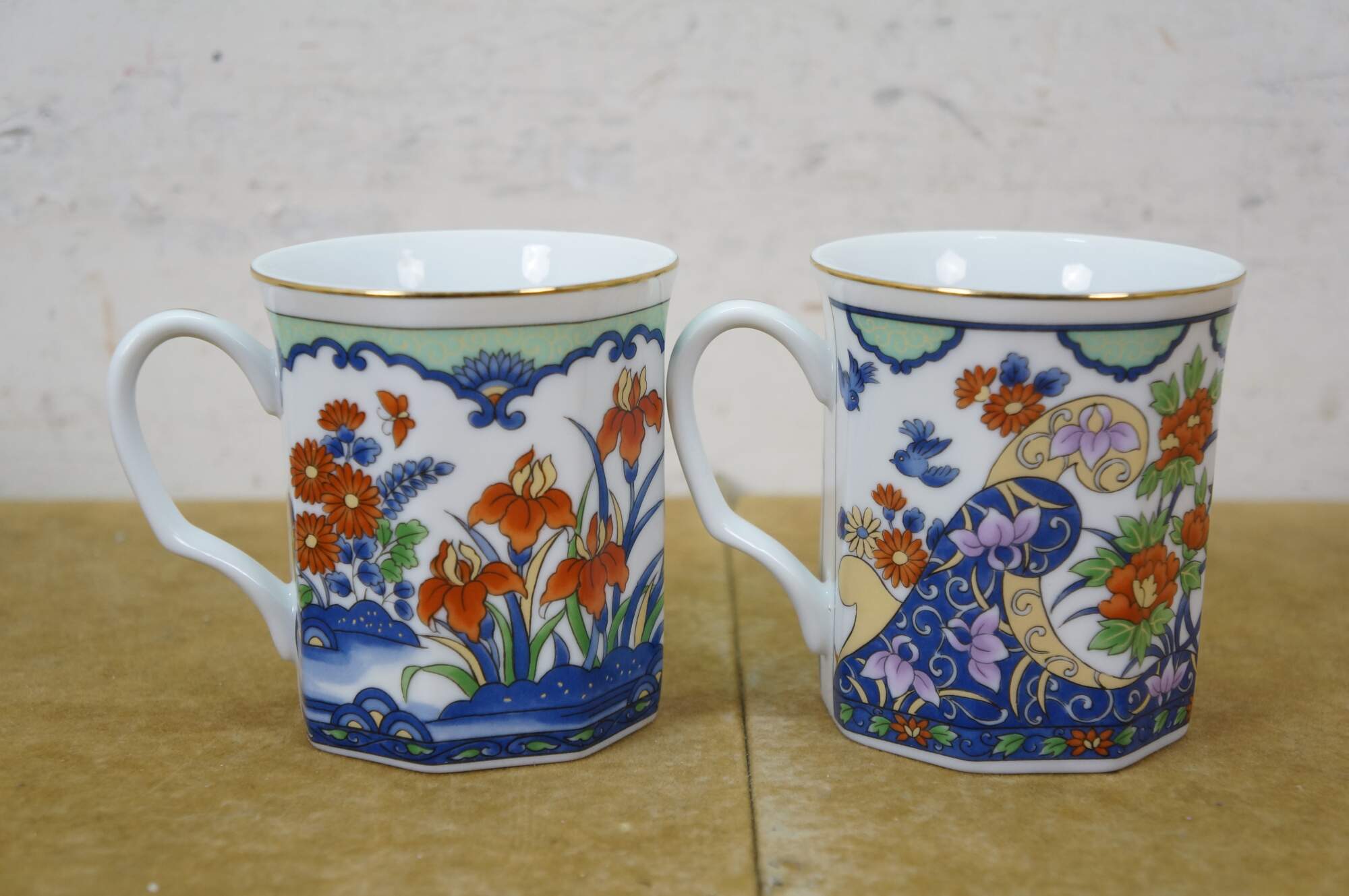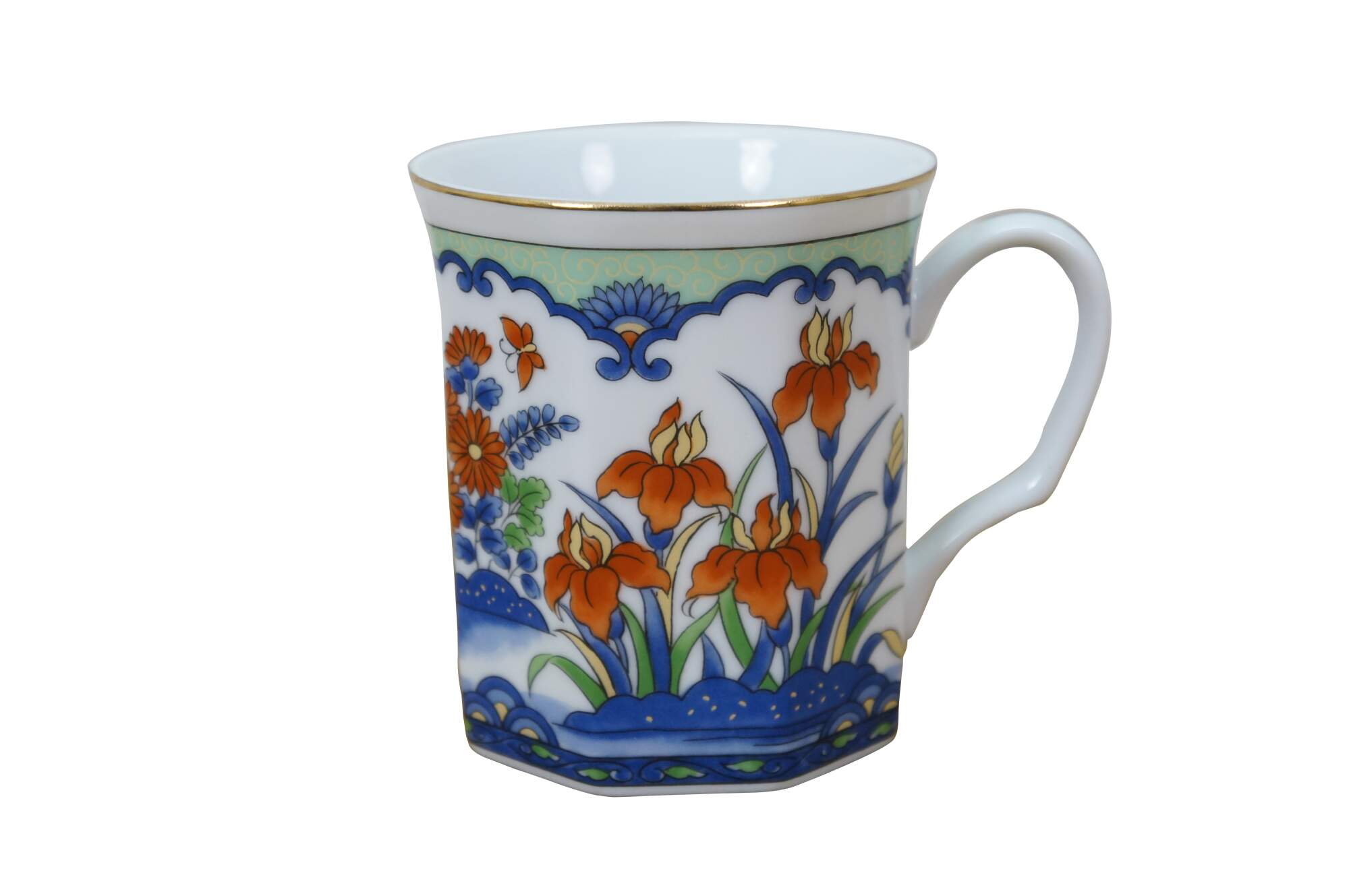 Vintage Seizan Fine China tea / coffee mugs with Japanese Iris garden design. The mug is made in Japan, has an octagonal base, and is multicoloured with blue, orange, green, yellow, and gold trim.