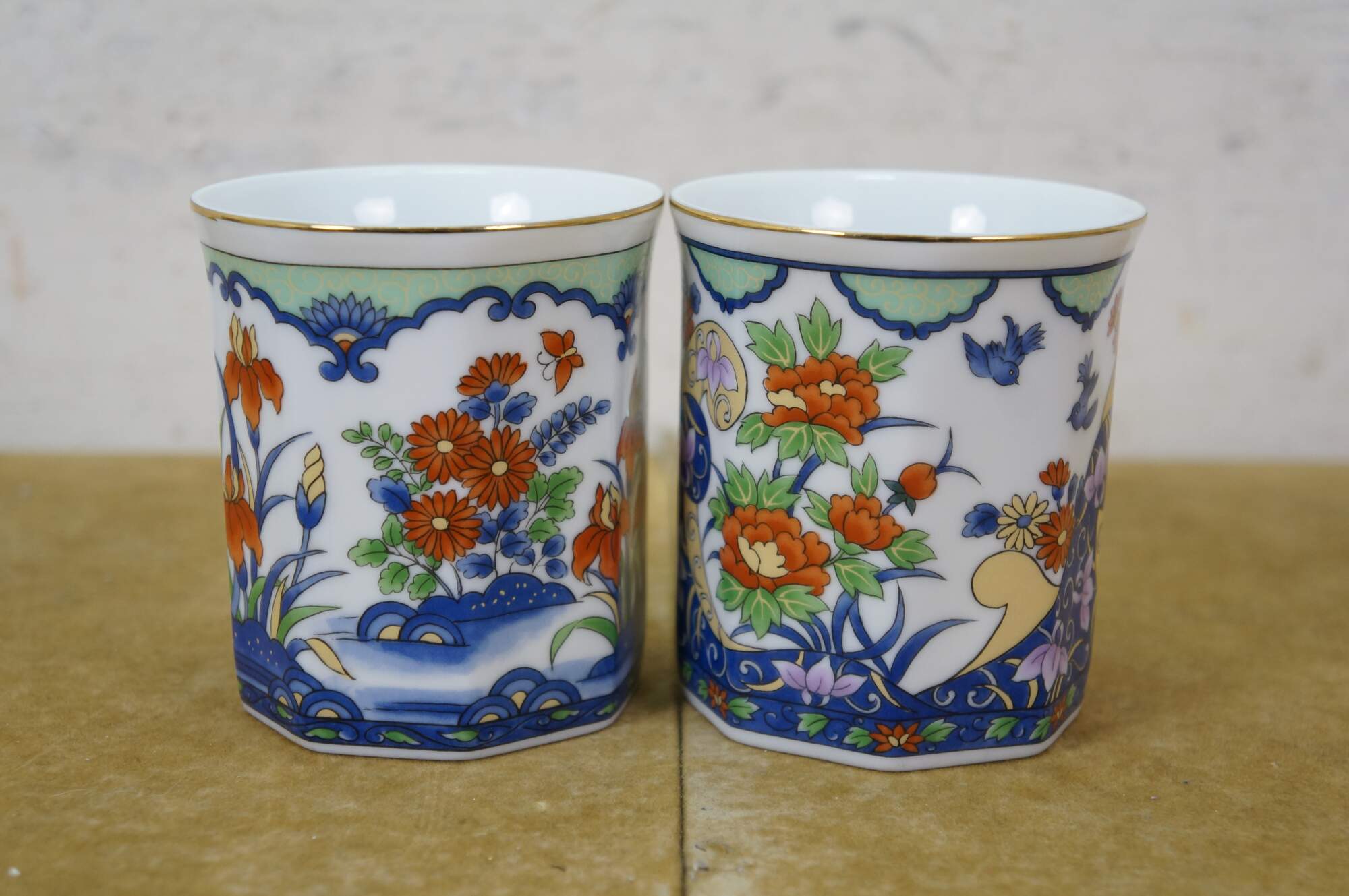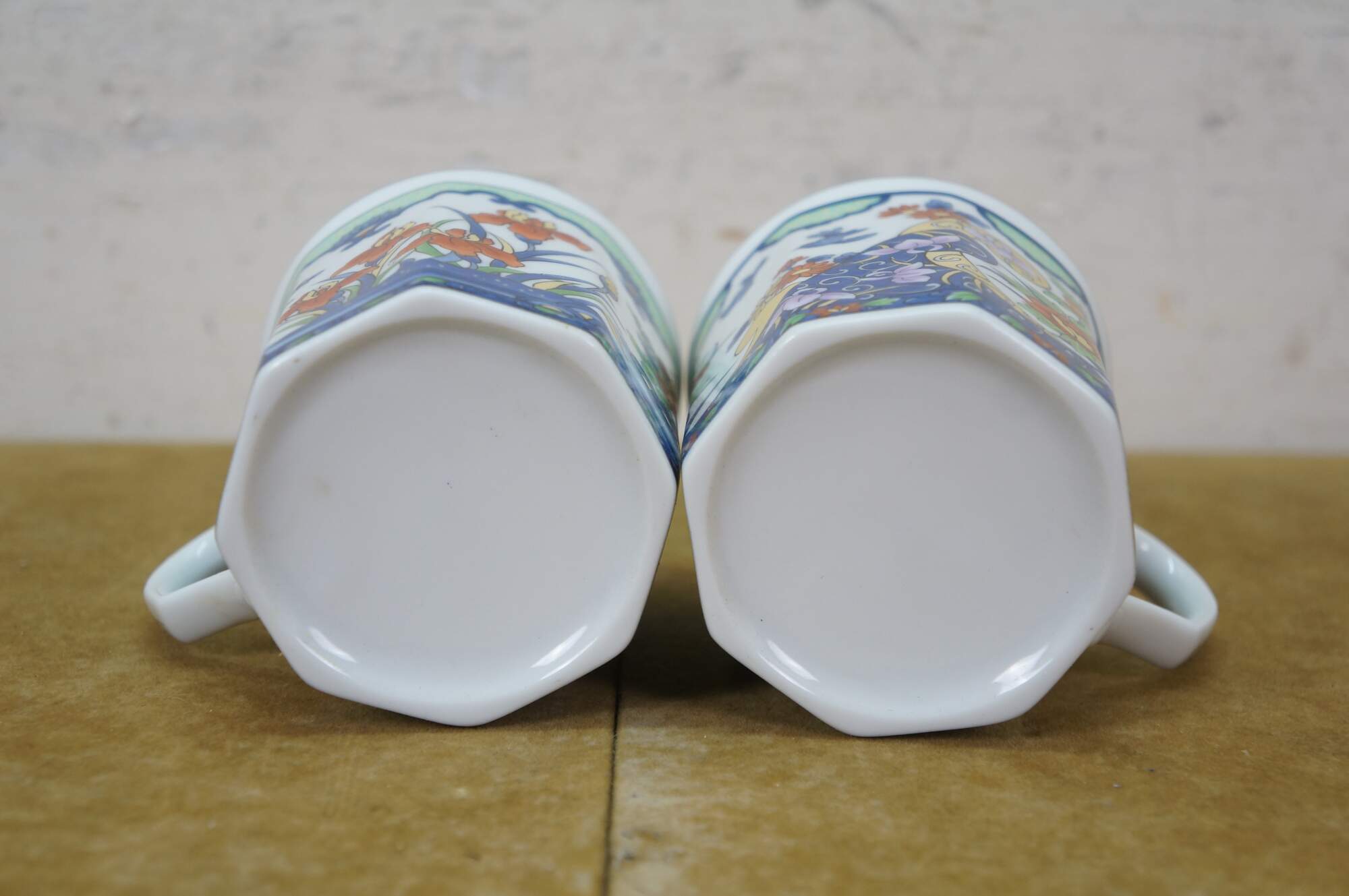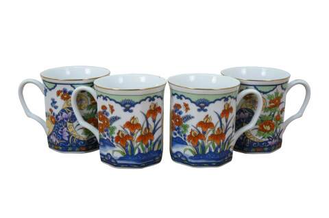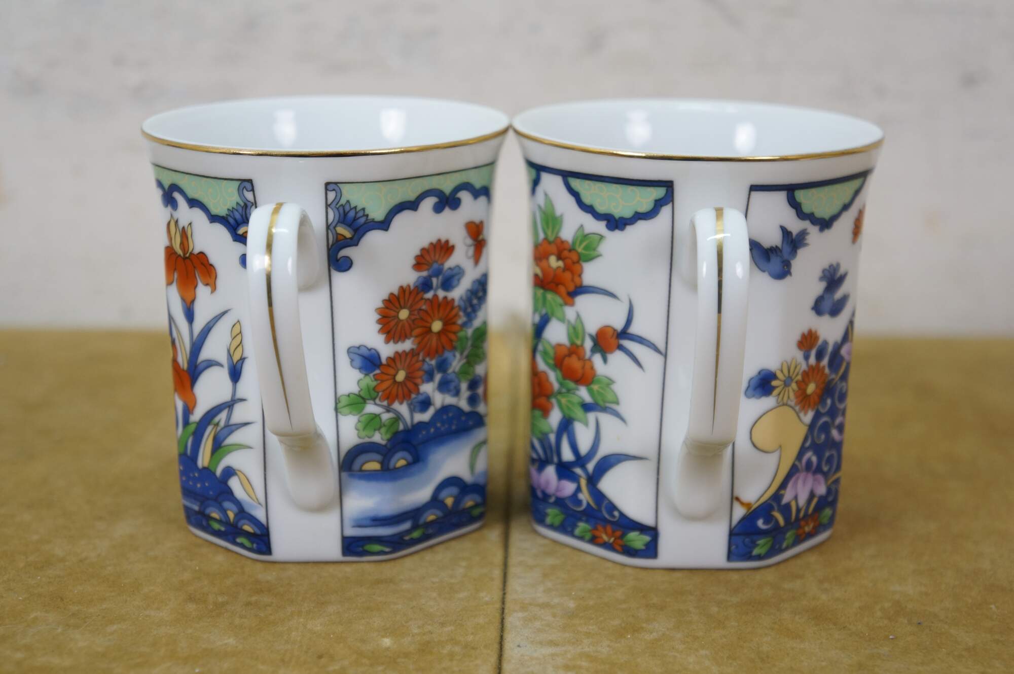 Vintage Seizan Fine China tea / coffee mugs with Japanese Iris garden design. The mug is made in Japan, has an octagonal base, and is multicoloured with blue, orange, green, yellow, and gold trim.