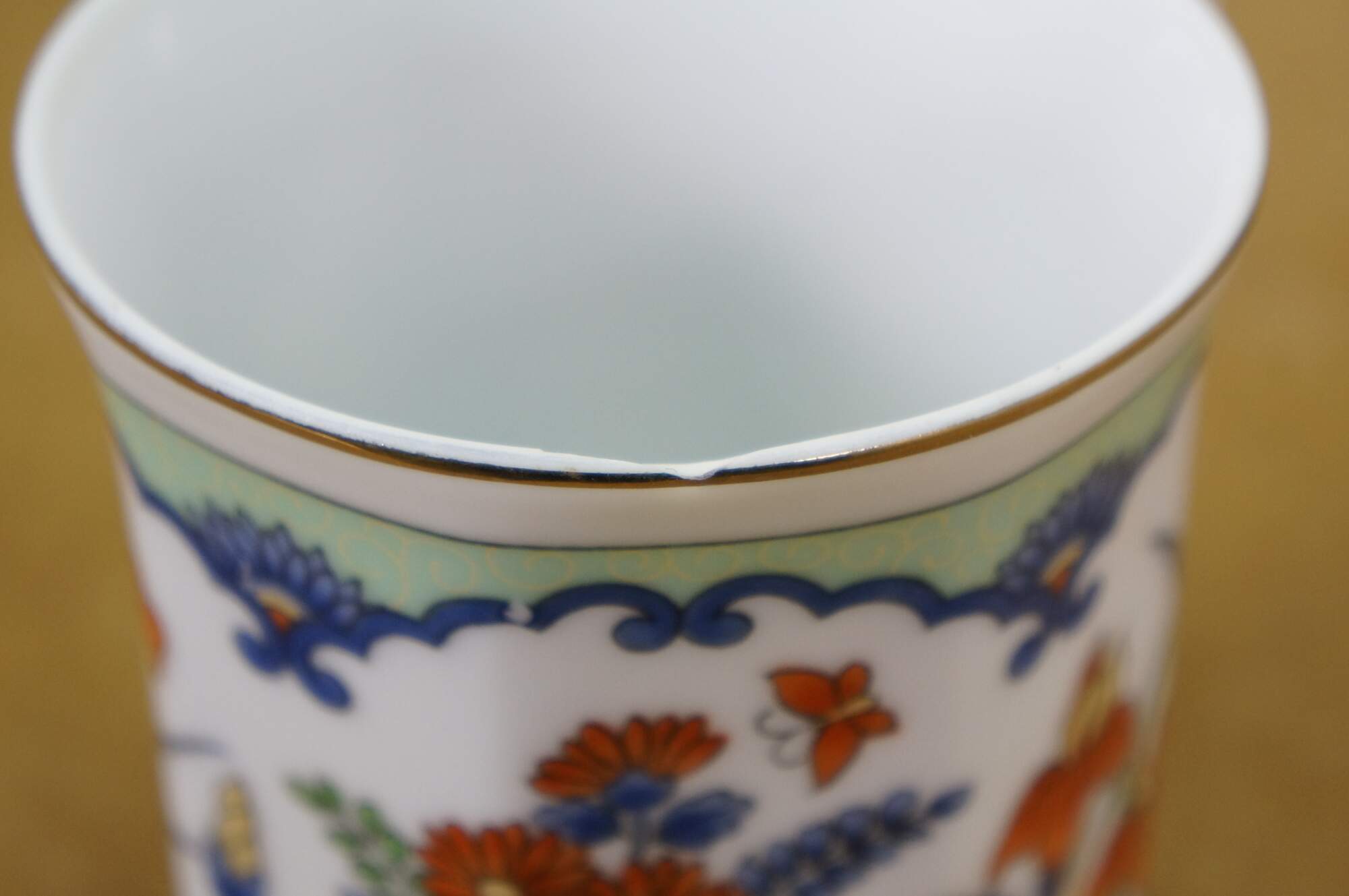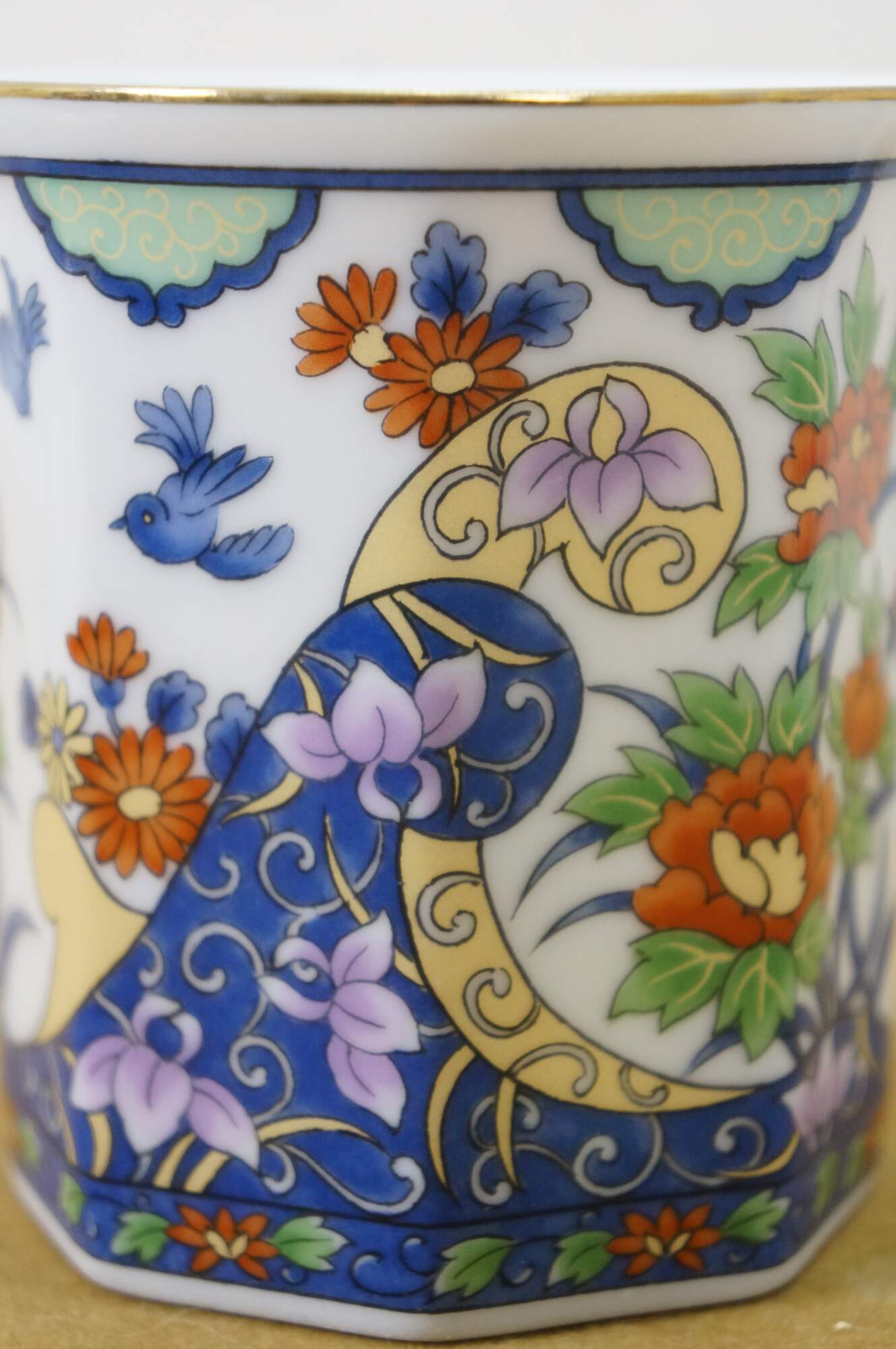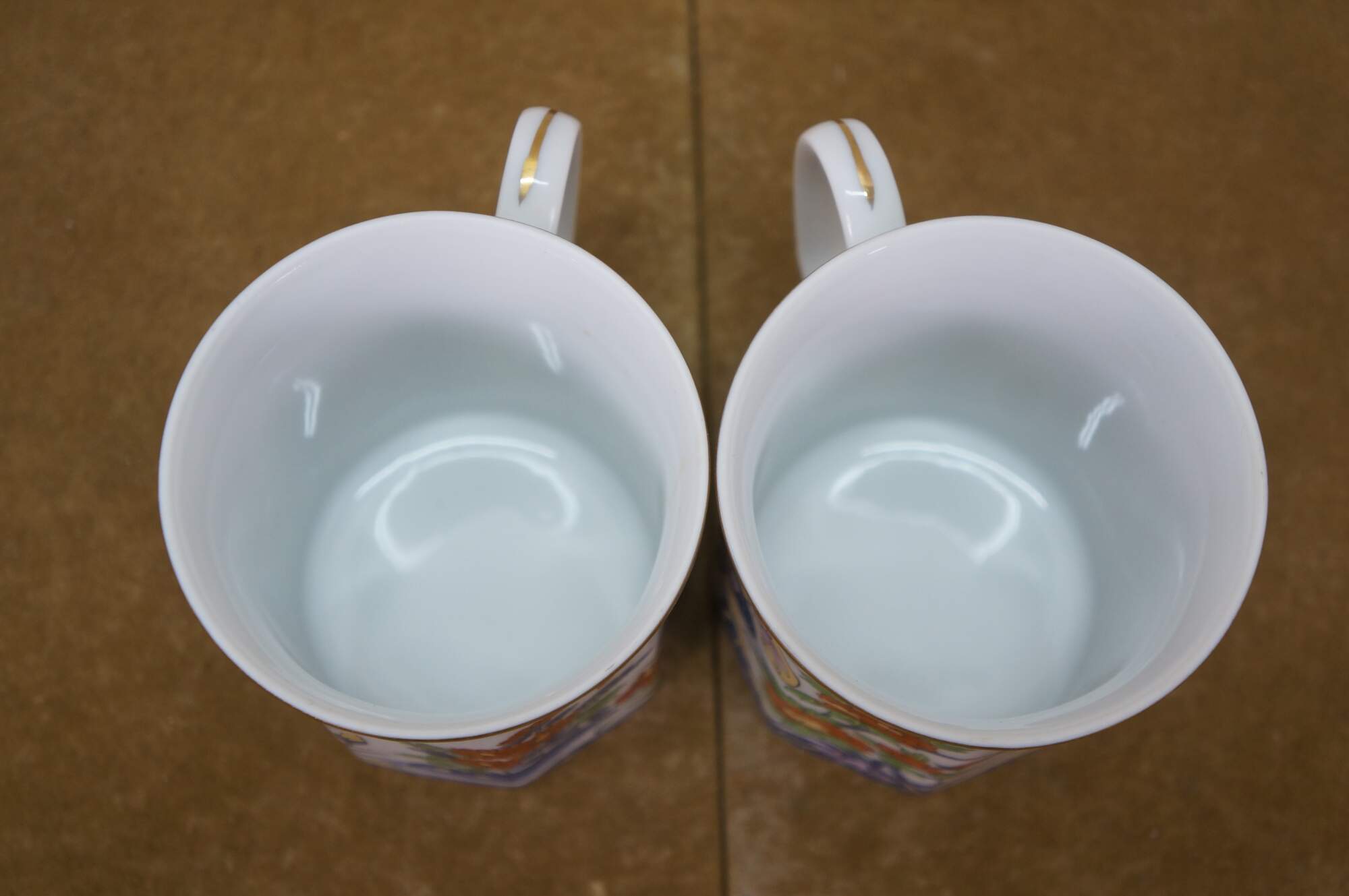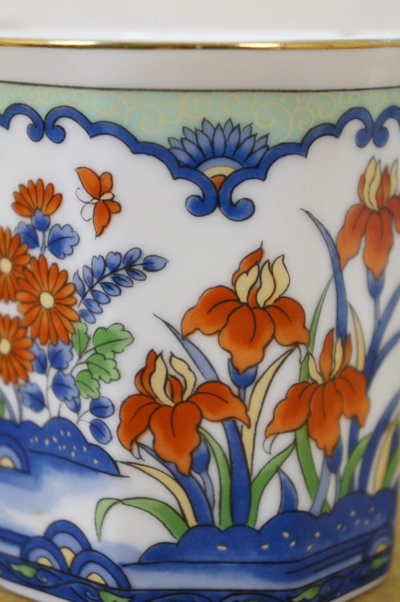 Vintage Seizan Fine China tea / coffee mugs with Japanese Iris garden design. The mug is made in Japan, has an octagonal base, and is multicoloured with blue, orange, green, yellow, and gold trim.