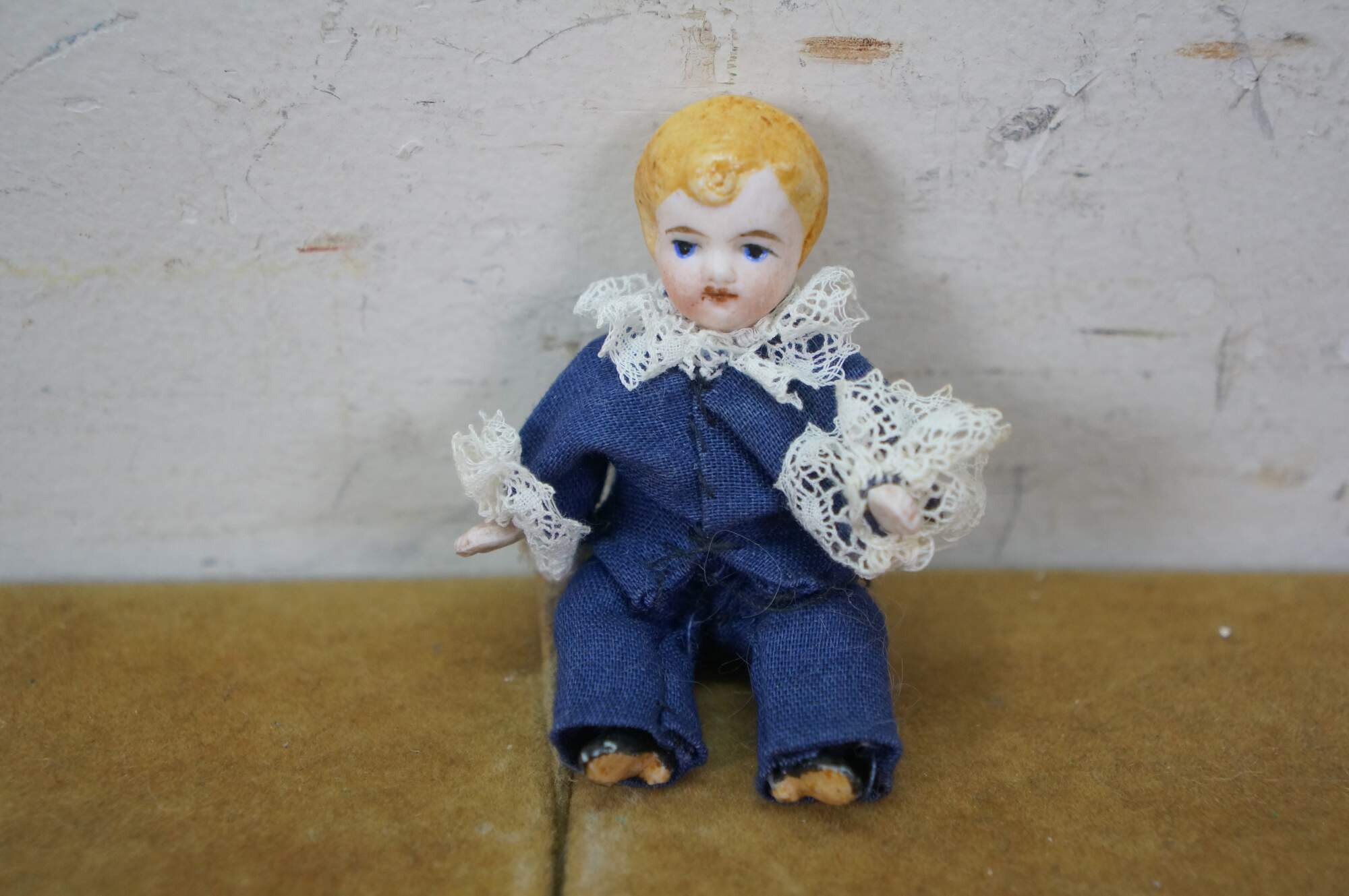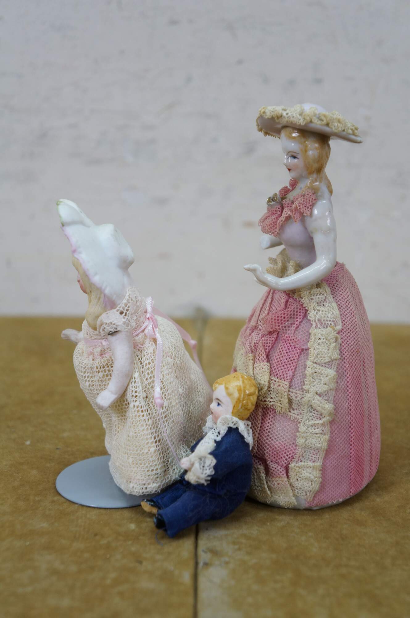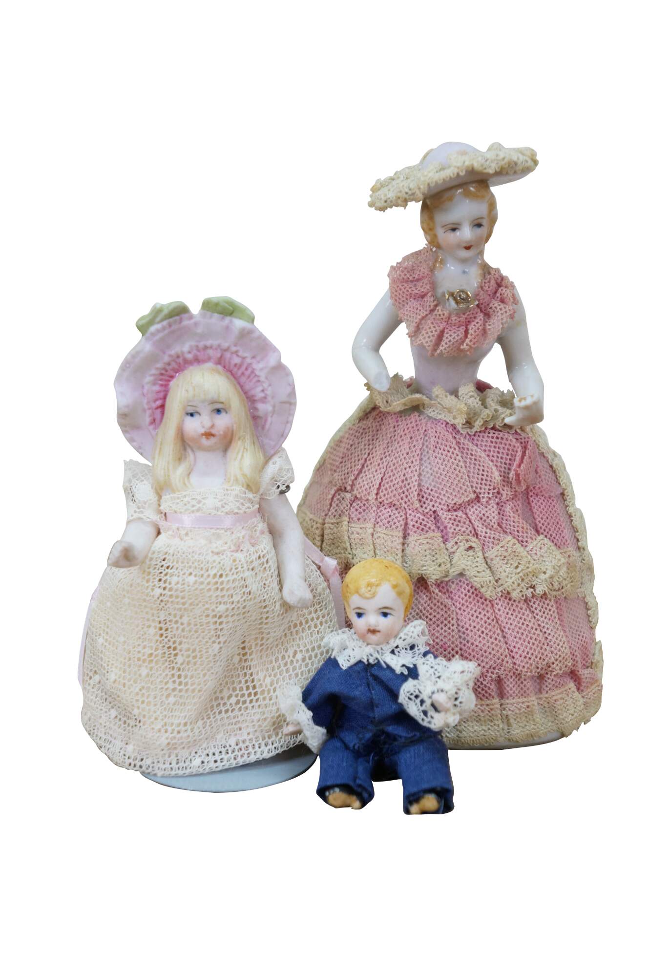 Three vintage German porcelain doll figurines. One Dresden Style Victorian woman in lace dress, and two Bisque - little boy and girl figurines.