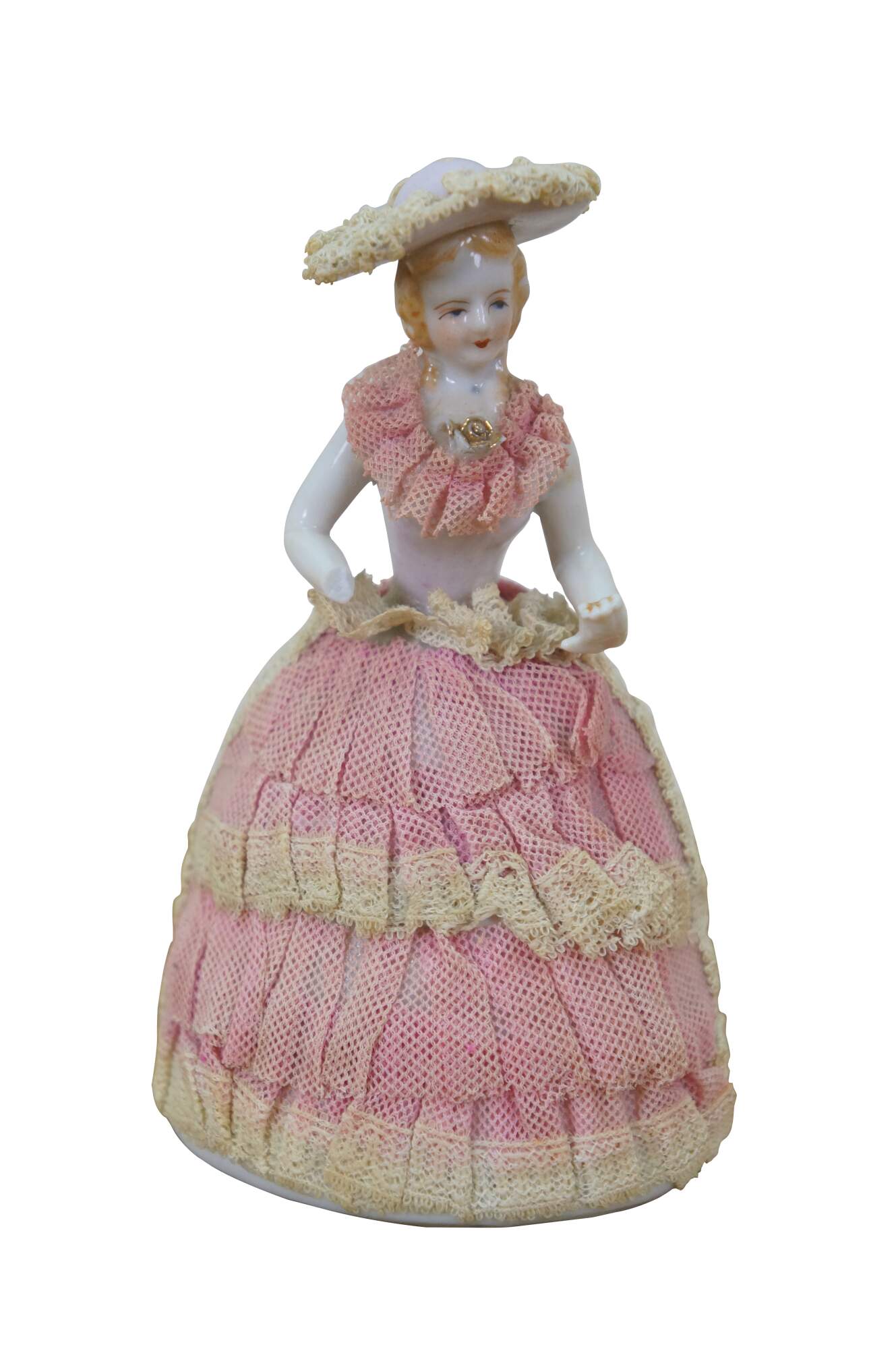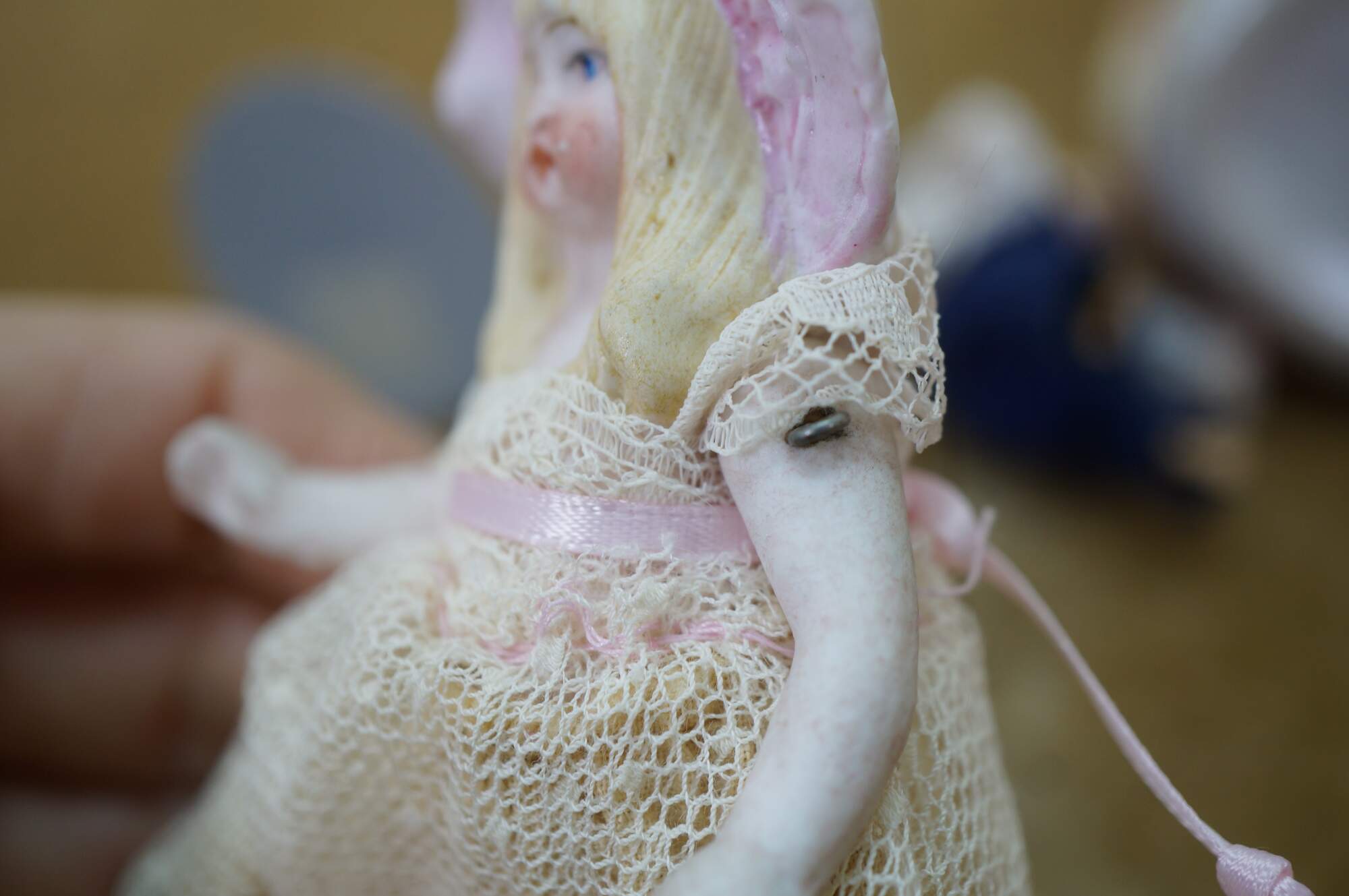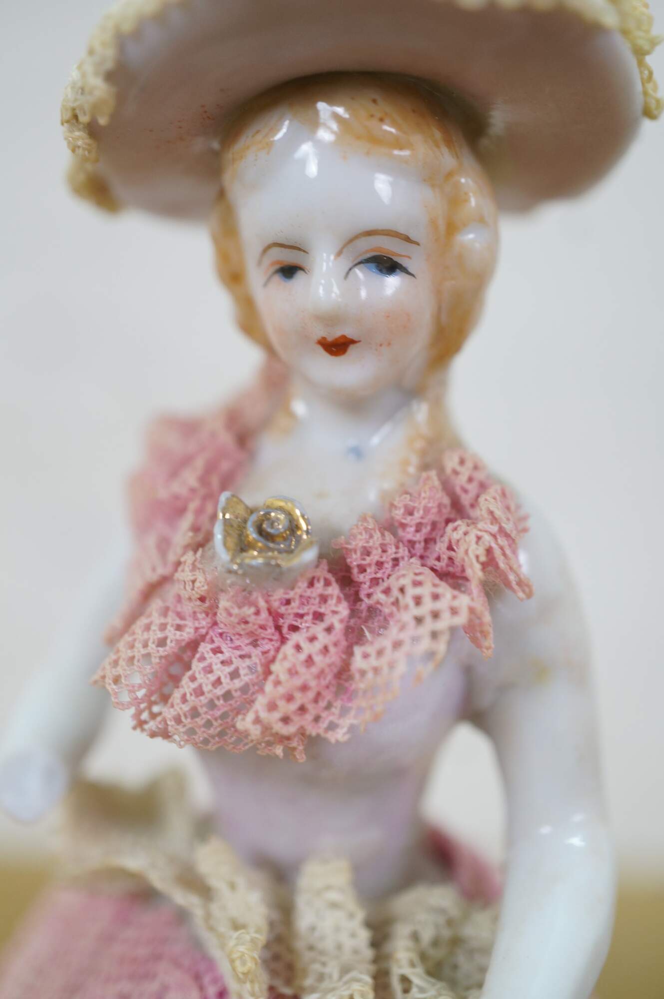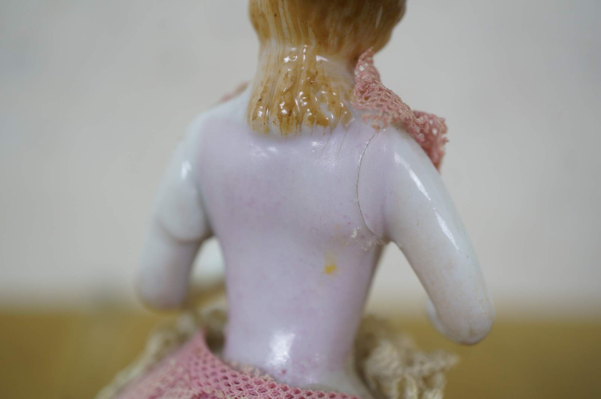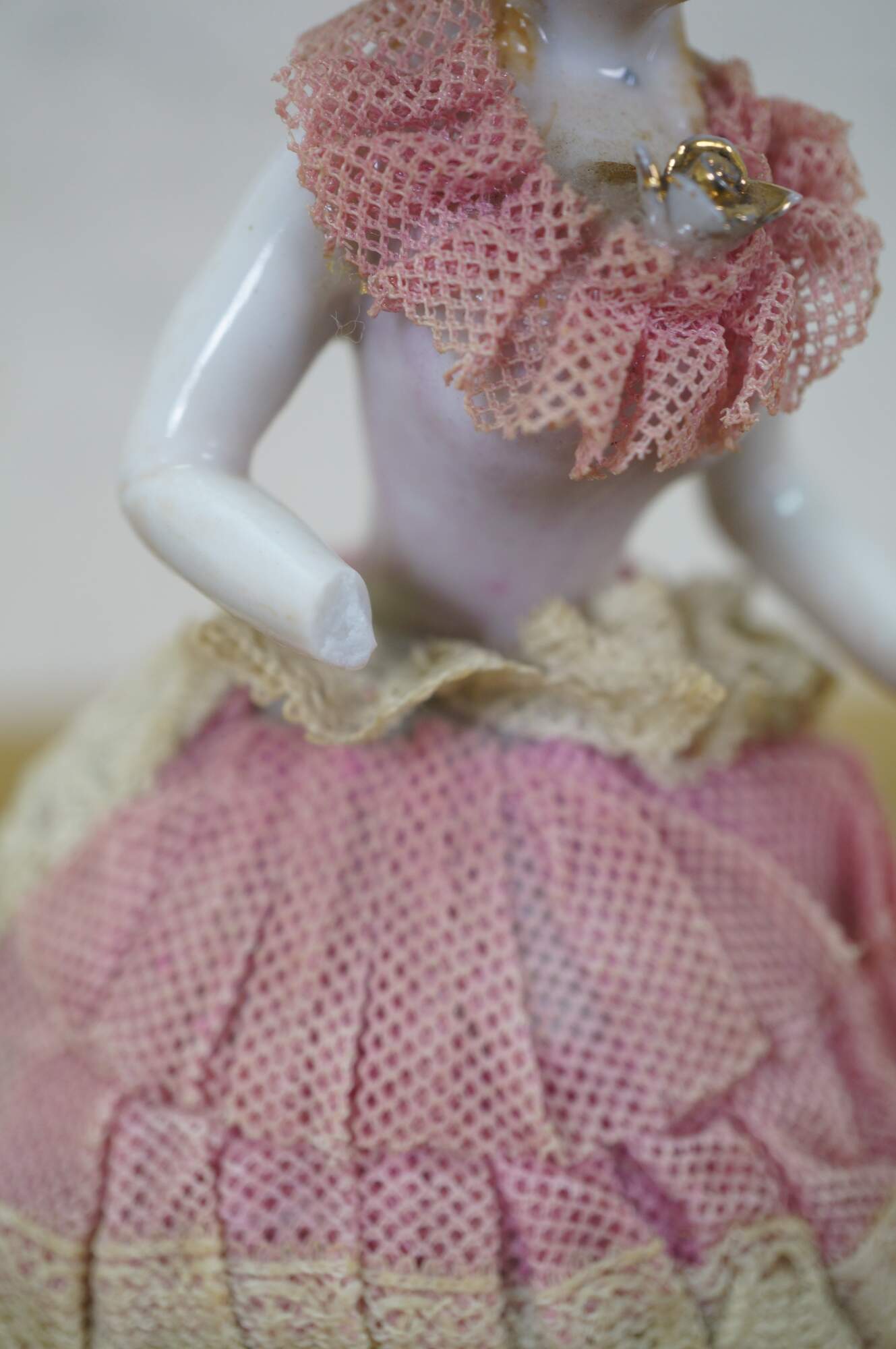 wear; discoloration; pink lady missing hand/repair to arm